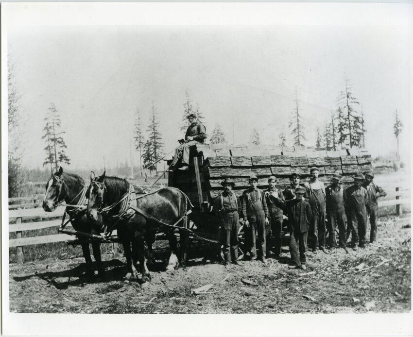 Russell Shingle Mill employees, circa 1920. Black and white 8" x 10" photographic copy print, probably made from a negative. Picture is of a two horse team pulling a wagon loaded with wooden shingles. The horses are dark colored with a white stripe down the forehead. Frank Russell is seated on top of the wagon and is holding the reins. To his right is a dog with floppy ears. He is dressed in overalls and a long-sleeved dark colored shirt. There are eight men standing in a row directly in front of the wagon and a single man in front of them with his arm up, possibly holding on to something. All of the men are wearing work clothes (overalls or long pants and long-sleeved shirts). From left to right is pictured Thomas N. Russell, Fred Russell, Vern Skinner and the rest are unknown. A split rail fence is behind the wagon. A number of tall pine trees can be seen in the background.