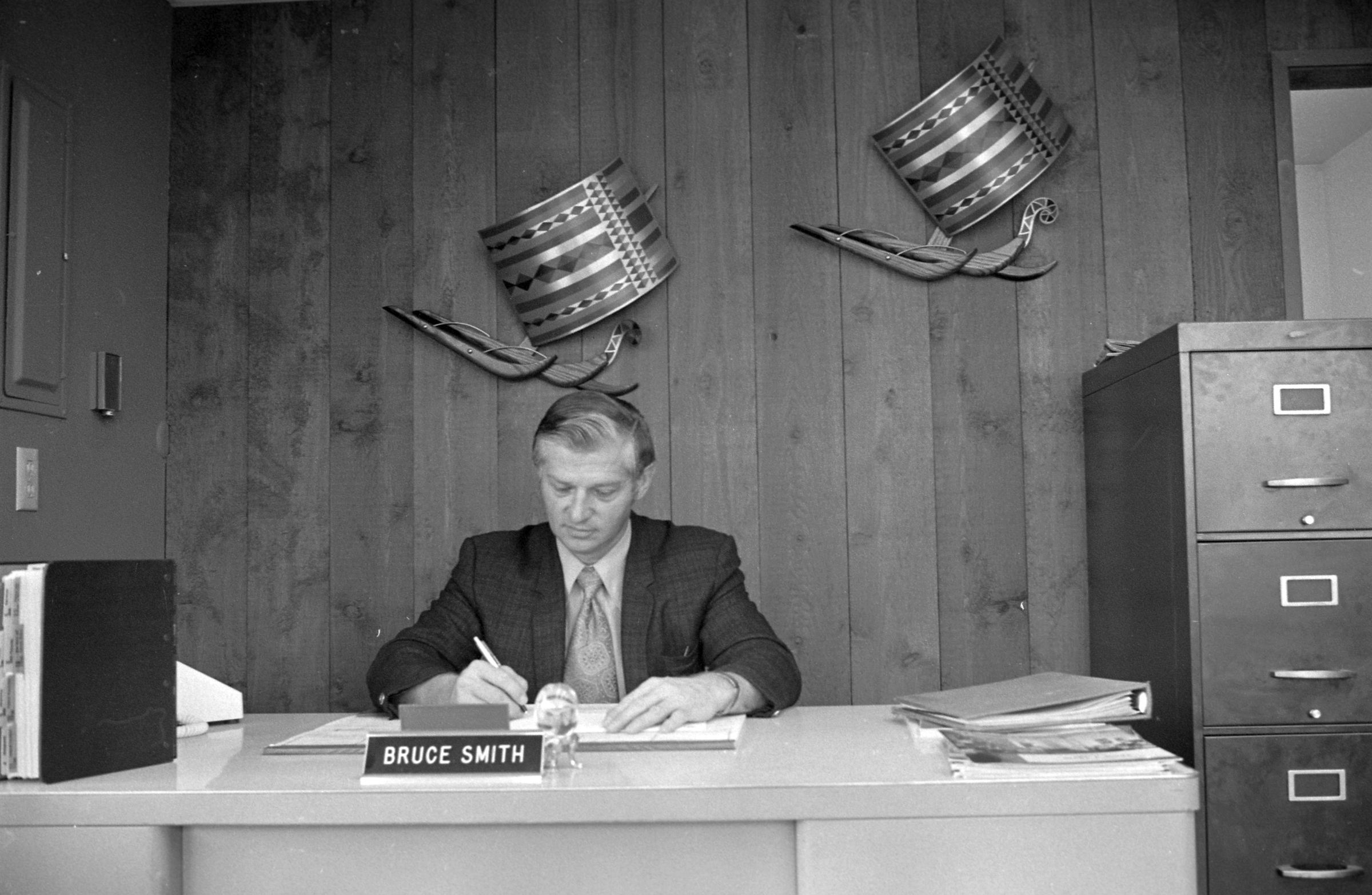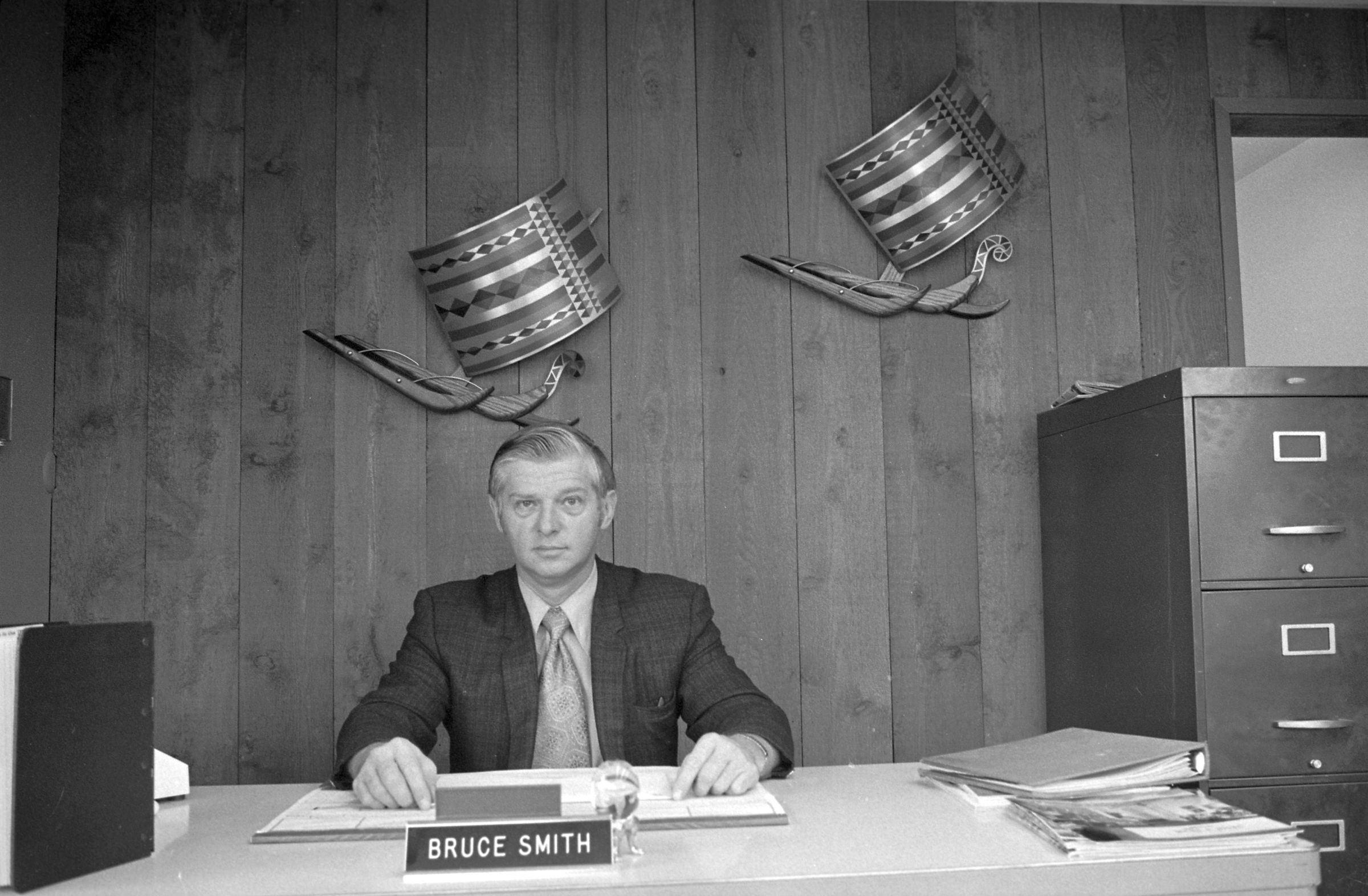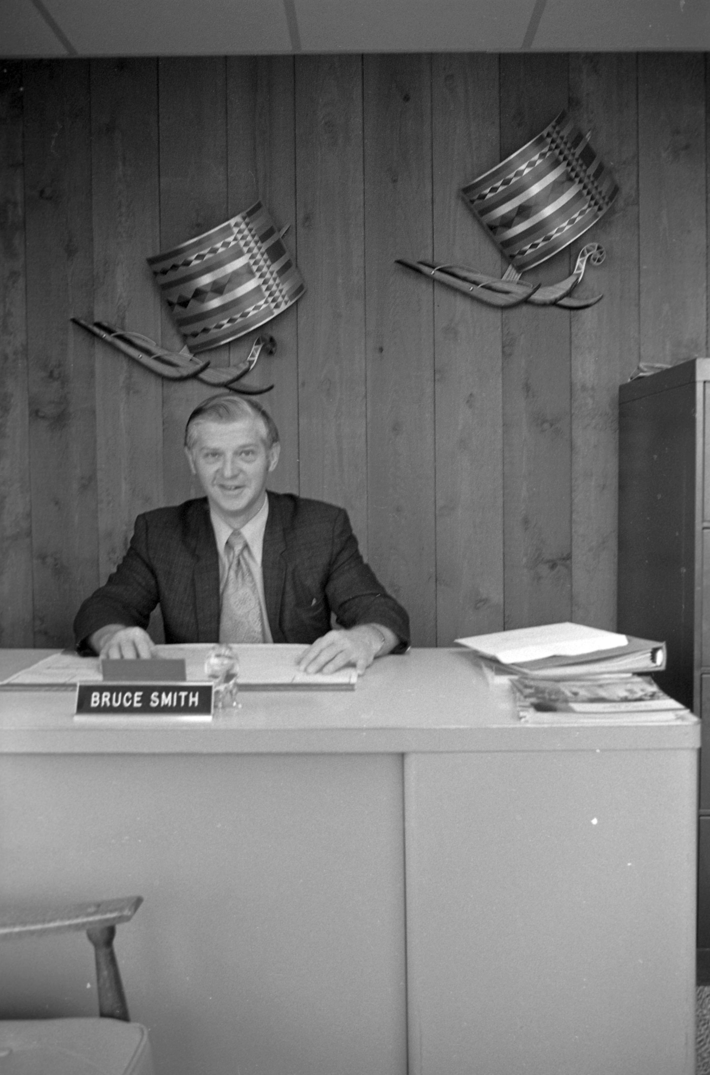 Bruce Smith poses for the Lacey Leader newspaper. Black and white negative strip of three images originally created for the Lacey Leader newspaper. The envelope containing the negatives has a description on it that reads "Bruce Smith of Boone & Boone Realty." All three photographs show the same man sitting at a desk. He is wearing a dark suit jacket and a light collared shirt, and light tie. He has dark hair. On the desk in front of him is a name plate that reads "Bruce Smith" and there are binders on the edge of the desk. Directly in front of him appears to be papers and he is holding a pen in his hand. Next to him, in the background, is a filing cabinet. Above him on the wall are two pieces of art, both appear to be the same.Made/Created