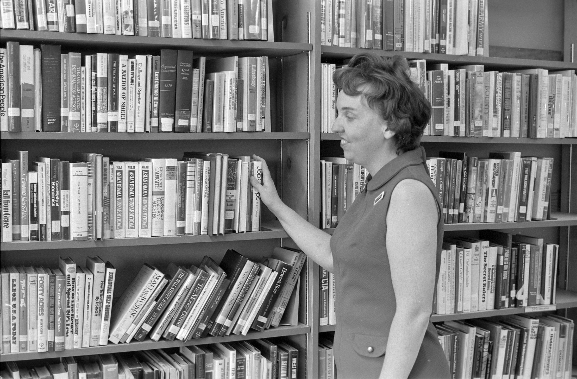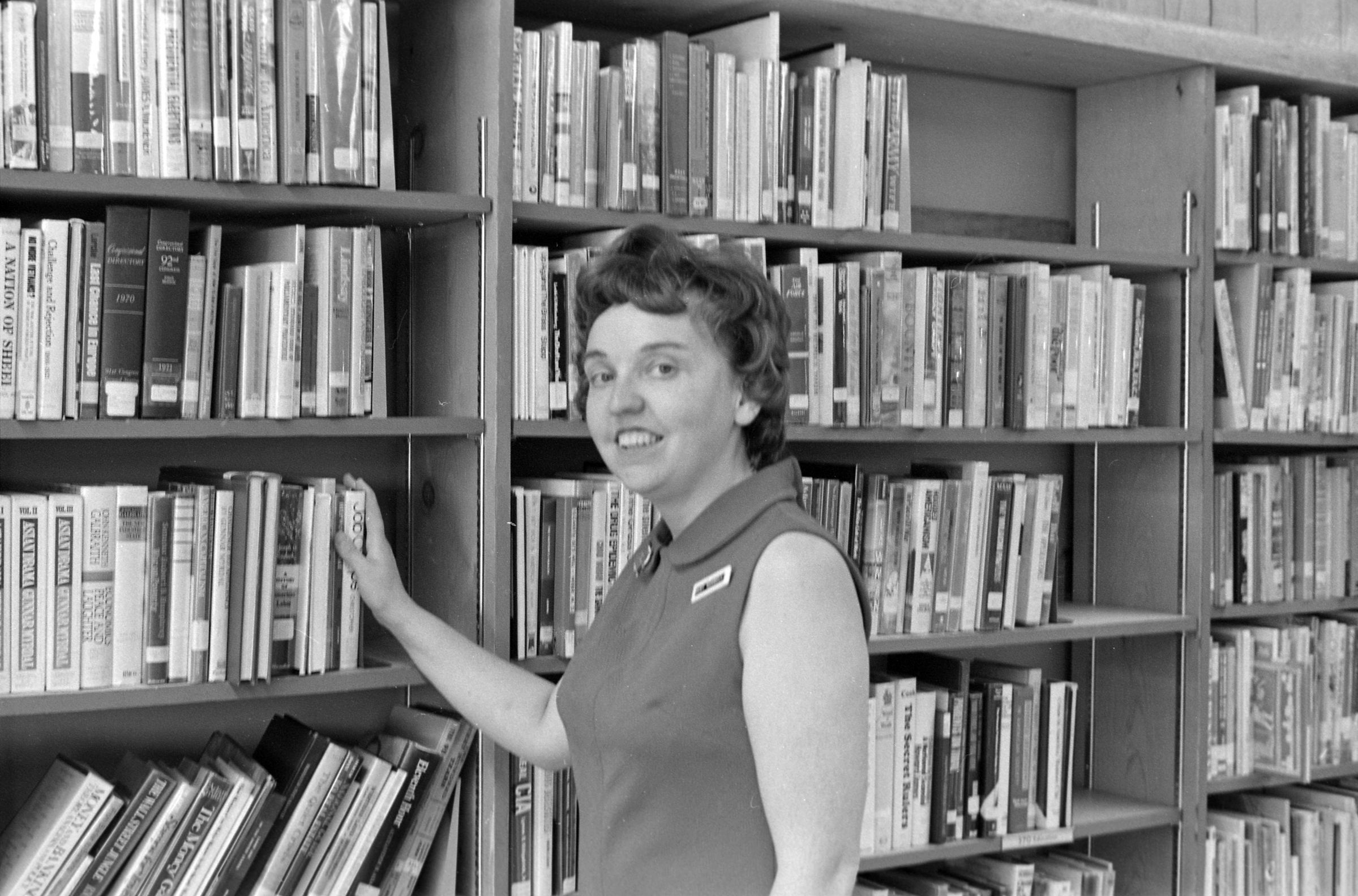 Mary Russell poses for the Lacey Leader. Black and white negative strip of three images originally created for the Lacey Leader newspaper. According to the envelope containing the negatives the woman in the photographs is Mary Russell. In all three photographs the woman is standing in front of a large book case that is filled with books. She is wearing a dark colored sleeveless dress that has a collar. She has dark curly hair.Made/Created