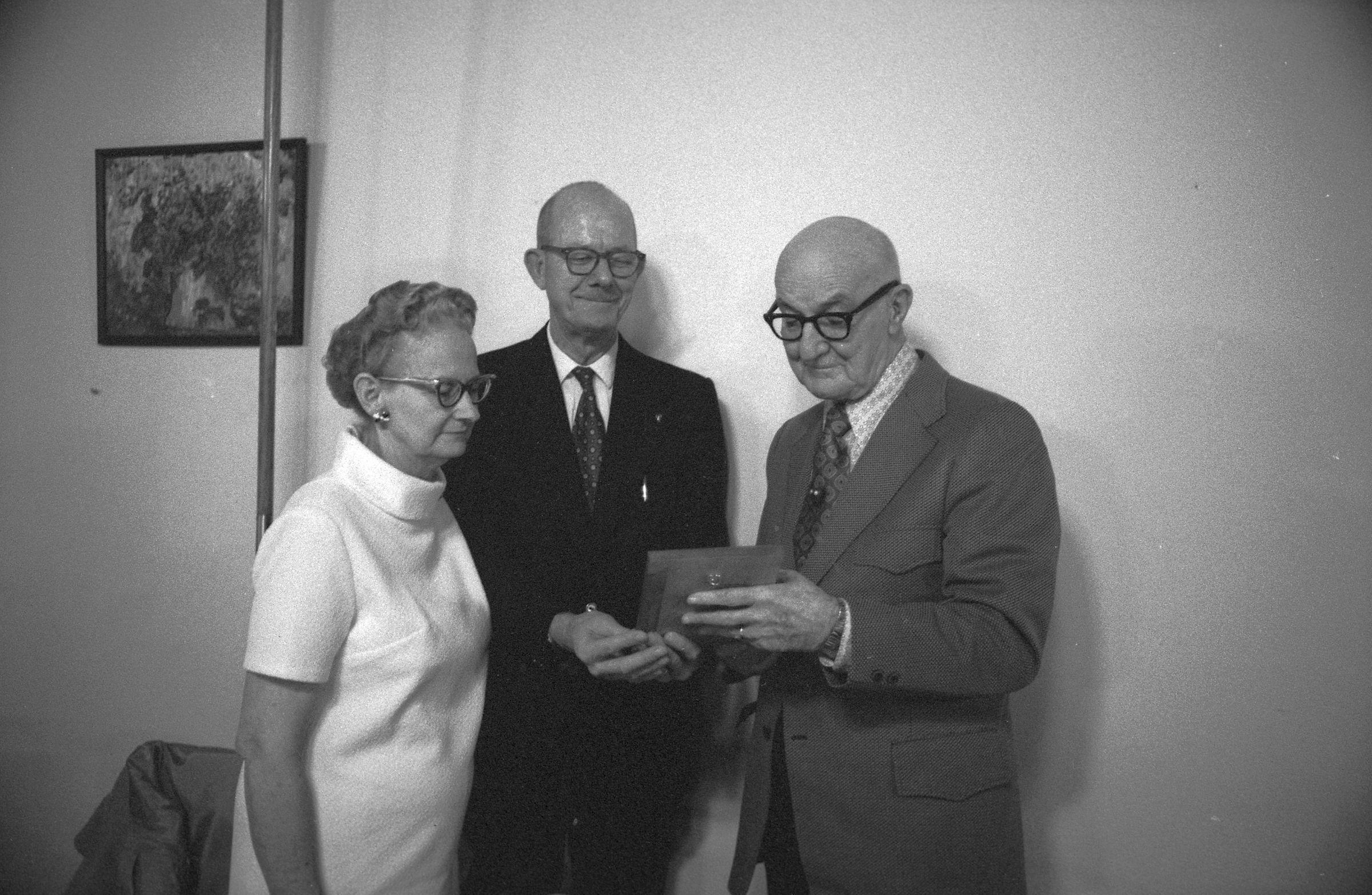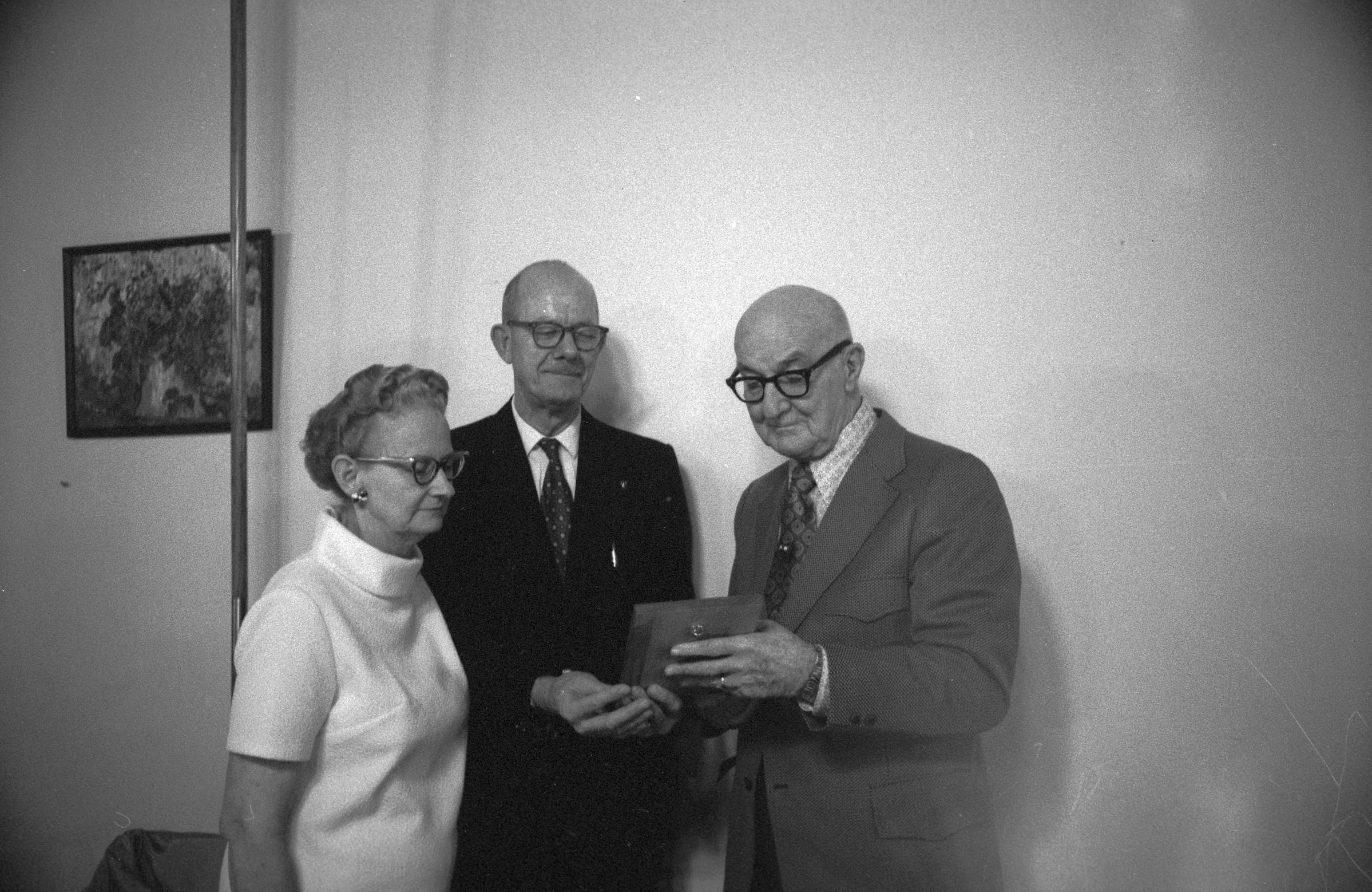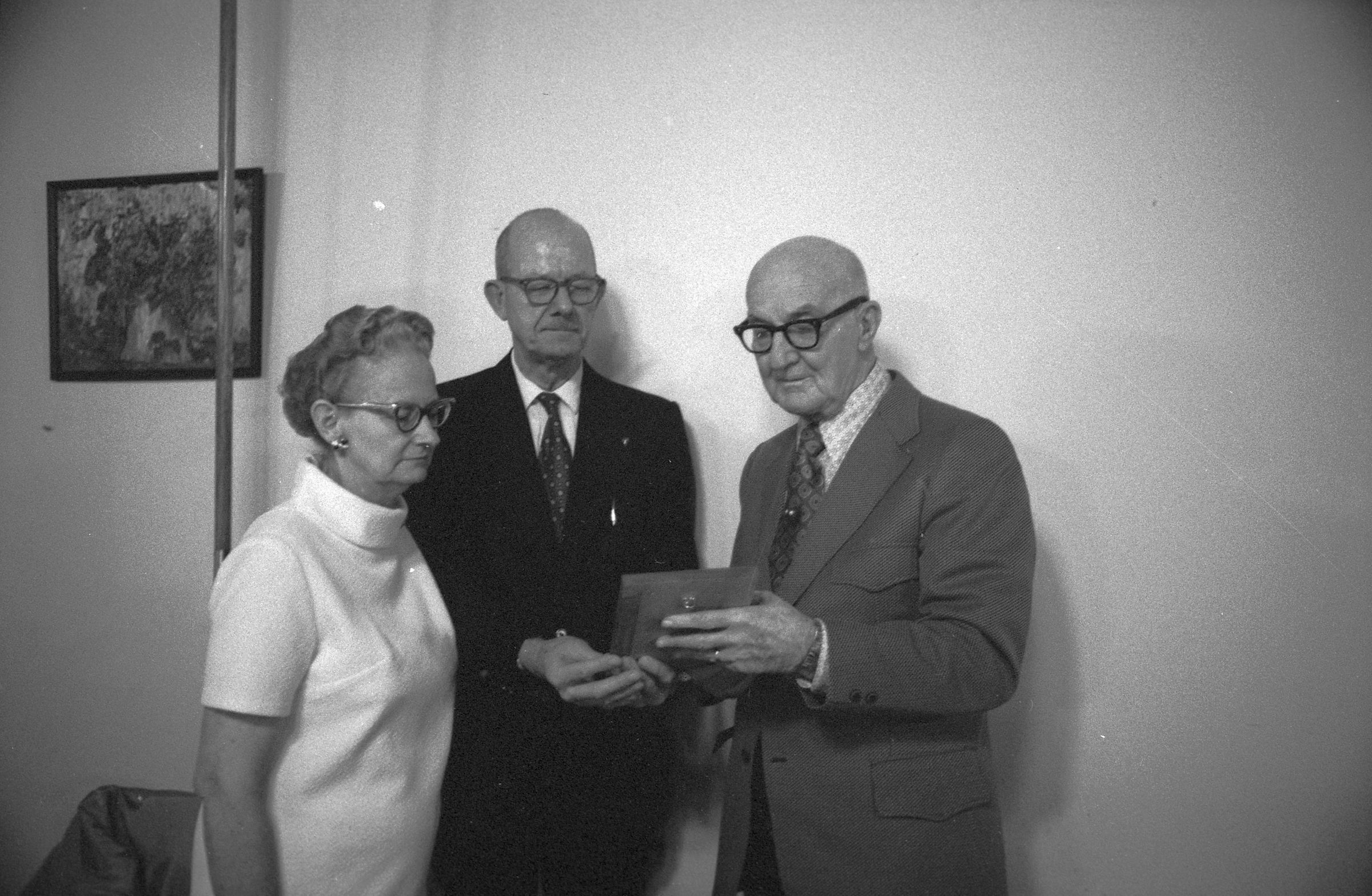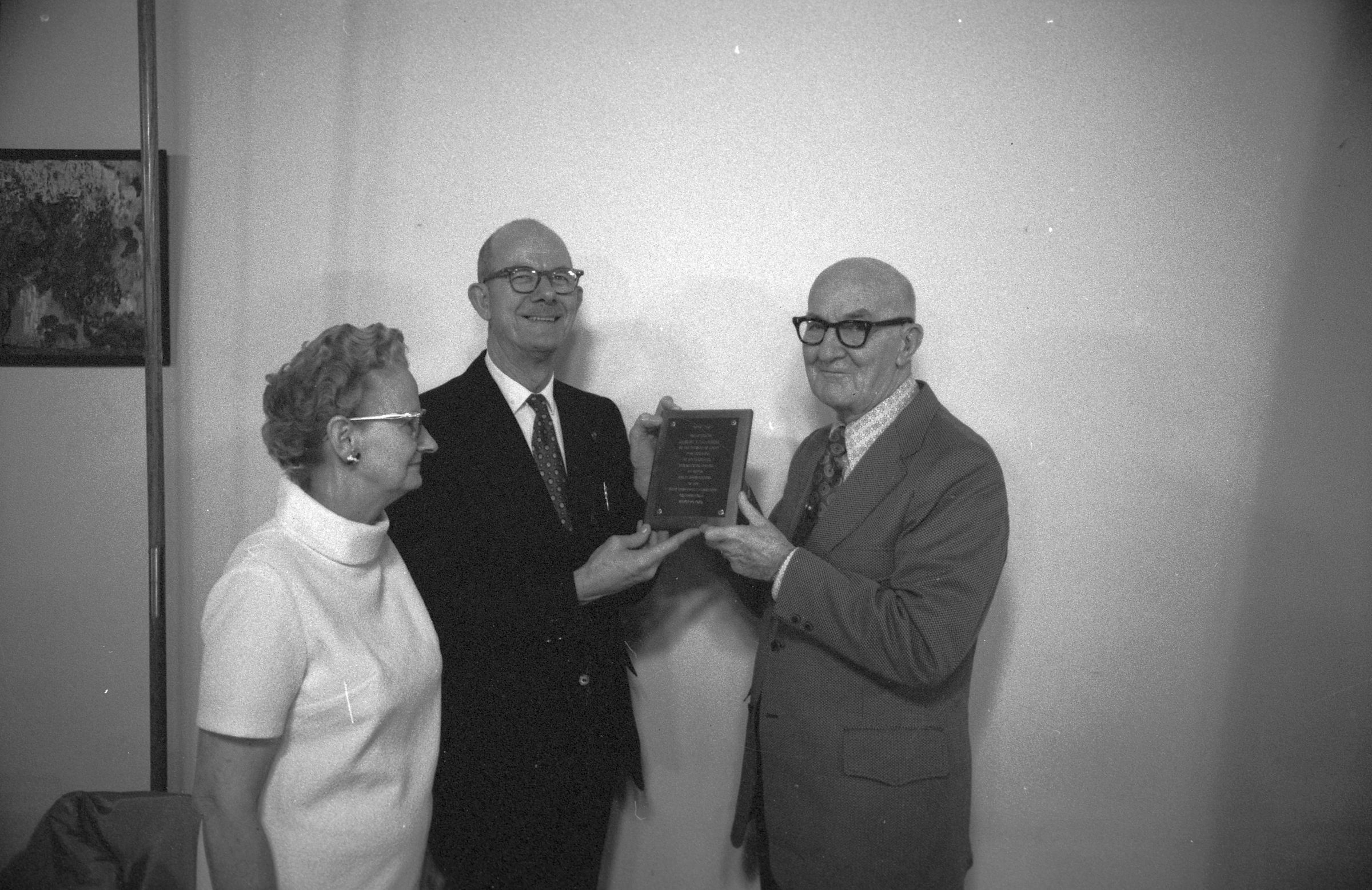 Mayor Albert Van Andel circa 1973. Black and white negative strips of four images (one strip of three and one separate frame) originally created for the Lacey Leader newspaper. In all four frames there are three people standing near each other and appear to be talking. There are two men and one woman. The woman is wearing a light short sleeved turtle neck top. She has dark hair that appears to be pulled back behind her in a bun. She is wearing wing tipped glasses, and large ear rings. The man in the middle (Mayor Van Andel) is wearing a dark suit, a light collared shirt and a dark tie with polka dots on it. He is bald, has a mustache, and is wearing dark framed glasses. The man on the right side is bald, wearing thick framed dark glasses, and is holding what appears to be a plaque in his hand. He is wearing a dark suit, a light collared shirt and a dark tie with diamond shapes on it. Behind them is a light colored wall and a picture hanging. It is unclear what the hanging picture is of.