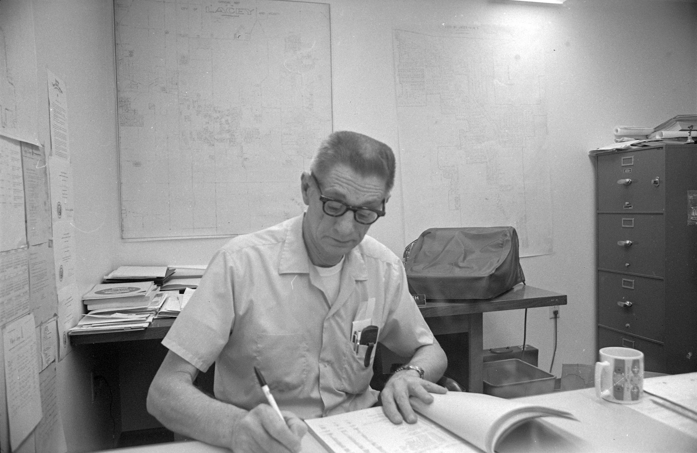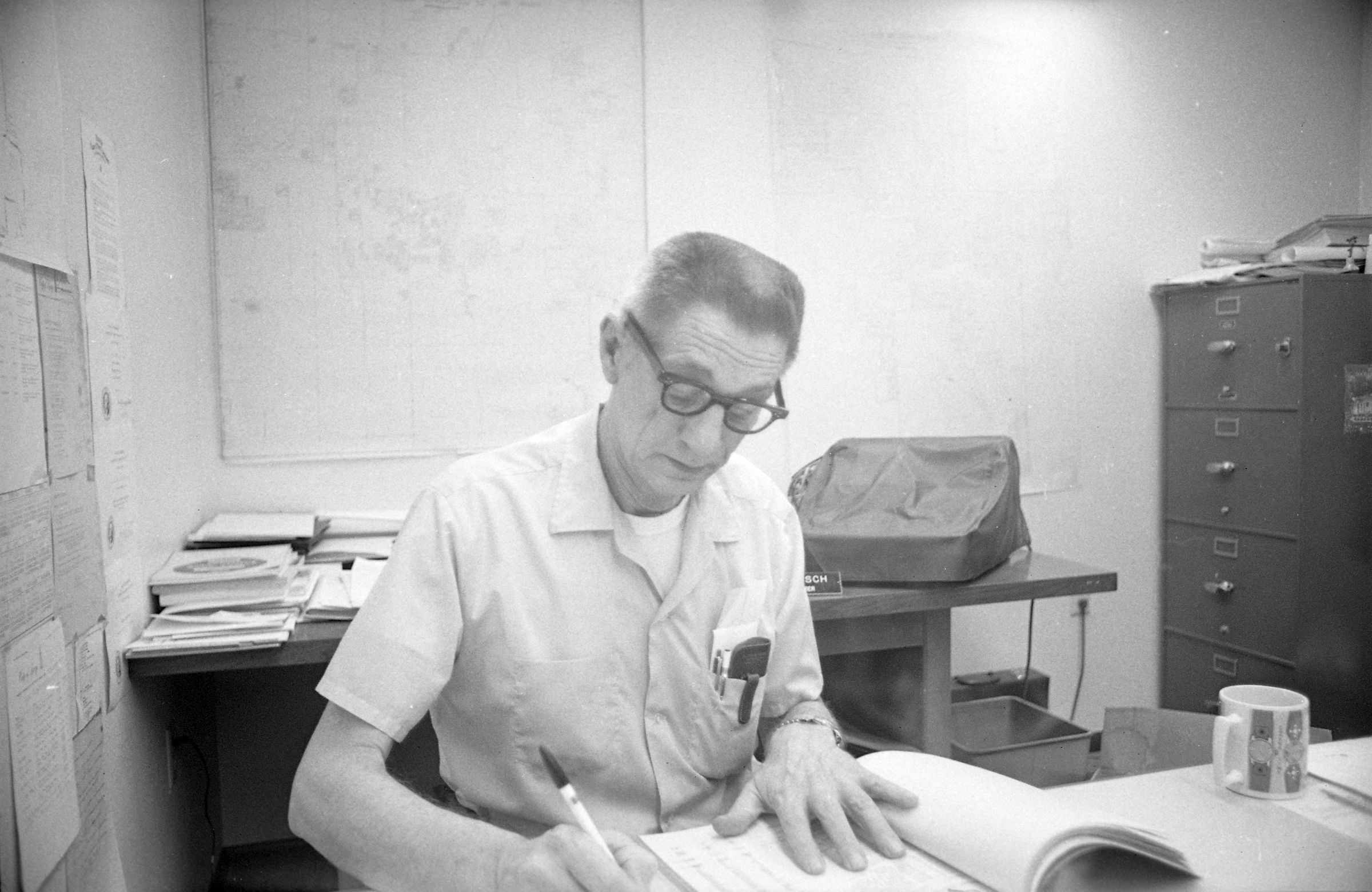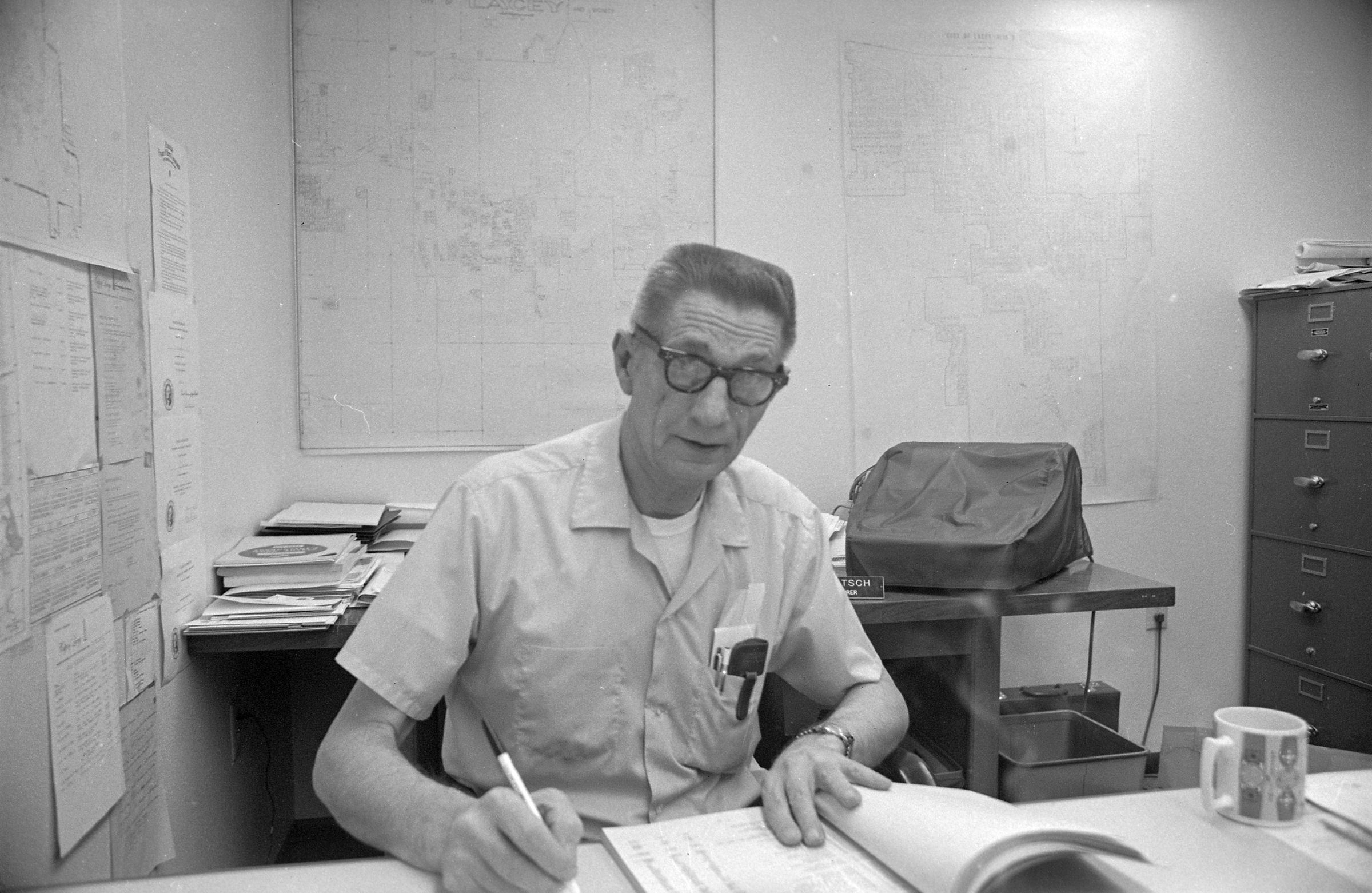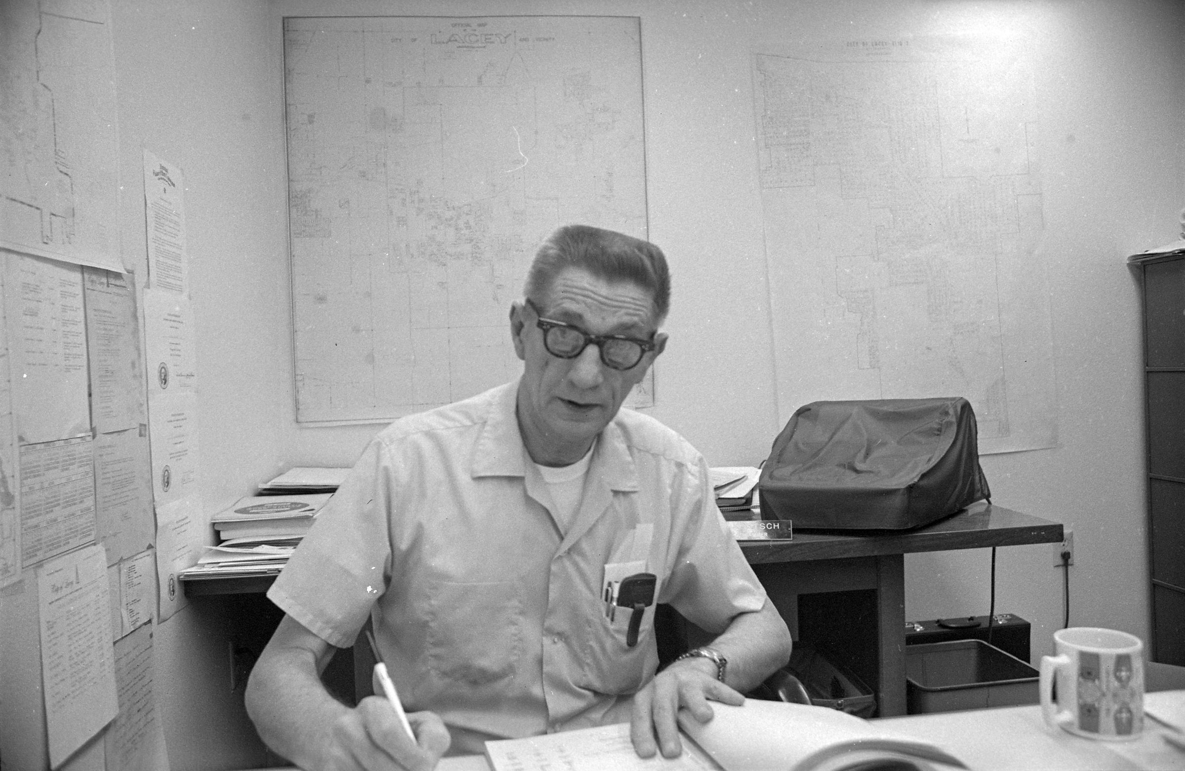 C.R. Koetech, April 4, 1973. Black and white negative strip of four images originally created for the Lacey Leader newspaper. The envelope containing the negatives reads "C. R. Koetech 1973" but does not indicate what this refers to. In the photographs there is a man sitting at a desk. He is wearing a light, short sleeved collared shirt, a light colored under shirt, has dark hair in a crew cut, and is wearing dark thick framed glasses. In one hand he is holding a pen. The other hand is being used to hold open papers that appear to be part of a book or large file. Next to him, on the wall are several papers hanging up. Behind the desk appears to be a table that has large stacks of papers on it. There is also a large bag that possibly holds a typewriter.Made/Created