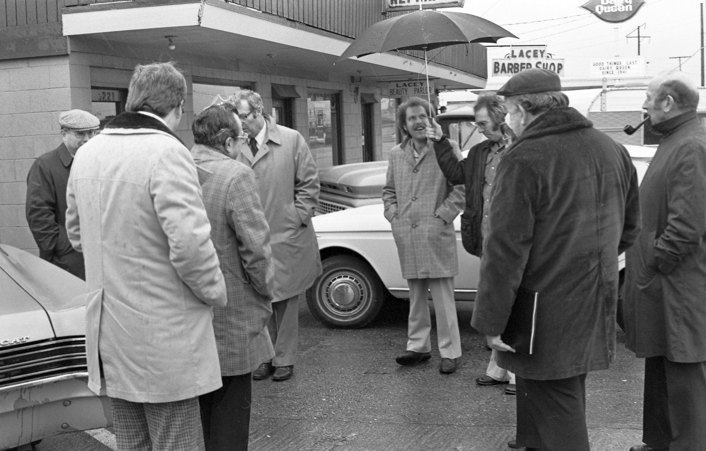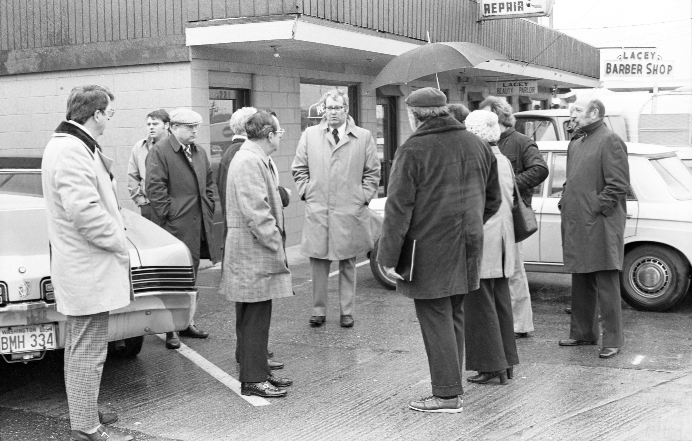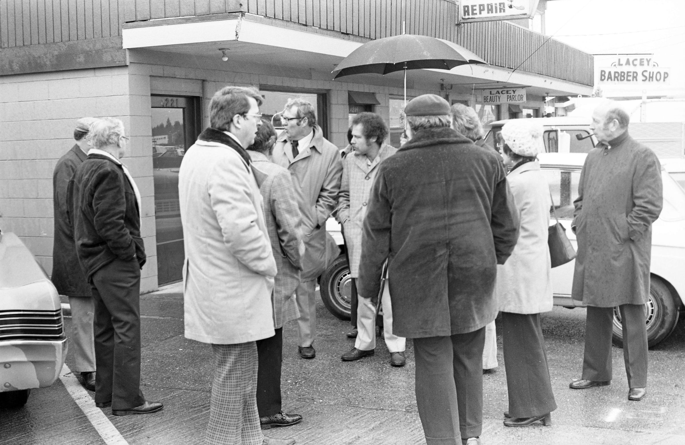 The man in image group "a" with a tobacco pipe in his mouth is Bob Williams, Lacey's first city manager. The images in group "b" show a Lacey City council meeting. Ken Balsley believed that image groups "a" and "b" may show meetings concerning the initiation of bus service to Lacey.Made/Created