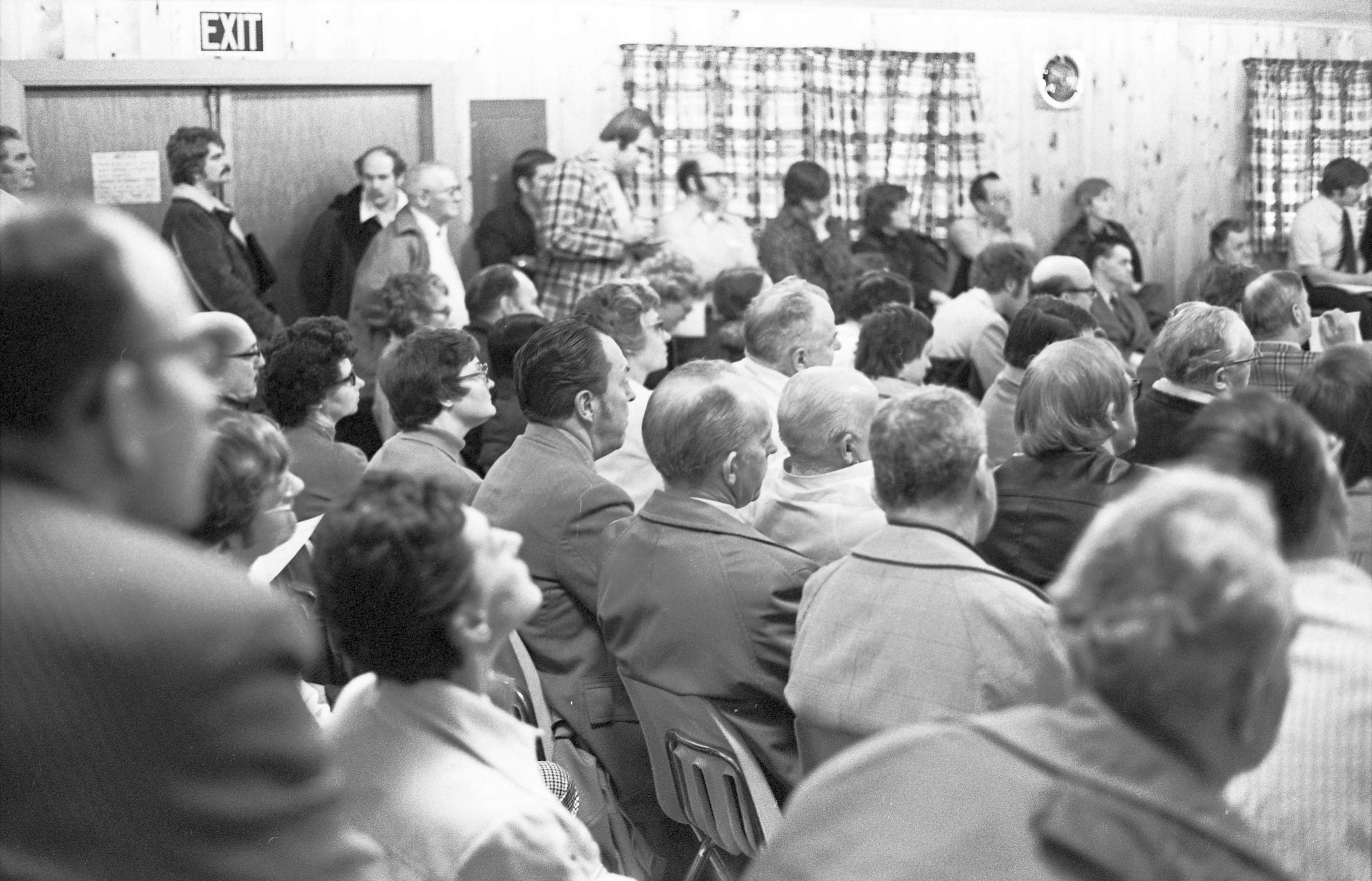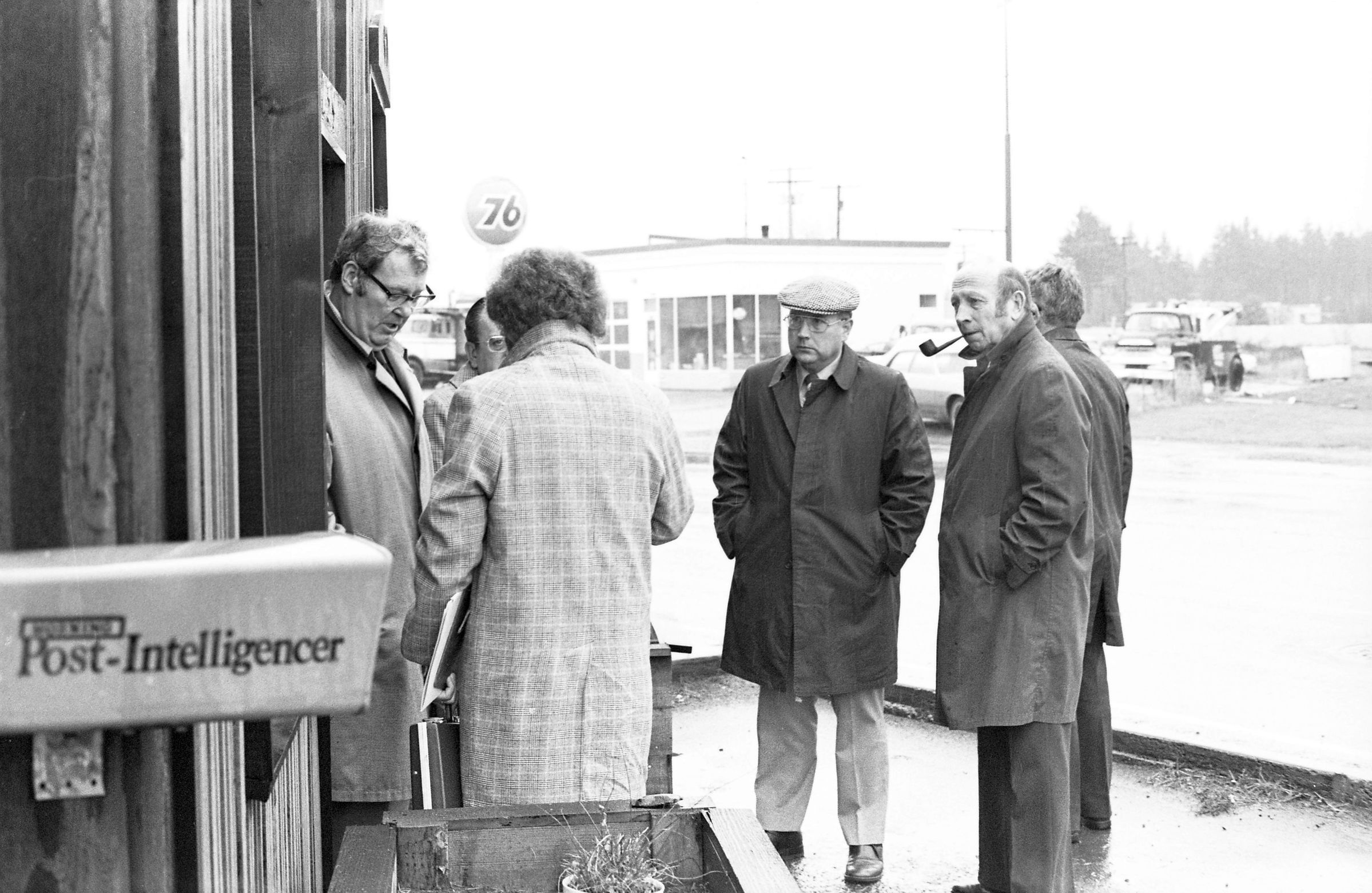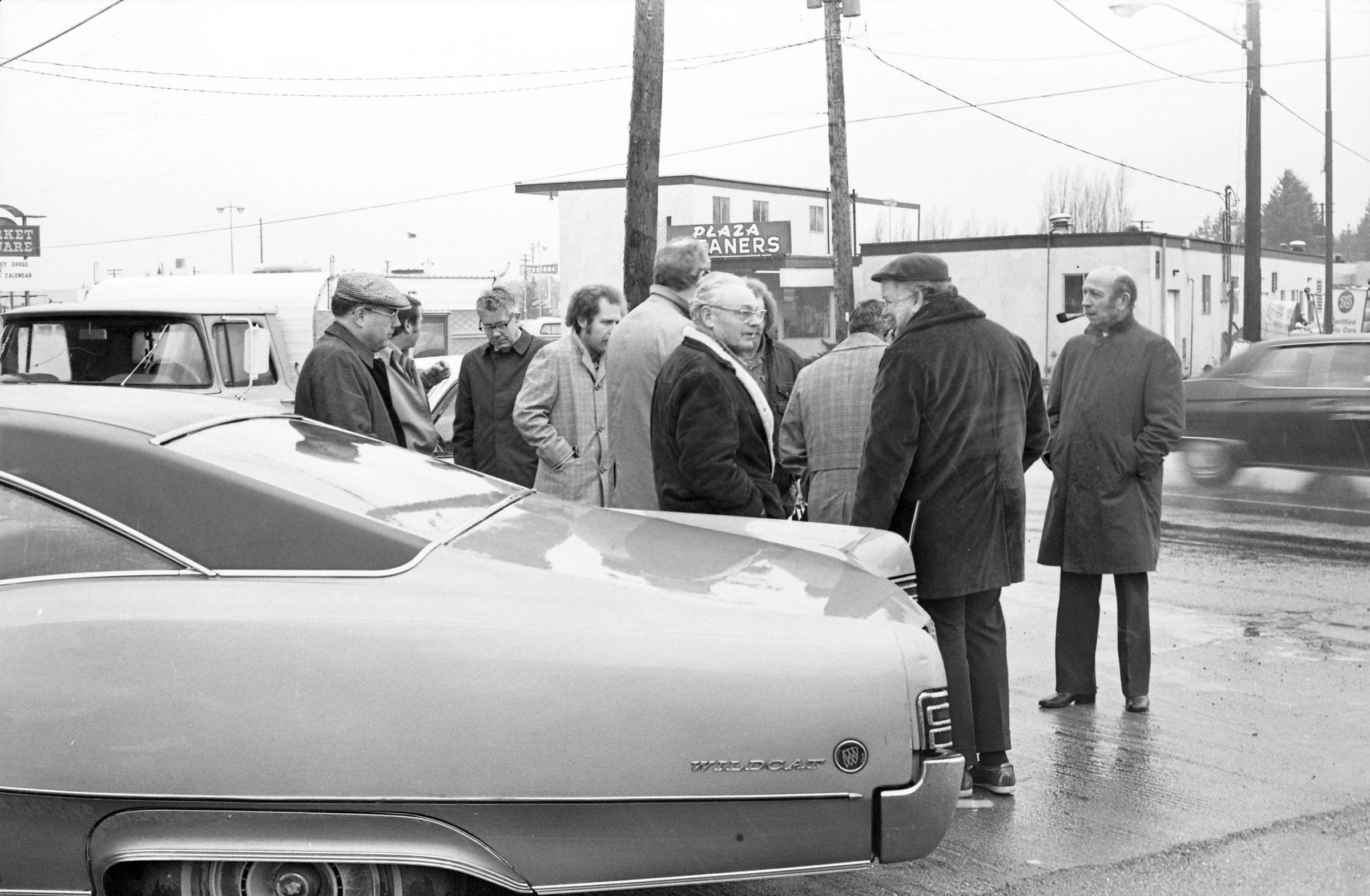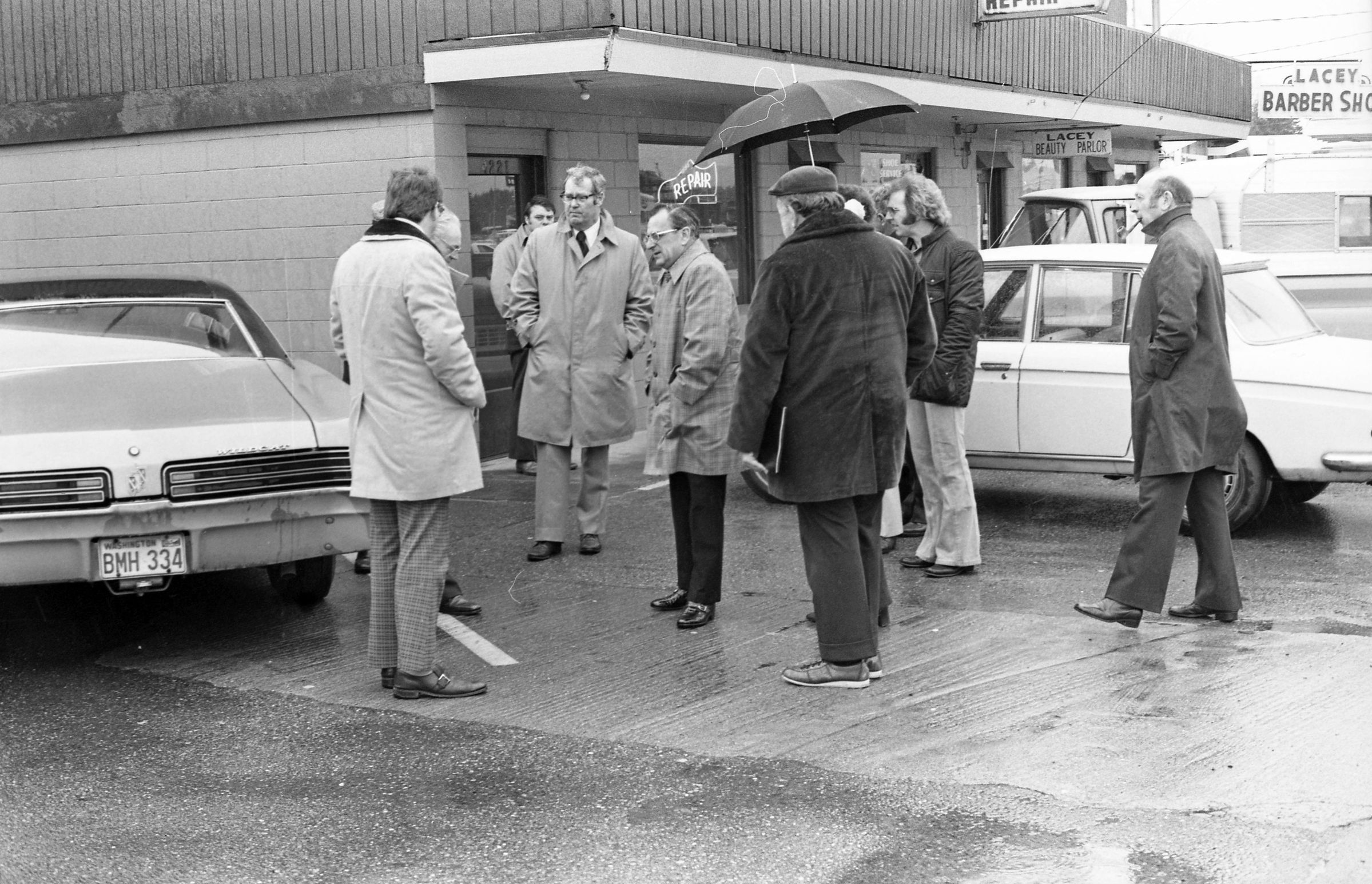 The man in image group "a" with a tobacco pipe in his mouth is Bob Williams, Lacey's first city manager. The images in group "b" show a Lacey City council meeting. Ken Balsley believed that image groups "a" and "b" may show meetings concerning the initiation of bus service to Lacey.Made/Created