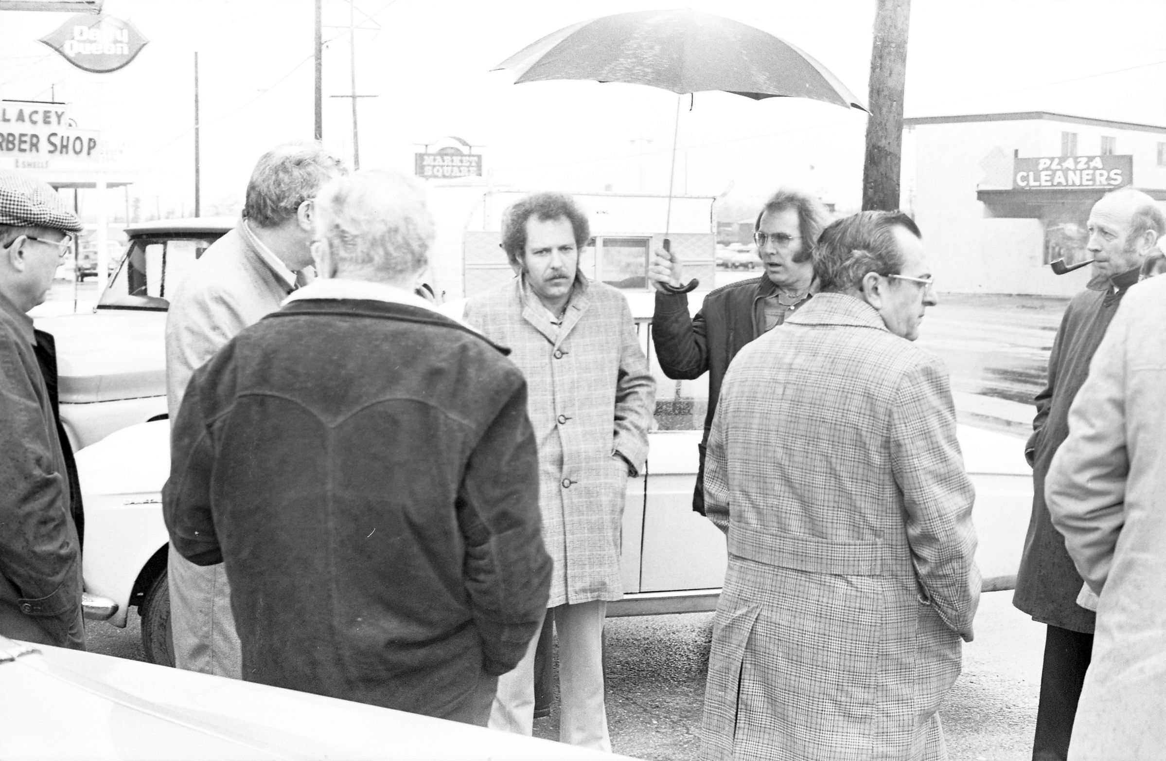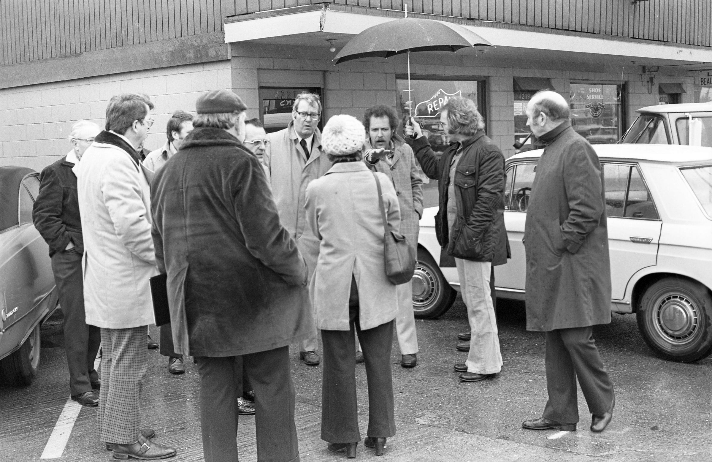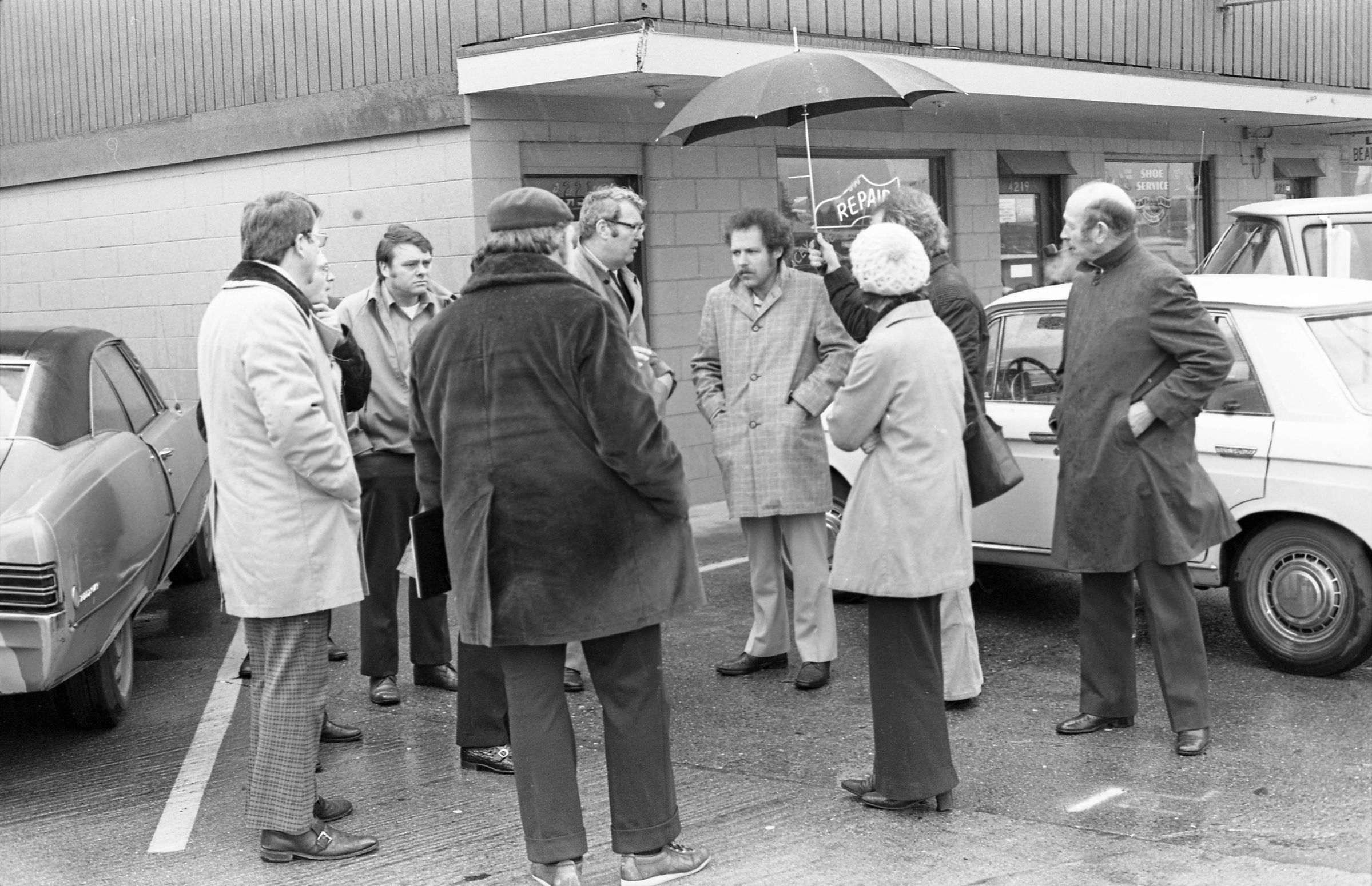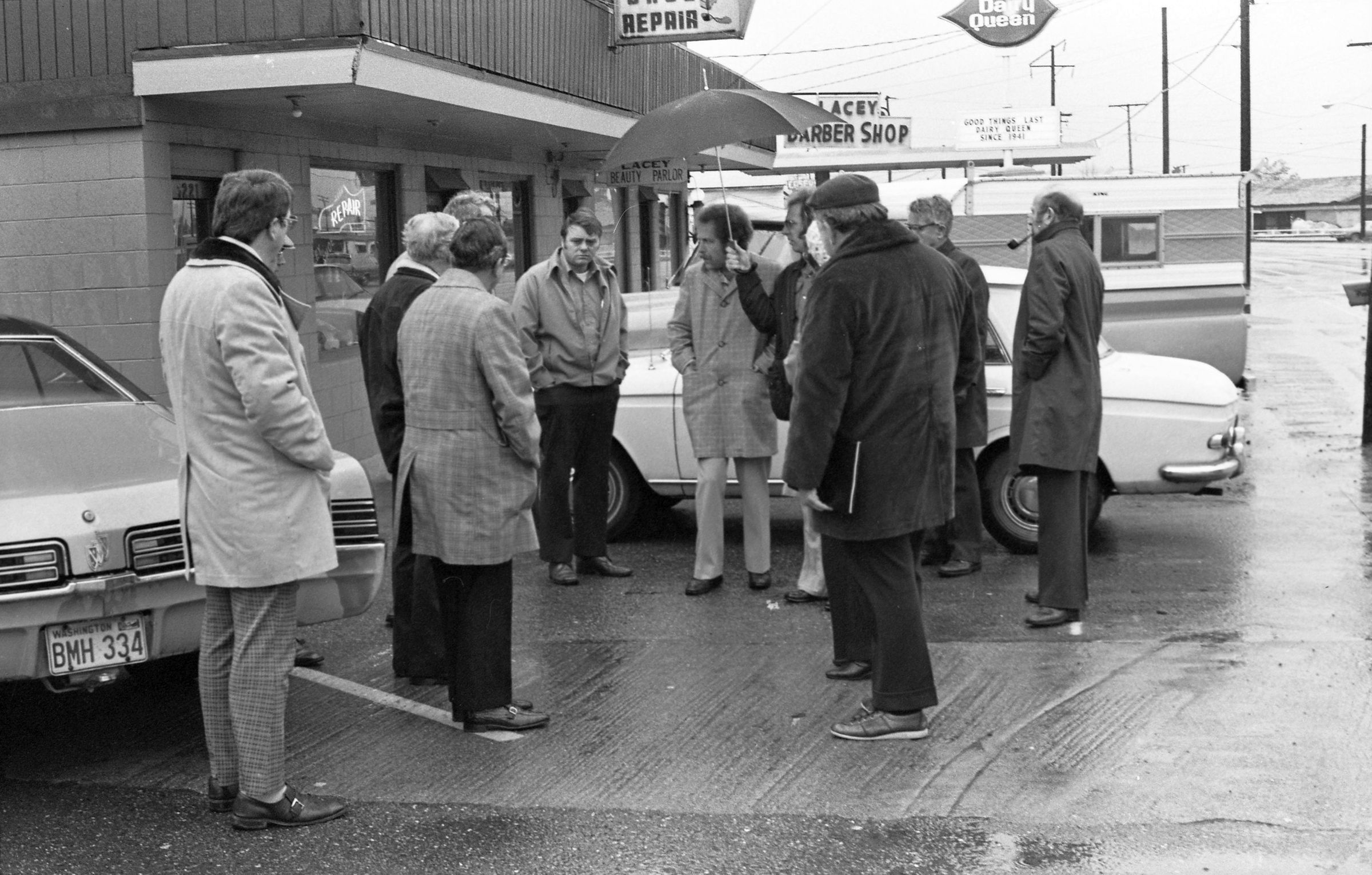 The images in group "a" show eleven men and one woman standing in a rough circle in the rain in a small parking lot outside of a building housing a beauty parlor, a barber shop and a shoe repair shop.