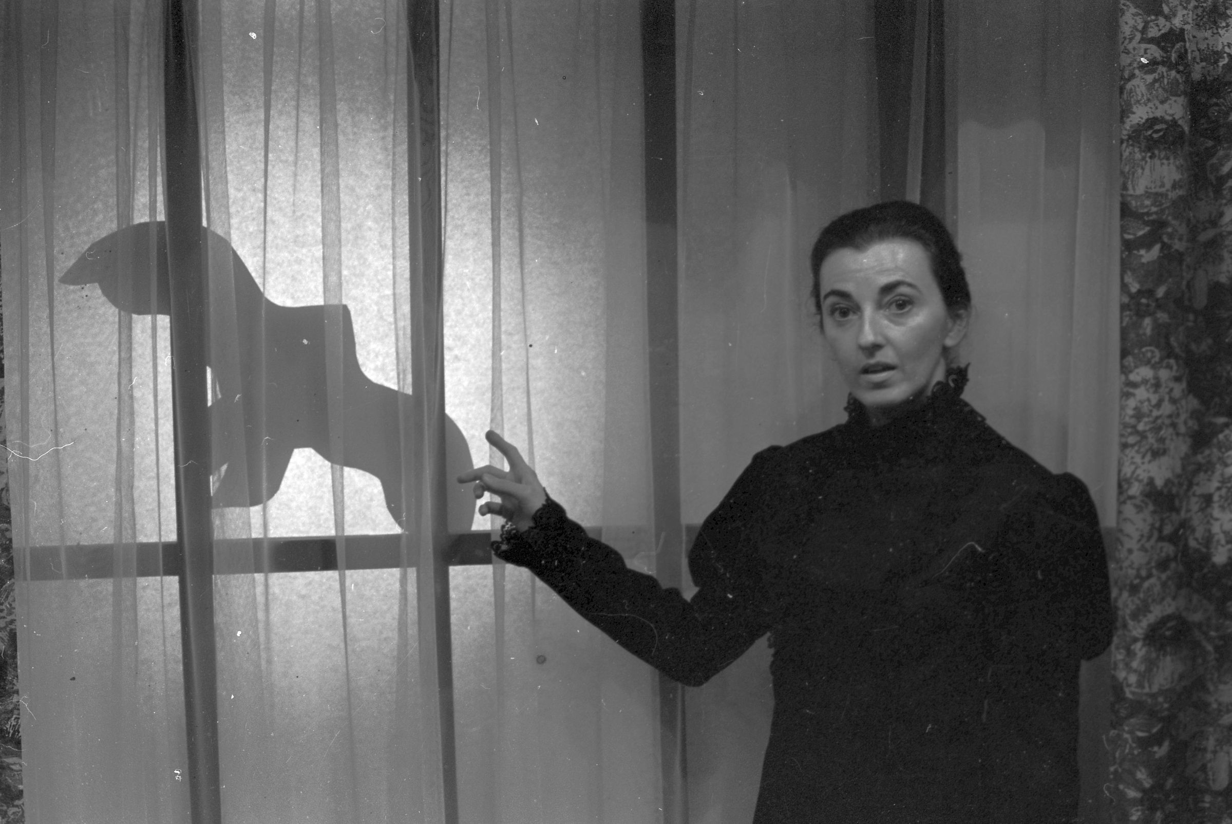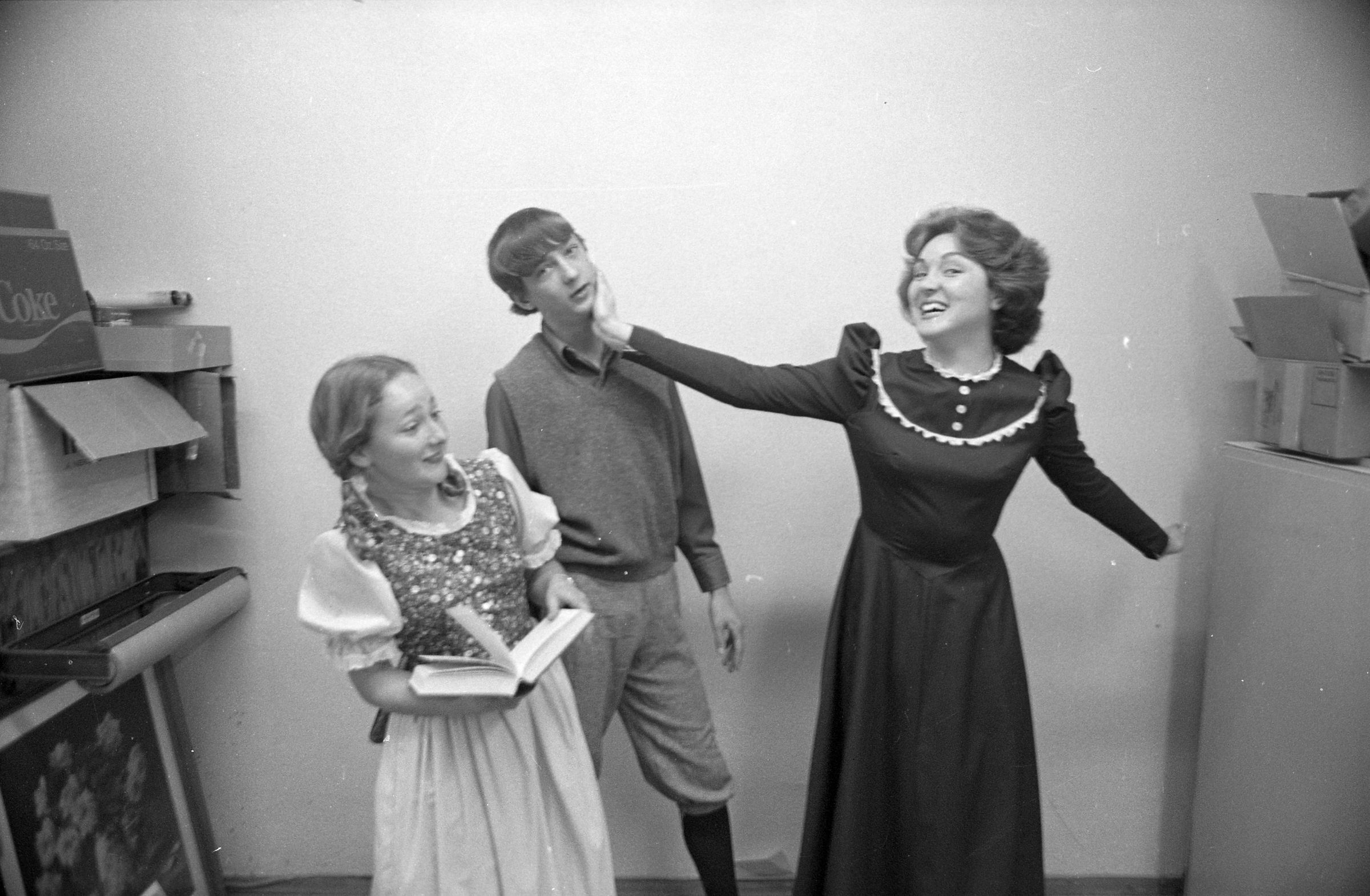 The images in group "c" show a blurry view of a map and a young woman pretending to slap a young man. A second young woman holding a book is watching. All three are wearing late 19th-century clothing.