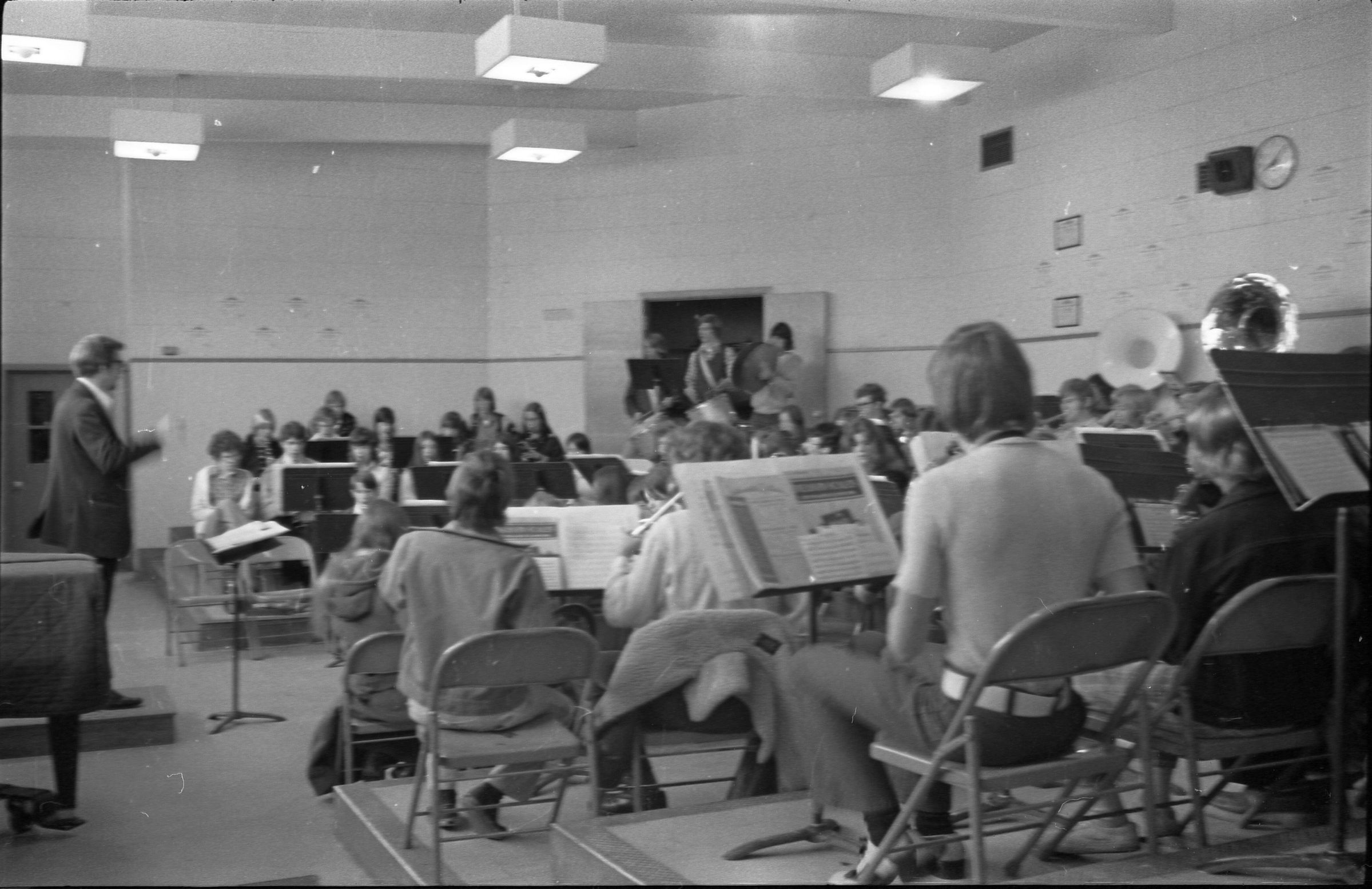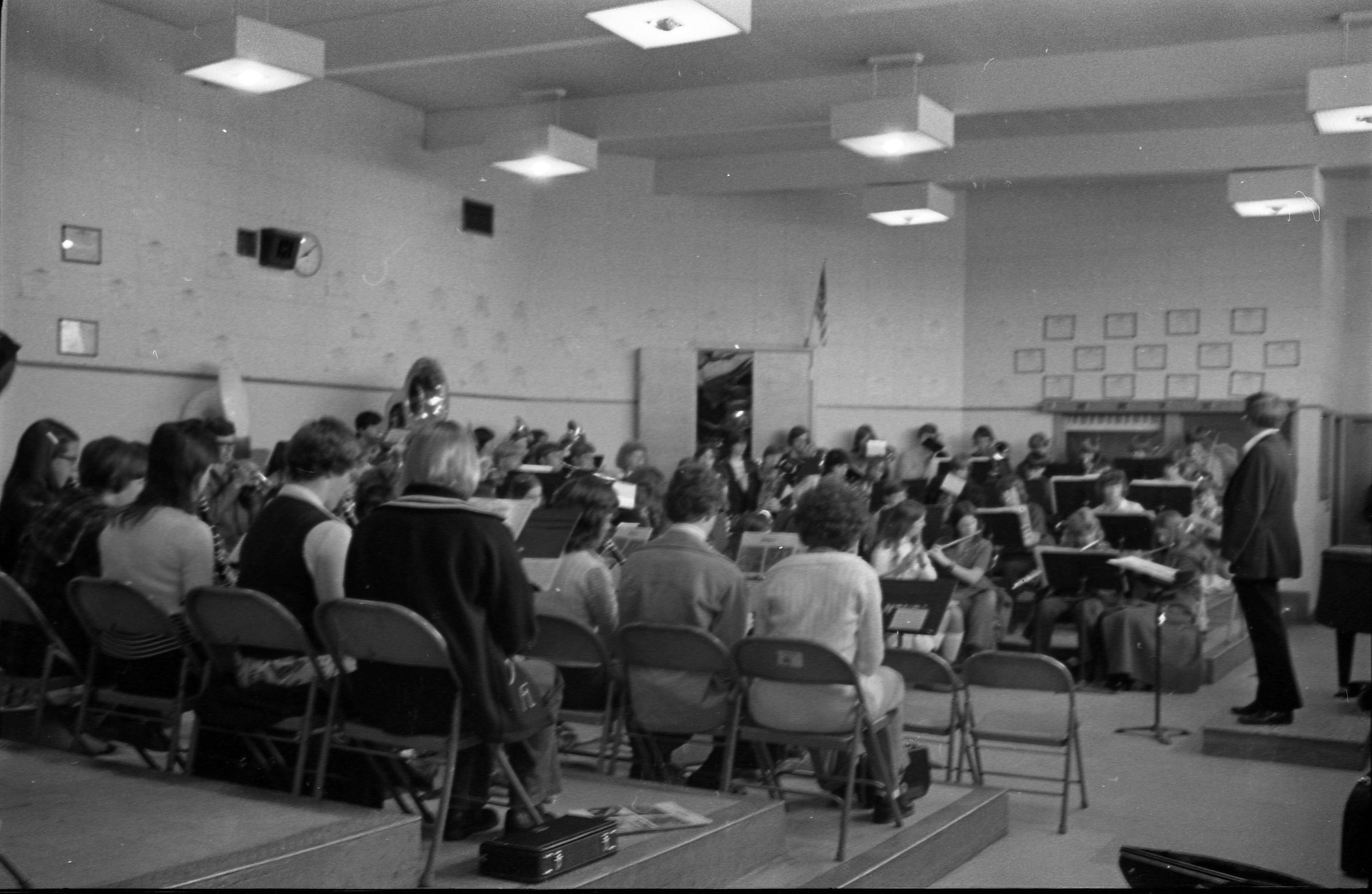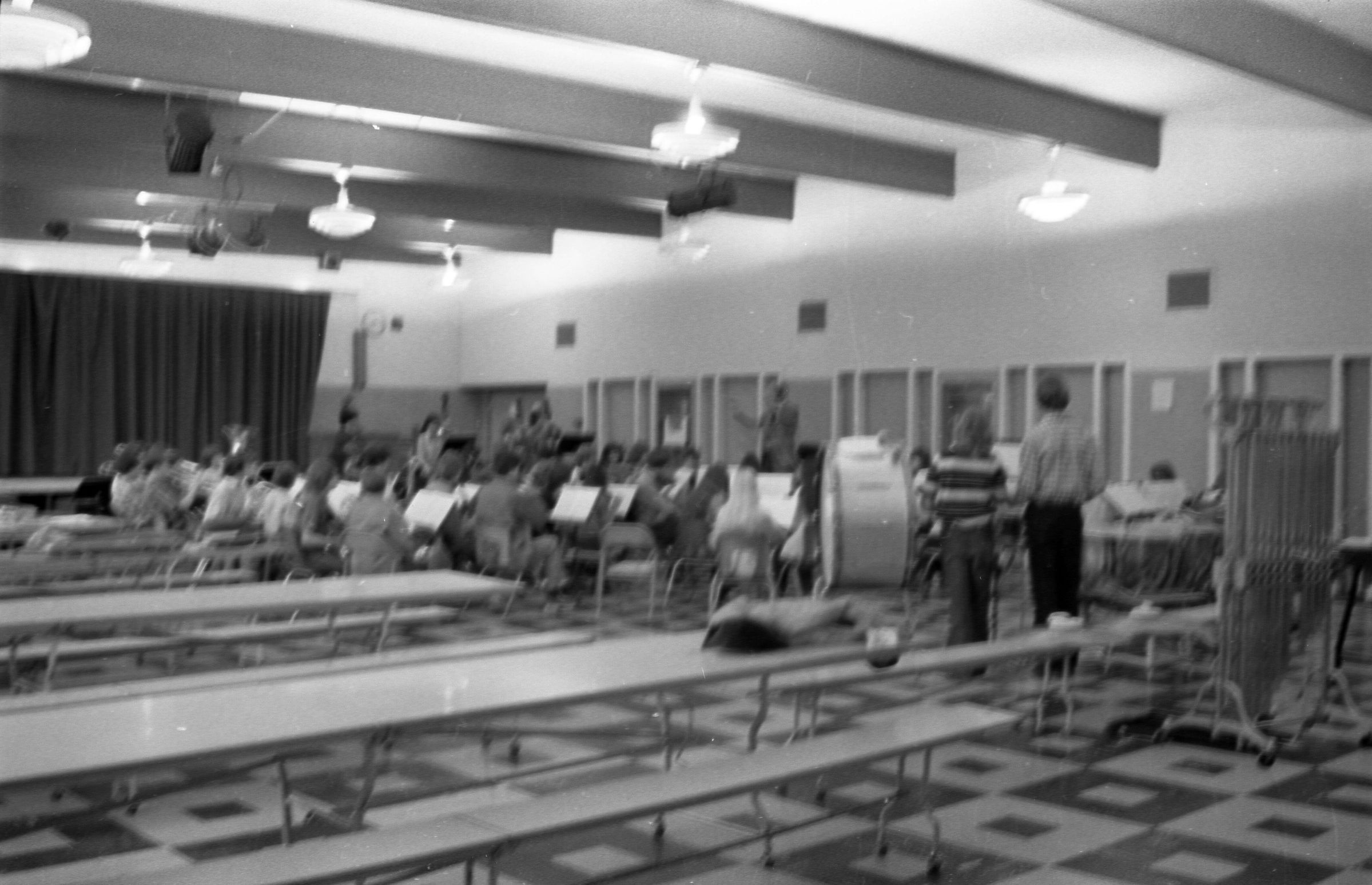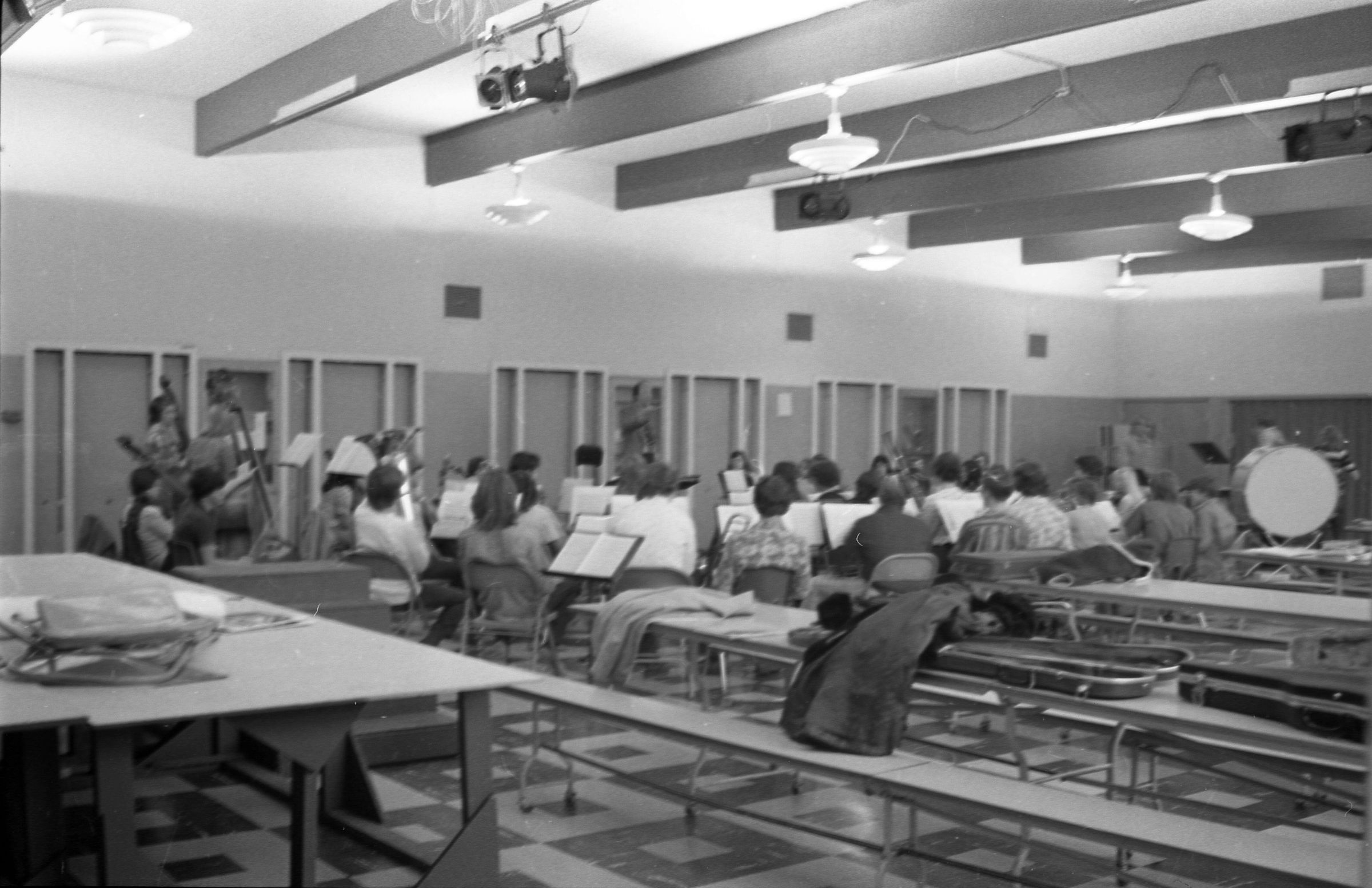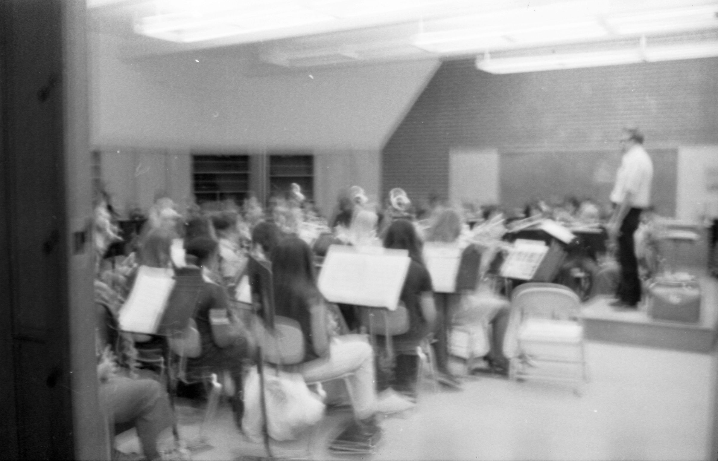 North Thurston High School Band, unknown year. Four strips of black and white negatives produced for the Lacey Leader newspaper. One strip holds six images (images 1-6) and three strips holds five images each (images 7-11, 12-16, and 17-21). Image 21 is not physically numbered on the negative strip. These images show performances and practices of the North Thurston High School band, marching band, and choir. Image 1 depicts a locker room with musical instrument cases laying haphazardly on the floor. Image 2 shows the band on stage from behind and looking our over an audience. Image 3 shows a conductor surrounded by the band playing on stage. The audience surrounds the entire stage. Image shows the conductor at the far left conducting the band, which occupies the rest of the photo's frame. Image 5 appears to show the same scene as image 4, but from the opposite side of the room. Image 6 shows the band practicing with the conductor at the center. Image 7 shows the marching band in full uniform practicing in a wet parking lot. Image 8 shows the band setting up for a practice or performance in a large room with long tables, likely a lunch room. Image 9 shows the same scene as image 8, but from the opposite end of the room. The image is blurred. Image 10 shows the same shot as image 9, but is in-focus. Image 11 depicts the band, from behind, playing in a practice room with the conductor at center in the background. A timpani is at the far left of the frame. Image 12 also shows the band, from behind, playing the practice room with the conductor at center in the background. Two tuba players are in the immediate foreground. Image 13 shows a choir performing on-stage with the backs of the audience's heads in the foreground. Image 14 shows the band performing and the conductor standing on a raised platform. The image is blurred. Image 15 shows the same shot as image 14, but is not blurred. Image 16 shows the conductor at the right of the image conducting the band, and four band members facing away from the camera in the immediate foreground. Image 17 shows the conductor from behind conducting the band in a practice room. There is a young man in striped pants playing trumpet at the bottom right of the frame. Image 18 shows the heads of two young men facing away from the camera in the very close foreground, and other seated band members in the middleground and background. Image 19 shows a group of young people seated on the floor of a music classroom and using the seats of their chairs as writing surfaces. One female individual is standing near the left-hand edge of the frame. Image 20 shows a group of six children seated around a round table wearing headphones. Image 21 shows a group of students seated on the floor and in chairs in a music classroom while one individual at right plays a guitar.
