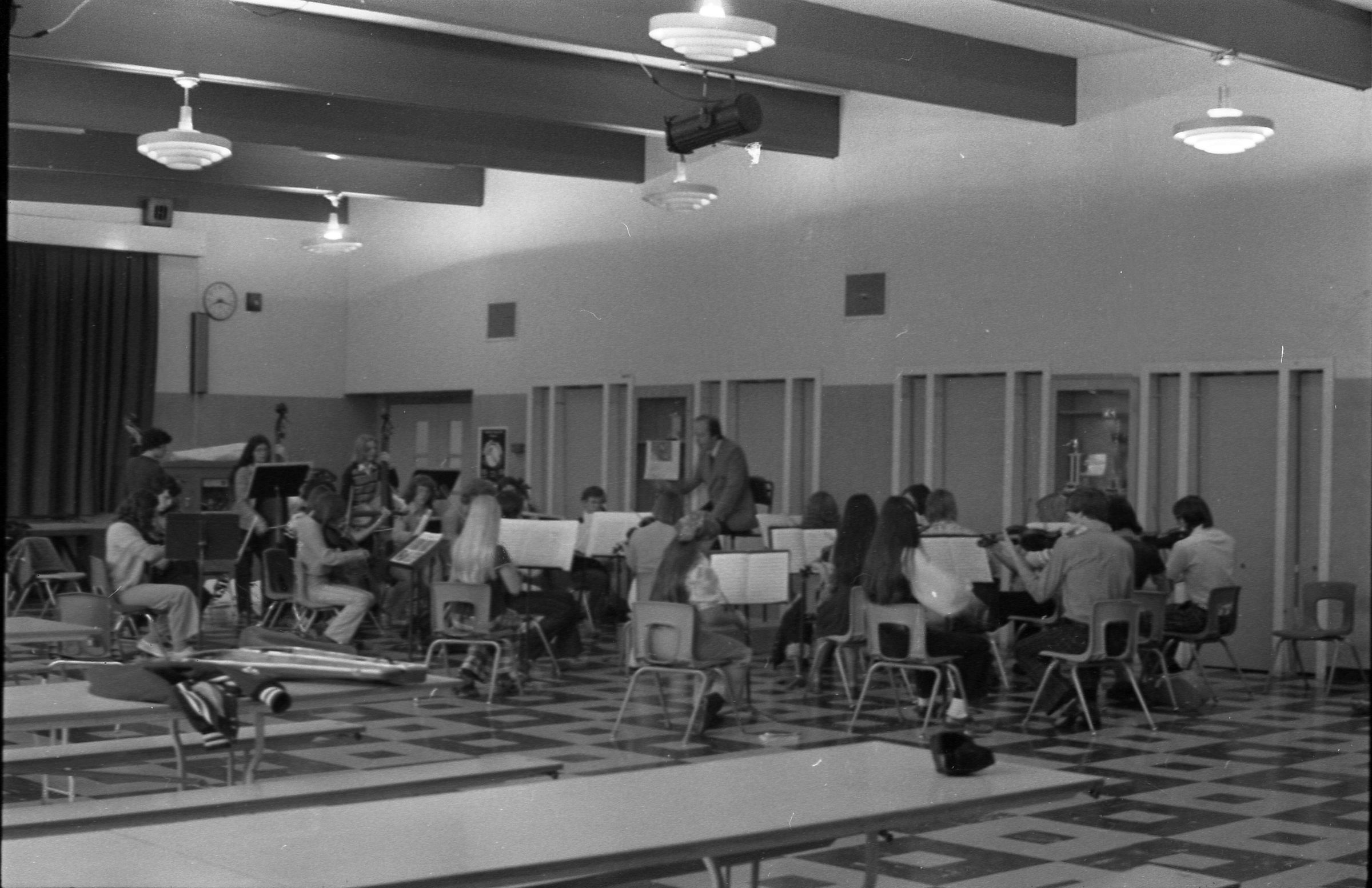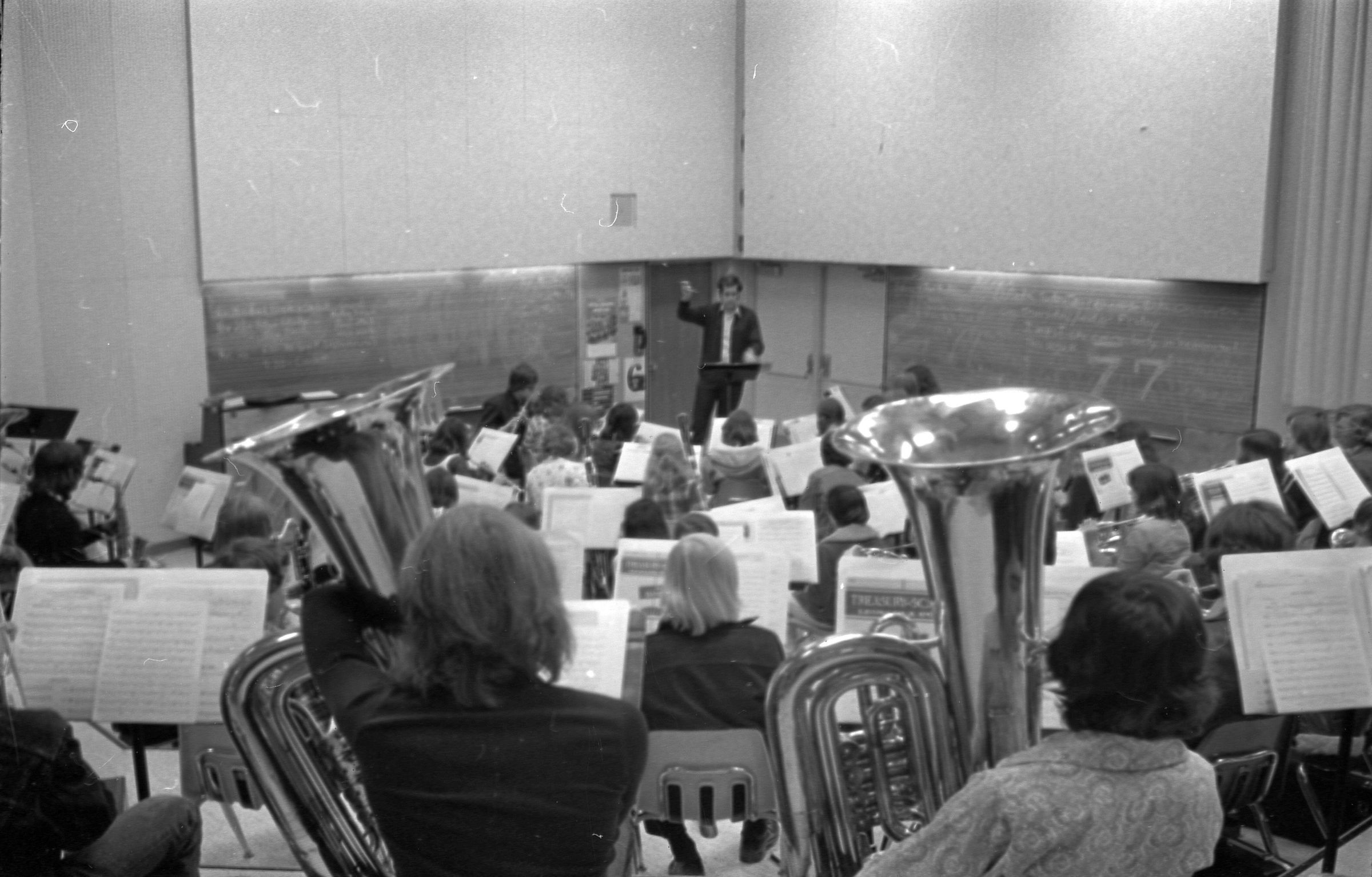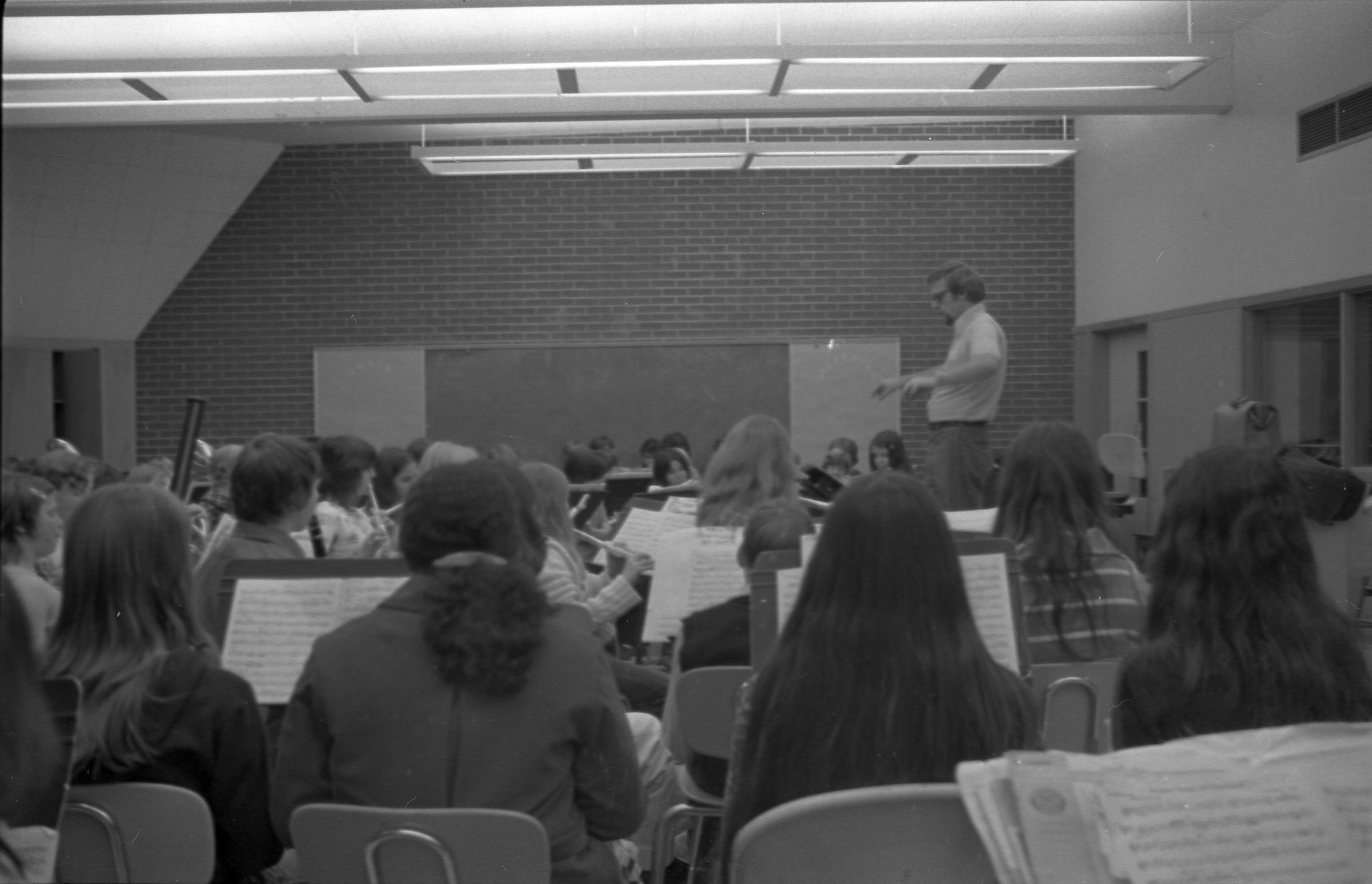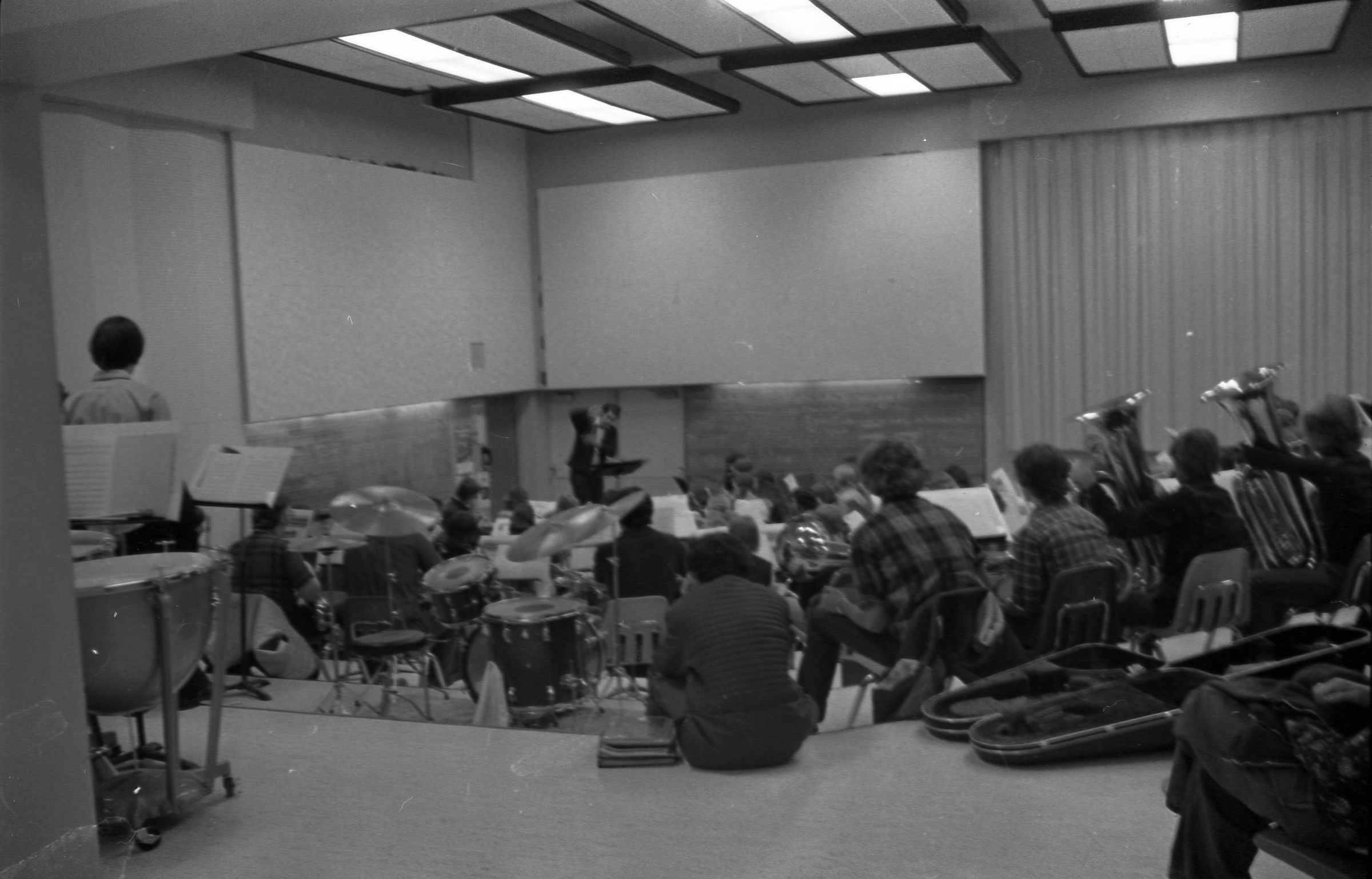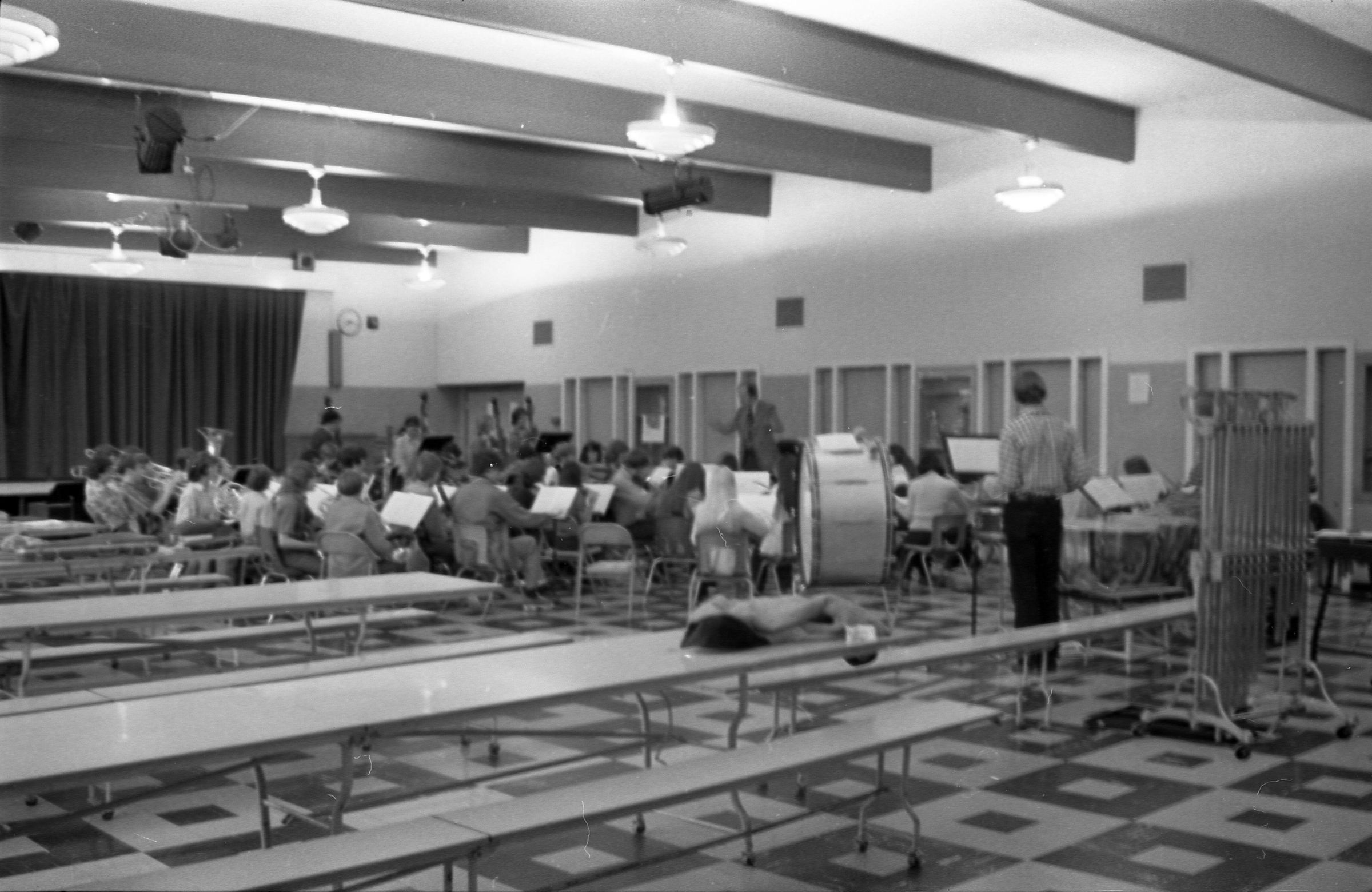 North Thurston High School Band, unknown year. Four strips of black and white negatives produced for the Lacey Leader newspaper. One strip holds six images (images 1-6) and three strips holds five images each (images 7-11, 12-16, and 17-21). Image 21 is not physically numbered on the negative strip. These images show performances and practices of the North Thurston High School band, marching band, and choir. Image 1 depicts a locker room with musical instrument cases laying haphazardly on the floor. Image 2 shows the band on stage from behind and looking our over an audience. Image 3 shows a conductor surrounded by the band playing on stage. The audience surrounds the entire stage. Image shows the conductor at the far left conducting the band, which occupies the rest of the photo's frame. Image 5 appears to show the same scene as image 4, but from the opposite side of the room. Image 6 shows the band practicing with the conductor at the center. Image 7 shows the marching band in full uniform practicing in a wet parking lot. Image 8 shows the band setting up for a practice or performance in a large room with long tables, likely a lunch room. Image 9 shows the same scene as image 8, but from the opposite end of the room. The image is blurred. Image 10 shows the same shot as image 9, but is in-focus. Image 11 depicts the band, from behind, playing in a practice room with the conductor at center in the background. A timpani is at the far left of the frame. Image 12 also shows the band, from behind, playing the practice room with the conductor at center in the background. Two tuba players are in the immediate foreground. Image 13 shows a choir performing on-stage with the backs of the audience's heads in the foreground. Image 14 shows the band performing and the conductor standing on a raised platform. The image is blurred. Image 15 shows the same shot as image 14, but is not blurred. Image 16 shows the conductor at the right of the image conducting the band, and four band members facing away from the camera in the immediate foreground. Image 17 shows the conductor from behind conducting the band in a practice room. There is a young man in striped pants playing trumpet at the bottom right of the frame. Image 18 shows the heads of two young men facing away from the camera in the very close foreground, and other seated band members in the middleground and background. Image 19 shows a group of young people seated on the floor of a music classroom and using the seats of their chairs as writing surfaces. One female individual is standing near the left-hand edge of the frame. Image 20 shows a group of six children seated around a round table wearing headphones. Image 21 shows a group of students seated on the floor and in chairs in a music classroom while one individual at right plays a guitar.