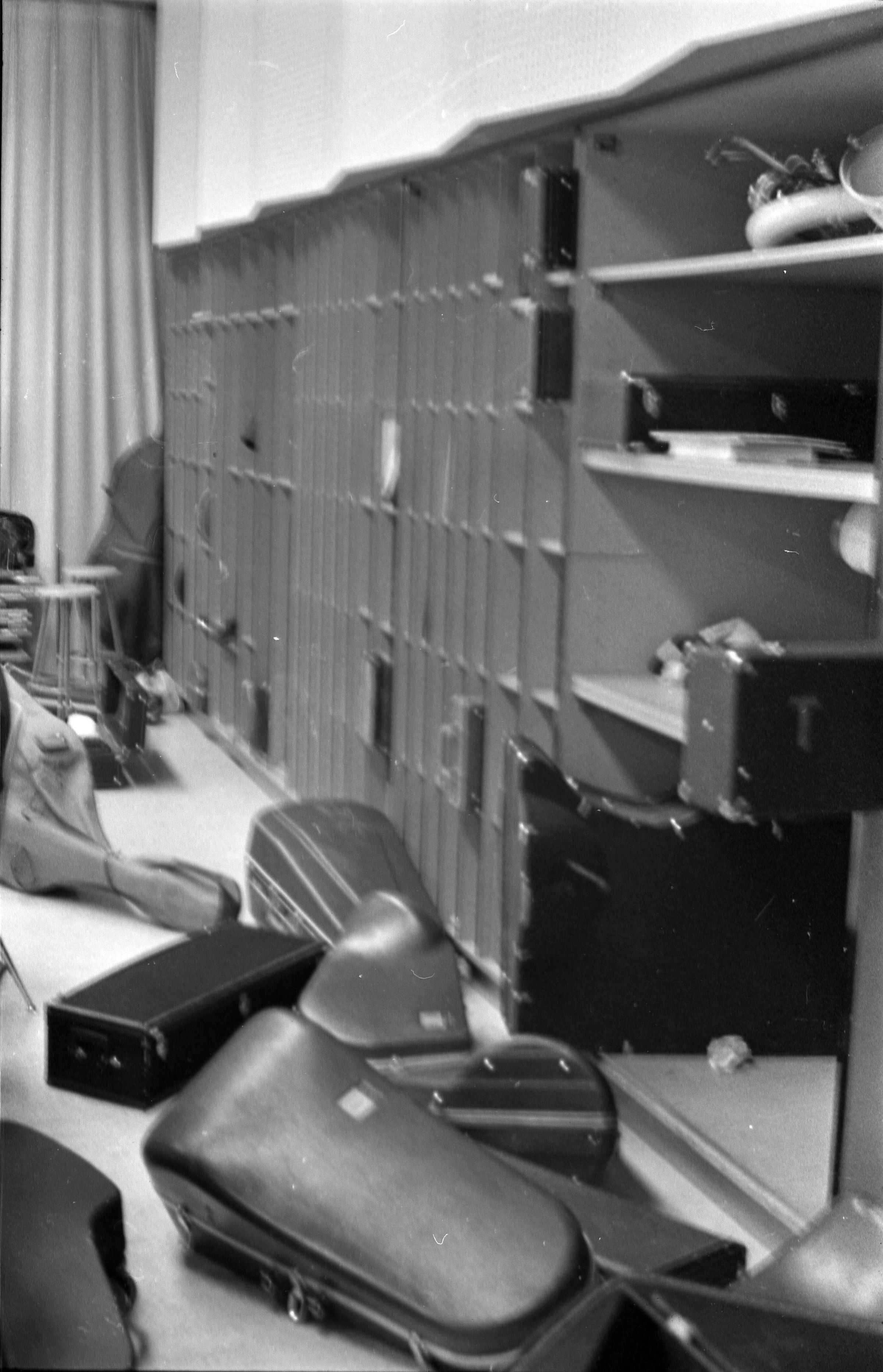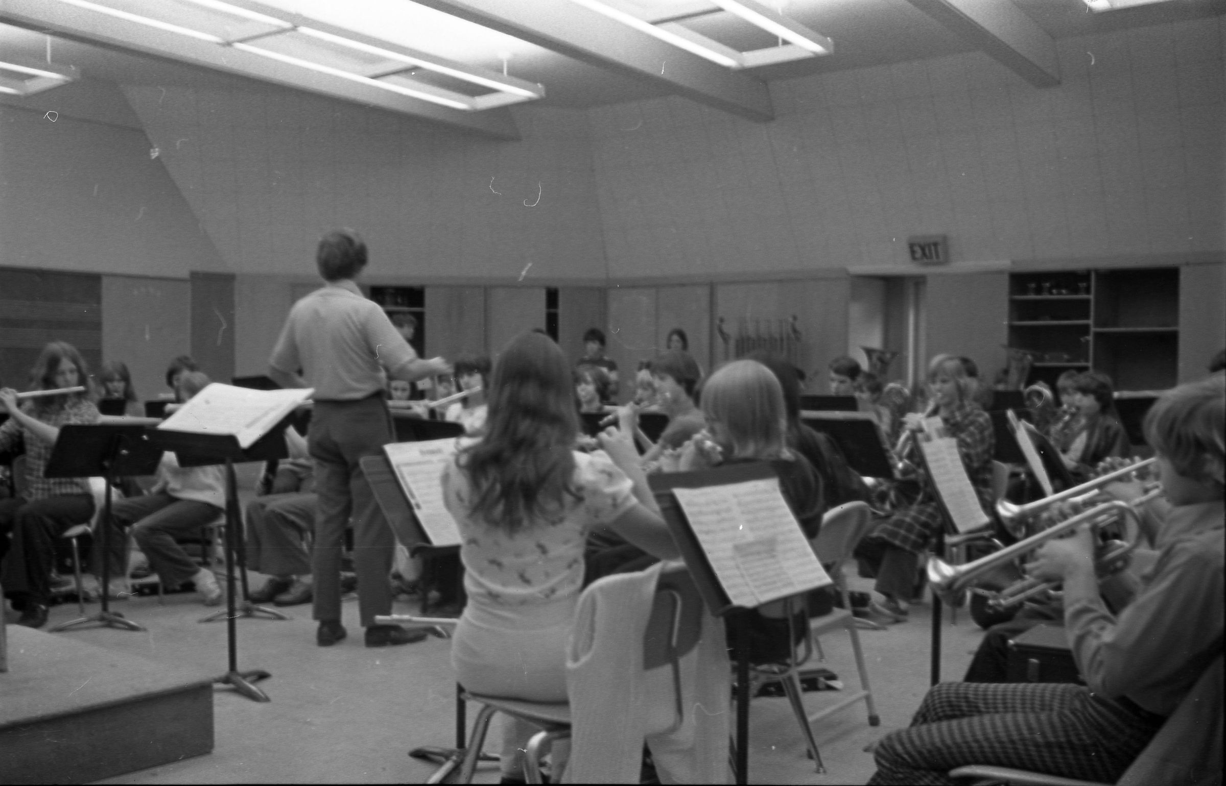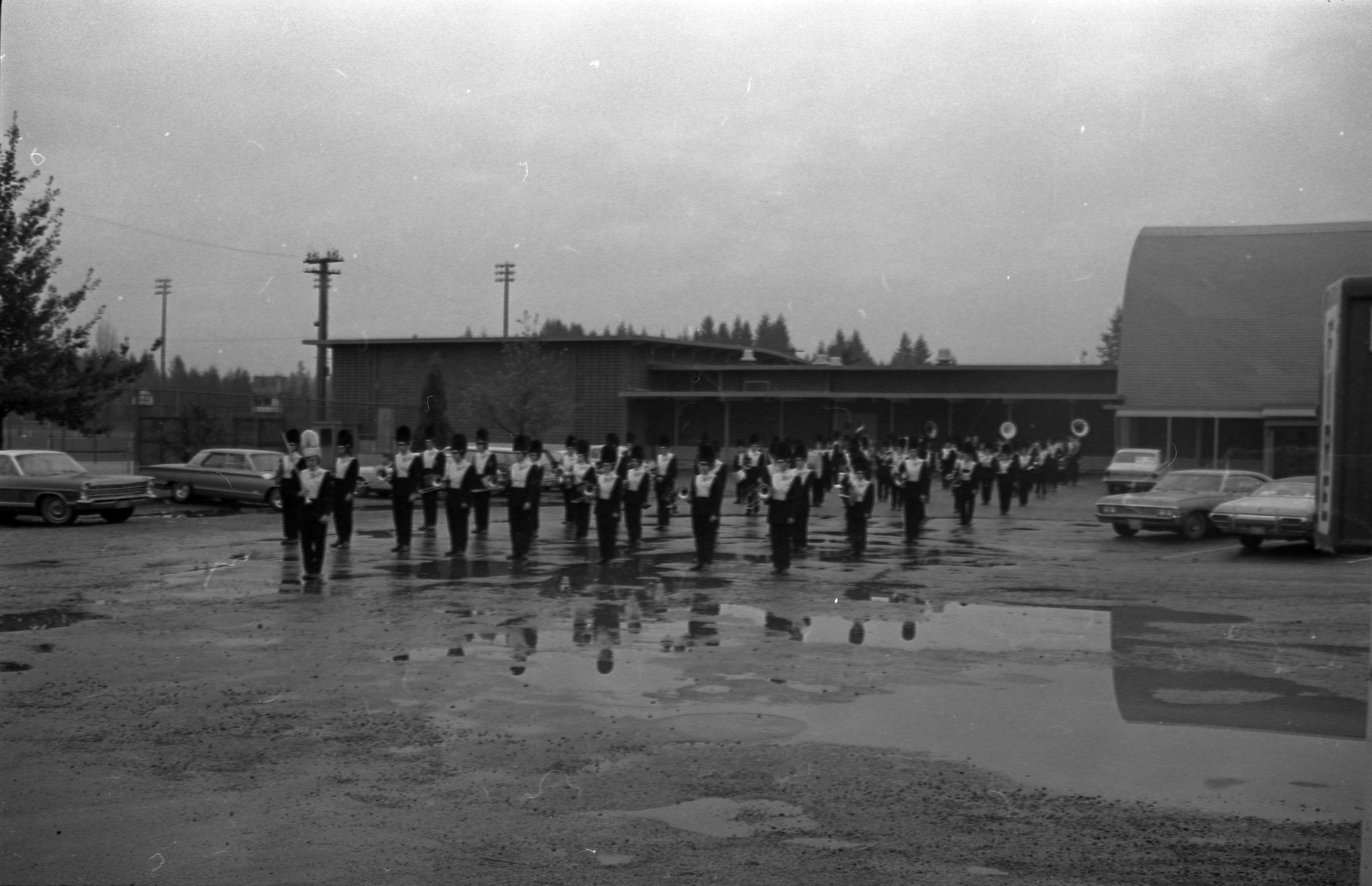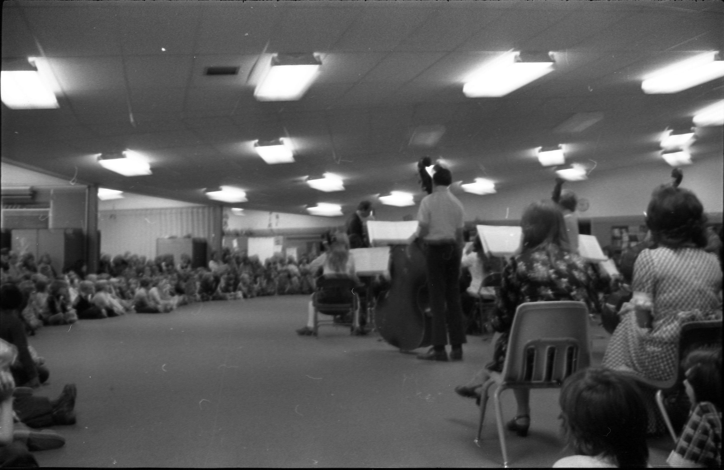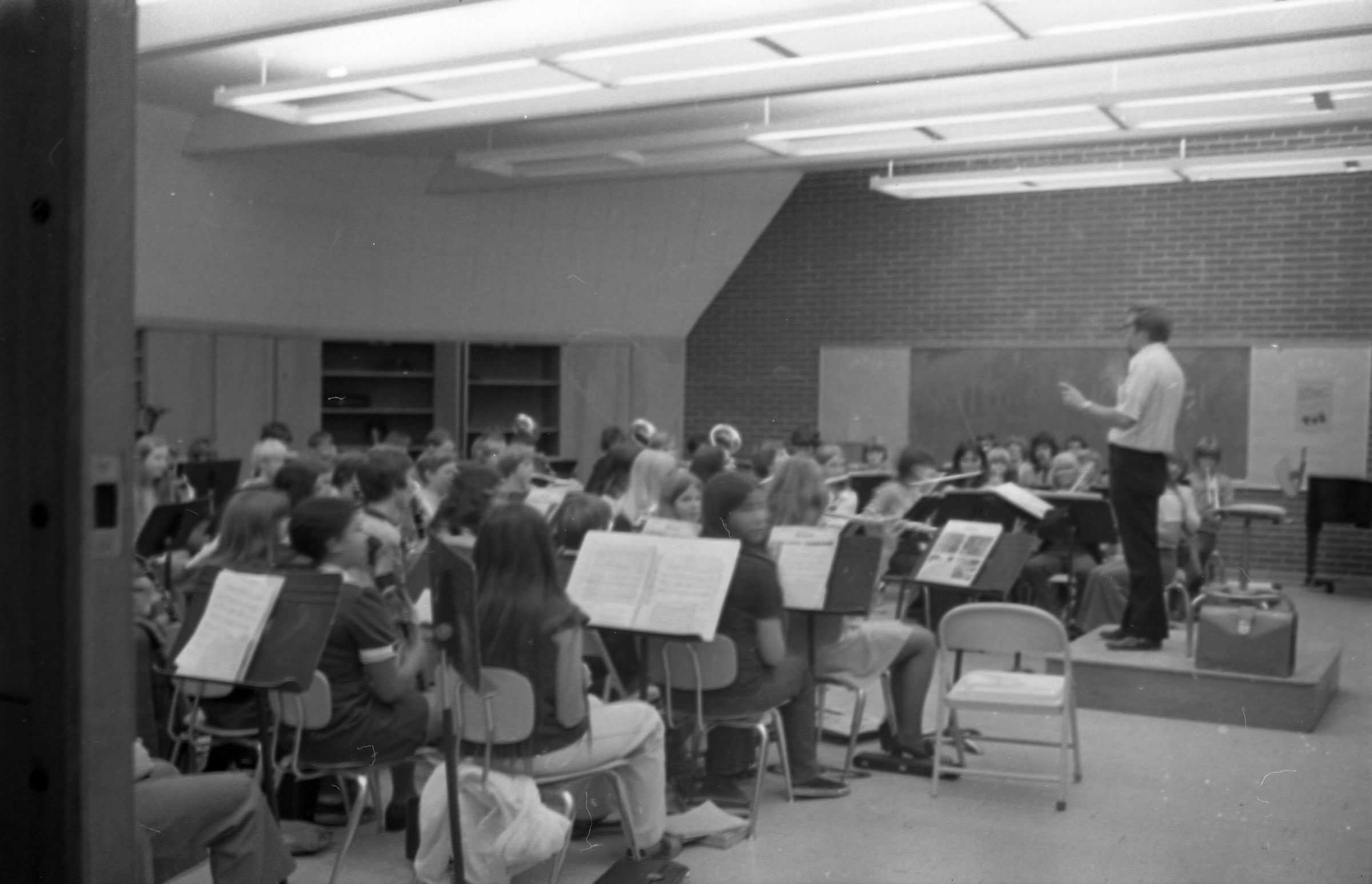 North Thurston High School Band, unknown year. Four strips of black and white negatives produced for the Lacey Leader newspaper. One strip holds six images (images 1-6) and three strips holds five images each (images 7-11, 12-16, and 17-21). Image 21 is not physically numbered on the negative strip. These images show performances and practices of the North Thurston High School band, marching band, and choir. Image 1 depicts a locker room with musical instrument cases laying haphazardly on the floor. Image 2 shows the band on stage from behind and looking our over an audience. Image 3 shows a conductor surrounded by the band playing on stage. The audience surrounds the entire stage. Image shows the conductor at the far left conducting the band, which occupies the rest of the photo's frame. Image 5 appears to show the same scene as image 4, but from the opposite side of the room. Image 6 shows the band practicing with the conductor at the center. Image 7 shows the marching band in full uniform practicing in a wet parking lot. Image 8 shows the band setting up for a practice or performance in a large room with long tables, likely a lunch room. Image 9 shows the same scene as image 8, but from the opposite end of the room. The image is blurred. Image 10 shows the same shot as image 9, but is in-focus. Image 11 depicts the band, from behind, playing in a practice room with the conductor at center in the background. A timpani is at the far left of the frame. Image 12 also shows the band, from behind, playing the practice room with the conductor at center in the background. Two tuba players are in the immediate foreground. Image 13 shows a choir performing on-stage with the backs of the audience's heads in the foreground. Image 14 shows the band performing and the conductor standing on a raised platform. The image is blurred. Image 15 shows the same shot as image 14, but is not blurred. Image 16 shows the conductor at the right of the image conducting the band, and four band members facing away from the camera in the immediate foreground. Image 17 shows the conductor from behind conducting the band in a practice room. There is a young man in striped pants playing trumpet at the bottom right of the frame. Image 18 shows the heads of two young men facing away from the camera in the very close foreground, and other seated band members in the middleground and background. Image 19 shows a group of young people seated on the floor of a music classroom and using the seats of their chairs as writing surfaces. One female individual is standing near the left-hand edge of the frame. Image 20 shows a group of six children seated around a round table wearing headphones. Image 21 shows a group of students seated on the floor and in chairs in a music classroom while one individual at right plays a guitar.