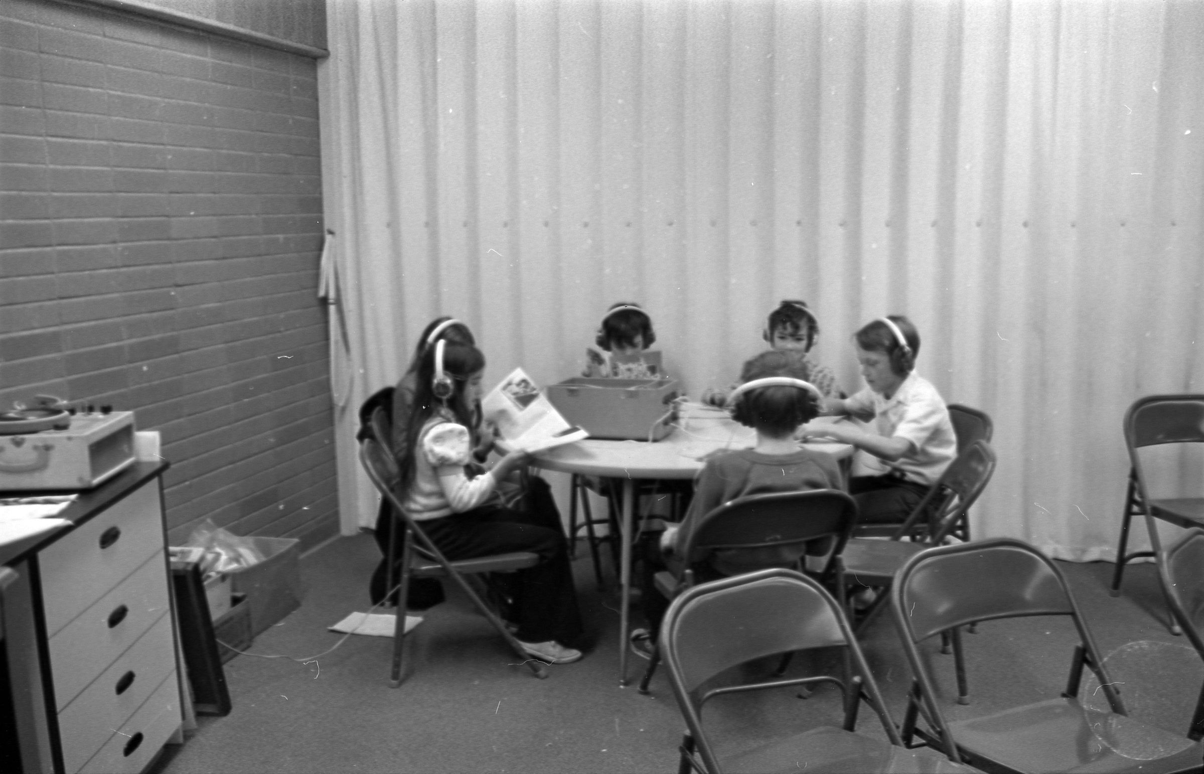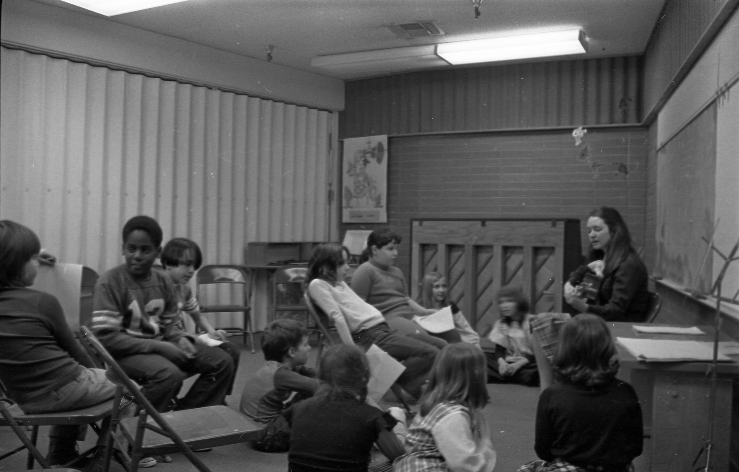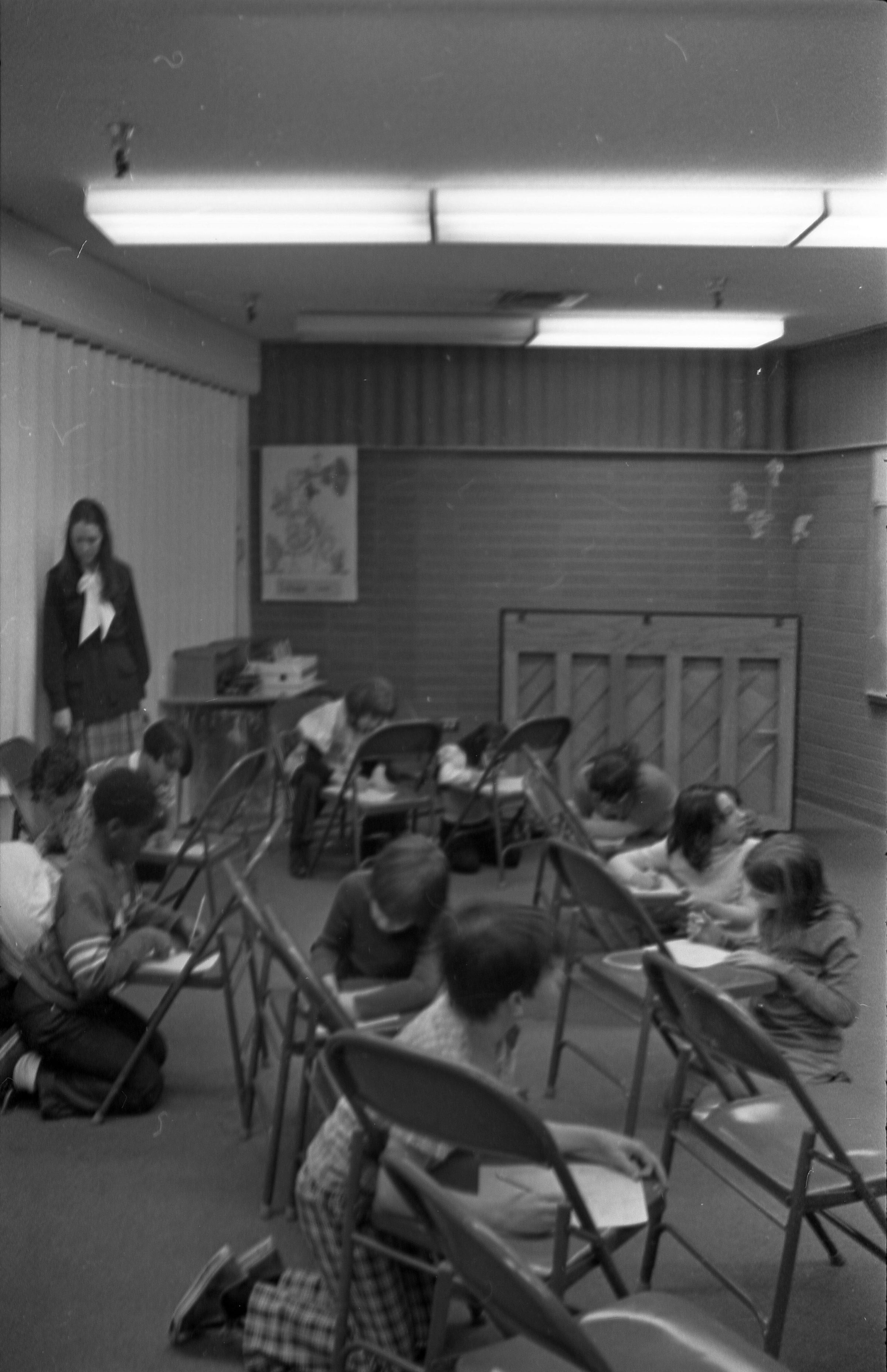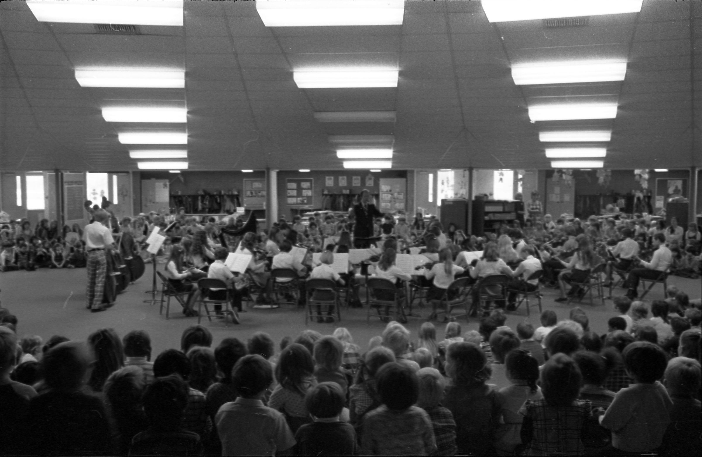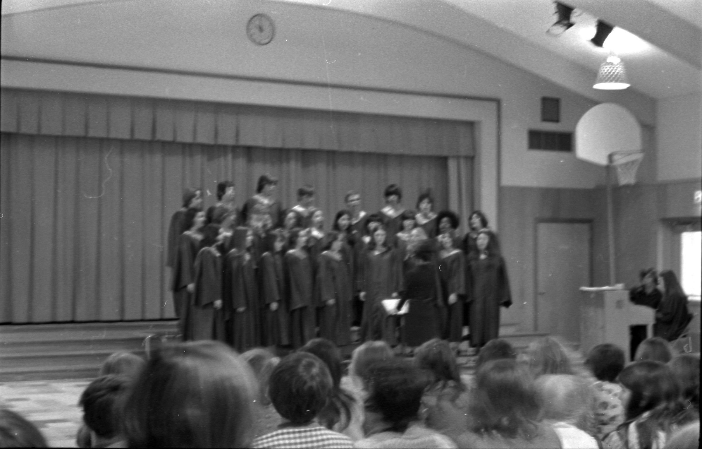 North Thurston High School Band, unknown year. Four strips of black and white negatives produced for the Lacey Leader newspaper. One strip holds six images (images 1-6) and three strips holds five images each (images 7-11, 12-16, and 17-21). Image 21 is not physically numbered on the negative strip. These images show performances and practices of the North Thurston High School band, marching band, and choir. Image 1 depicts a locker room with musical instrument cases laying haphazardly on the floor. Image 2 shows the band on stage from behind and looking our over an audience. Image 3 shows a conductor surrounded by the band playing on stage. The audience surrounds the entire stage. Image shows the conductor at the far left conducting the band, which occupies the rest of the photo's frame. Image 5 appears to show the same scene as image 4, but from the opposite side of the room. Image 6 shows the band practicing with the conductor at the center. Image 7 shows the marching band in full uniform practicing in a wet parking lot. Image 8 shows the band setting up for a practice or performance in a large room with long tables, likely a lunch room. Image 9 shows the same scene as image 8, but from the opposite end of the room. The image is blurred. Image 10 shows the same shot as image 9, but is in-focus. Image 11 depicts the band, from behind, playing in a practice room with the conductor at center in the background. A timpani is at the far left of the frame. Image 12 also shows the band, from behind, playing the practice room with the conductor at center in the background. Two tuba players are in the immediate foreground. Image 13 shows a choir performing on-stage with the backs of the audience's heads in the foreground. Image 14 shows the band performing and the conductor standing on a raised platform. The image is blurred. Image 15 shows the same shot as image 14, but is not blurred. Image 16 shows the conductor at the right of the image conducting the band, and four band members facing away from the camera in the immediate foreground. Image 17 shows the conductor from behind conducting the band in a practice room. There is a young man in striped pants playing trumpet at the bottom right of the frame. Image 18 shows the heads of two young men facing away from the camera in the very close foreground, and other seated band members in the middleground and background. Image 19 shows a group of young people seated on the floor of a music classroom and using the seats of their chairs as writing surfaces. One female individual is standing near the left-hand edge of the frame. Image 20 shows a group of six children seated around a round table wearing headphones. Image 21 shows a group of students seated on the floor and in chairs in a music classroom while one individual at right plays a guitar.