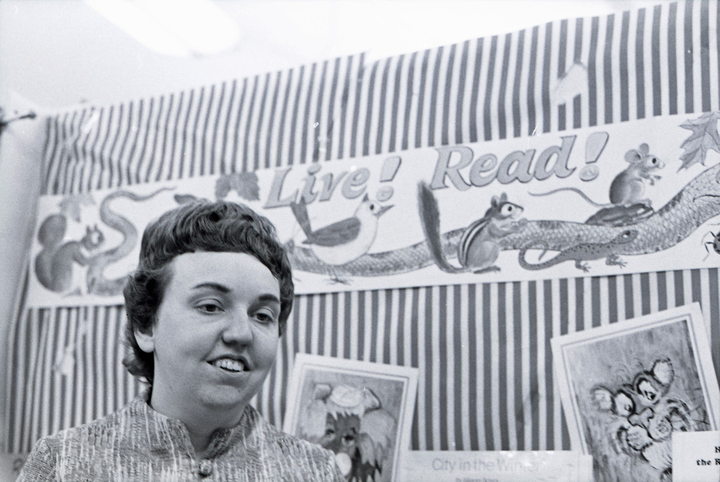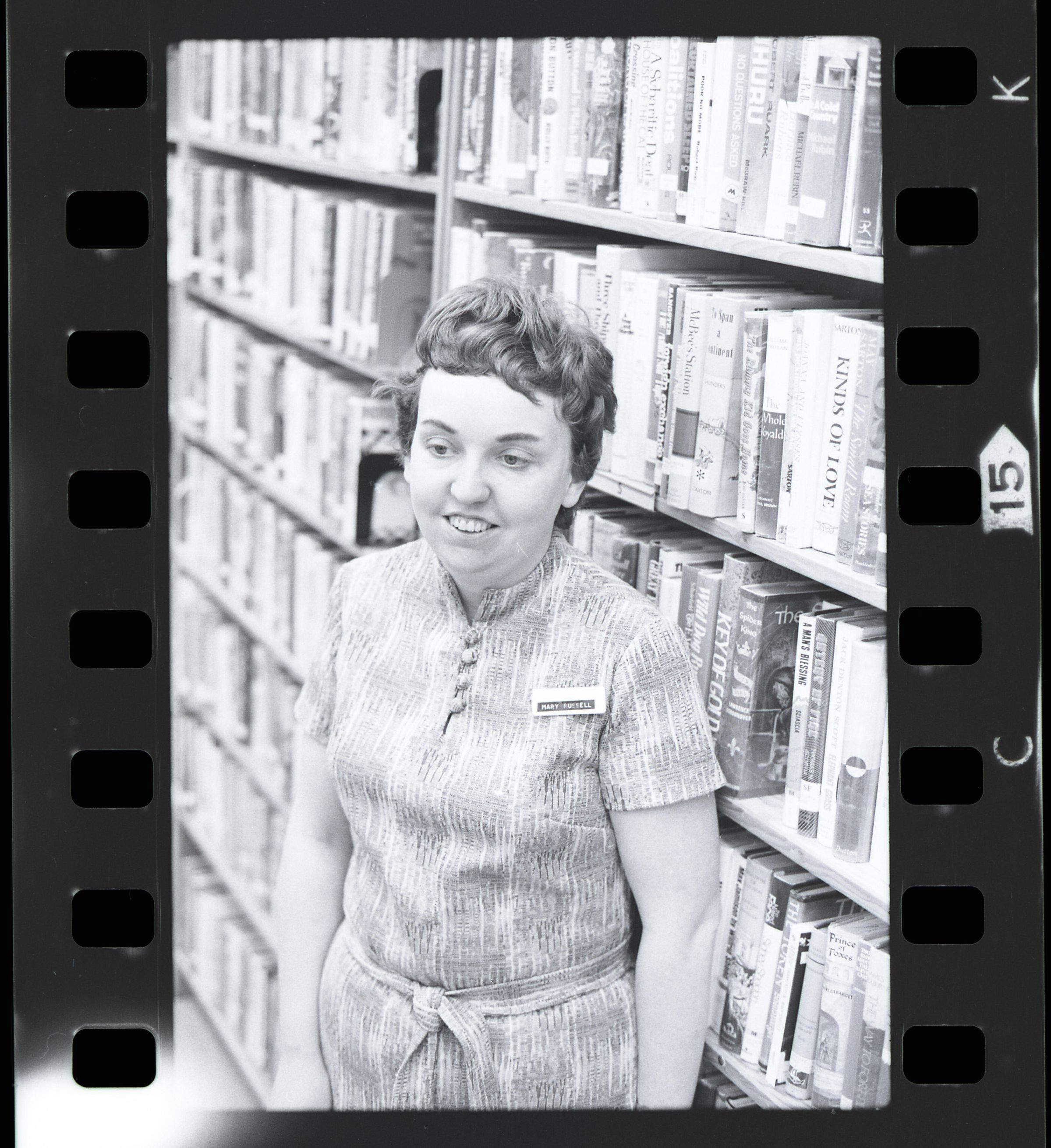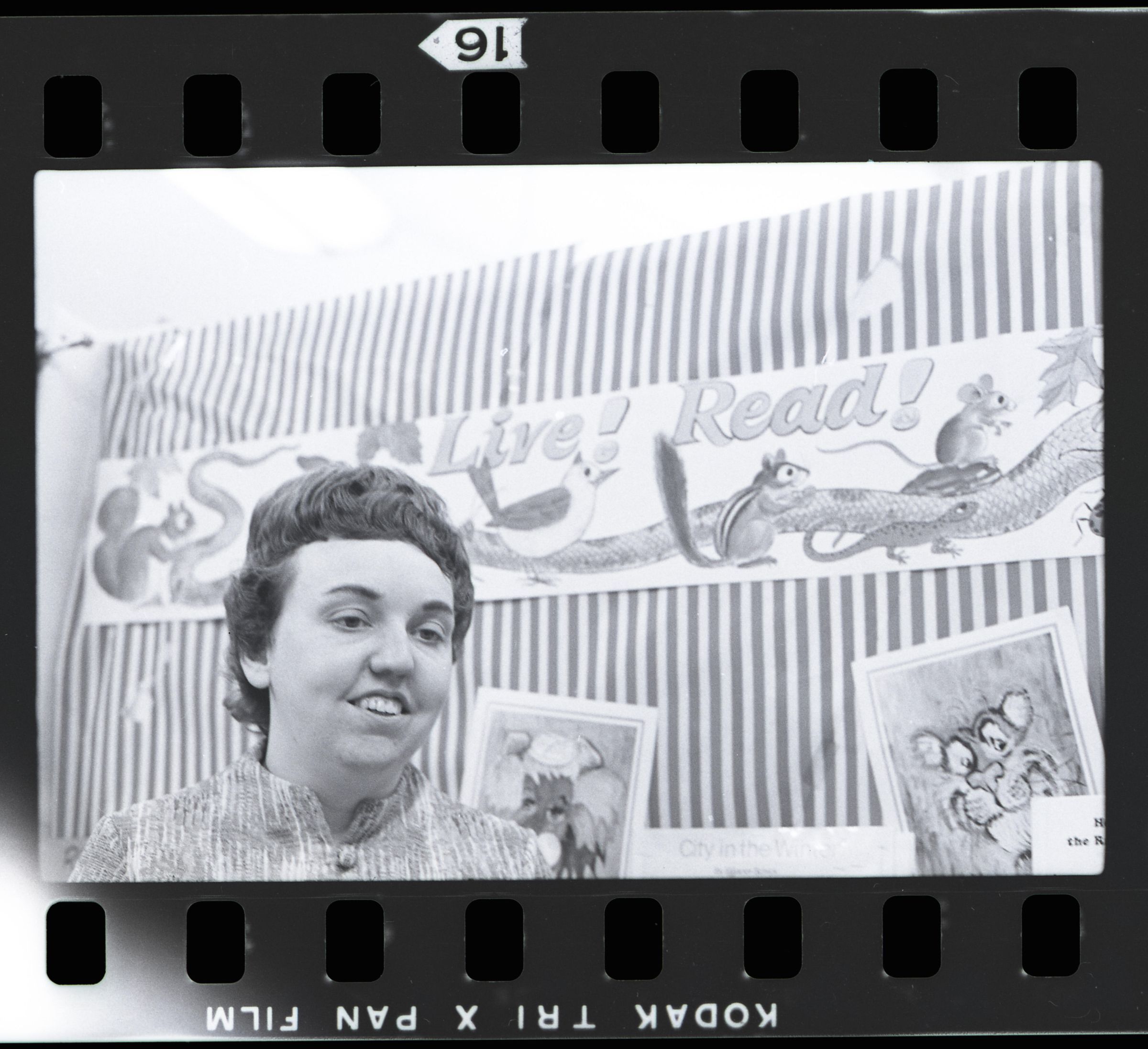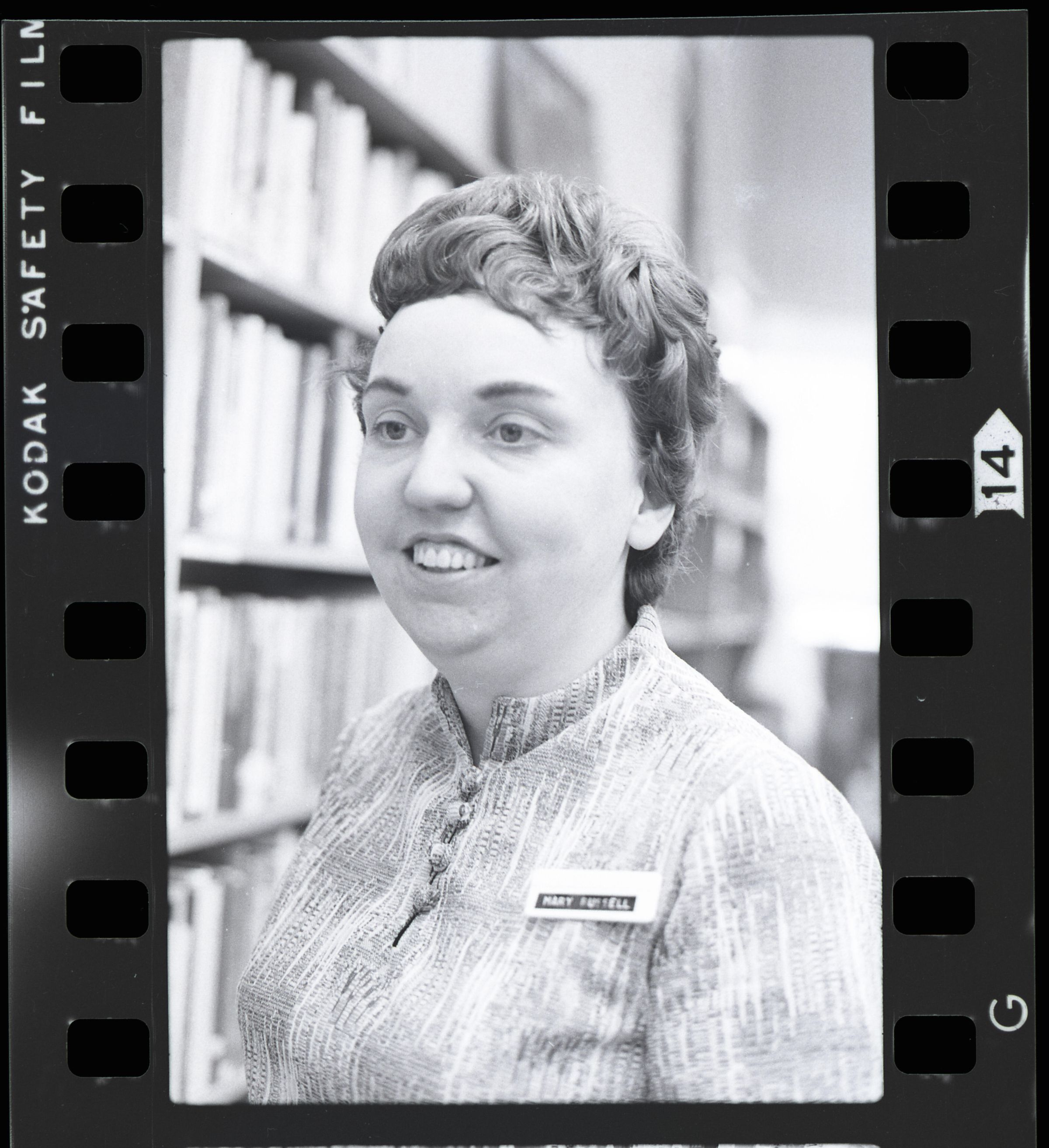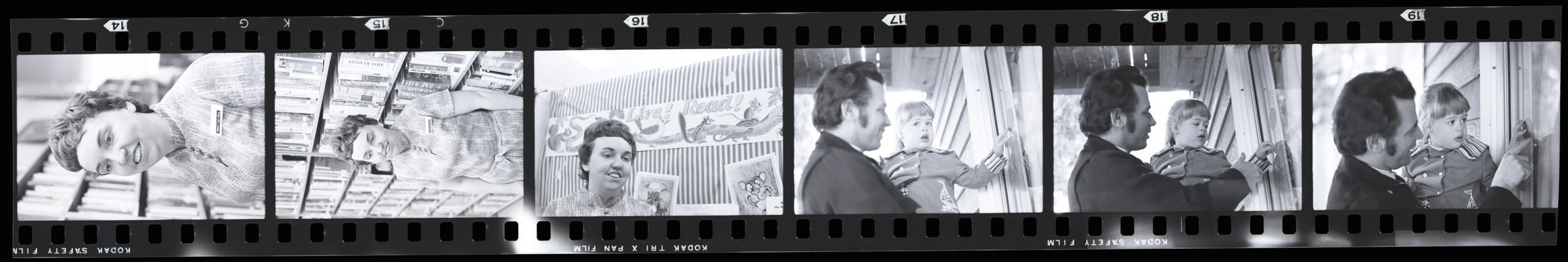 Mary Russell, 1975. This black and white negative strip bearing six images was created for the Lacey Leader newspaper. These images are numbered 14-19. Image 14 shows a woman (Mary Russell) from the chest up standing in front of a library bookshelf. She is wearing a name tag which reads "Mary Russell." Image 15 shows the same woman from the waist up again standing in front of library shelves. Image 16 shows the same woman from the shoulders up in front of a banner which reads "Live! Read!" Image 17 shows a man in profile holding a young female child. They are facing what appears to be a window or framed artwork. The child is reaching out and touching the window or piece of artwork. Image 18 shows the same scene, but here the man is reaching toward the child's hand. Image 19 again shows the same scene, but the child is again touching the window or artwork while the man is pointing at the window or artwork.