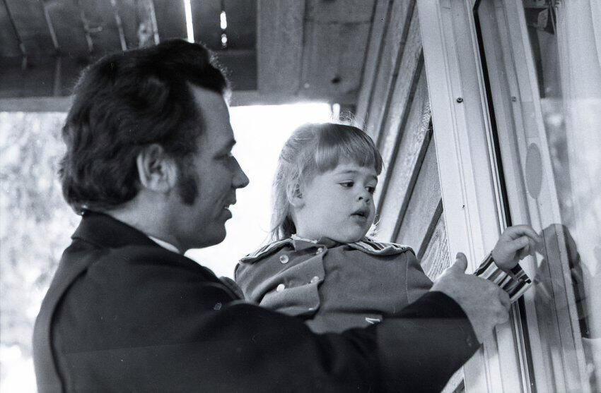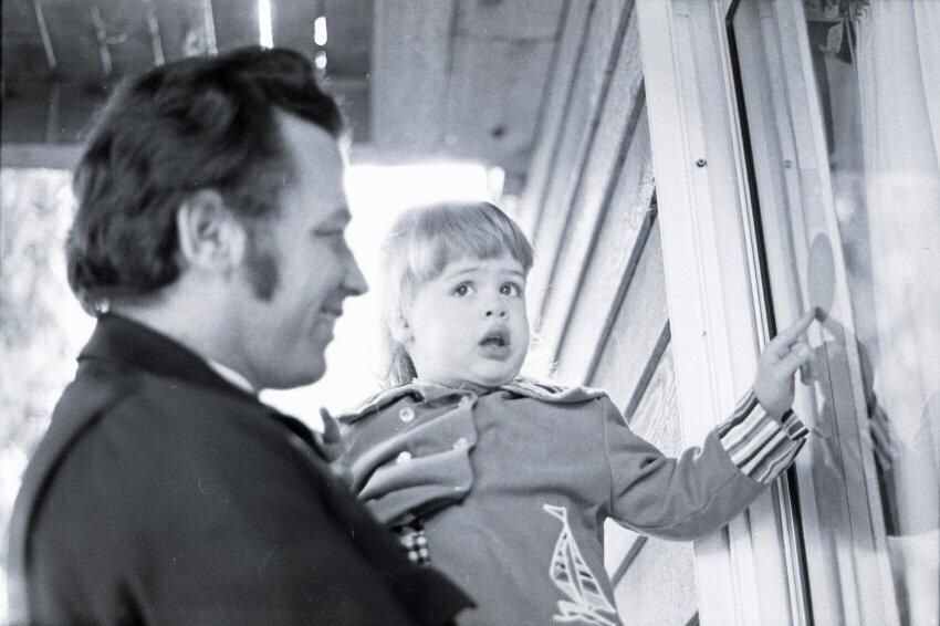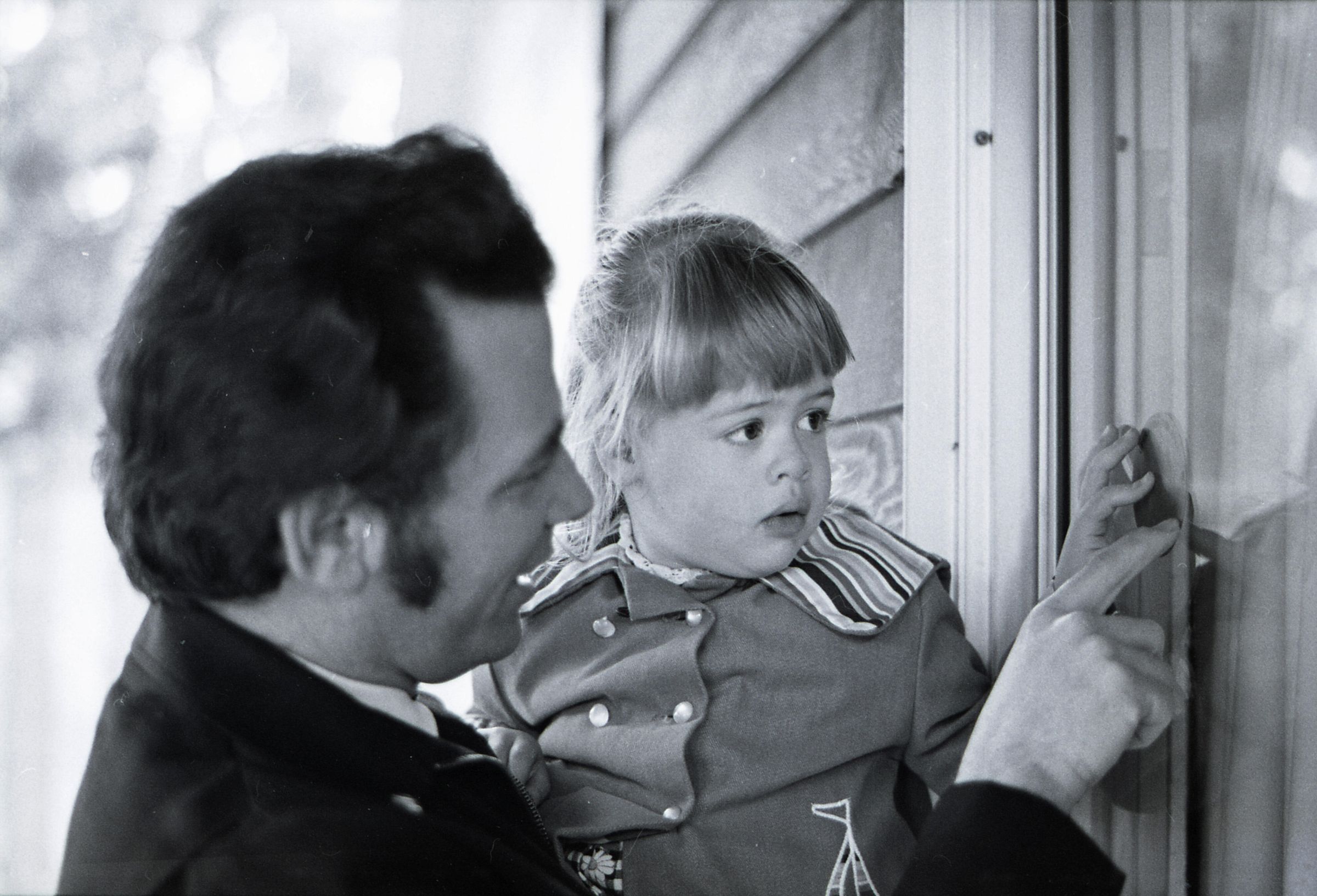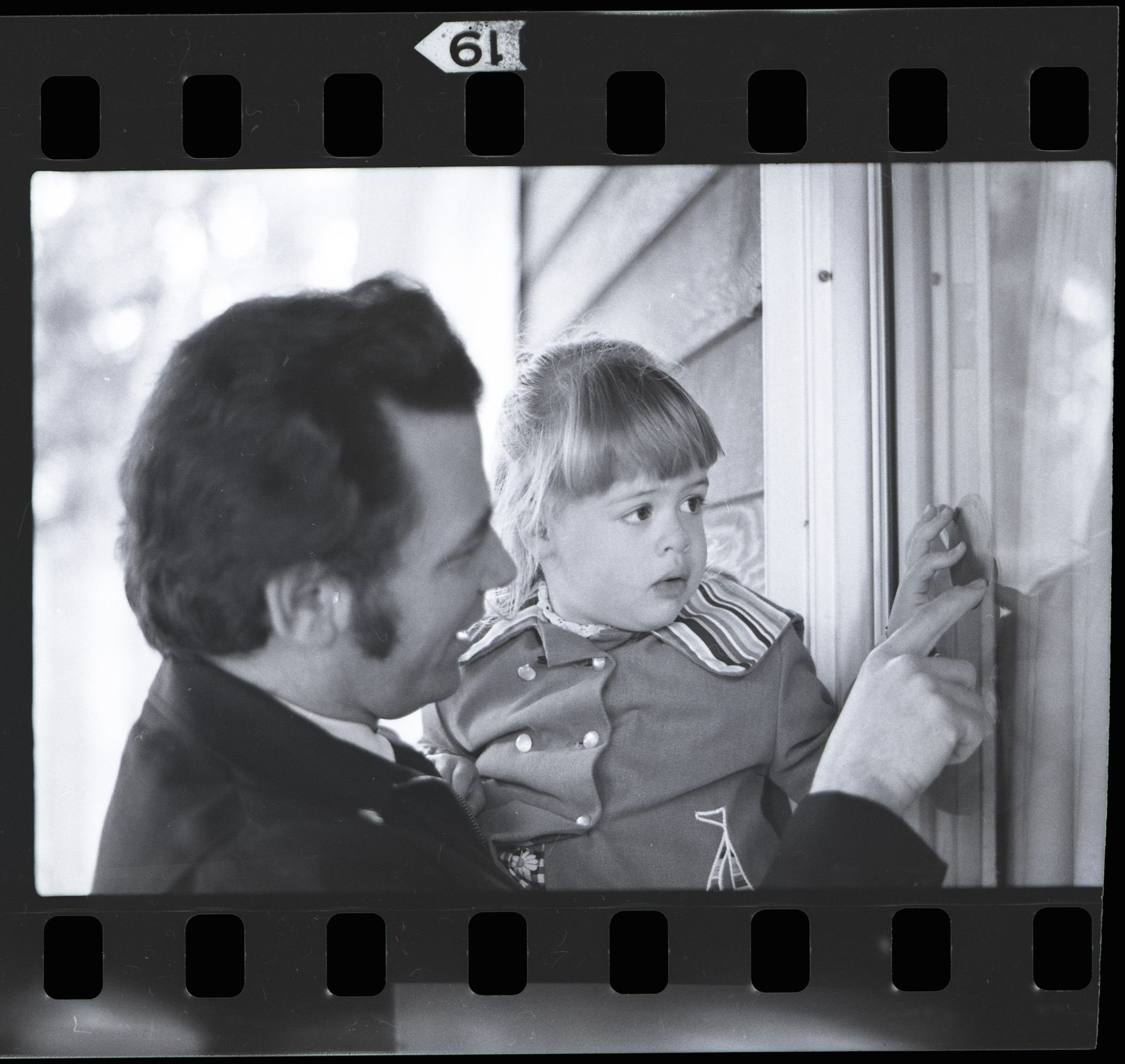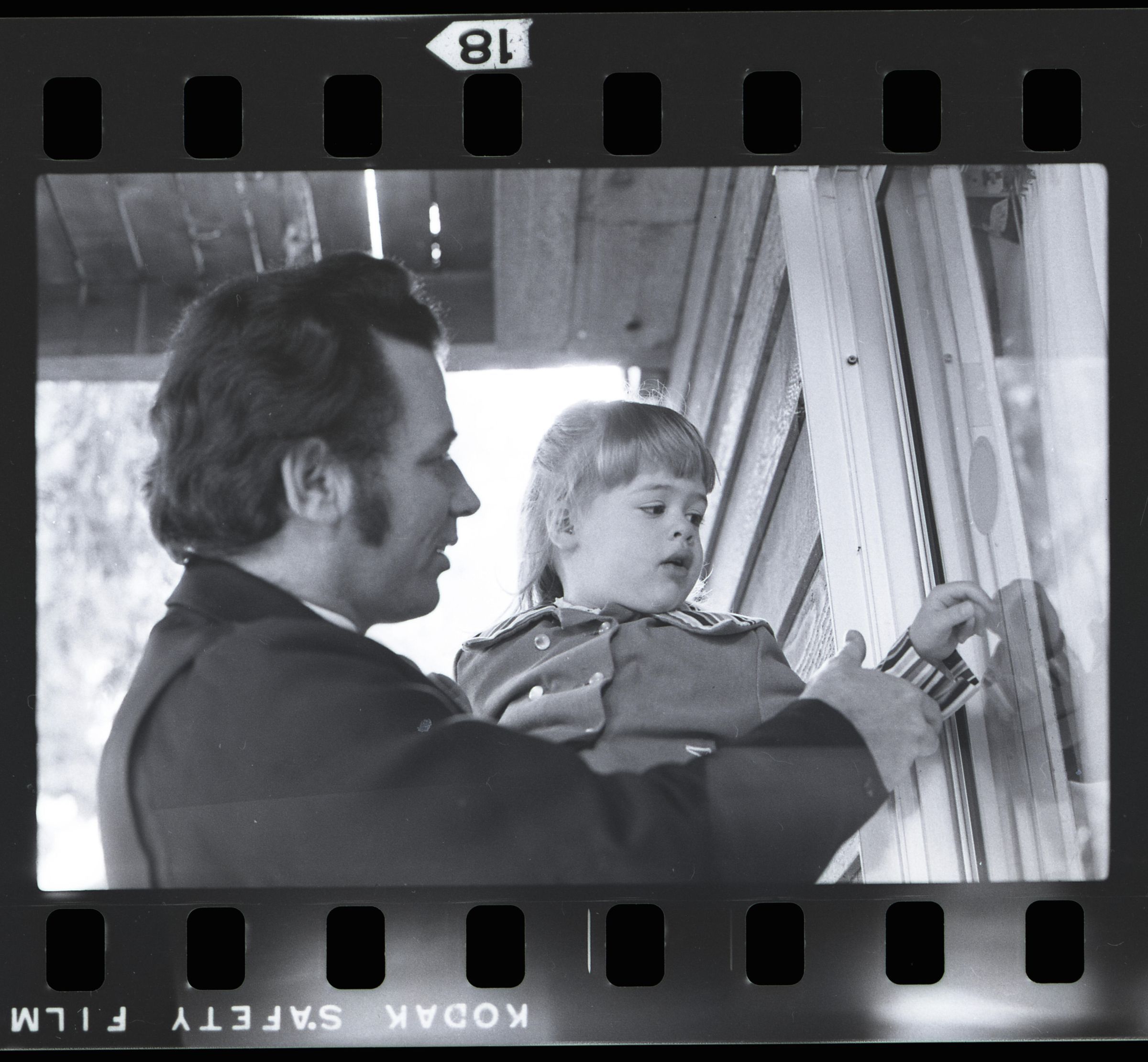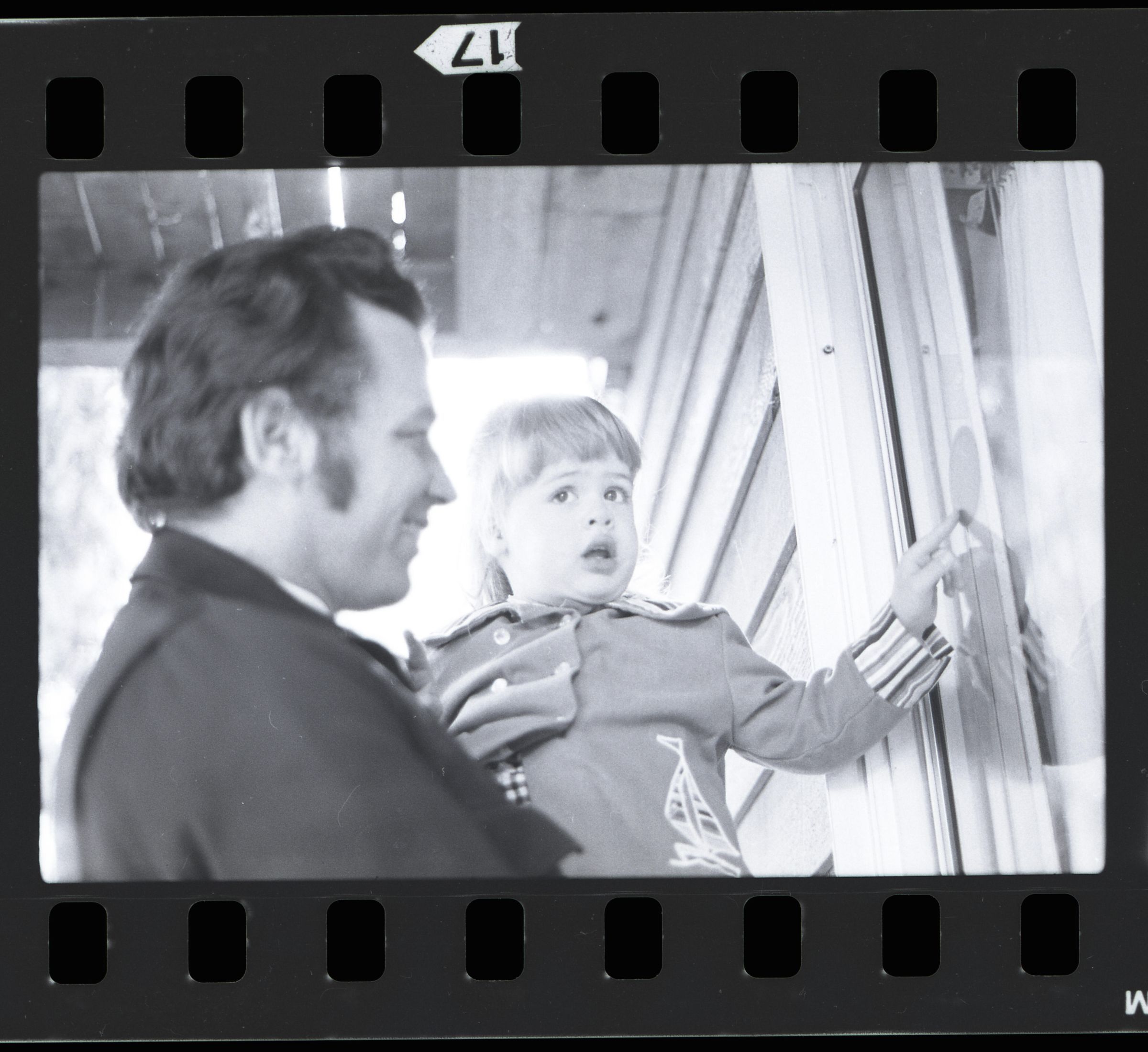 Mary Russell, 1975. This black and white negative strip bearing six images was created for the Lacey Leader newspaper. These images are numbered 14-19. Image 14 shows a woman (Mary Russell) from the chest up standing in front of a library bookshelf. She is wearing a name tag which reads "Mary Russell." Image 15 shows the same woman from the waist up again standing in front of library shelves. Image 16 shows the same woman from the shoulders up in front of a banner which reads "Live! Read!" Image 17 shows a man in profile holding a young female child. They are facing what appears to be a window or framed artwork. The child is reaching out and touching the window or piece of artwork. Image 18 shows the same scene, but here the man is reaching toward the child's hand. Image 19 again shows the same scene, but the child is again touching the window or artwork while the man is pointing at the window or artwork.
