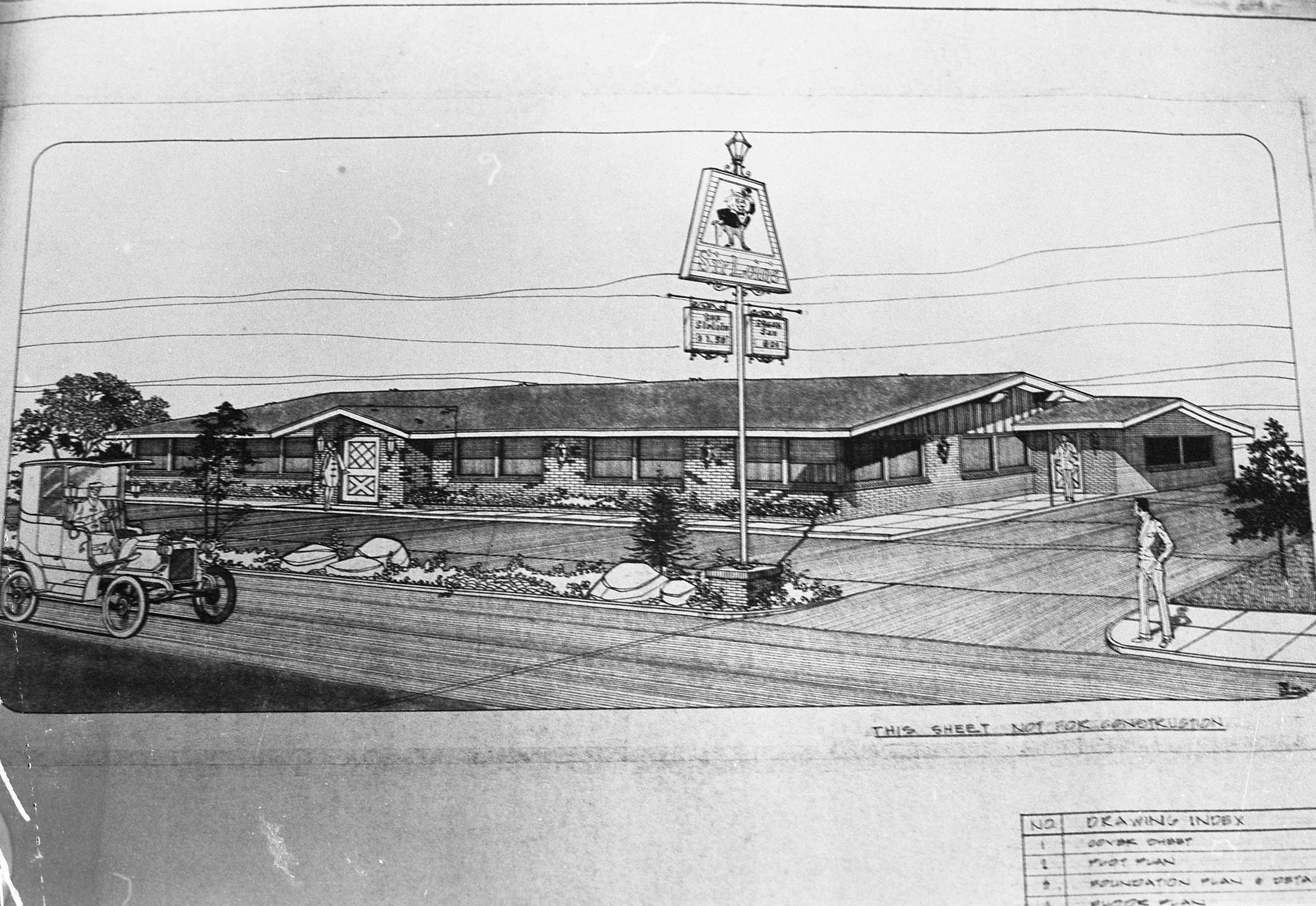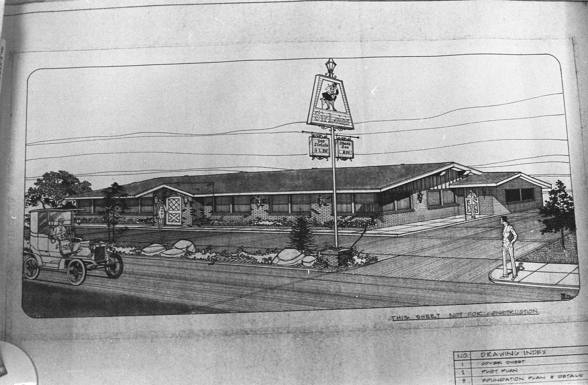 Sirloin Inn, unknown date. This single strip of black and white film negatives bearing two images (images 2 and 3) was created for the Lacey Leader newspaper. These images show a drawing of the Sirloin Inn.