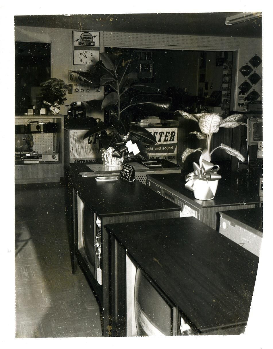 Holt Radio & TV store interior of the sales floor. Black and white 3 1/4" x 4 1/8" photograph. There are 5 TV's in the lower half of the photo. On top of the TV's are two different types of plants. The one of the left is a darker leafed potted plant with aluminum foil covering the pot. The second plant on the right has lighter colored leaves. The plant is in a white pot with a bow at the base of the plant. Between the two plants is a small sign on top of the TV that reads: "Motorola rectangular color TV". In the far back of the photo is a wall with two windows. Between the two windows is a clock that reads: "9:55". Above the clock is a sign that reads: "Authorized Sylvania Distributor". Below the clock is some merchandise on display. Below the left window is a display case that has 5 radio's on display behind the glass. On top of the display case is a potted plant with flowers. The plant has an aluminum covered pot with two cards attached. Just below the right window is a counter with a sign in front of it that reads: Channel Master, works wonders in sight and sound, antennas, radios, Hi-Fi, electron tubes, picture tubes". On top of the counter are some various things, one being a book. On the right side of the right window are some more items that are hung for display. Below that is another TV that is on a cart with wheels.