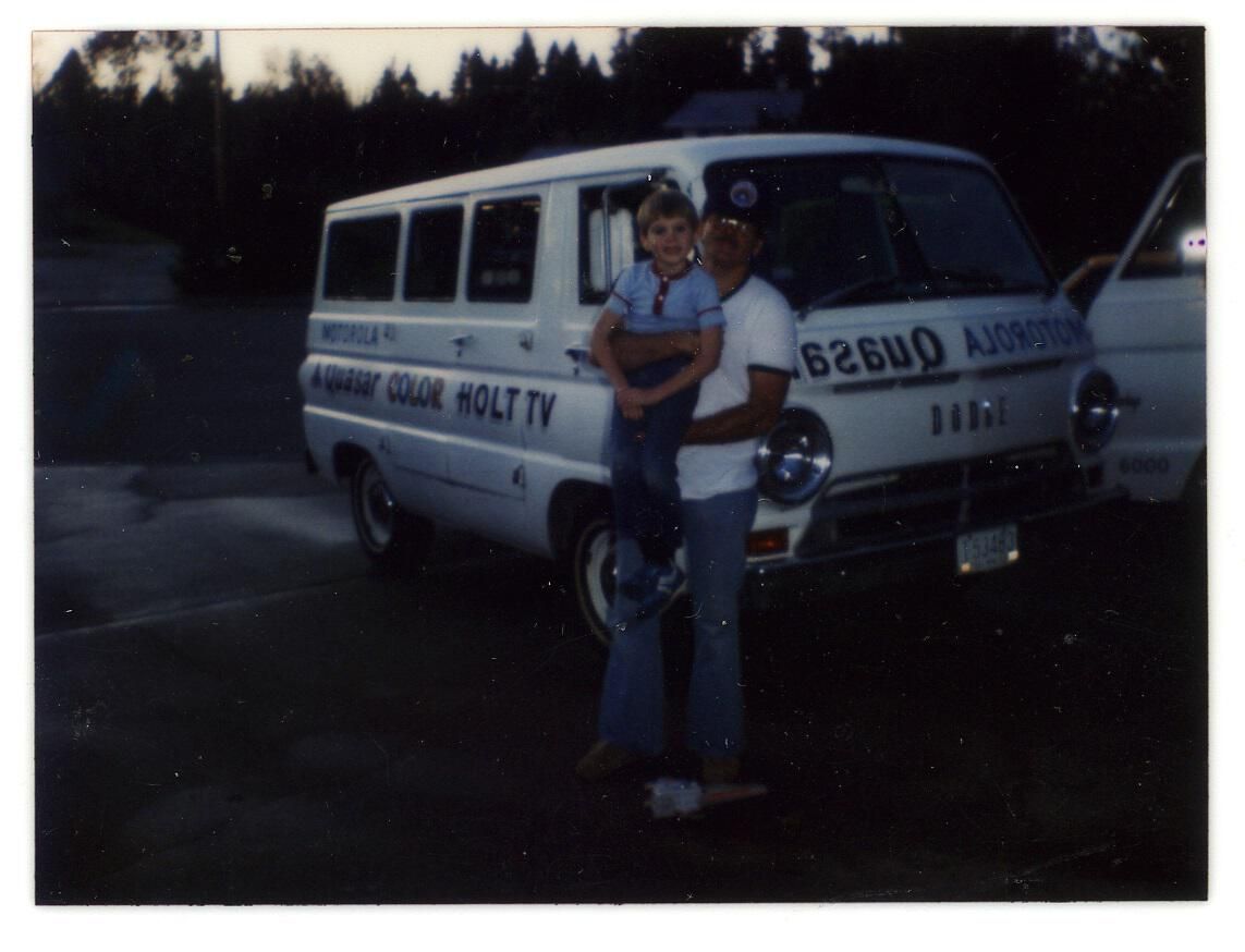 Denzil Richard Holt with son, Darren, in front of Holt company van. Colored Polaroid 3 3/4" x 4" photograph. Denzil is wearing a white t-shirt with a dark trim on the sleeve and neck-line. He is also wearing blue jeans and light brown shoes. He has a mustache and is also wearing glasses. He has a dark blue hat that has an unknown insignia on the front. Denzil is holding Darren by his waist. Darren is between the ages of 6 and 10. He is wearing a blue buttoned t-shirt with red trimming. He is also wearing blue jeans and dark tennis shoes. At Denzil's feet is a Star Wars X-Wing toy. Behind Denzil is the Holt company van. It is a white 1966-1969 A100 Dodge van. The van has advertisement written on the both sides of the vehicle, it reads: "Motorola, Quasar, color, Holt TV." The markings on the front of the van are backwards. The license plate is identified as: "T53483." The van is parked on pavement near a road. In the back is a tree line.