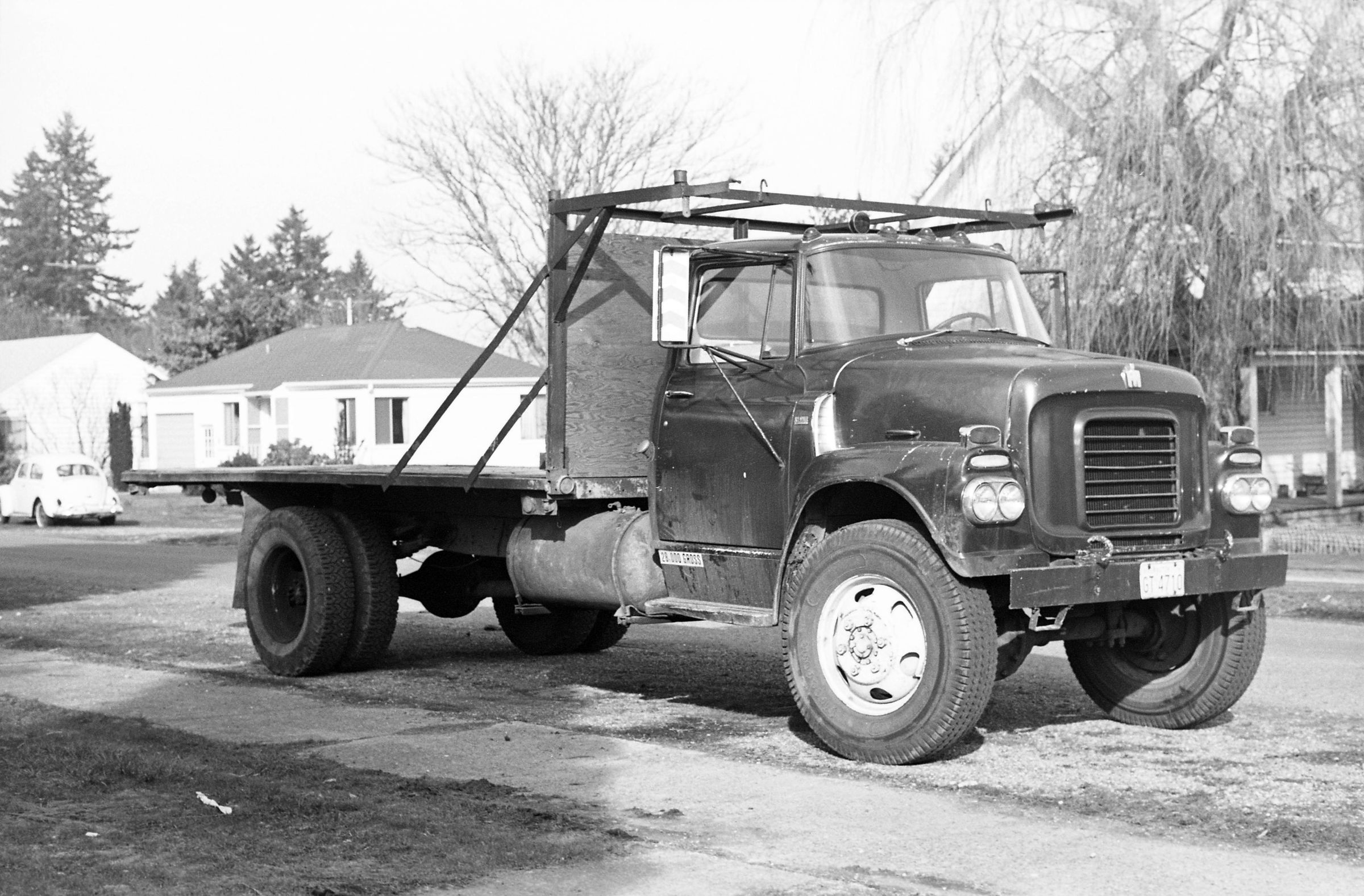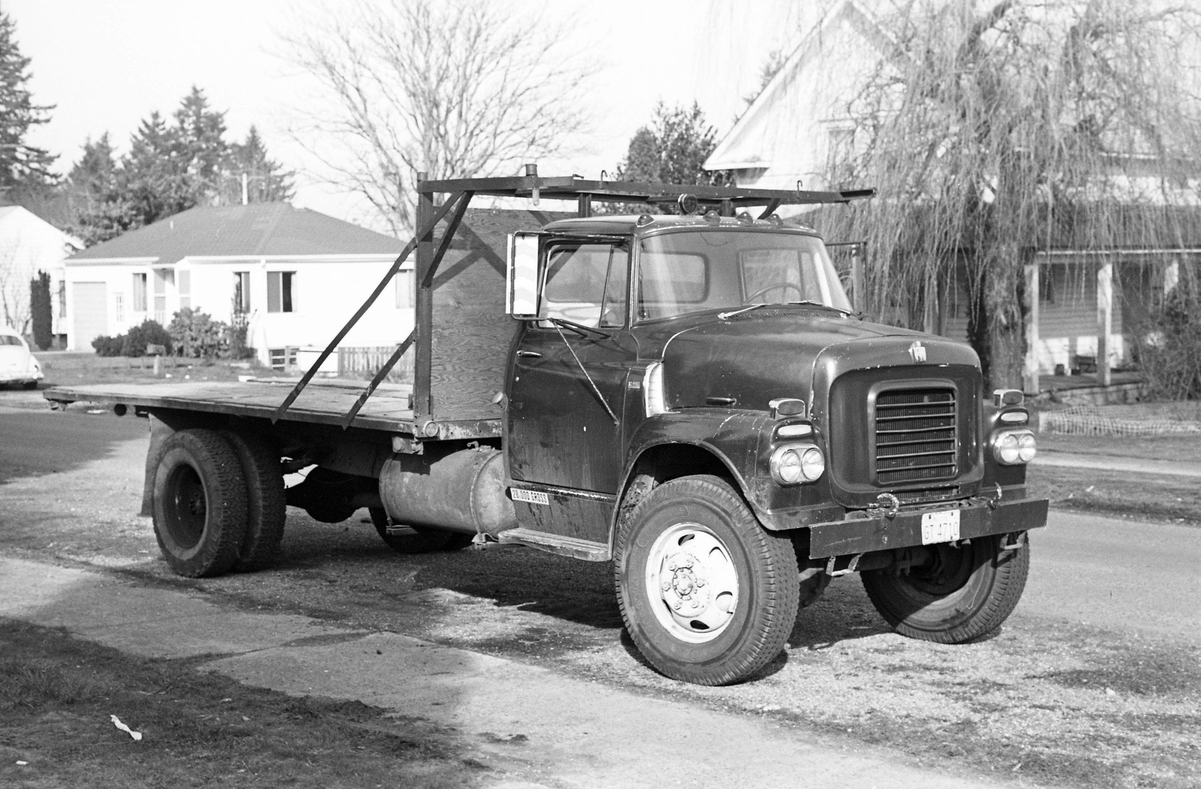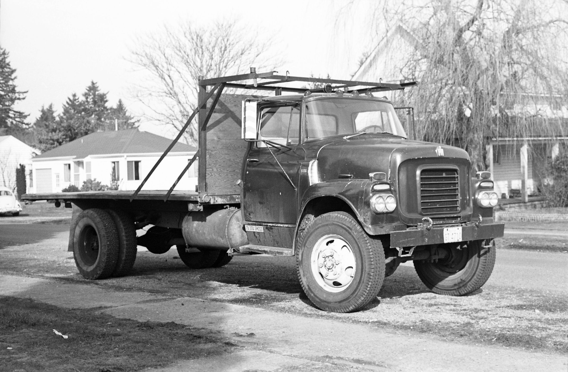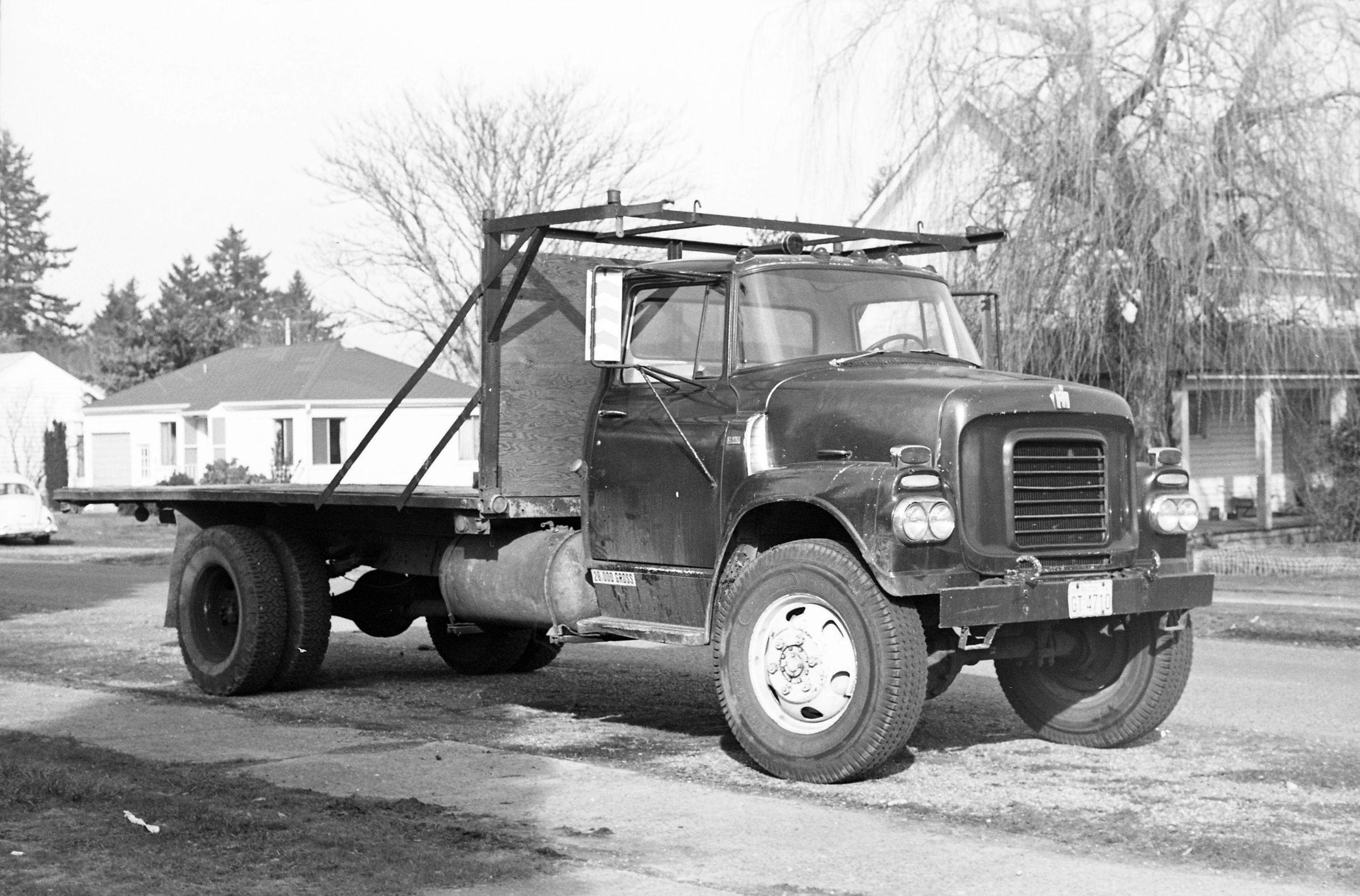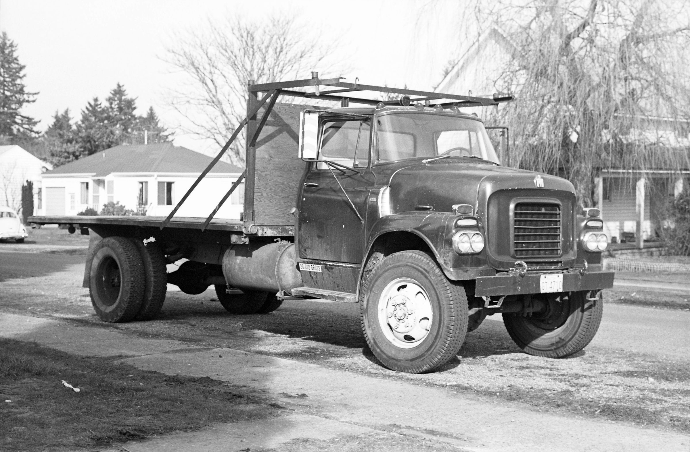 Truck, unknown date. This black and white film negative strip bearing five images (images 35-39) was created for the Lacey Leader newspaper. The images show a semi-truck with no trailer attached from a diagonal angle parked on a residential street.Made/Created