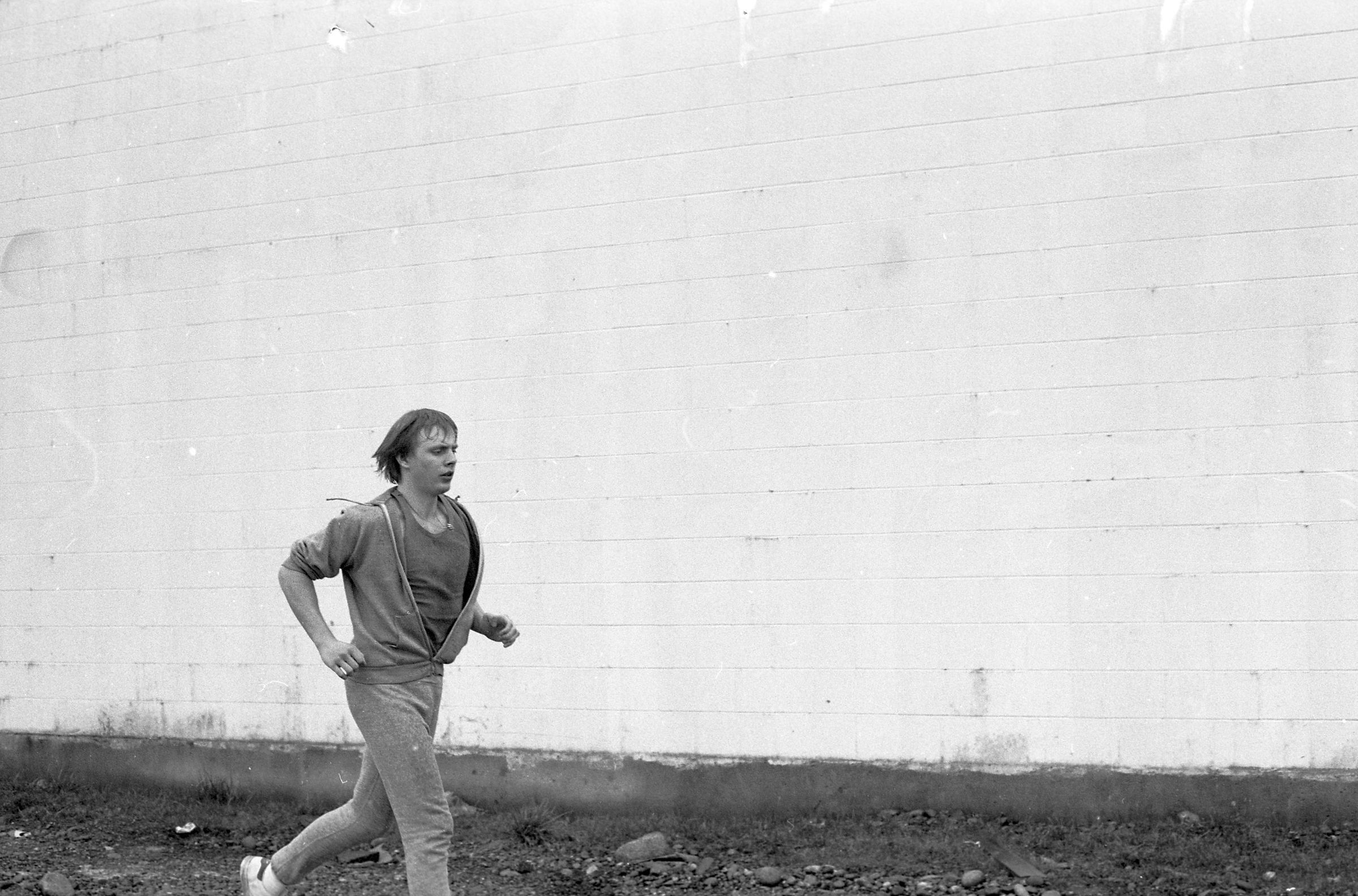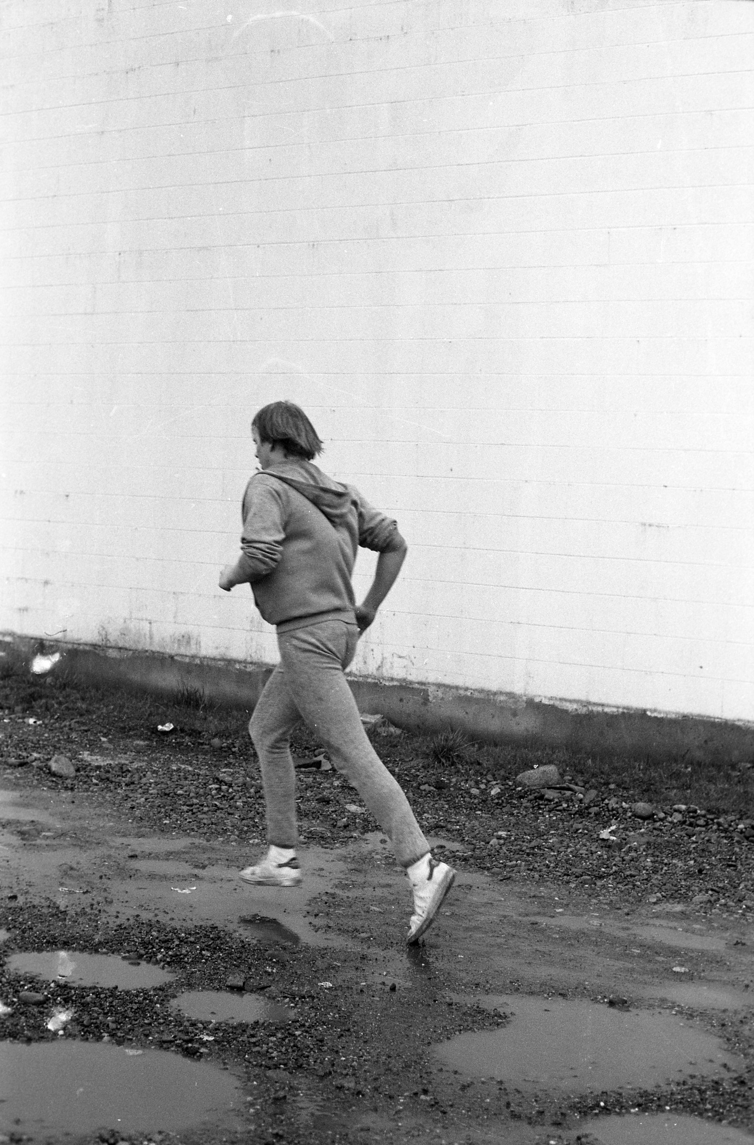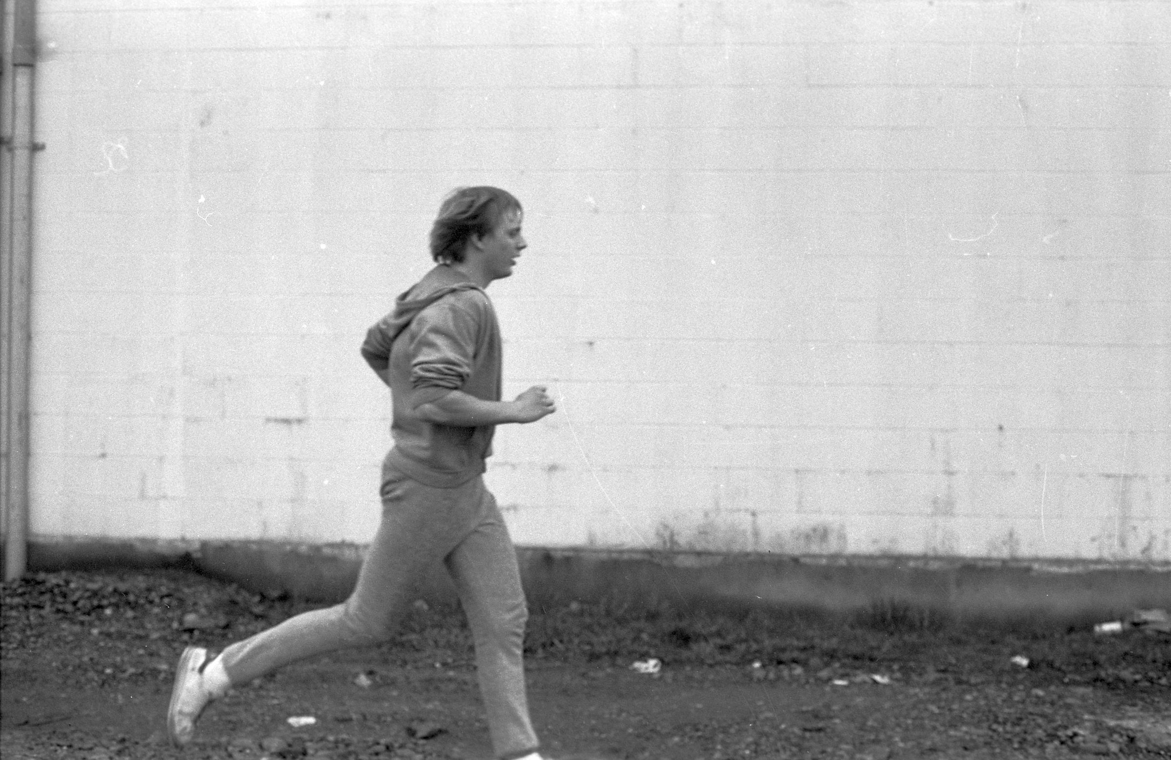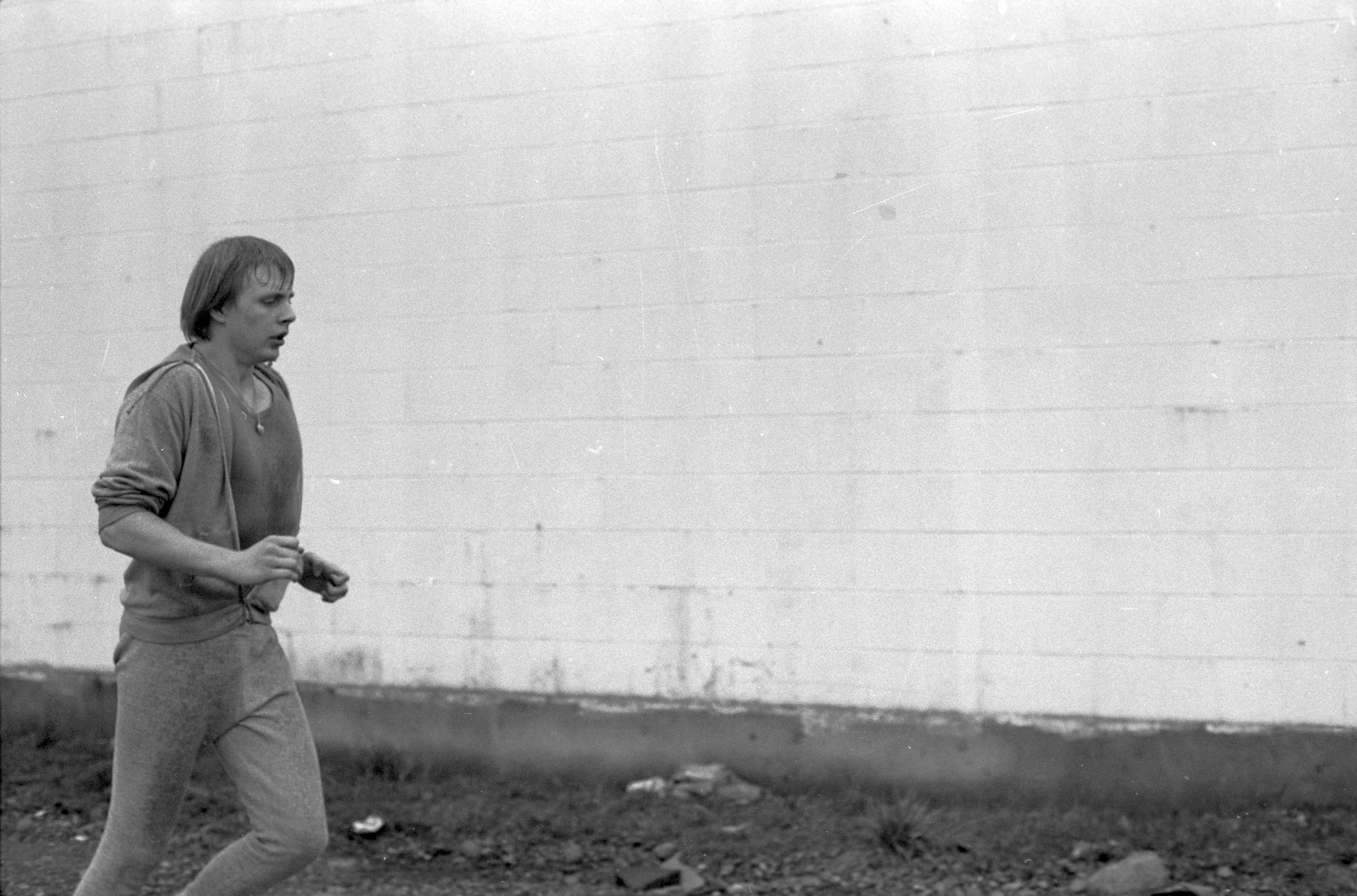 Four of the film negative strips (bearing images 1a-4a, 5a-8a, 9a-12a, and 13a-15a) show a young man in zippered, hooded sweatshirt and sweatpants running.