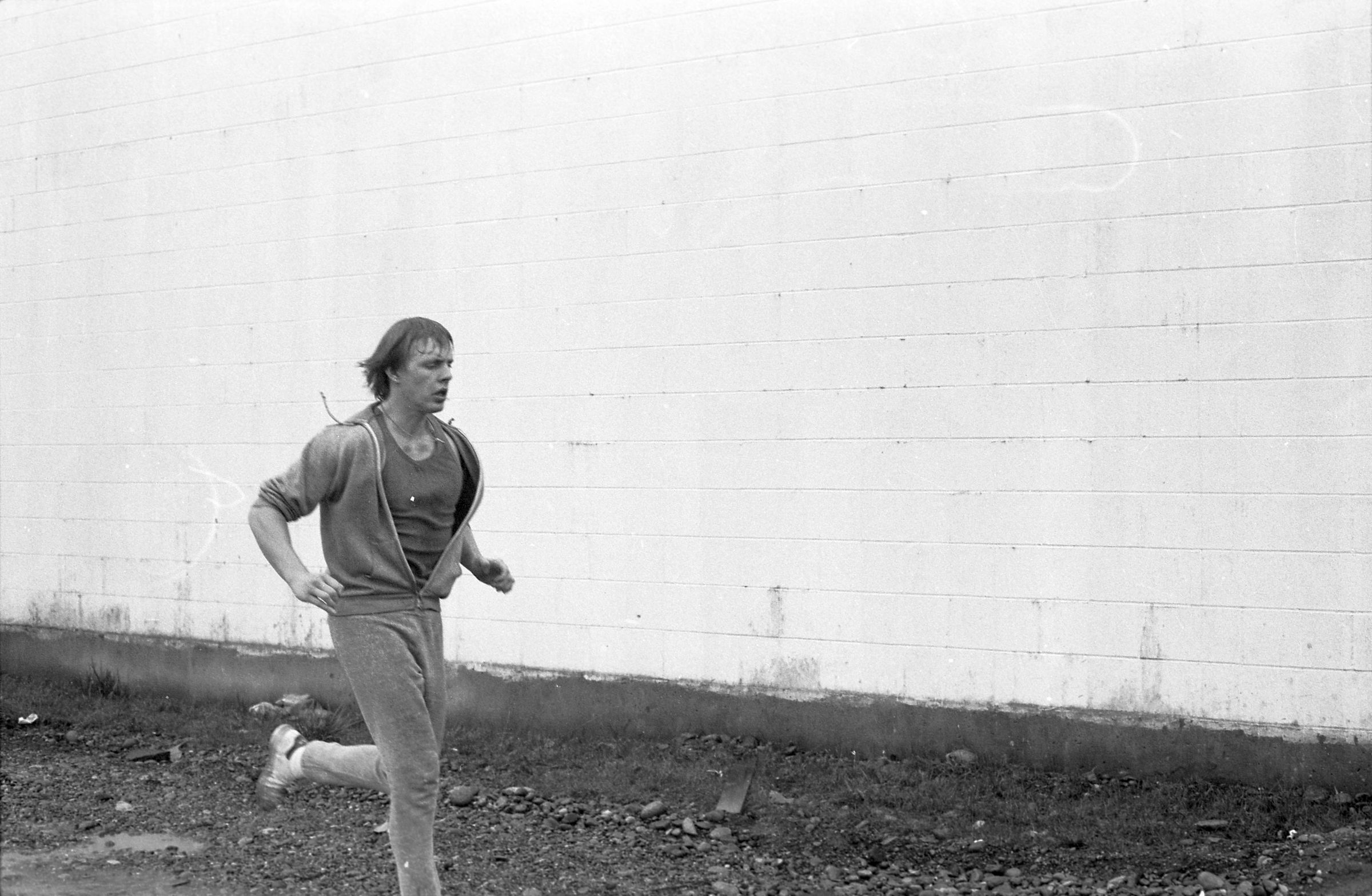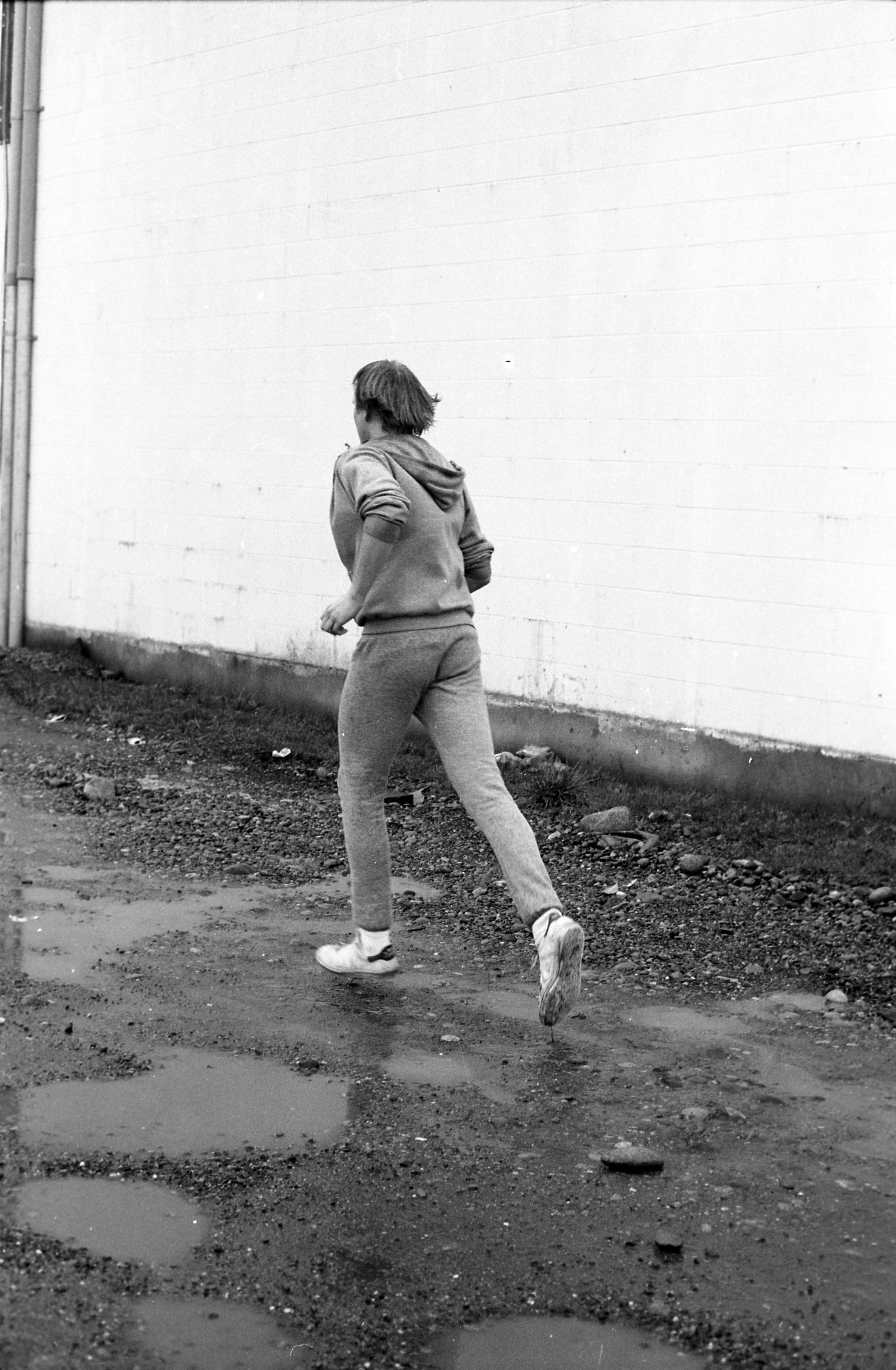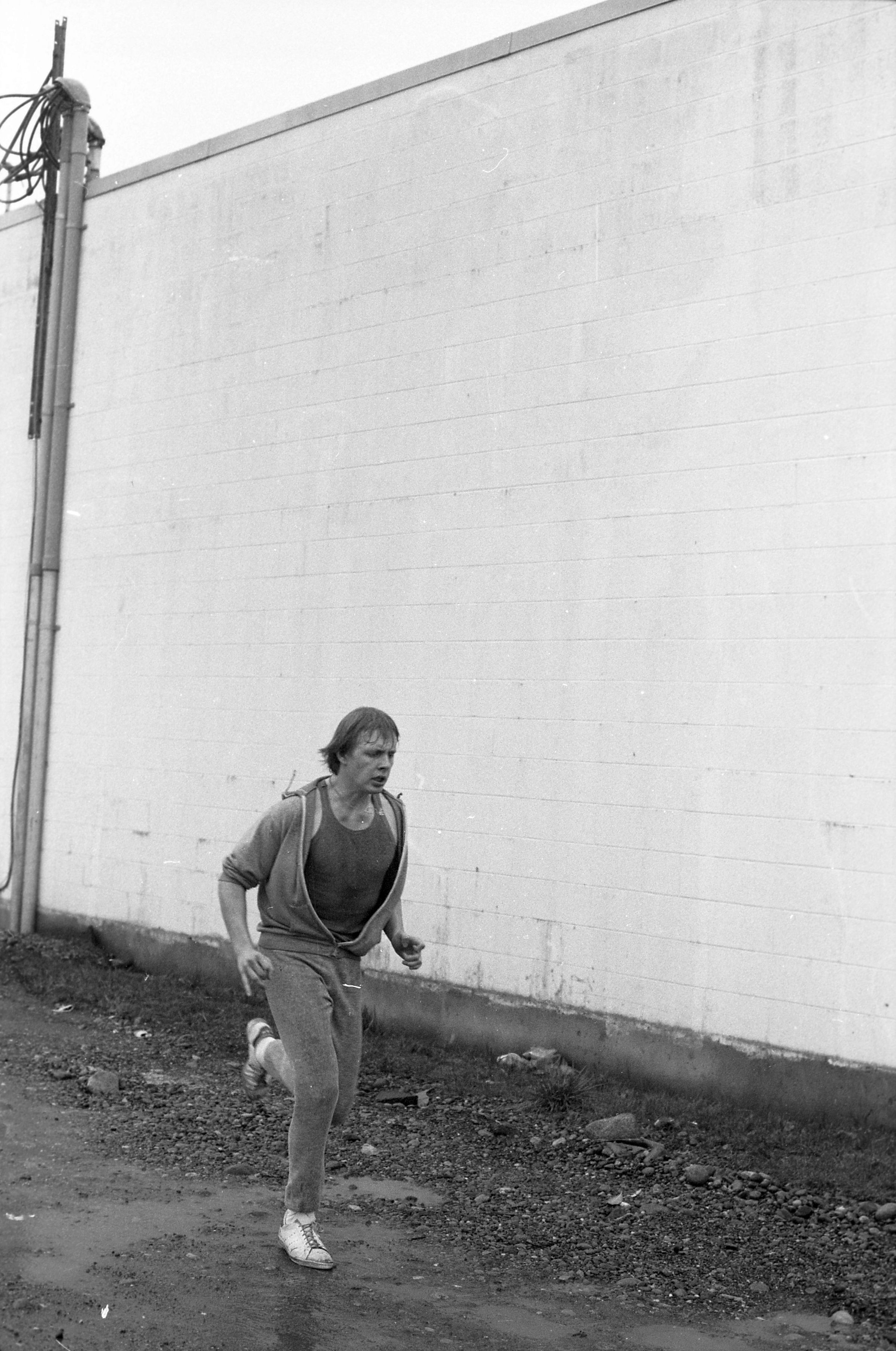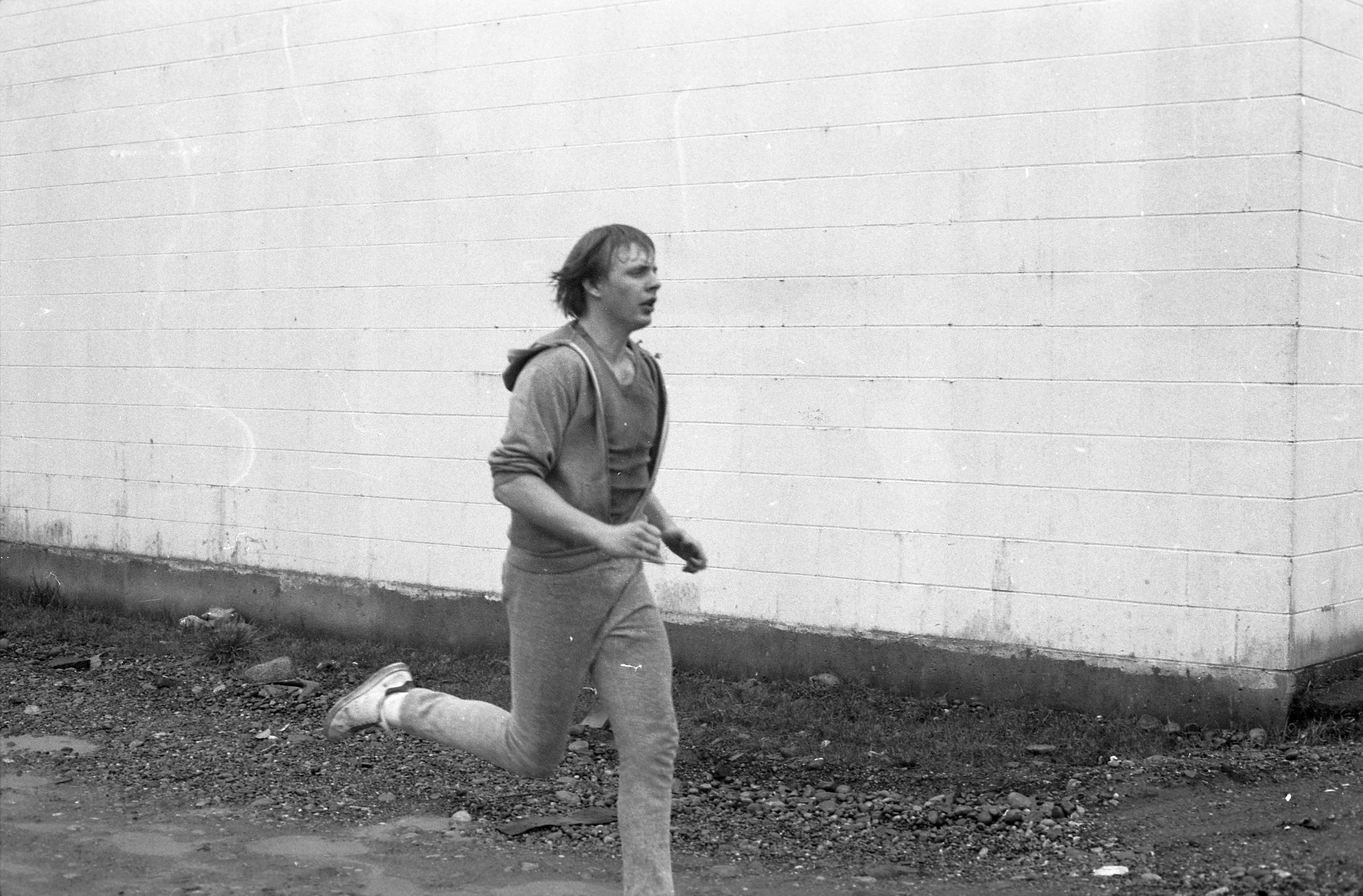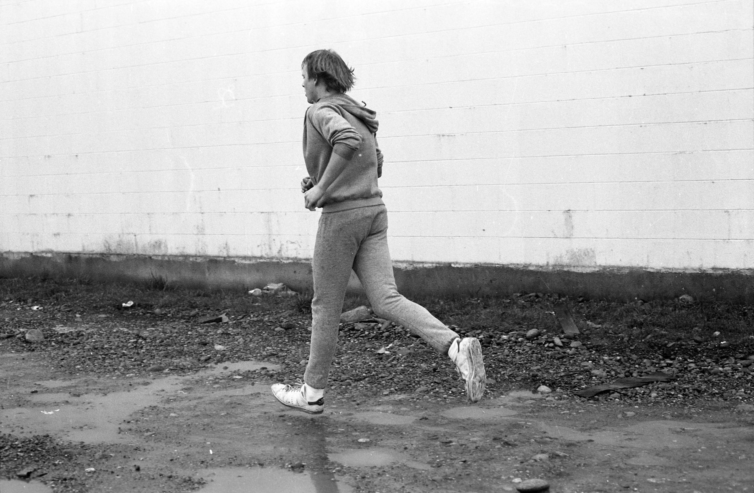 Four of the film negative strips (bearing images 1a-4a, 5a-8a, 9a-12a, and 13a-15a) show a young man in zippered, hooded sweatshirt and sweatpants running.