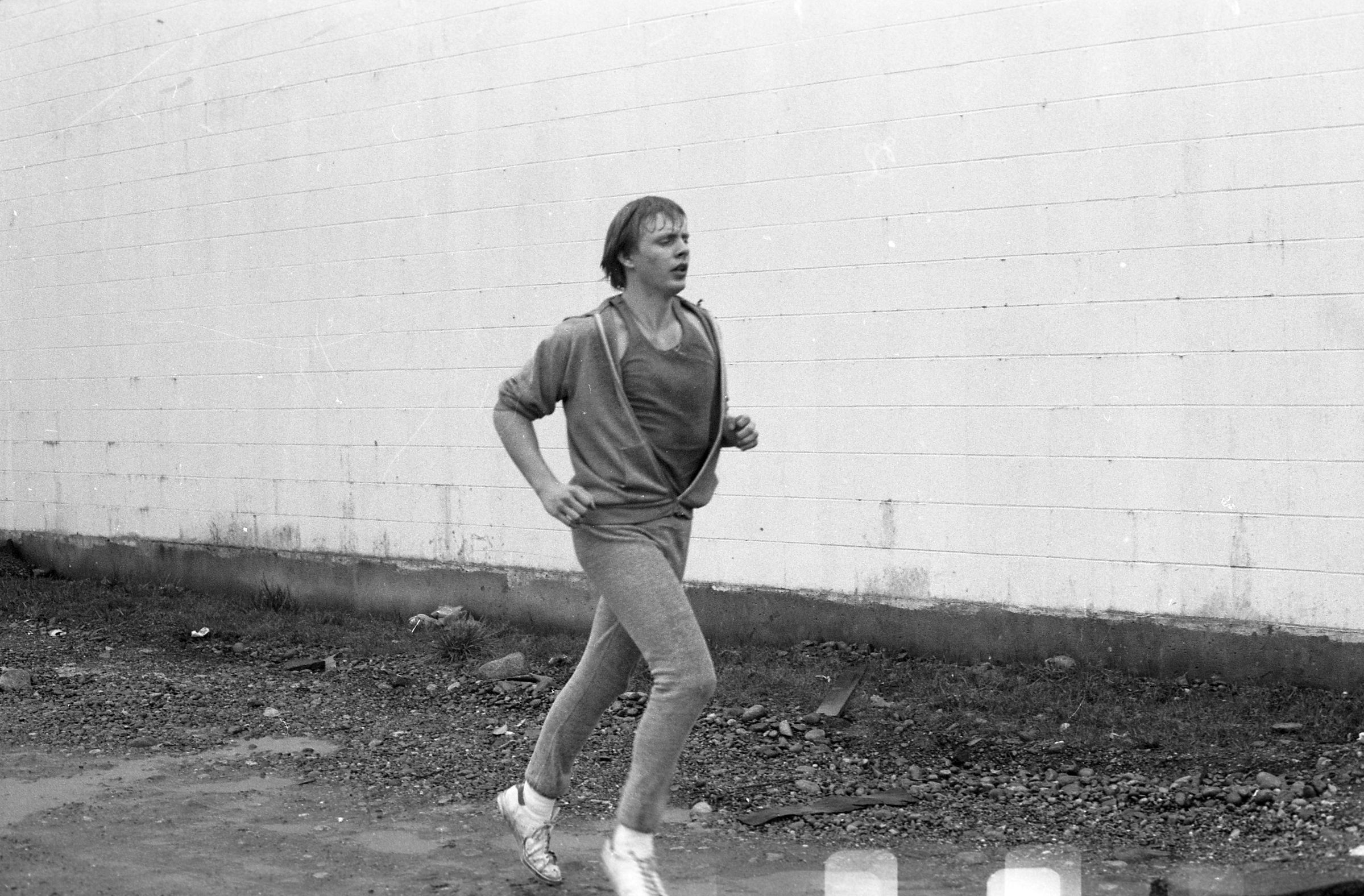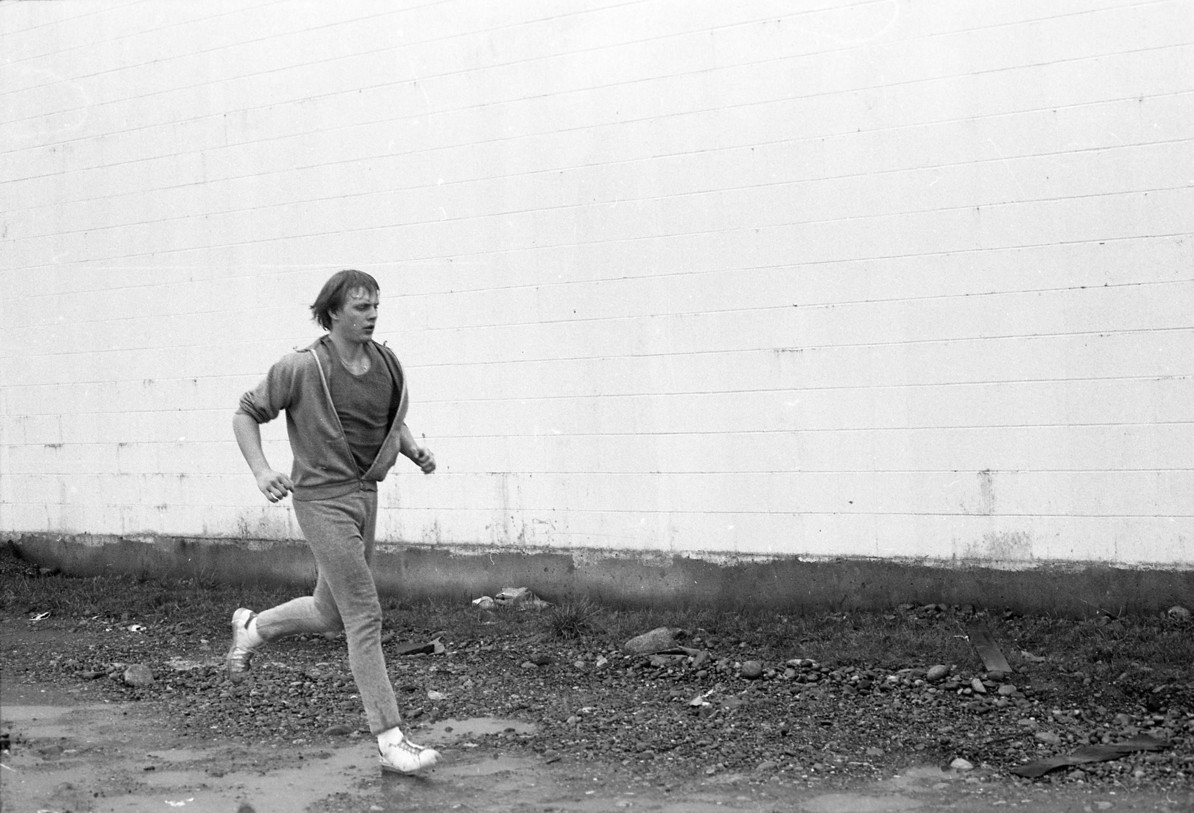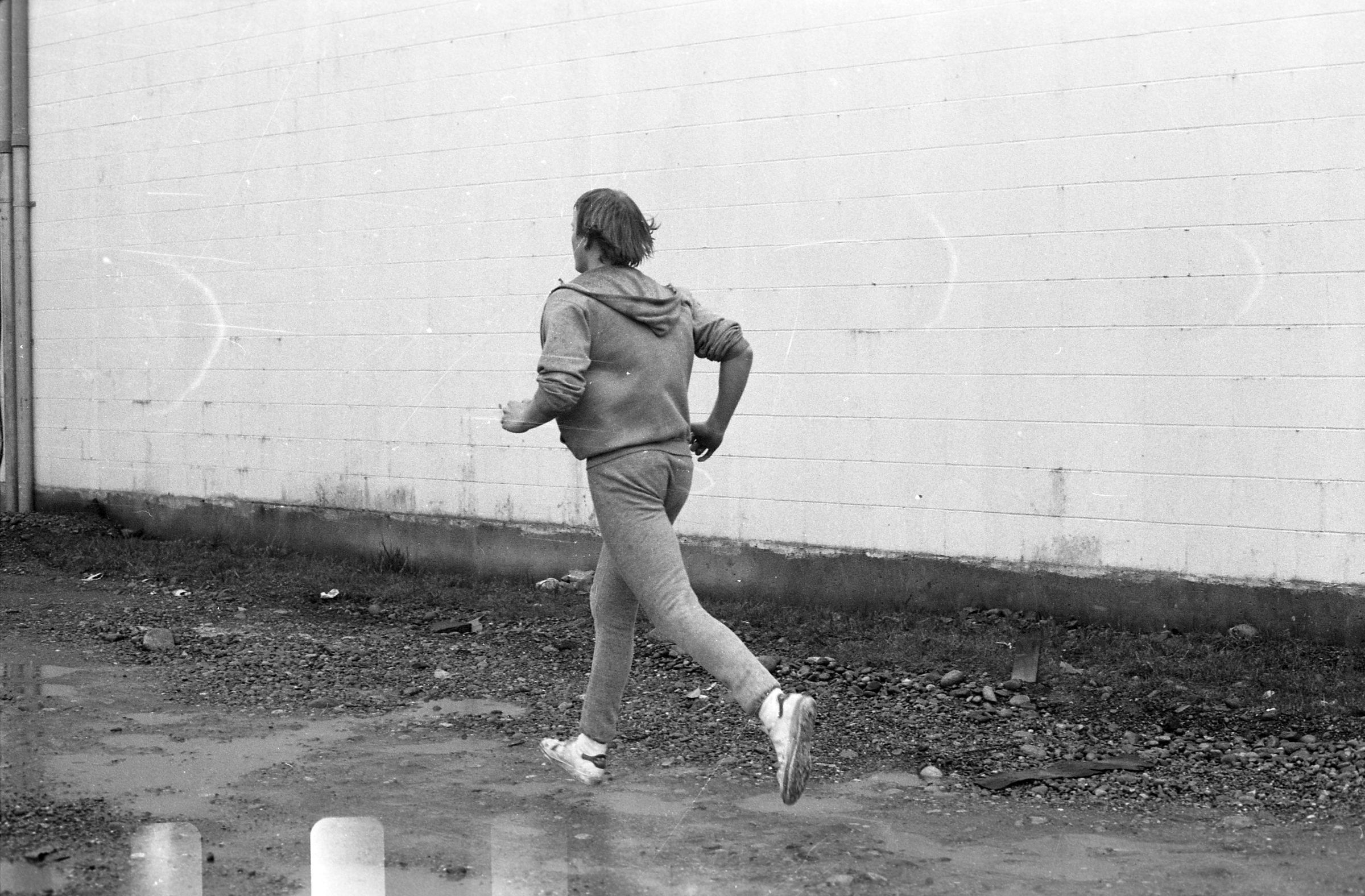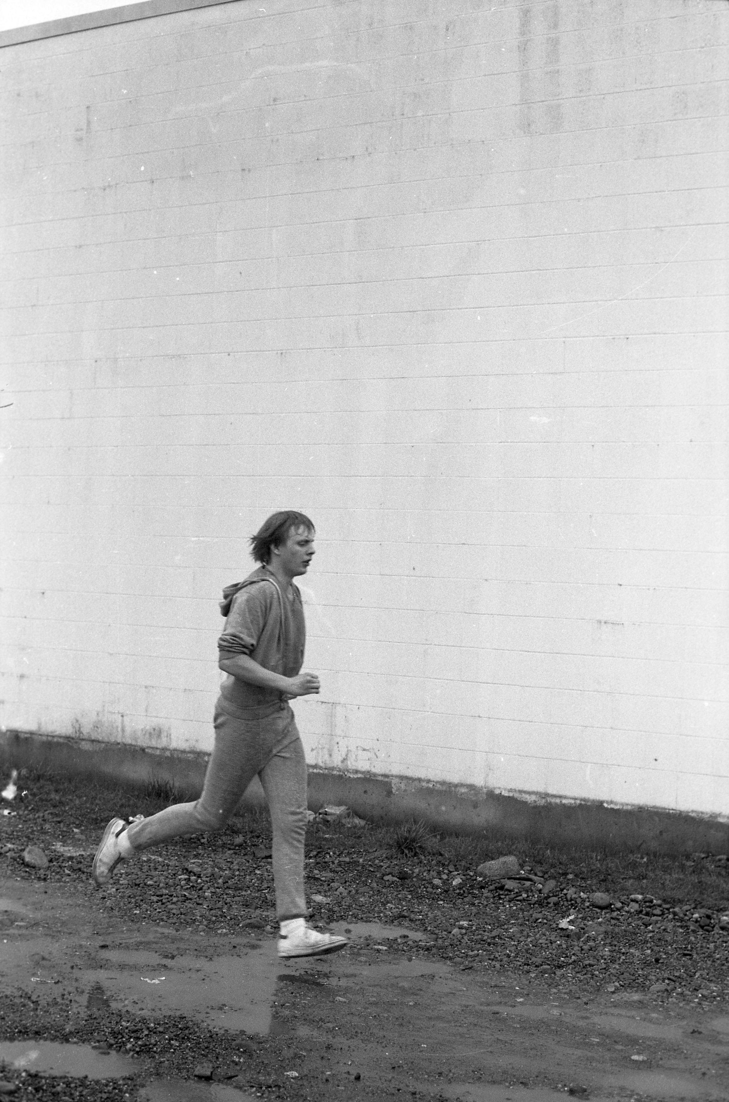Four of the film negative strips (bearing images 1a-4a, 5a-8a, 9a-12a, and 13a-15a) show a young man in zippered, hooded sweatshirt and sweatpants running.