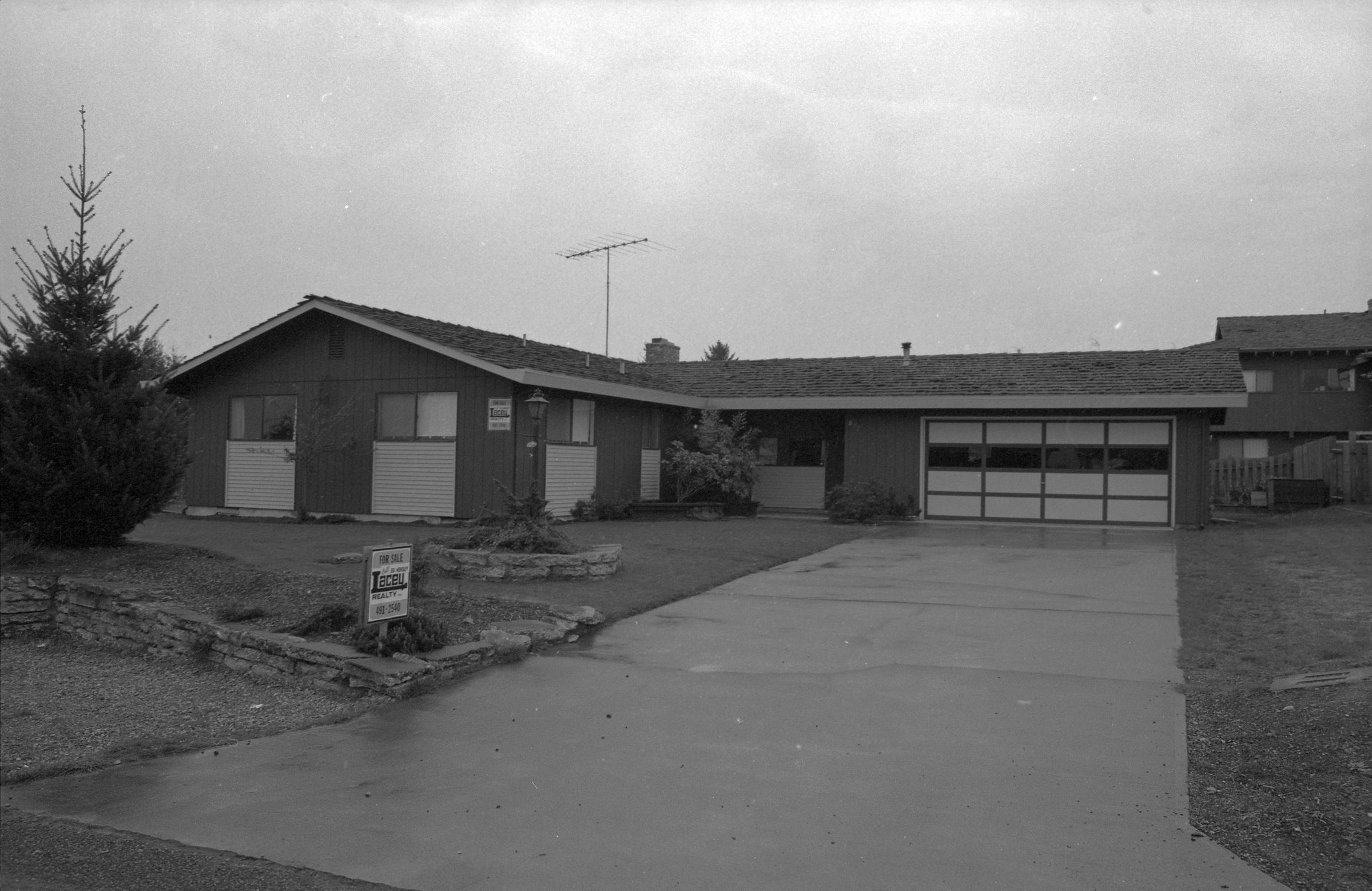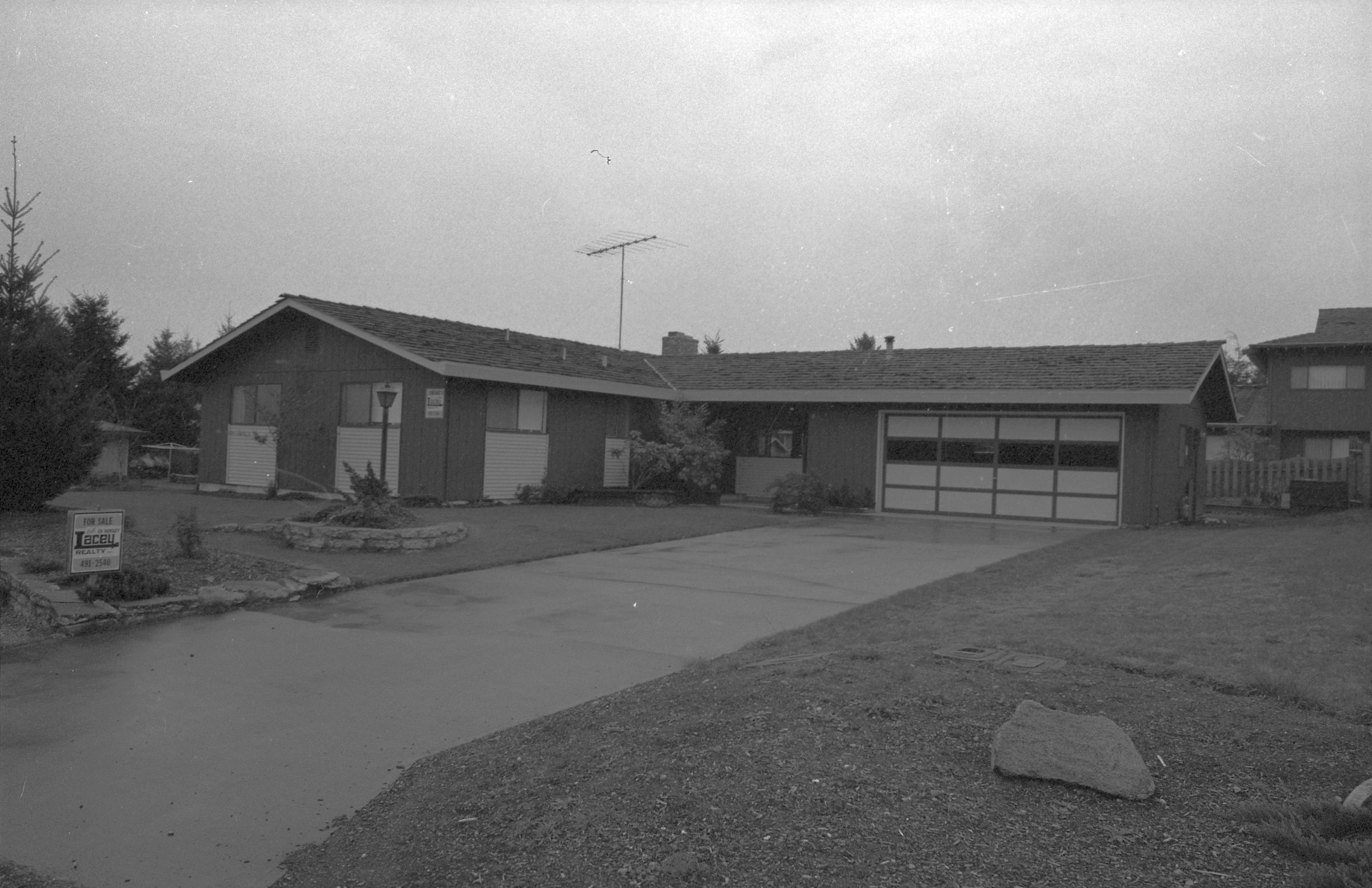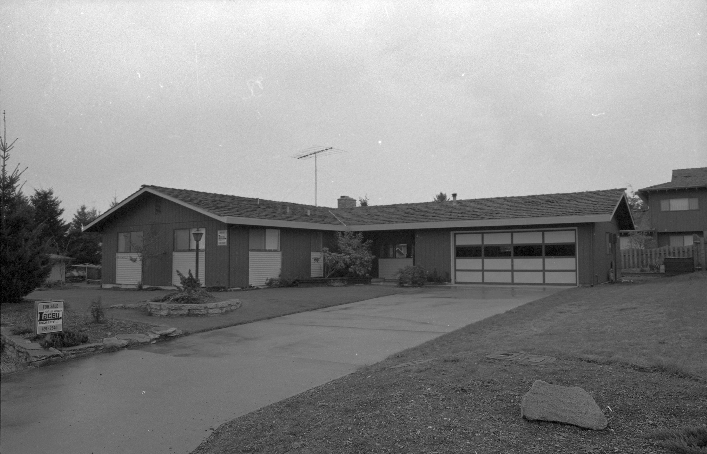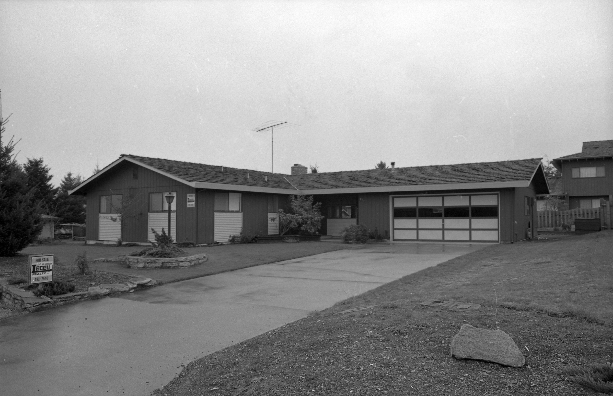 One film strip (bearing images 1e-4e) shows an L-shaped ranch-style home with a for-sale sign posted at the end of the driveway.