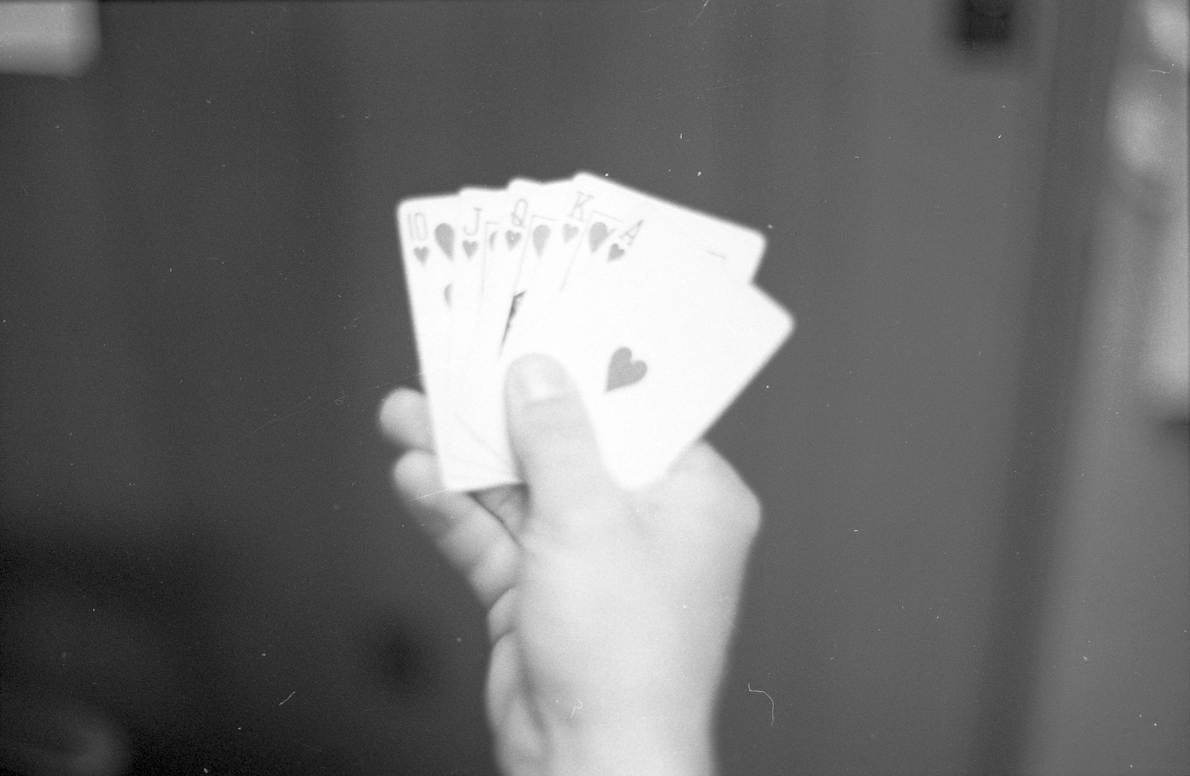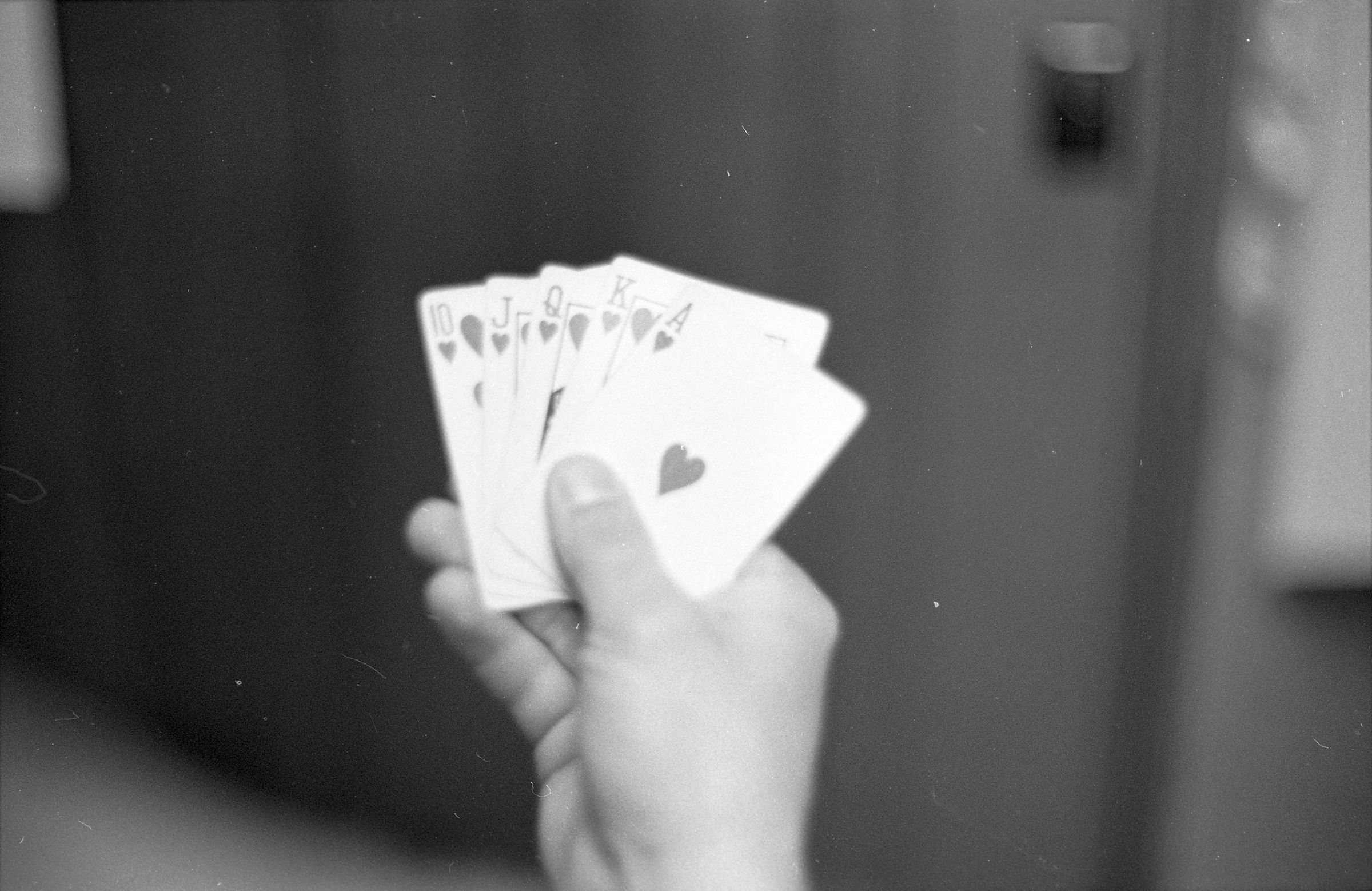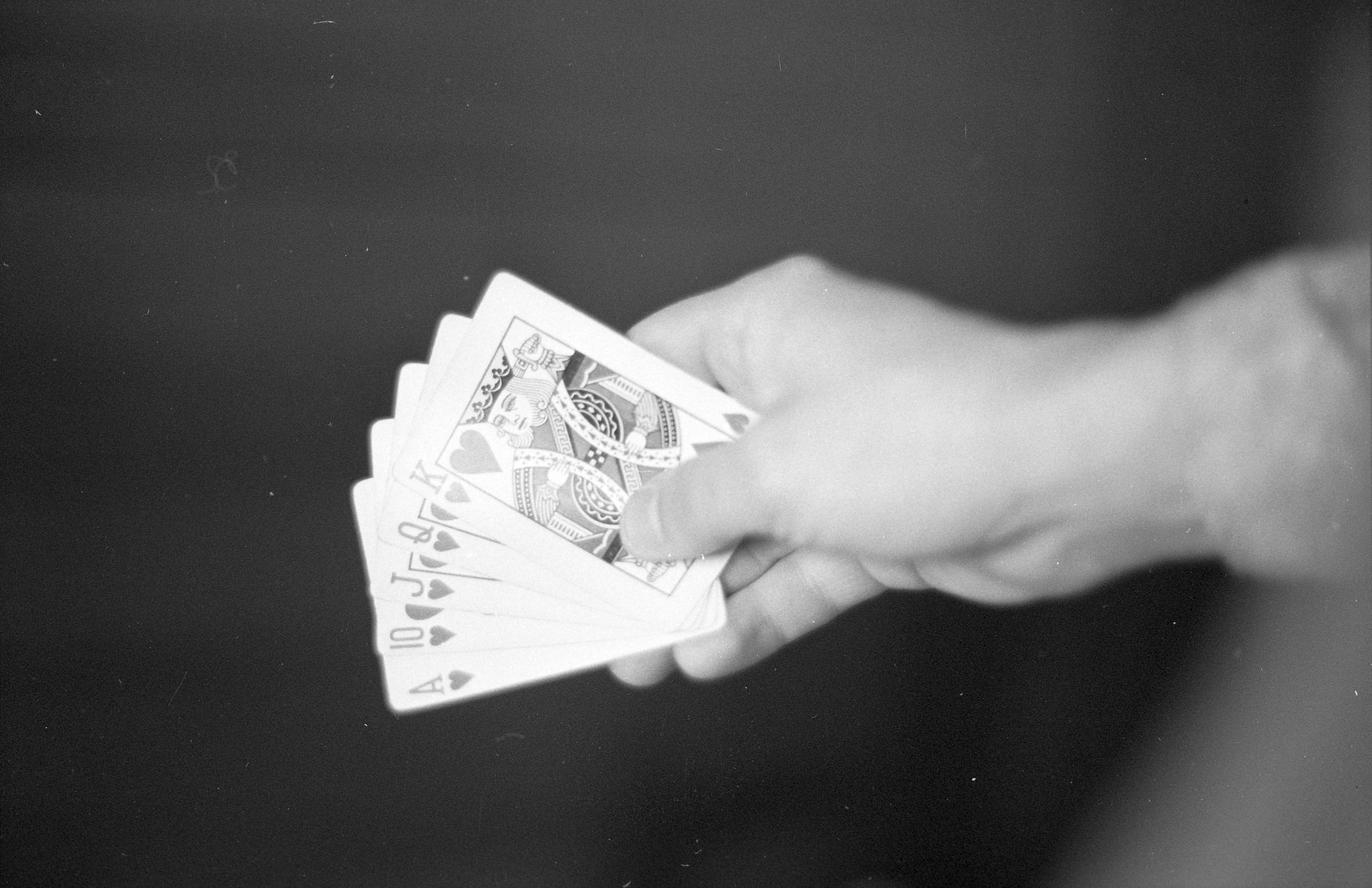One film strip (bearing images 1d-4d) shows a hand showing five playing cards, all in the suit of hearts. In the game of poker, the cards would constitute a royal flush.