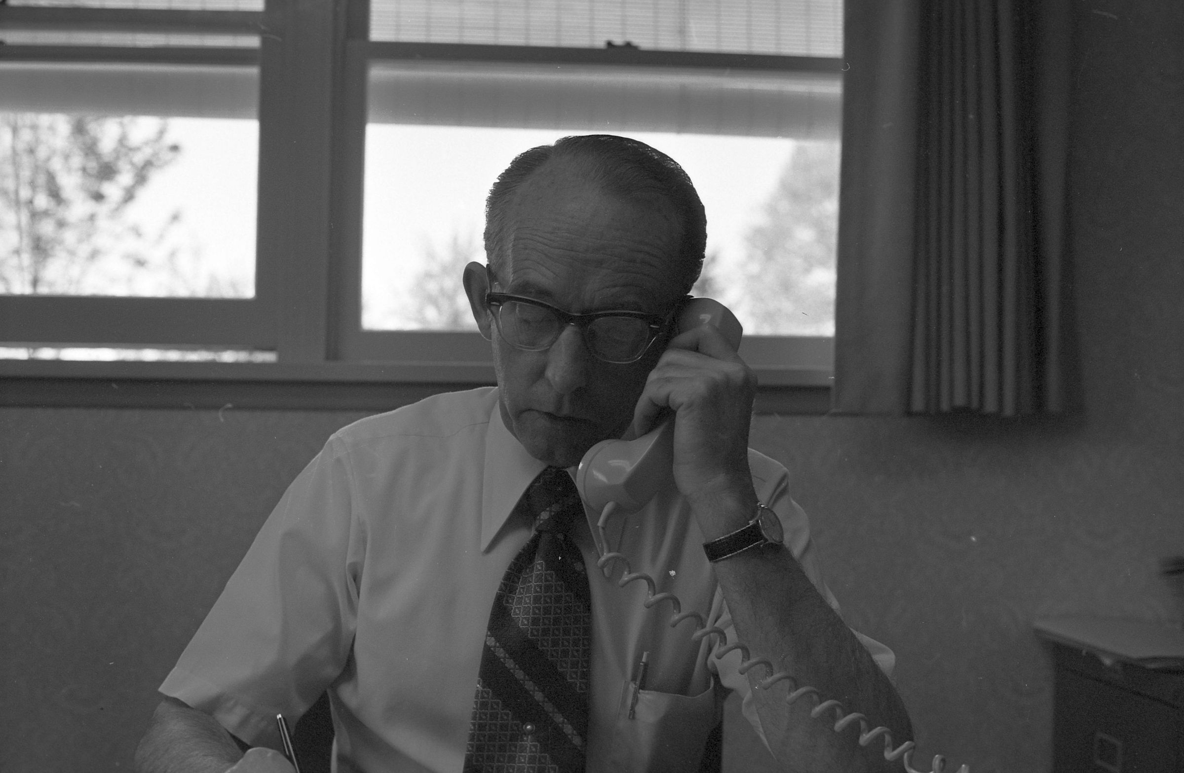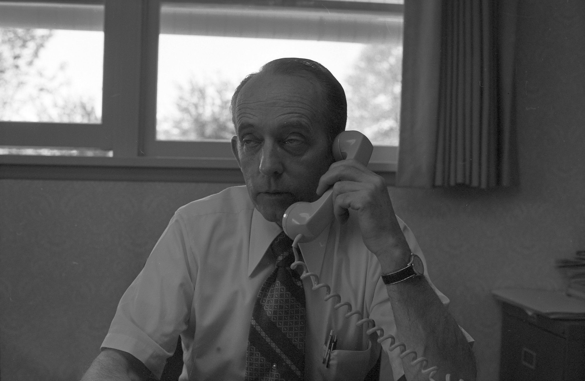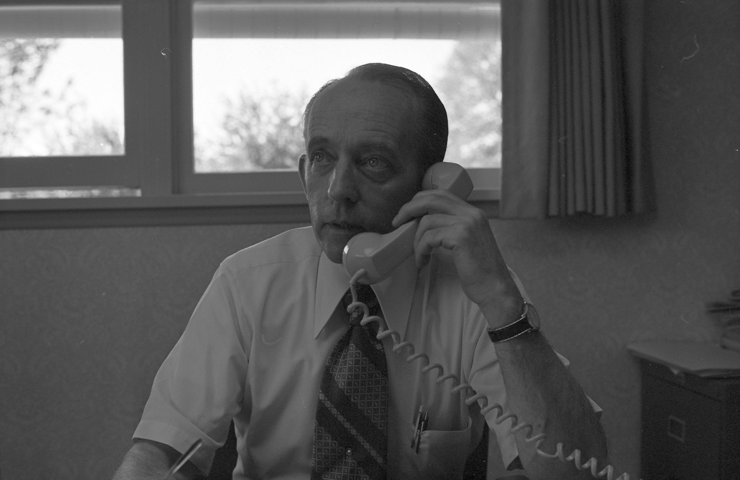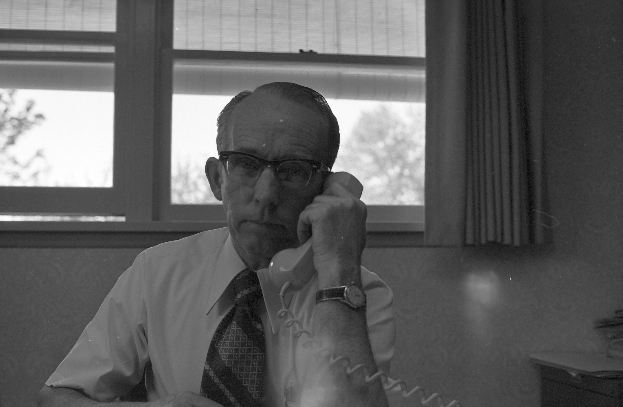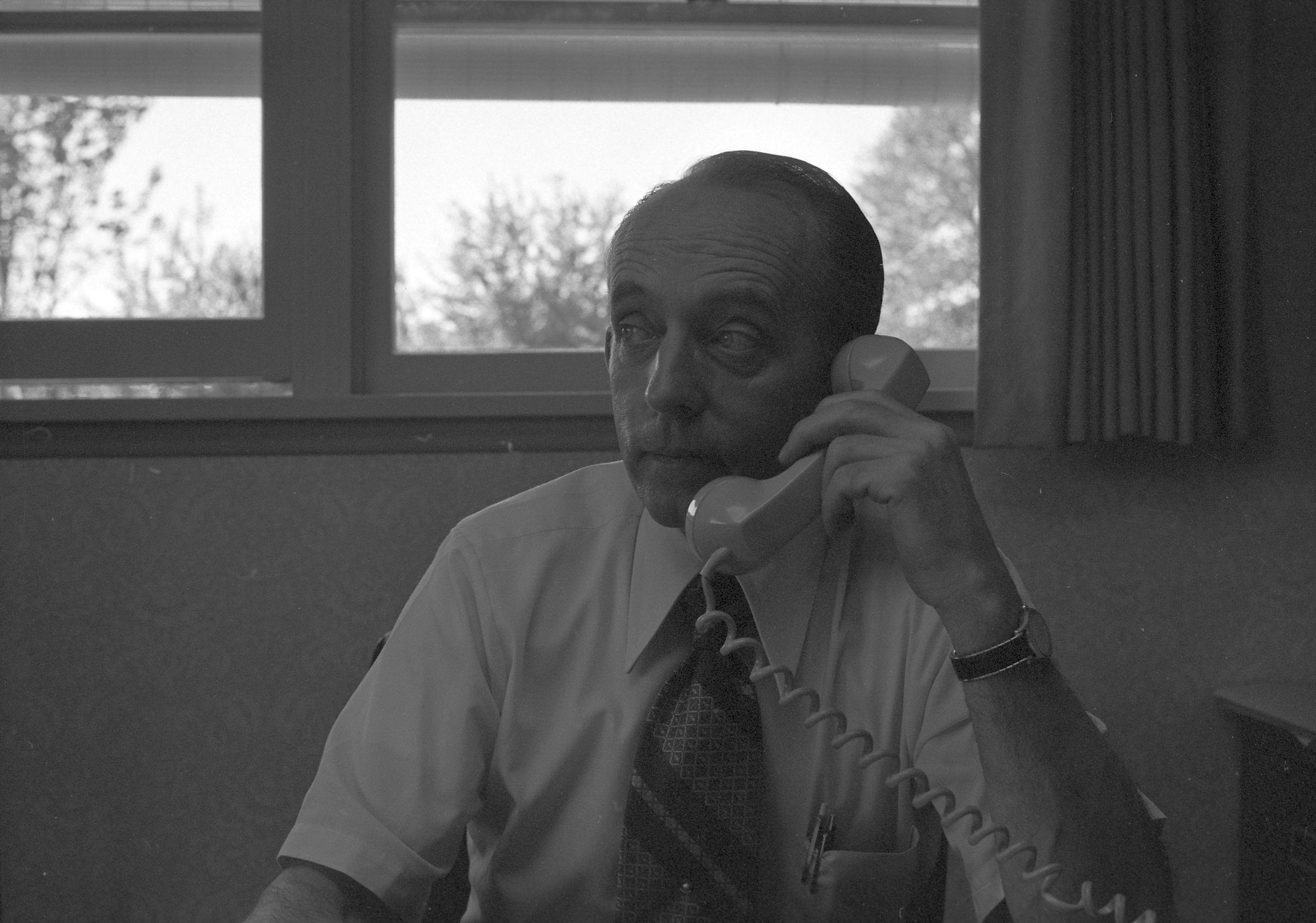 Don Thompson, 1972. This film negative strip bearing five images (28-32) was created for the Lacey Leader newspaper. The images show Don Thompson seated at a desk in a suit and tie speaking on the telephone.