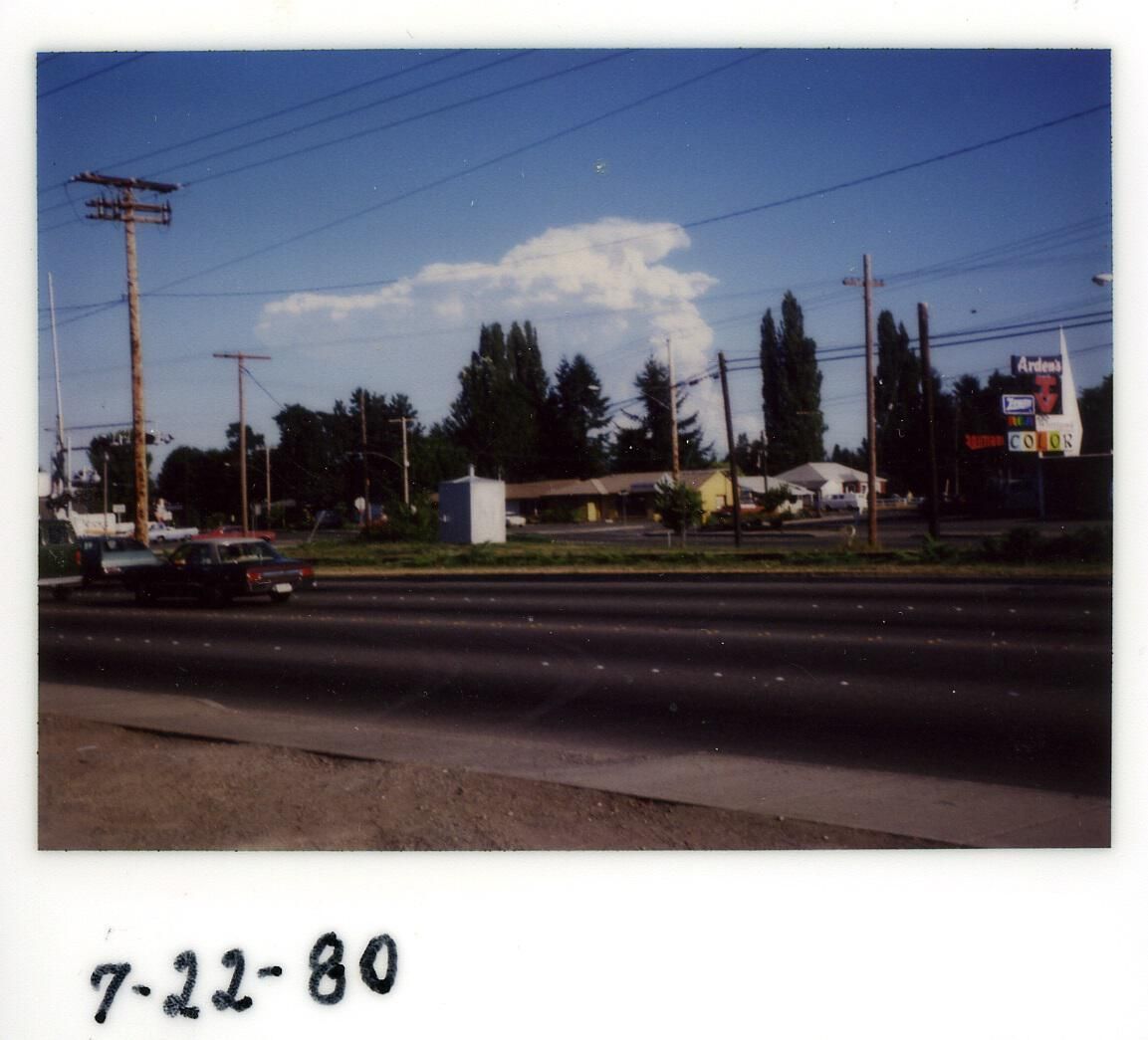 Mt. St. Helen's eruption photograph taken from Holt Radio & TV store. Colored Polaroid 3 3/4" x 4" photograph. The photo was taken on Pacific Ave, facing in the south east direction. Across the street to the right is a TV store called Arden's TV. Their sign reads: "Arden's TV, Zenith, RCA, Whirlpool and Color." Parked in front of the store, is one white van. The Arden's TV building is painted in a yellow beige color. Across the street from that building is a red house with a white roof. There is another building to its right that is white. Parked between those two buildings is a white service truck. Adjacent to Arden's TV, are two houses that are painted yellow with a light brown roof. In front of those houses, is a parked white car. Across the street near the far left house is a stop sign. In the far left side of the photo is an intersection that crosses the railroad. At or near the intersection, are 5 vehicles. A green van, brown sedan, blue station wagon, red coupe and a blue coupe. Behind the houses are trees of various heights. In the median of Pacific Ave is a railroad, and at the middle of the photo next to the railroad is a small grey building. There are several power lines in poles throughout the photo.