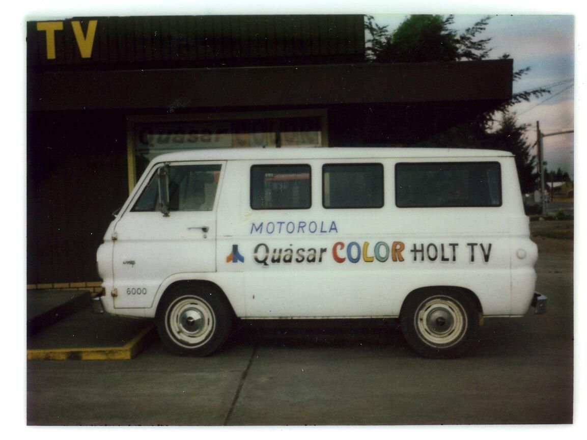 Holt Radio & TV company van parked in front of Holt business. Colored Polaroid 3 3/4" x 4" photograph. The van is a white 1960's Dodge A100. The van is marked on its left side and it reads: "Motorola, Quasar color Holt TV". The building behind the van is the Holt business, it is painted brown, and at the top it has the business name painted in yellow. The window of the store is directly behind the van with a sign above that reads: "Quasar Color". Behind the building to the right are some trees, and next to trees is part of Pacific Ave.