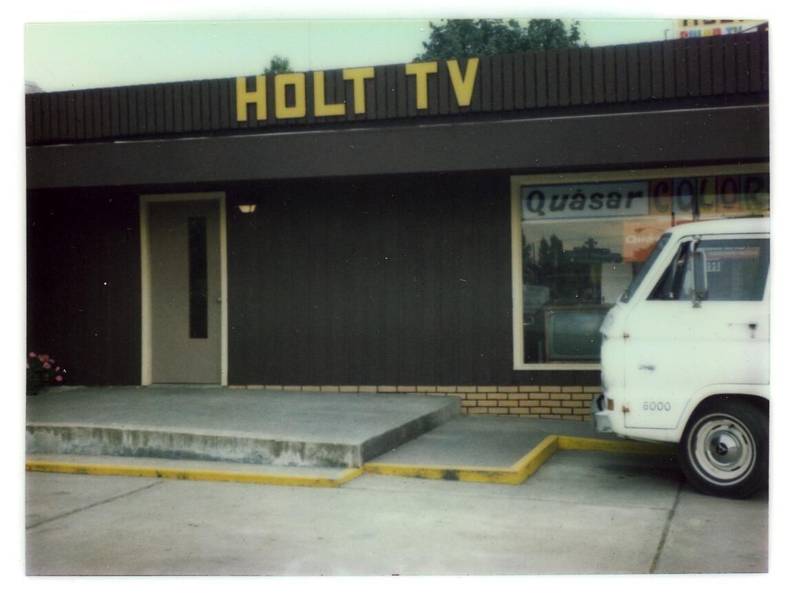 Holt Radio & TV exterior. Colored Polaroid 3 3/4" x 4" photograph. The van on the right is a white 1960's Dodge A100. The Holt Radio & TV building is painted brown, and at the top of the building is name of the business painted in yellow. The window to the right has some advertisements that read: "Quasar color, Quasar." Below the sign at the bottom is a TV on display. The door to the store is on the left of the photo, and is painted a light grey with a white trim around the door. The door has a vertical window on the right side. The far left in the middle of the photo is a small potted plant with pink flowers. At the top of the photo is a tree top behind the store, and there is a sign of the business at the top right corner.