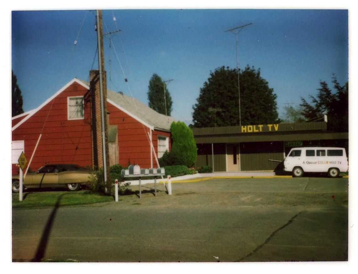 Holt Radio & TV business next to Holt residence. Colored Polaroid 3 3/4" x 4" photograph. The van on the right is a white 1960's Dodge A100. The Holt Radio & TV building is painted brown, and at the top of the building is the name of the business painted in yellow. The windows to the right have some advertisements that read: "Quasar color." Above Holt Radio & TV is one sign facing towards the right. The house is a two story building painted red with a light grey roof. There is a brown brick chimney on the left side of the building. There are green shrubs in the front of the house and trees behind the house. There is a metallic brown colored coupe parked in front of the red house facing towards the left. To the left of the car is a "dead end" sign. To the right of the car is a telephone pole, followed by 5 mail boxes. On top of the store and house is 4 antennas.
