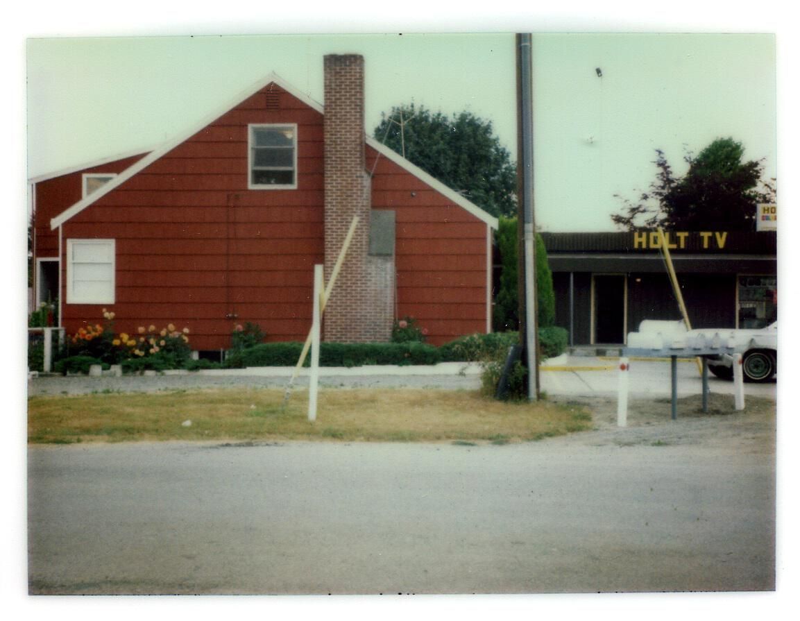 Holt Radio & TV business next to Holt residence. Colored Polaroid 3 3/4" x 4" photograph. The Holt Radio & TV building is painted brown, and at the top of the building is the name of the business painted in yellow. The windows to the right have some advertisements that read: "Quasar." Above Holt Radio & TV is one sign that reads: "Holt, color." The house is a two story building painted red. There is a brown brick chimney in front of the building. There are green shrubs with flowers in the front of the house and trees behind the house. There is a light blue car in the far right of the photo. Next to the car is a row of five mail boxes. There is one telephone pole to the left of the mail boxes.