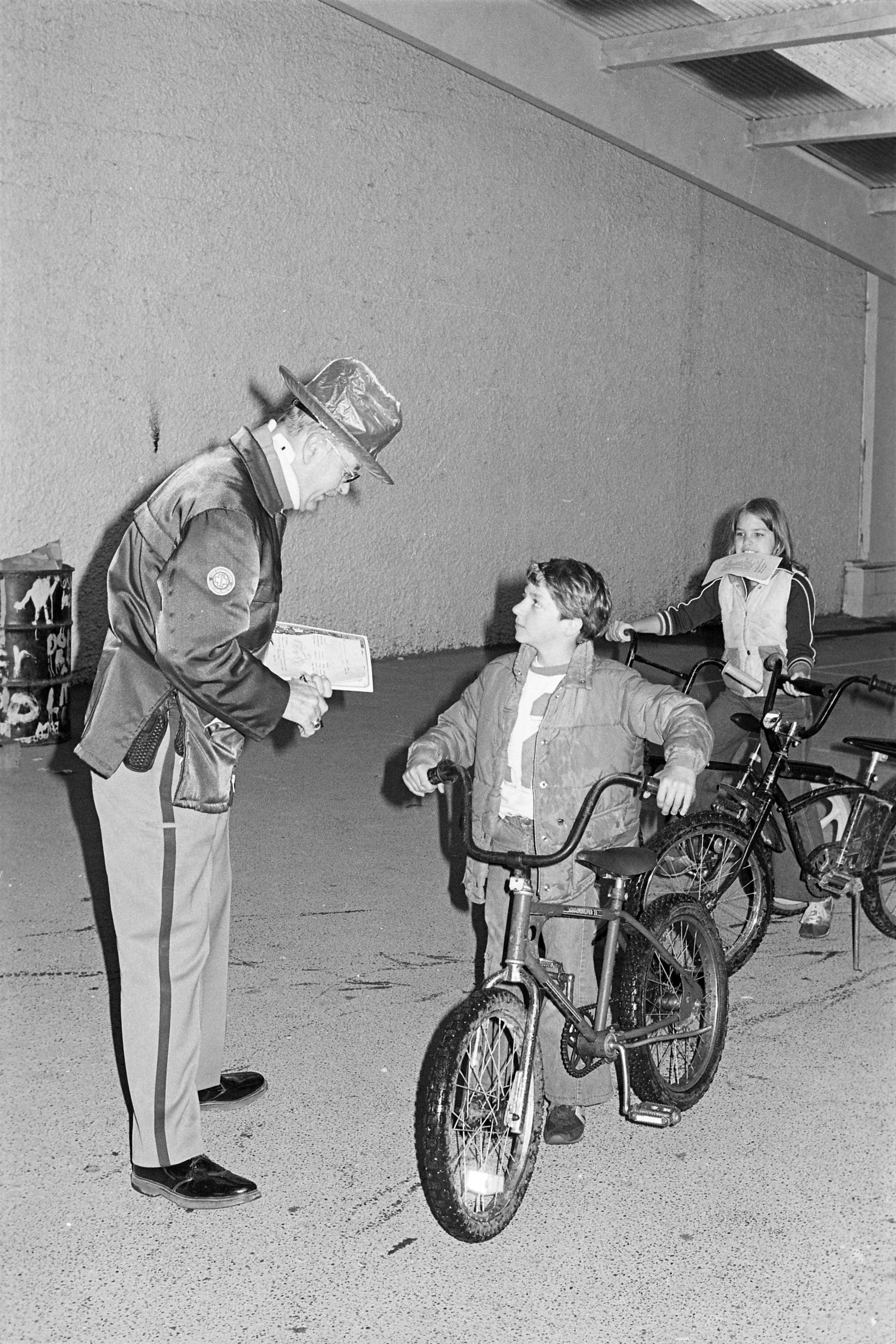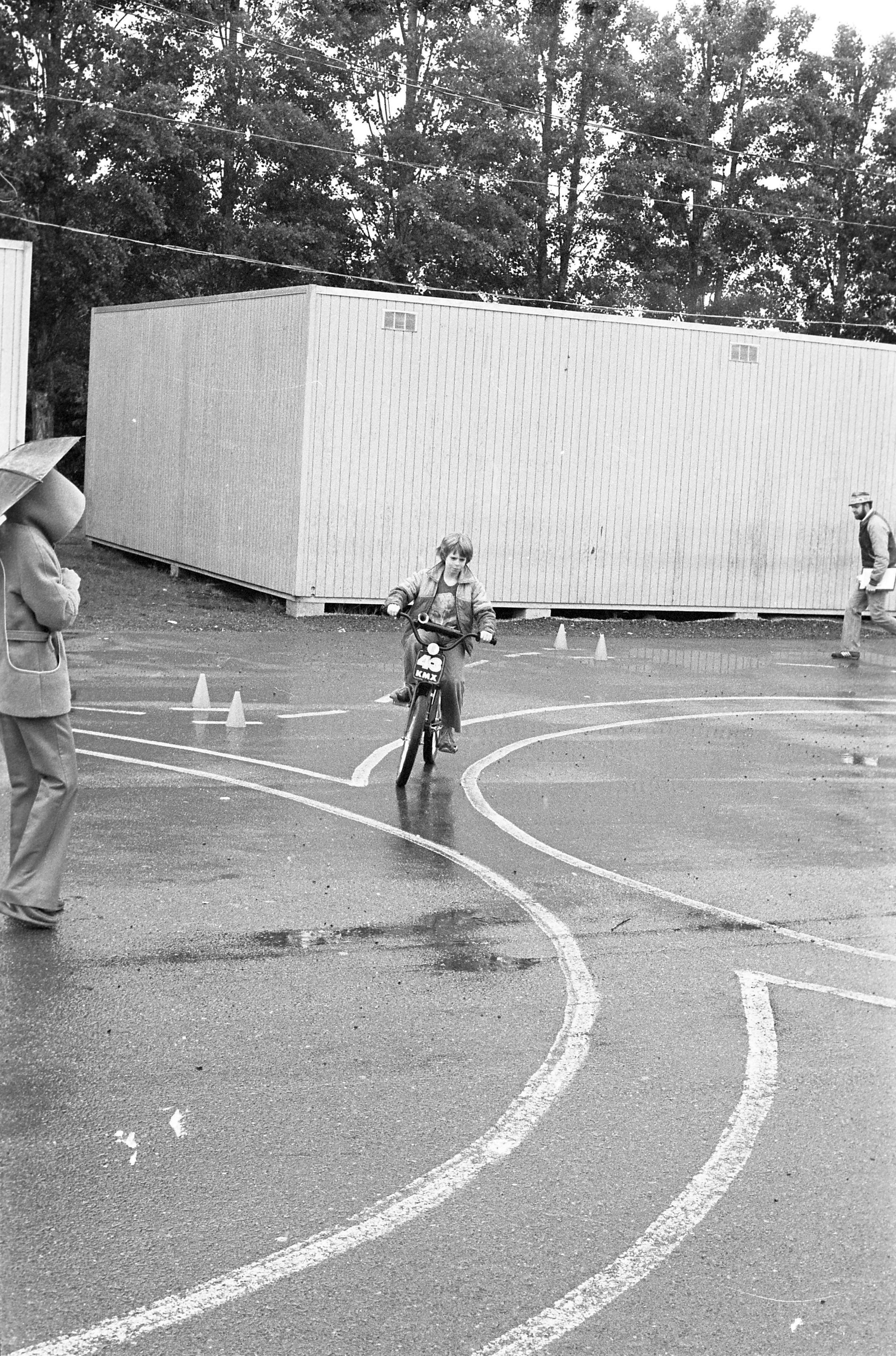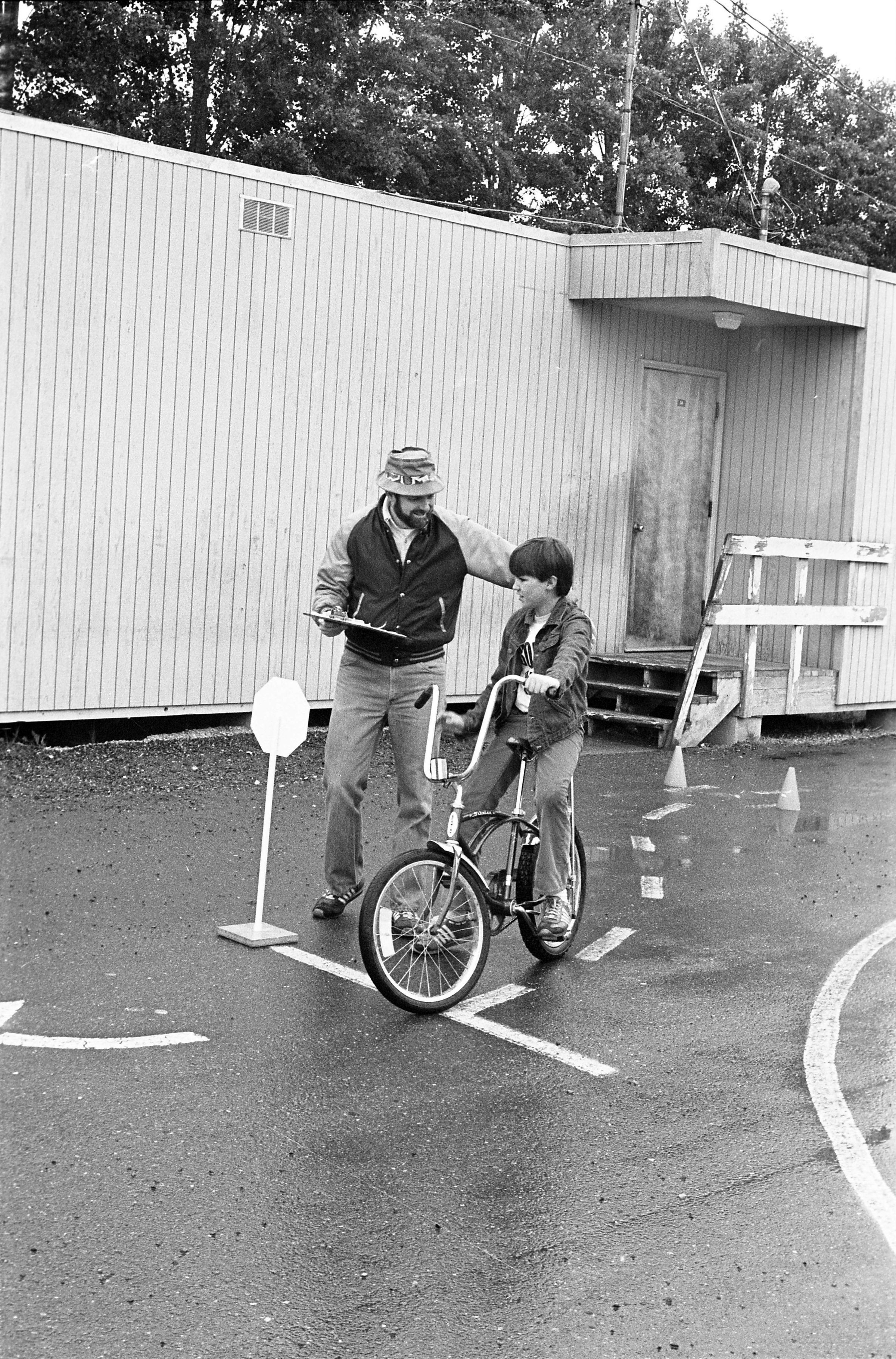 The images show a "Bike Rodeo," a youth event put on by the Lacey Police Department which consisted of a bicycle obstacle course and bicycle inspections performed by officers. Ken Balsley noted that the officers would license bicycles which passed their inspections.Made/Created