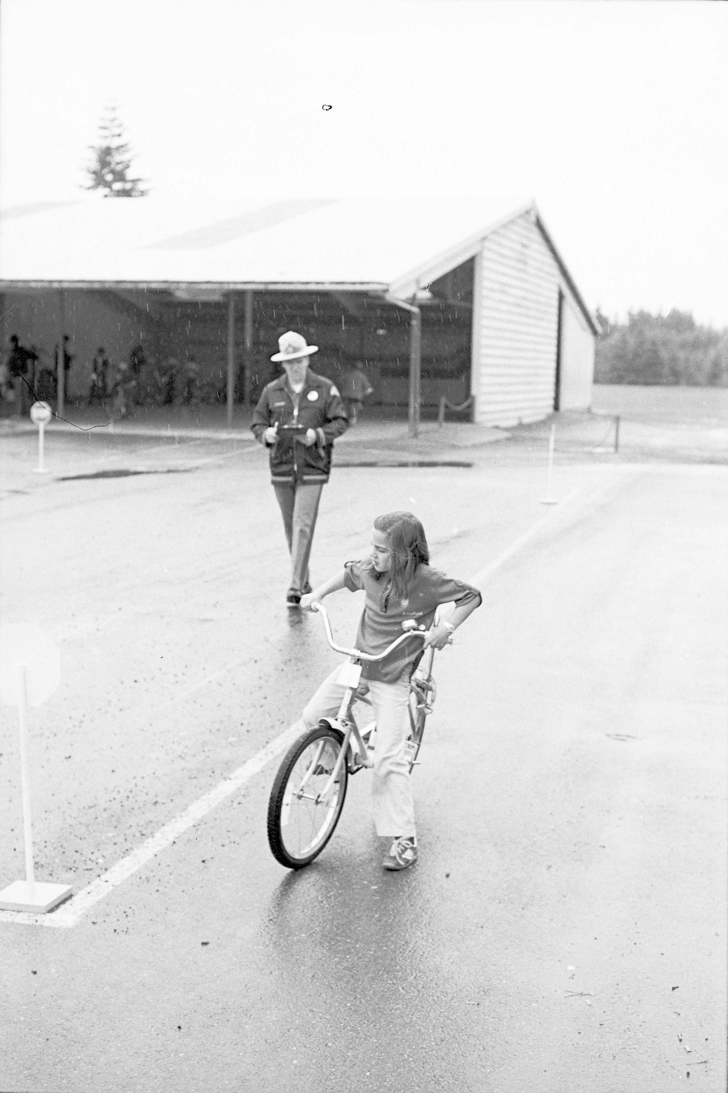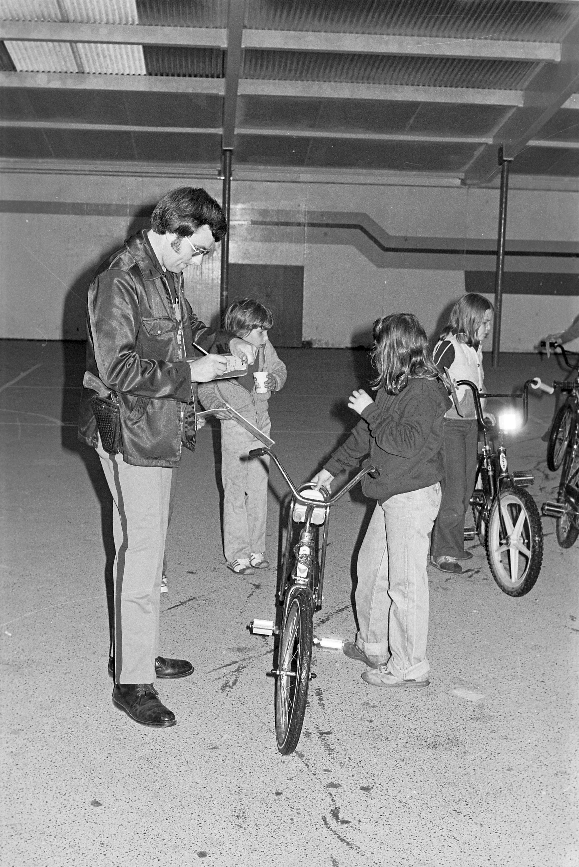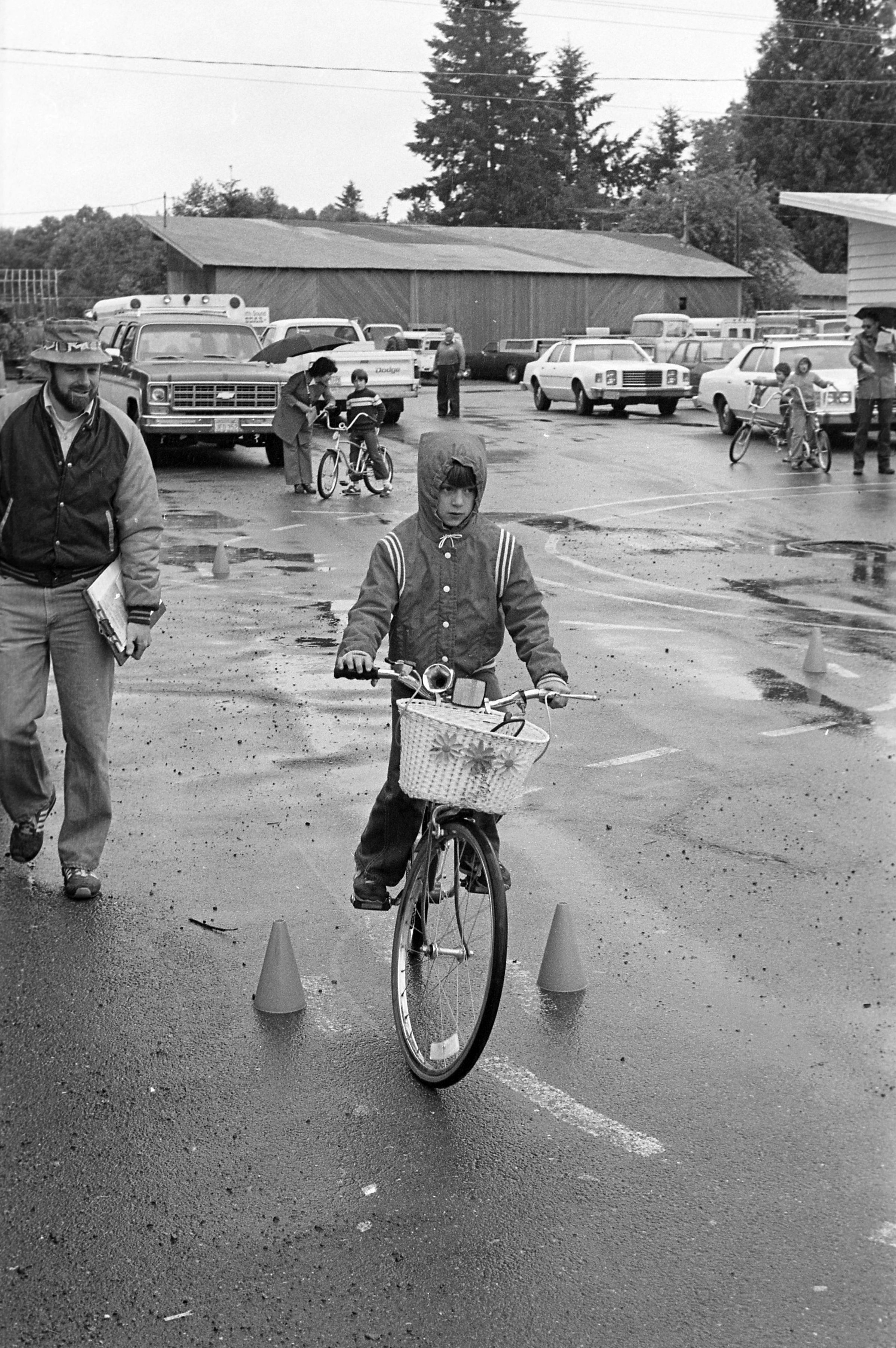 The images show a "Bike Rodeo," a youth event put on by the Lacey Police Department which consisted of a bicycle obstacle course and bicycle inspections performed by officers. Ken Balsley noted that the officers would license bicycles which passed their inspections.Made/Created