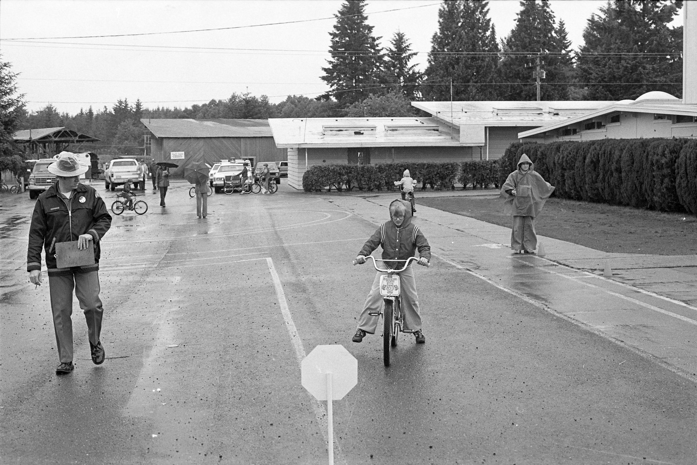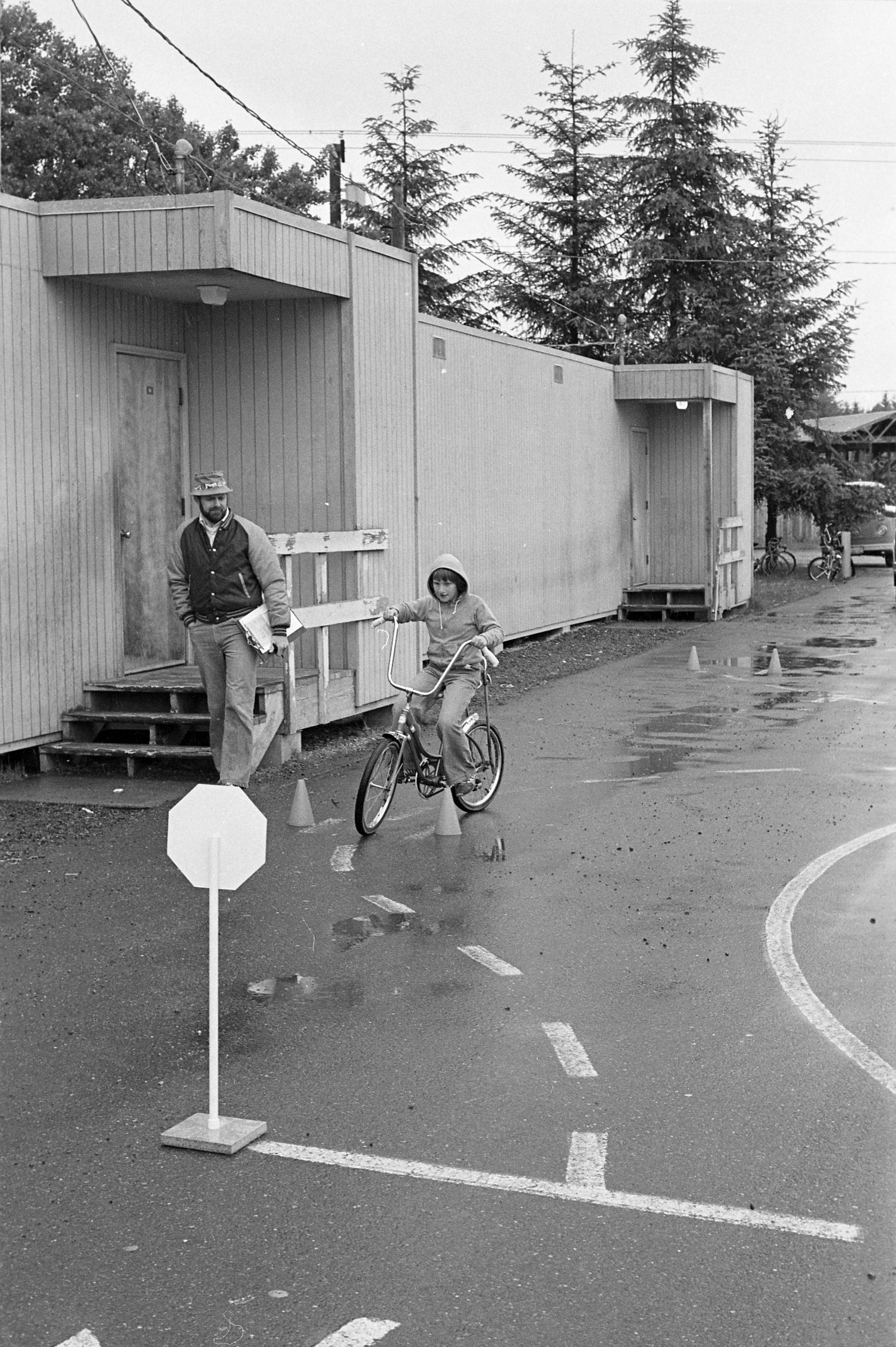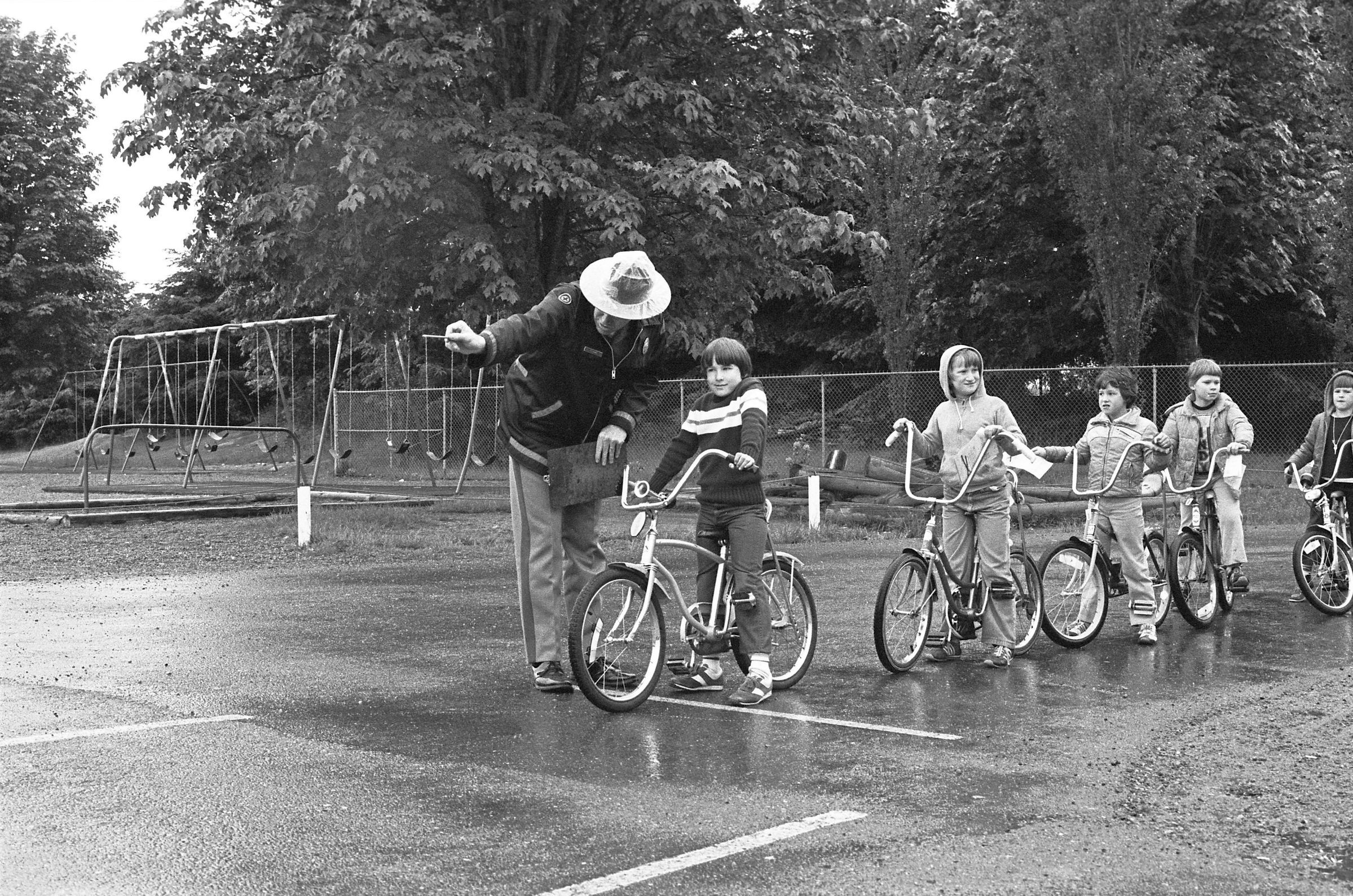 South Bay School, unknown date. These three black and white film negative strips were created for the Lacey Leader newspaper. One of the strips bears five images (images 20-24), one of the strips bears four images (images 25-28), and one of the strips bears three images (images 29-31). All three of these film negative strips show a number of children participating in a bike course at a playground with at least three adult male supervisors on a rainy day.