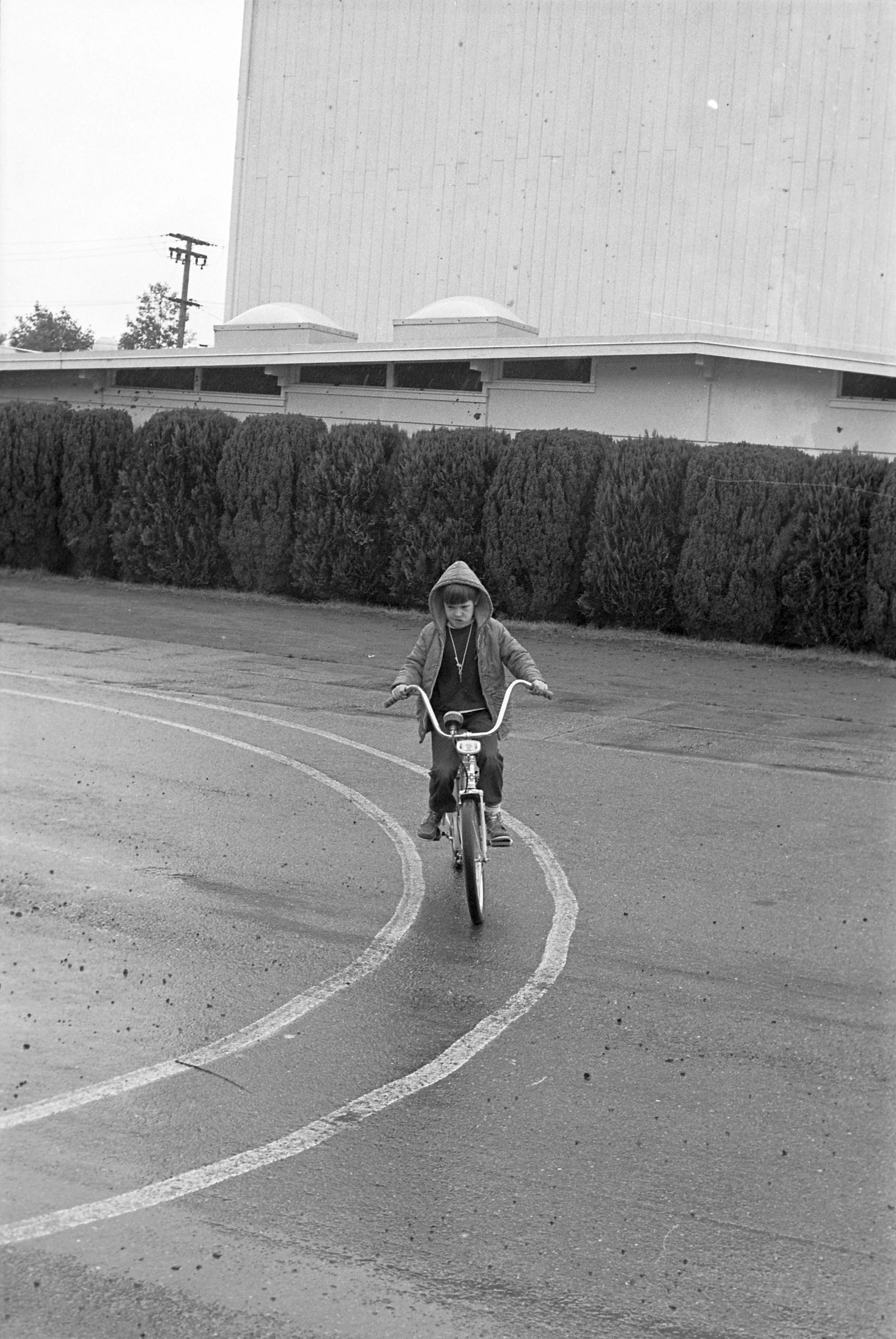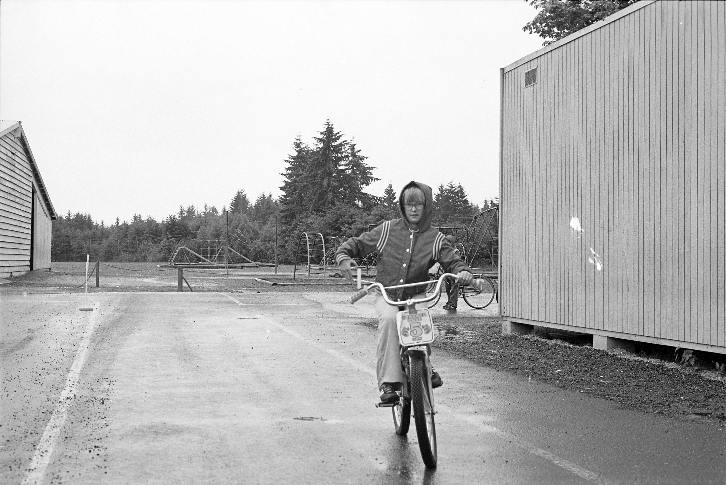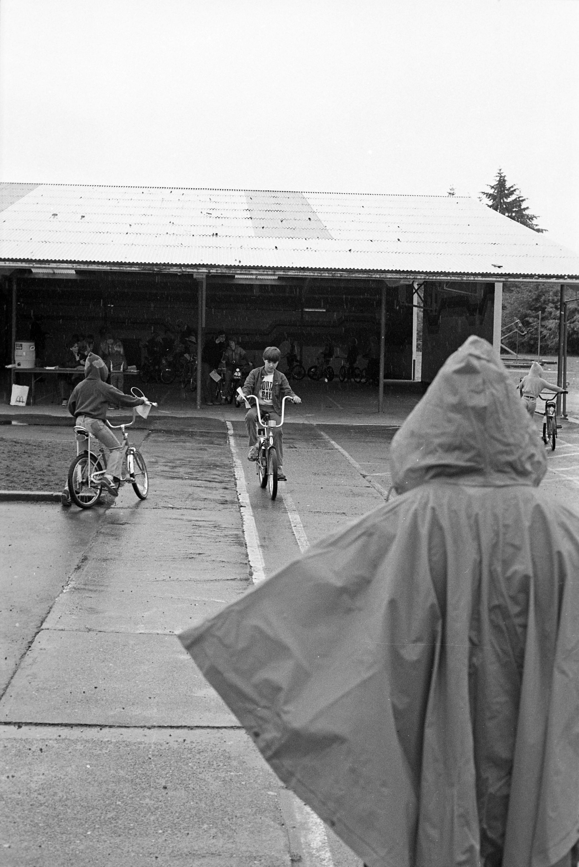 South Bay School, unknown date. These three black and white film negative strips were created for the Lacey Leader newspaper. One of the strips bears five images (images 20-24), one of the strips bears four images (images 25-28), and one of the strips bears three images (images 29-31). All three of these film negative strips show a number of children participating in a bike course at a playground with at least three adult male supervisors on a rainy day.