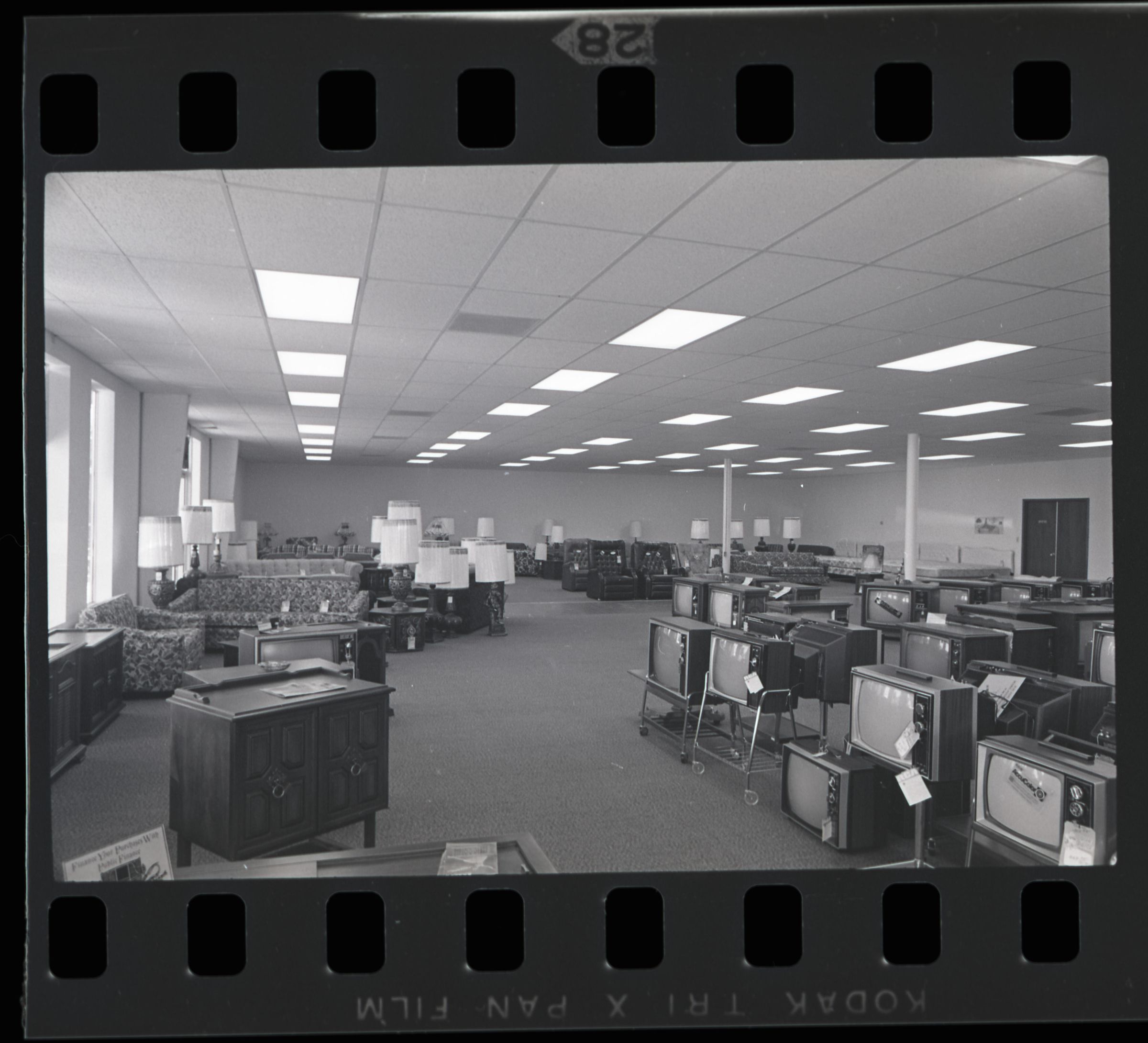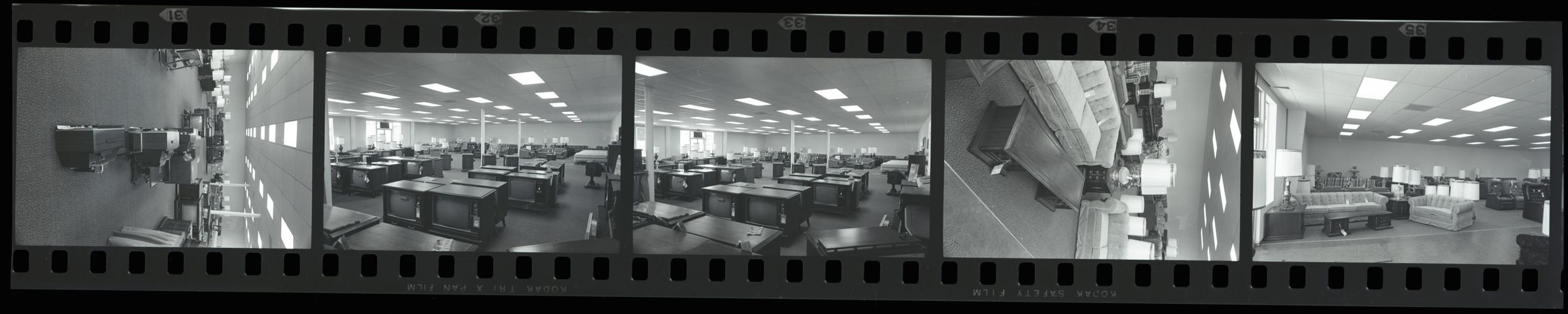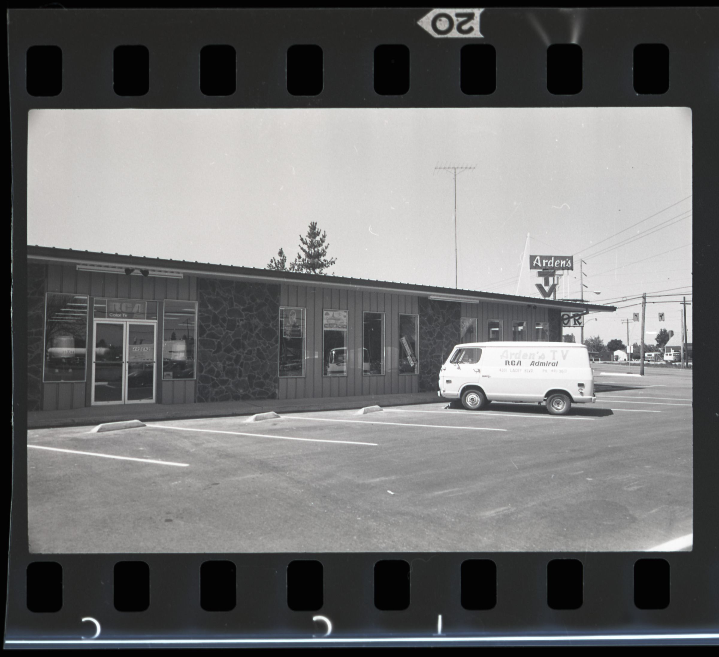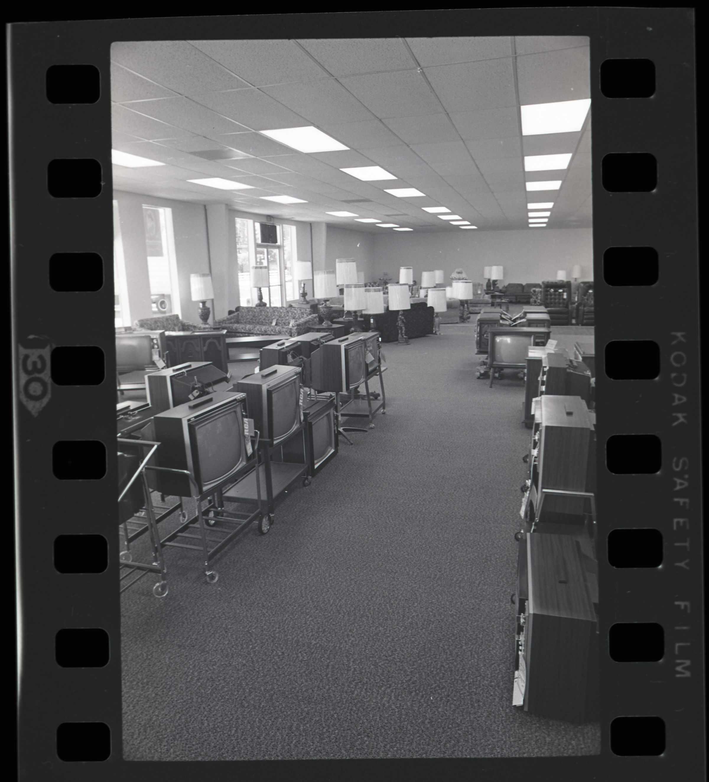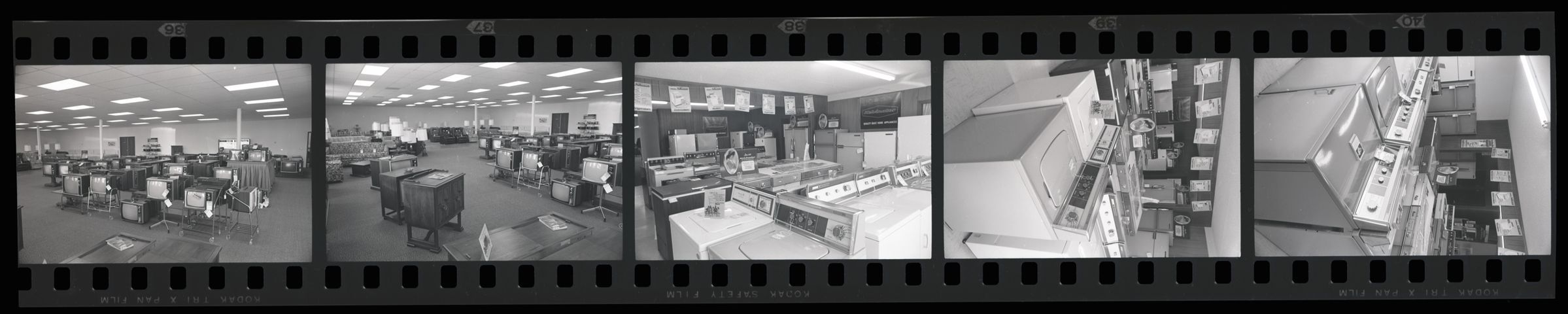 Arden's TV, 1973. These four black and white film negative strips were created for the Lacey Leader newspaper. Two strips bear three images each (images 20-22 and images 28-30) and the two other strips bear five images each (images 31-35 and 36-40). The images show the exterior of the Arden's TV store as well as interior shots of the sales floor showing televisions, furniture, and home appliances. Image 20 shows the exterior of the Arden's TV store from a diagonal angle and a van parked in front of the store. There is a sign reading "Arden's TV" above the building at the far right, and printed on the van is "Arden's TV," "RCA Admiral," "4331 Lacey Blvd," and "Ph. 491-3617." Image 21 is virtually identical to image 20. Image 22 is similar to images 20 and 21, but the picture is taken from closer to the van and from an angle closer to straight-on in relation to the front of the store than images 20 or 21. Image 28 shows the sales floor of the Arden's TV store. In the left-hand foreground are several cabinets, in the left middle ground and background are couches and lamps. In the right-hand foreground are a large number of televisions. At the center background are recliners. Image 29 is similar to image 28, but the image was captured with the camera situated several feet to the left of that in image 28. The image frame has also panned further to the right. Image 30 shows the sales floor again, but the fore- and middle ground are filled with televisions, while couches, lamps, and recliners are visible in the background. Image 31 shows the sales floor again, this time with a line of televisions perpendicular to the picture plane. Image 32 shows the sales floor again, but this time with televisions dominating the fore- and middle ground. Image 33 shows a very similar image as images 32, but the photographer has backed up or zoomed out slightly. Image 34 shows the sales floor again, but with a coffee table and two couches in the foregound. One lamp sitting on an end table is at center in the middle ground. Image 35 shows the sales floor with the photographer standing with one of the walls very near to his or her left. In the middle ground are two couches, two end tables, two lamps, and one coffee table. Image 36 shows a large grouping of televisions at the center middle-and backgrounds. Recliners are visible in the left-hand background, and the tops of two cabiners are visible at the bottom of the frame. Image 37 shows several cabinets in the foreground with televisions to the right. Couches are in the left background and recliners are at center background. Image 38 shows approximately 20 laundry washing machines in the foreground with refrigerators against the wall of the store at the background. Image 39 shows a very similar scene to image 38, but the image frame has changed from horizontal to vertical so as to make more of the closest laundry washing machines included in the frame. Image 40 shows several clothes dryers in the foreground and refrigerators in the left-hand background.