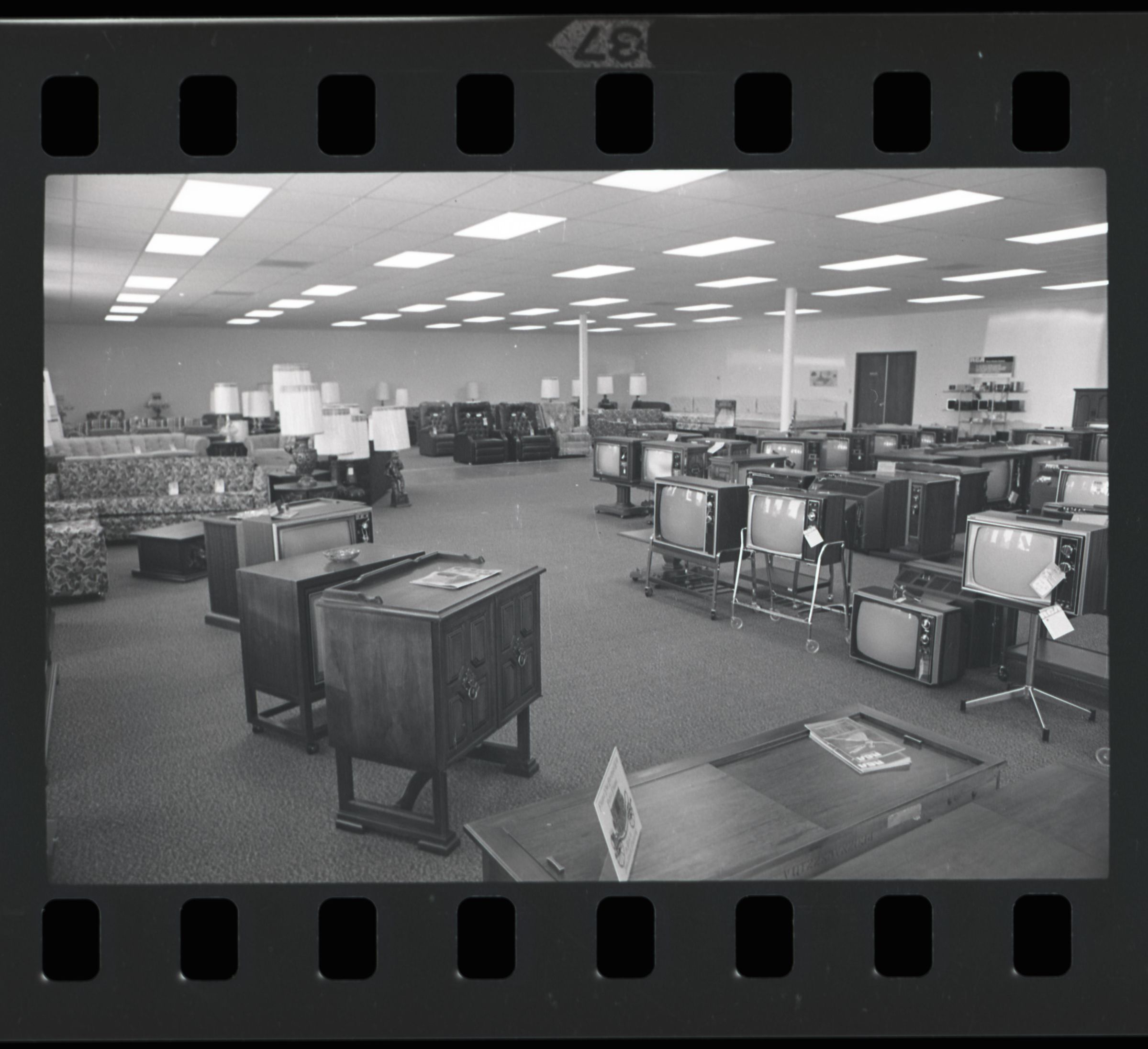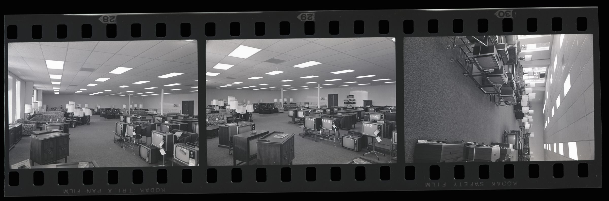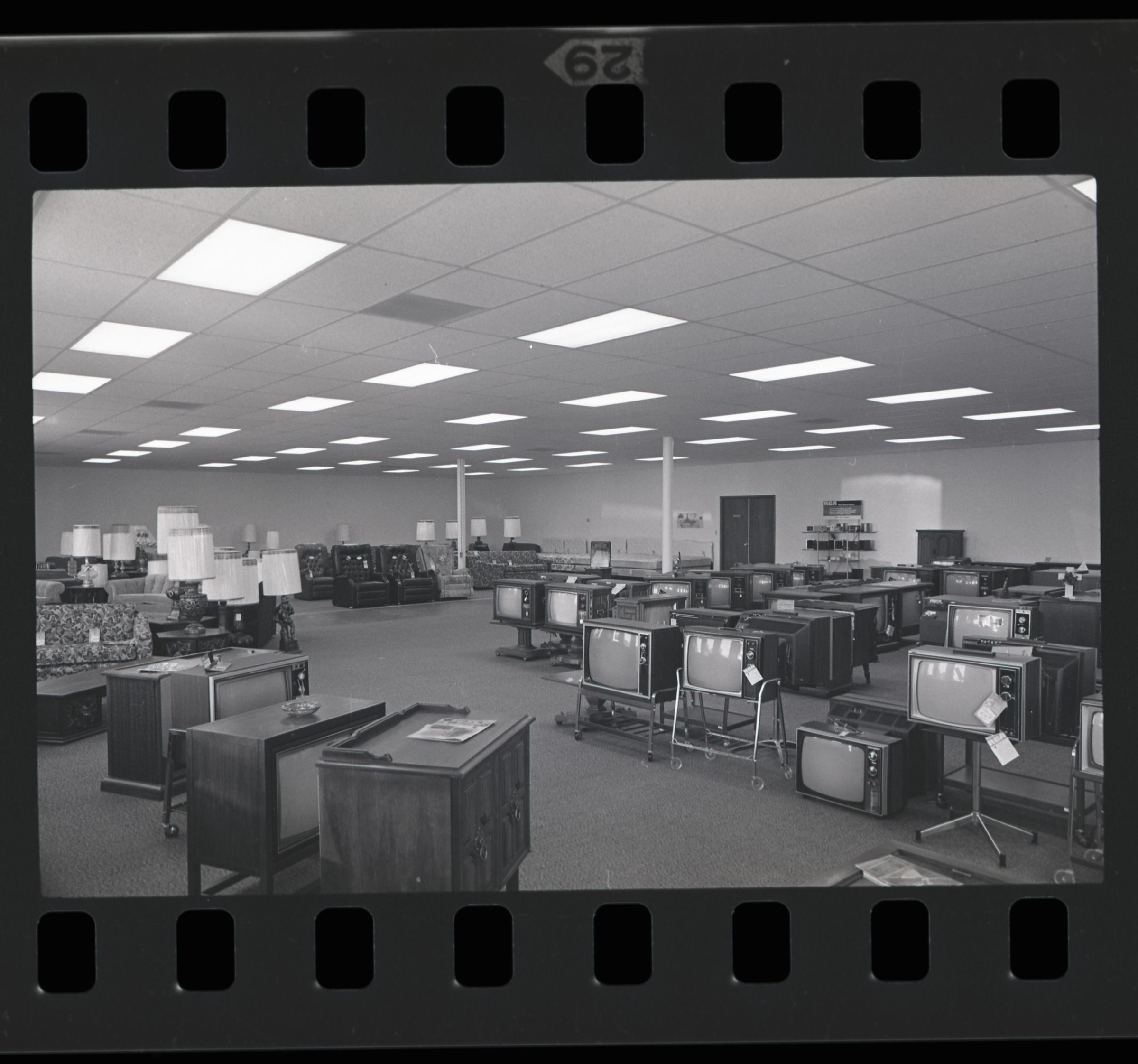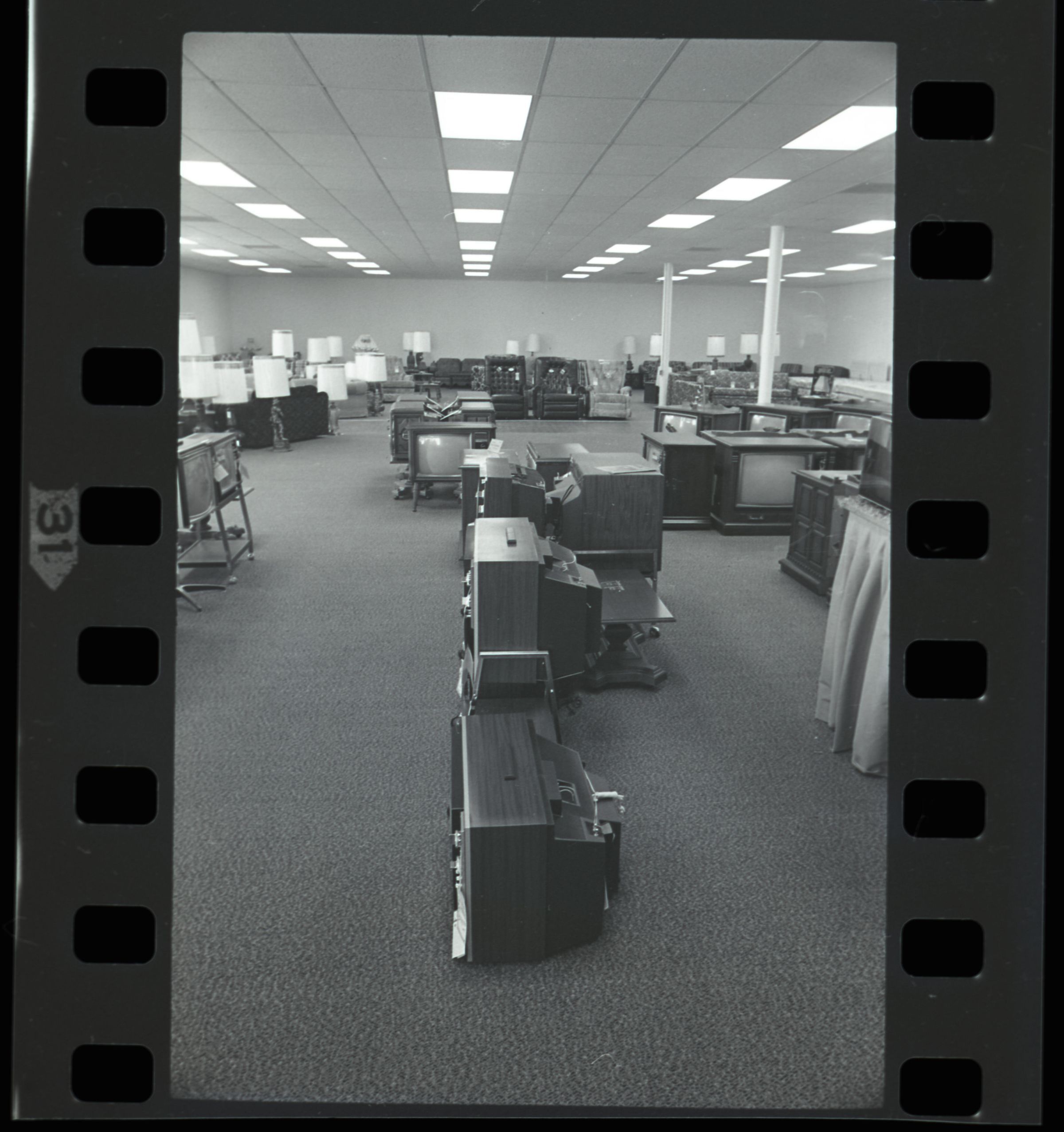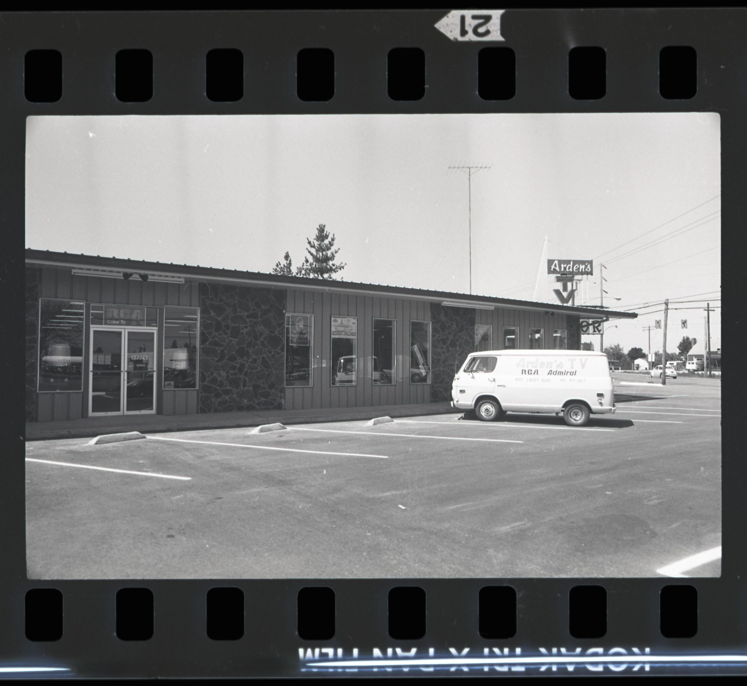 Arden's TV, 1973. These four black and white film negative strips were created for the Lacey Leader newspaper. Two strips bear three images each (images 20-22 and images 28-30) and the two other strips bear five images each (images 31-35 and 36-40). The images show the exterior of the Arden's TV store as well as interior shots of the sales floor showing televisions, furniture, and home appliances. Image 20 shows the exterior of the Arden's TV store from a diagonal angle and a van parked in front of the store. There is a sign reading "Arden's TV" above the building at the far right, and printed on the van is "Arden's TV," "RCA Admiral," "4331 Lacey Blvd," and "Ph. 491-3617." Image 21 is virtually identical to image 20. Image 22 is similar to images 20 and 21, but the picture is taken from closer to the van and from an angle closer to straight-on in relation to the front of the store than images 20 or 21. Image 28 shows the sales floor of the Arden's TV store. In the left-hand foreground are several cabinets, in the left middle ground and background are couches and lamps. In the right-hand foreground are a large number of televisions. At the center background are recliners. Image 29 is similar to image 28, but the image was captured with the camera situated several feet to the left of that in image 28. The image frame has also panned further to the right. Image 30 shows the sales floor again, but the fore- and middle ground are filled with televisions, while couches, lamps, and recliners are visible in the background. Image 31 shows the sales floor again, this time with a line of televisions perpendicular to the picture plane. Image 32 shows the sales floor again, but this time with televisions dominating the fore- and middle ground. Image 33 shows a very similar image as images 32, but the photographer has backed up or zoomed out slightly. Image 34 shows the sales floor again, but with a coffee table and two couches in the foregound. One lamp sitting on an end table is at center in the middle ground. Image 35 shows the sales floor with the photographer standing with one of the walls very near to his or her left. In the middle ground are two couches, two end tables, two lamps, and one coffee table. Image 36 shows a large grouping of televisions at the center middle-and backgrounds. Recliners are visible in the left-hand background, and the tops of two cabiners are visible at the bottom of the frame. Image 37 shows several cabinets in the foreground with televisions to the right. Couches are in the left background and recliners are at center background. Image 38 shows approximately 20 laundry washing machines in the foreground with refrigerators against the wall of the store at the background. Image 39 shows a very similar scene to image 38, but the image frame has changed from horizontal to vertical so as to make more of the closest laundry washing machines included in the frame. Image 40 shows several clothes dryers in the foreground and refrigerators in the left-hand background.