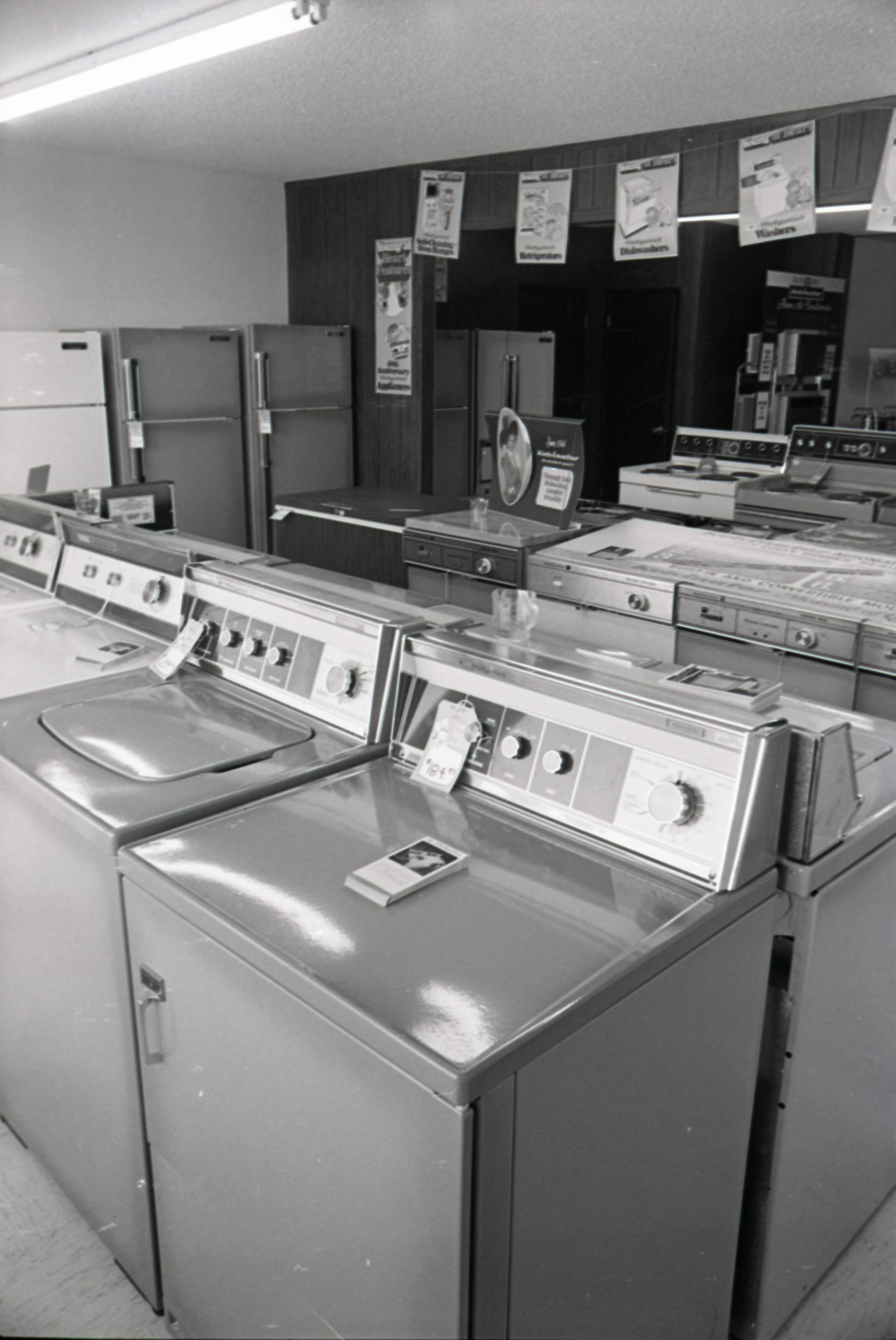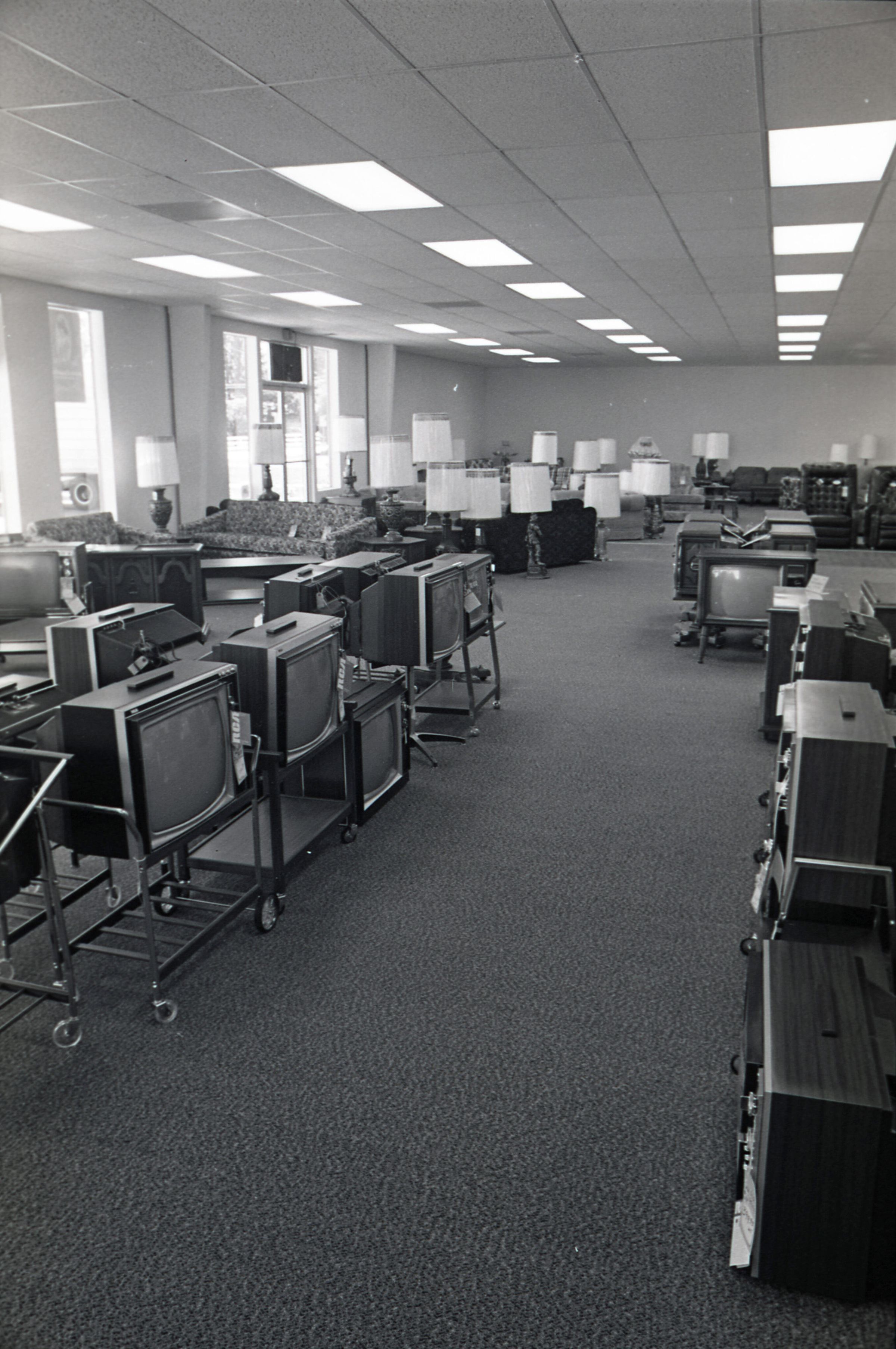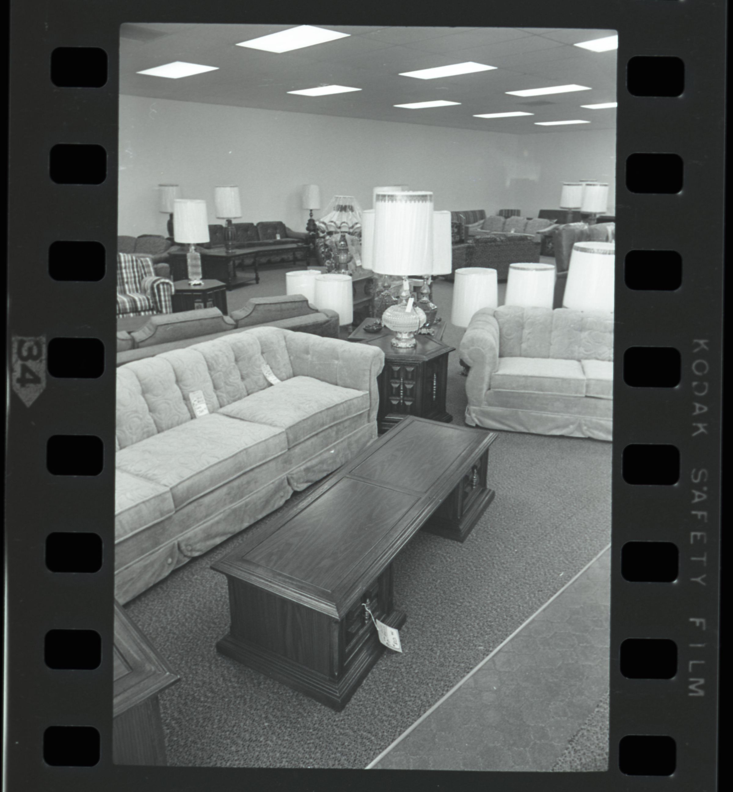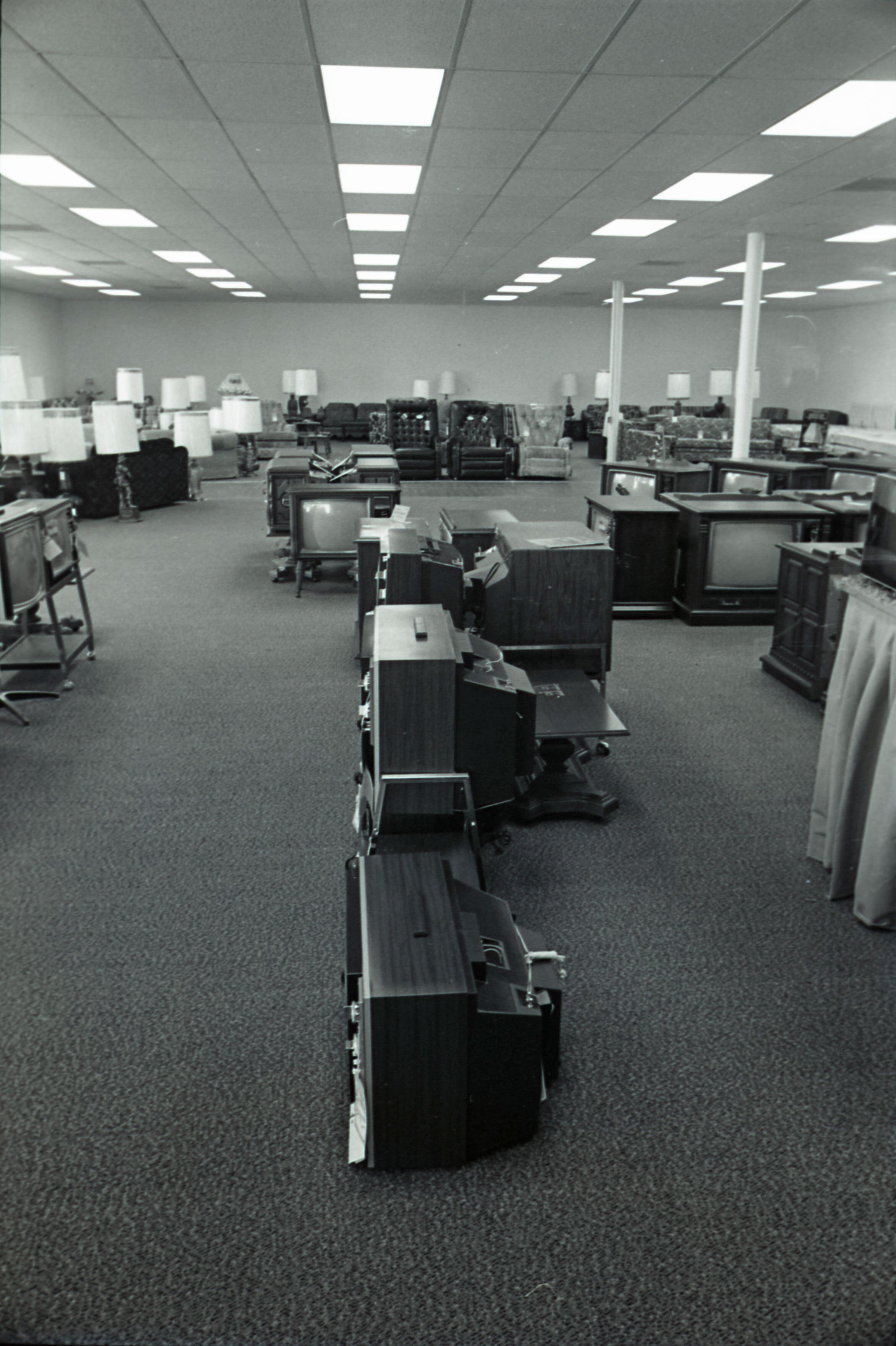 Arden's TV, 1973. These four black and white film negative strips were created for the Lacey Leader newspaper. Two strips bear three images each (images 20-22 and images 28-30) and the two other strips bear five images each (images 31-35 and 36-40). The images show the exterior of the Arden's TV store as well as interior shots of the sales floor showing televisions, furniture, and home appliances. Image 20 shows the exterior of the Arden's TV store from a diagonal angle and a van parked in front of the store. There is a sign reading "Arden's TV" above the building at the far right, and printed on the van is "Arden's TV," "RCA Admiral," "4331 Lacey Blvd," and "Ph. 491-3617." Image 21 is virtually identical to image 20. Image 22 is similar to images 20 and 21, but the picture is taken from closer to the van and from an angle closer to straight-on in relation to the front of the store than images 20 or 21. Image 28 shows the sales floor of the Arden's TV store. In the left-hand foreground are several cabinets, in the left middle ground and background are couches and lamps. In the right-hand foreground are a large number of televisions. At the center background are recliners. Image 29 is similar to image 28, but the image was captured with the camera situated several feet to the left of that in image 28. The image frame has also panned further to the right. Image 30 shows the sales floor again, but the fore- and middle ground are filled with televisions, while couches, lamps, and recliners are visible in the background. Image 31 shows the sales floor again, this time with a line of televisions perpendicular to the picture plane. Image 32 shows the sales floor again, but this time with televisions dominating the fore- and middle ground. Image 33 shows a very similar image as images 32, but the photographer has backed up or zoomed out slightly. Image 34 shows the sales floor again, but with a coffee table and two couches in the foregound. One lamp sitting on an end table is at center in the middle ground. Image 35 shows the sales floor with the photographer standing with one of the walls very near to his or her left. In the middle ground are two couches, two end tables, two lamps, and one coffee table. Image 36 shows a large grouping of televisions at the center middle-and backgrounds. Recliners are visible in the left-hand background, and the tops of two cabiners are visible at the bottom of the frame. Image 37 shows several cabinets in the foreground with televisions to the right. Couches are in the left background and recliners are at center background. Image 38 shows approximately 20 laundry washing machines in the foreground with refrigerators against the wall of the store at the background. Image 39 shows a very similar scene to image 38, but the image frame has changed from horizontal to vertical so as to make more of the closest laundry washing machines included in the frame. Image 40 shows several clothes dryers in the foreground and refrigerators in the left-hand background.