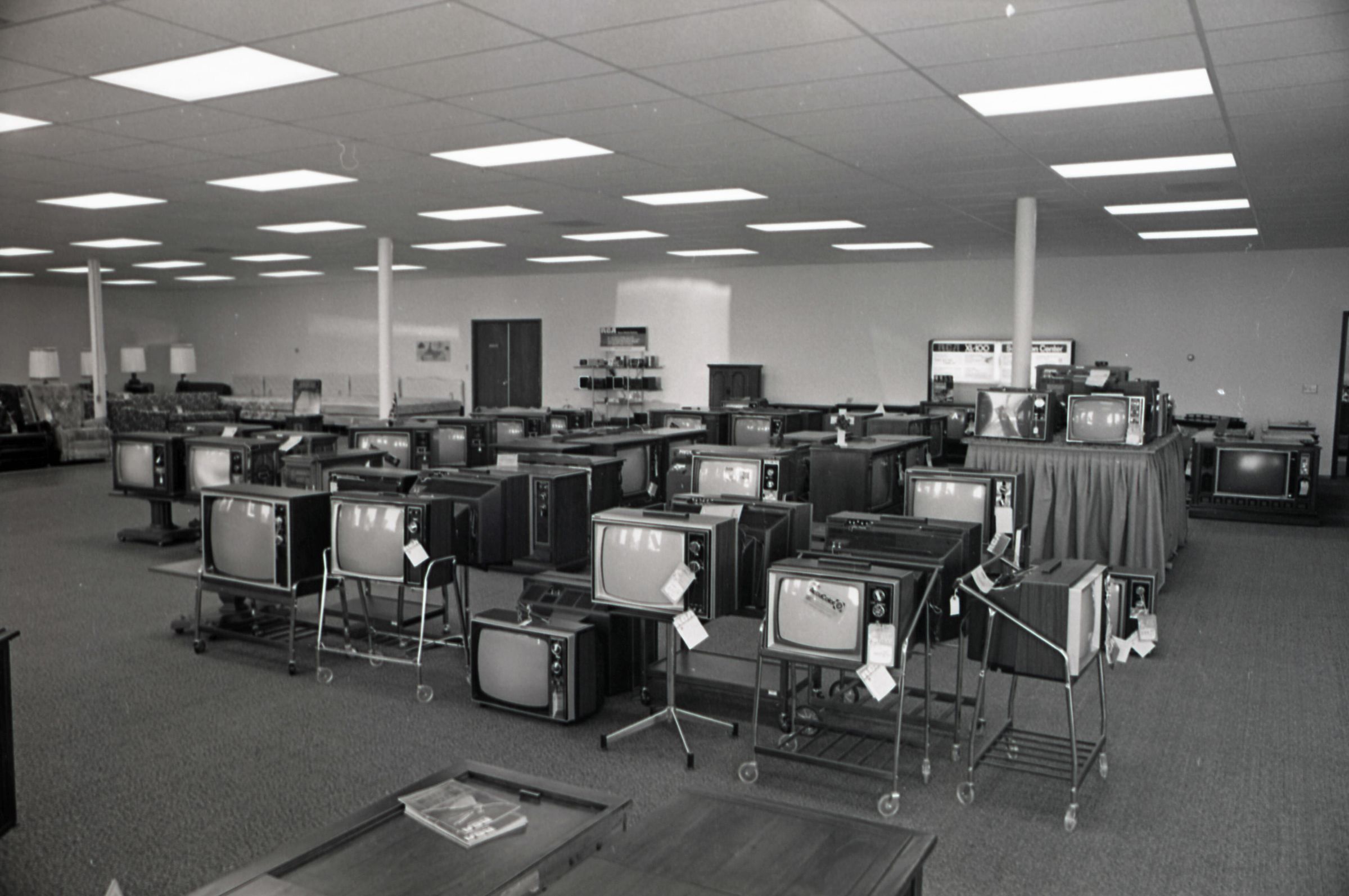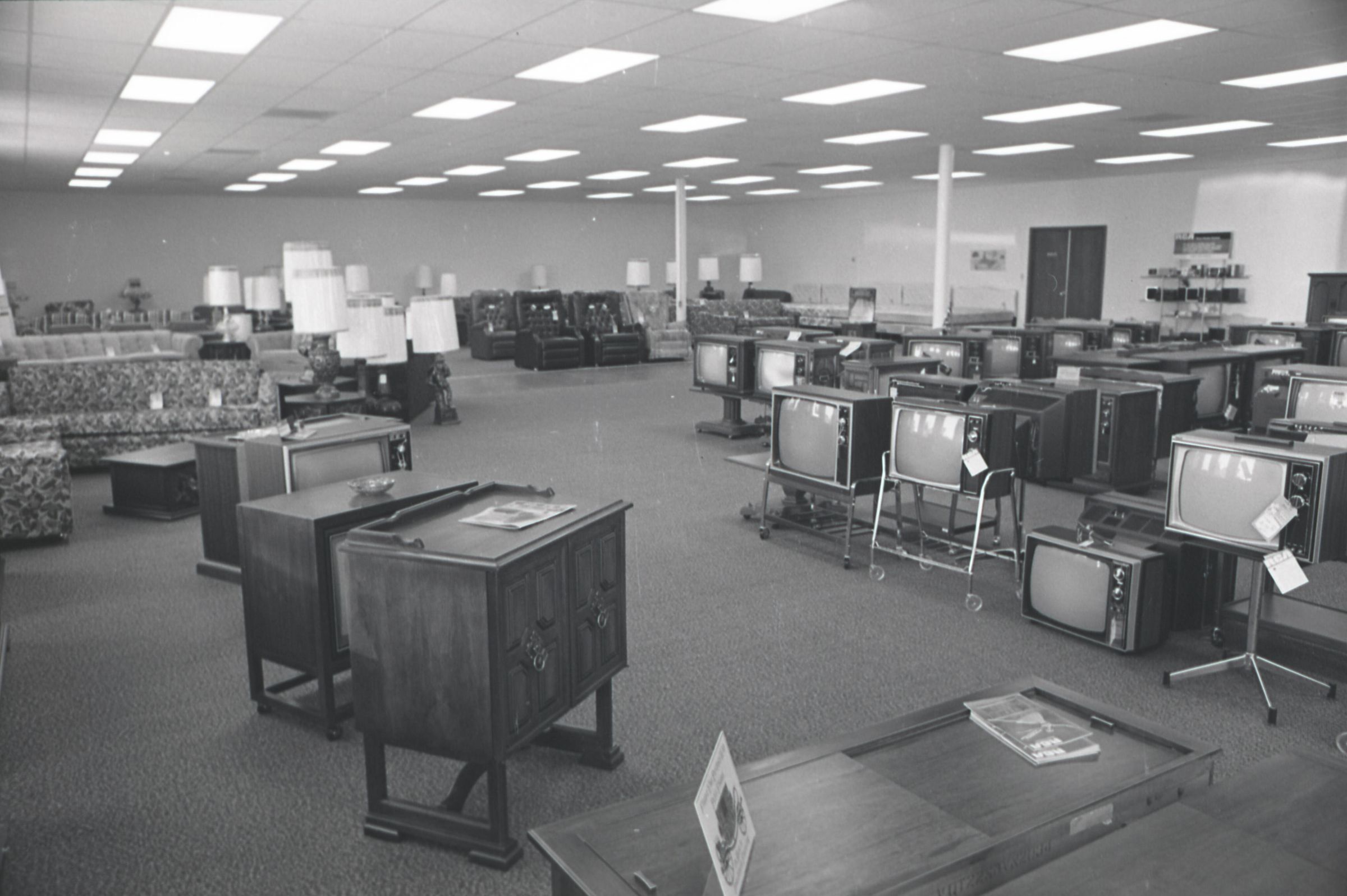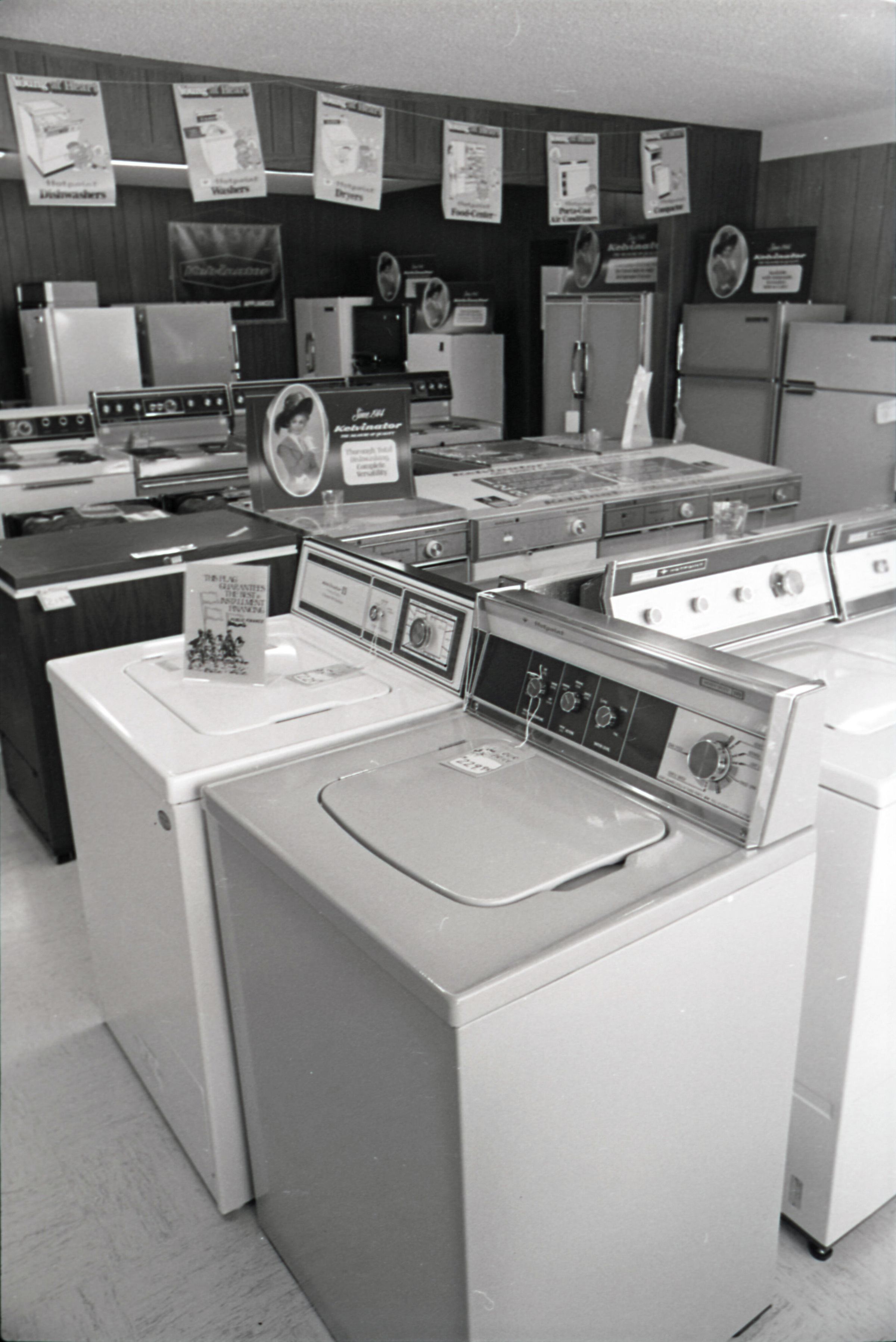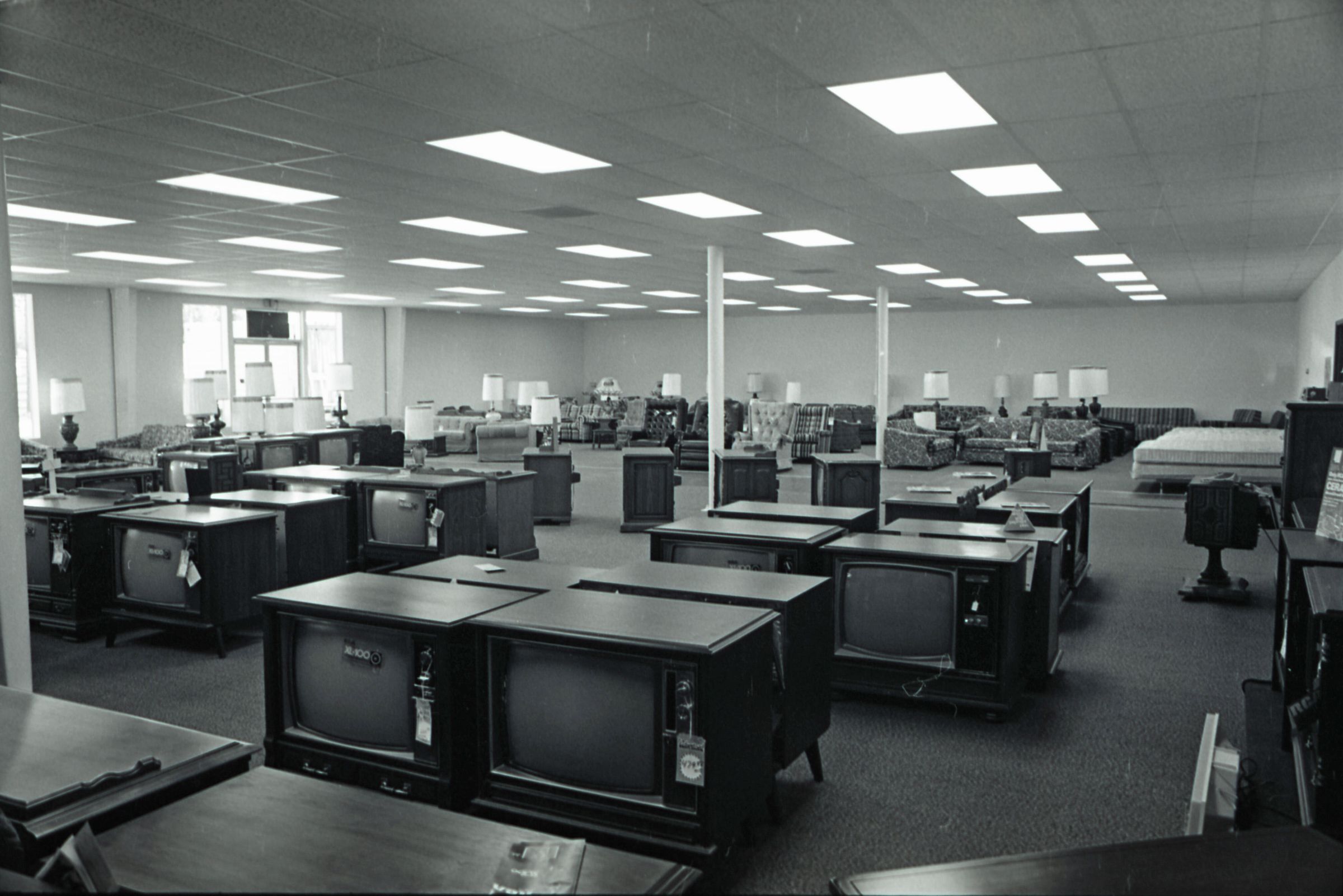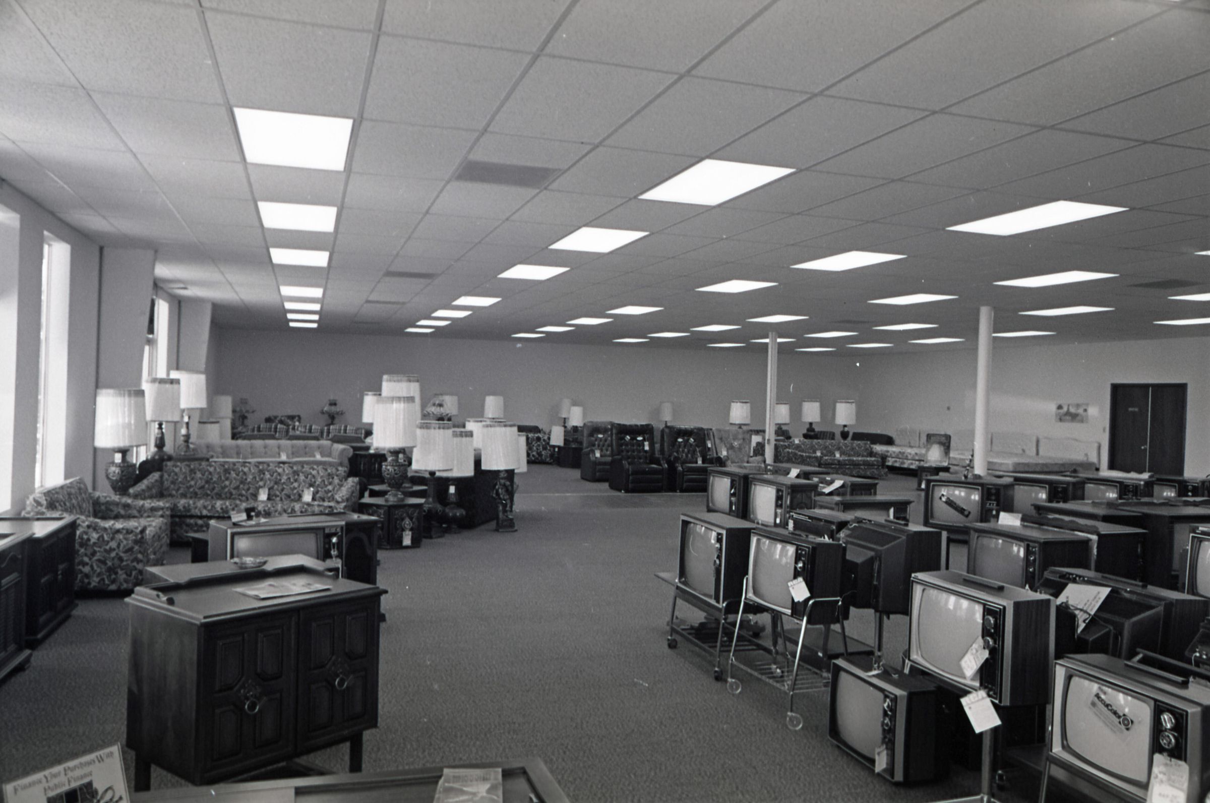 Arden's TV, 1973. These four black and white film negative strips were created for the Lacey Leader newspaper. Two strips bear three images each (images 20-22 and images 28-30) and the two other strips bear five images each (images 31-35 and 36-40). The images show the exterior of the Arden's TV store as well as interior shots of the sales floor showing televisions, furniture, and home appliances. Image 20 shows the exterior of the Arden's TV store from a diagonal angle and a van parked in front of the store. There is a sign reading "Arden's TV" above the building at the far right, and printed on the van is "Arden's TV," "RCA Admiral," "4331 Lacey Blvd," and "Ph. 491-3617." Image 21 is virtually identical to image 20. Image 22 is similar to images 20 and 21, but the picture is taken from closer to the van and from an angle closer to straight-on in relation to the front of the store than images 20 or 21. Image 28 shows the sales floor of the Arden's TV store. In the left-hand foreground are several cabinets, in the left middle ground and background are couches and lamps. In the right-hand foreground are a large number of televisions. At the center background are recliners. Image 29 is similar to image 28, but the image was captured with the camera situated several feet to the left of that in image 28. The image frame has also panned further to the right. Image 30 shows the sales floor again, but the fore- and middle ground are filled with televisions, while couches, lamps, and recliners are visible in the background. Image 31 shows the sales floor again, this time with a line of televisions perpendicular to the picture plane. Image 32 shows the sales floor again, but this time with televisions dominating the fore- and middle ground. Image 33 shows a very similar image as images 32, but the photographer has backed up or zoomed out slightly. Image 34 shows the sales floor again, but with a coffee table and two couches in the foregound. One lamp sitting on an end table is at center in the middle ground. Image 35 shows the sales floor with the photographer standing with one of the walls very near to his or her left. In the middle ground are two couches, two end tables, two lamps, and one coffee table. Image 36 shows a large grouping of televisions at the center middle-and backgrounds. Recliners are visible in the left-hand background, and the tops of two cabiners are visible at the bottom of the frame. Image 37 shows several cabinets in the foreground with televisions to the right. Couches are in the left background and recliners are at center background. Image 38 shows approximately 20 laundry washing machines in the foreground with refrigerators against the wall of the store at the background. Image 39 shows a very similar scene to image 38, but the image frame has changed from horizontal to vertical so as to make more of the closest laundry washing machines included in the frame. Image 40 shows several clothes dryers in the foreground and refrigerators in the left-hand background.