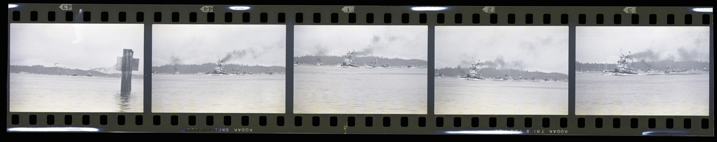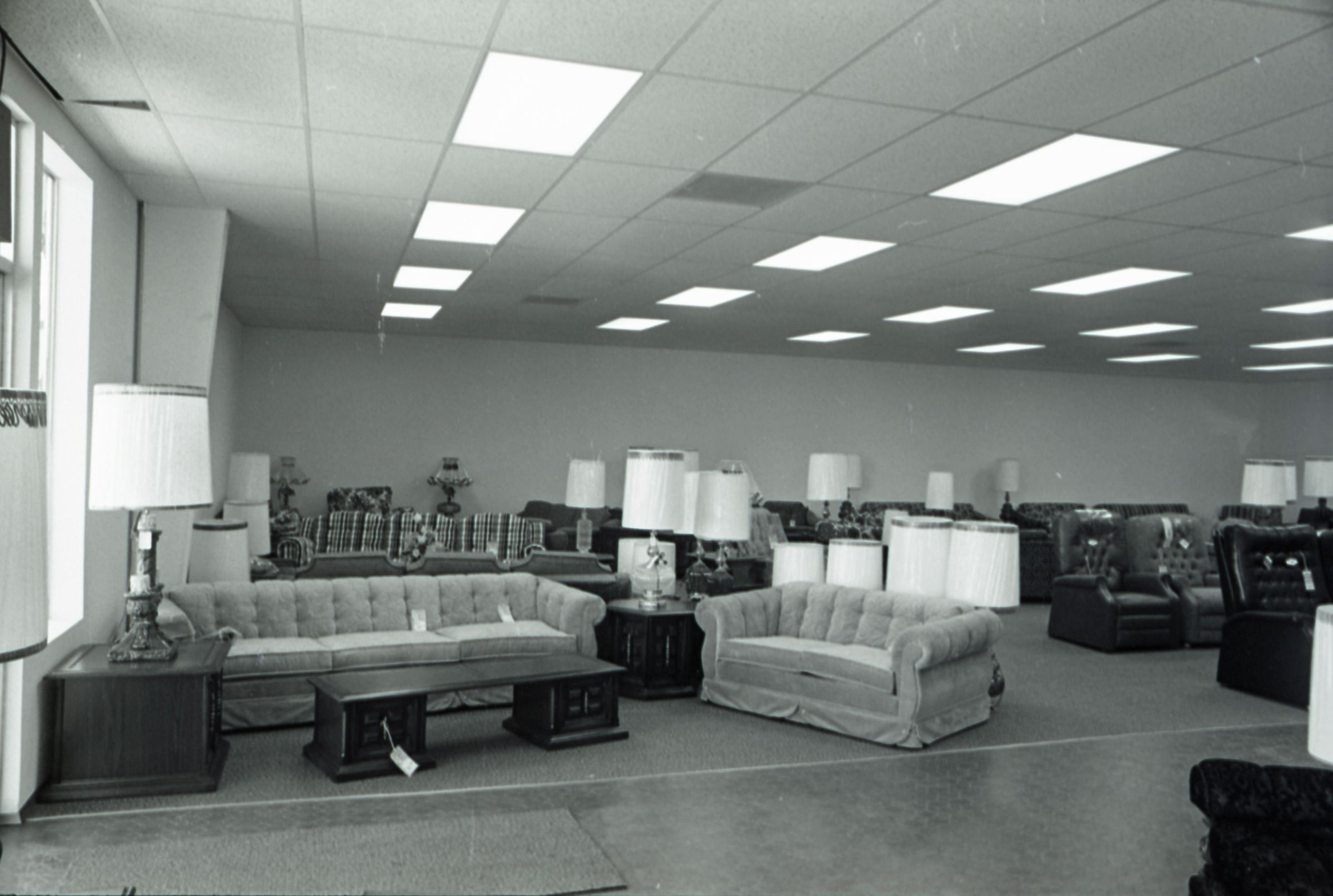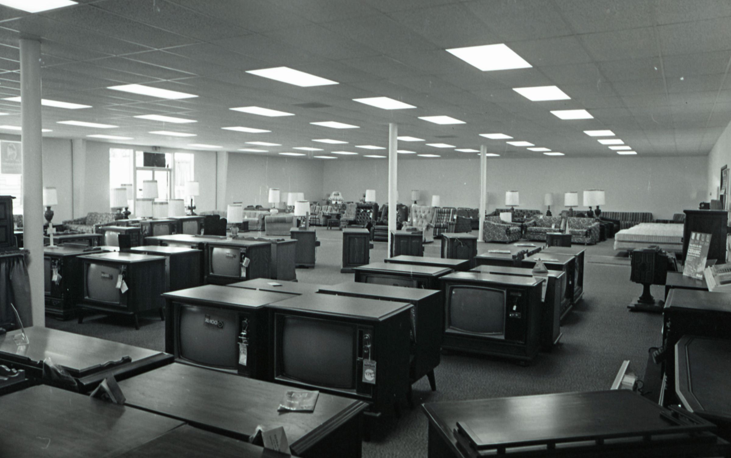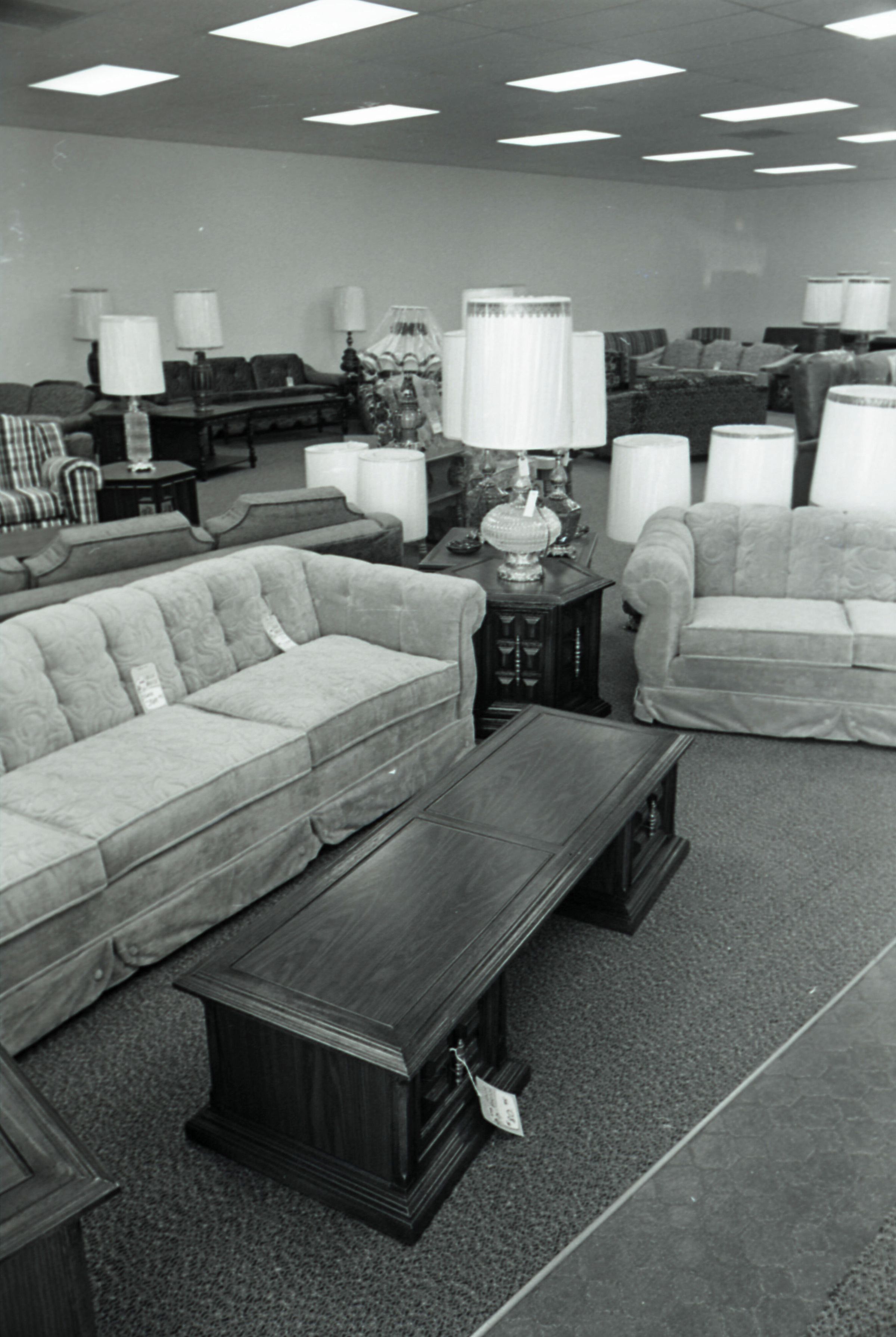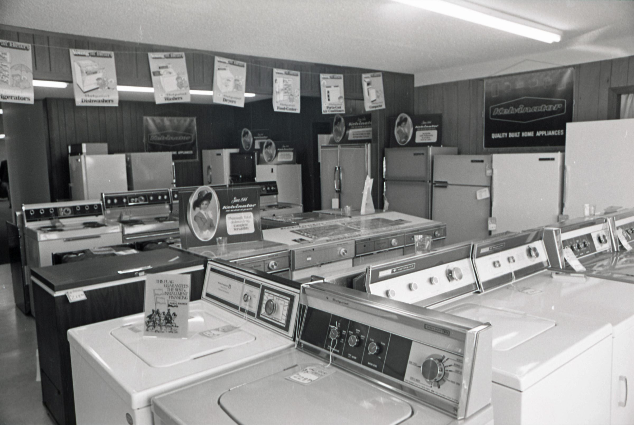 Arden's TV, 1973. These four black and white film negative strips were created for the Lacey Leader newspaper. Two strips bear three images each (images 20-22 and images 28-30) and the two other strips bear five images each (images 31-35 and 36-40). The images show the exterior of the Arden's TV store as well as interior shots of the sales floor showing televisions, furniture, and home appliances. Image 20 shows the exterior of the Arden's TV store from a diagonal angle and a van parked in front of the store. There is a sign reading "Arden's TV" above the building at the far right, and printed on the van is "Arden's TV," "RCA Admiral," "4331 Lacey Blvd," and "Ph. 491-3617." Image 21 is virtually identical to image 20. Image 22 is similar to images 20 and 21, but the picture is taken from closer to the van and from an angle closer to straight-on in relation to the front of the store than images 20 or 21. Image 28 shows the sales floor of the Arden's TV store. In the left-hand foreground are several cabinets, in the left middle ground and background are couches and lamps. In the right-hand foreground are a large number of televisions. At the center background are recliners. Image 29 is similar to image 28, but the image was captured with the camera situated several feet to the left of that in image 28. The image frame has also panned further to the right. Image 30 shows the sales floor again, but the fore- and middle ground are filled with televisions, while couches, lamps, and recliners are visible in the background. Image 31 shows the sales floor again, this time with a line of televisions perpendicular to the picture plane. Image 32 shows the sales floor again, but this time with televisions dominating the fore- and middle ground. Image 33 shows a very similar image as images 32, but the photographer has backed up or zoomed out slightly. Image 34 shows the sales floor again, but with a coffee table and two couches in the foregound. One lamp sitting on an end table is at center in the middle ground. Image 35 shows the sales floor with the photographer standing with one of the walls very near to his or her left. In the middle ground are two couches, two end tables, two lamps, and one coffee table. Image 36 shows a large grouping of televisions at the center middle-and backgrounds. Recliners are visible in the left-hand background, and the tops of two cabiners are visible at the bottom of the frame. Image 37 shows several cabinets in the foreground with televisions to the right. Couches are in the left background and recliners are at center background. Image 38 shows approximately 20 laundry washing machines in the foreground with refrigerators against the wall of the store at the background. Image 39 shows a very similar scene to image 38, but the image frame has changed from horizontal to vertical so as to make more of the closest laundry washing machines included in the frame. Image 40 shows several clothes dryers in the foreground and refrigerators in the left-hand background.