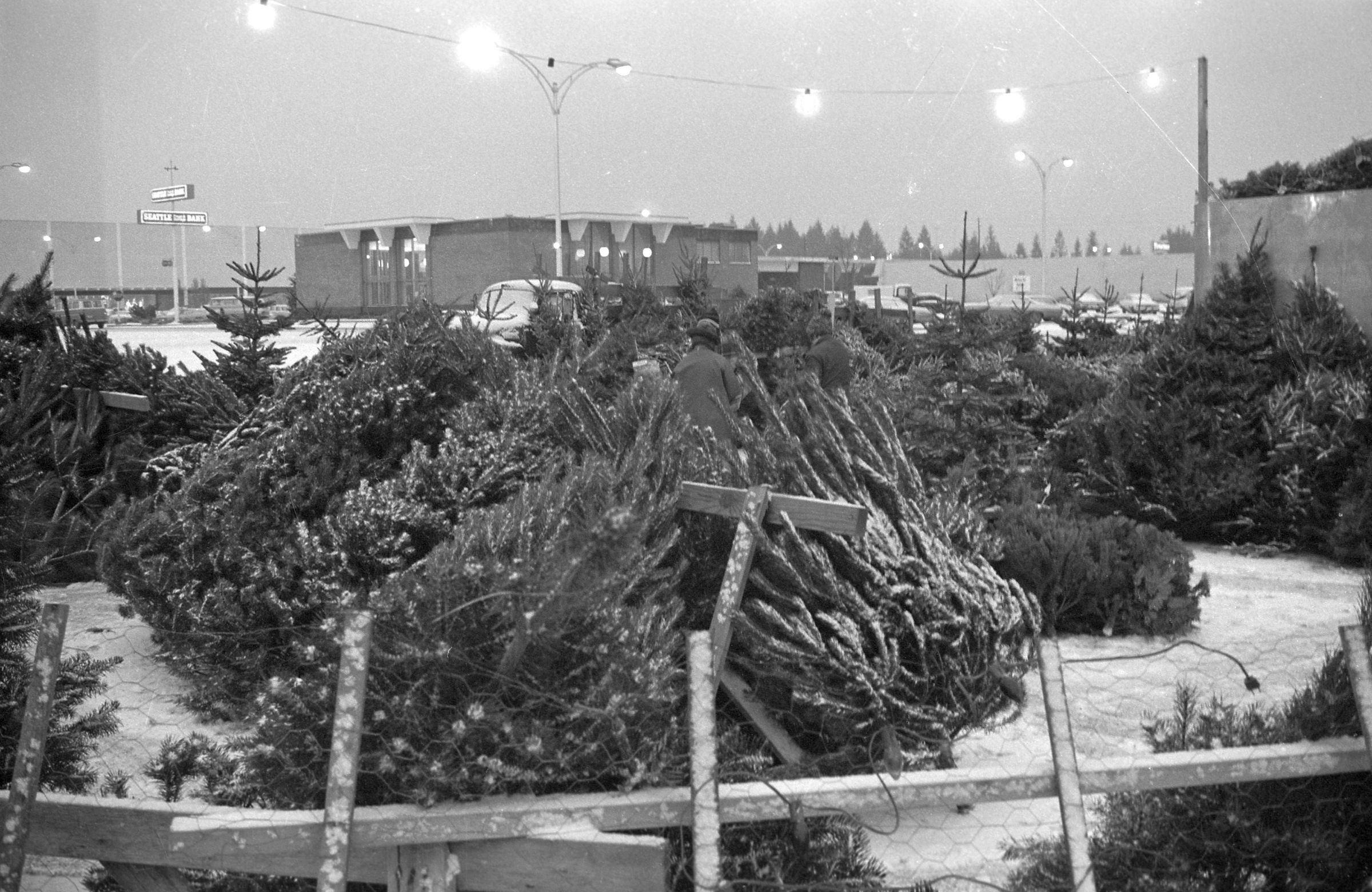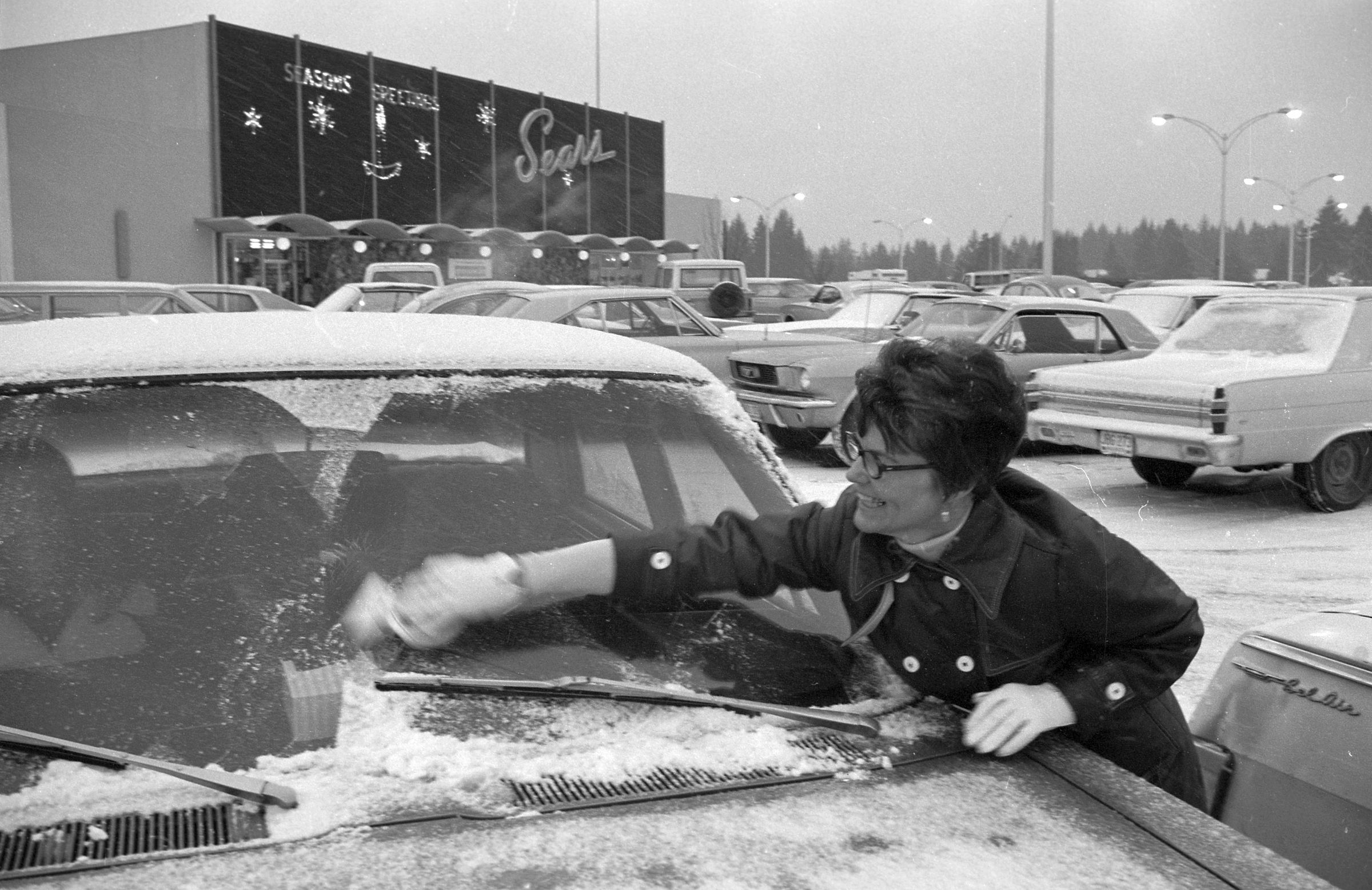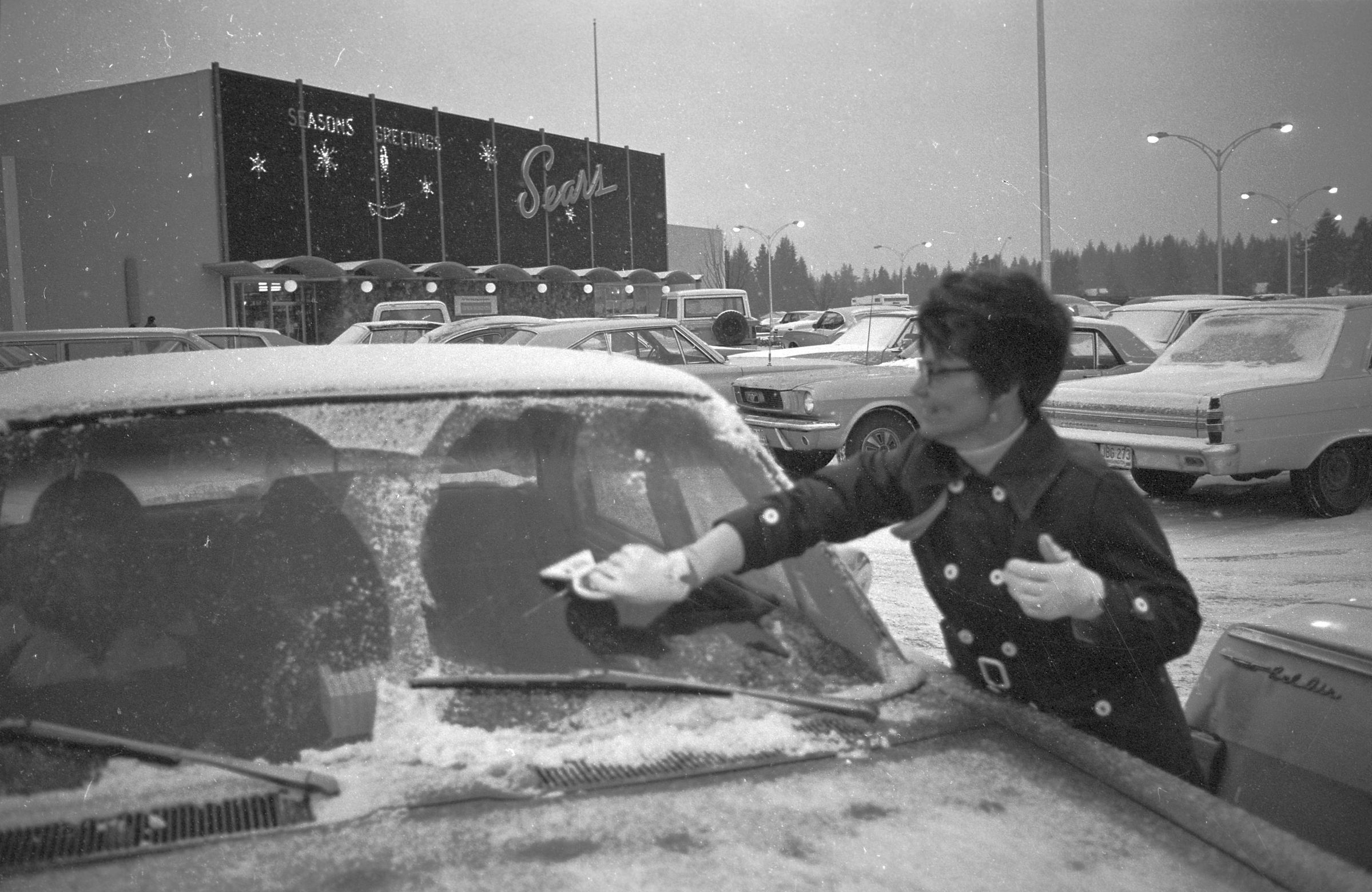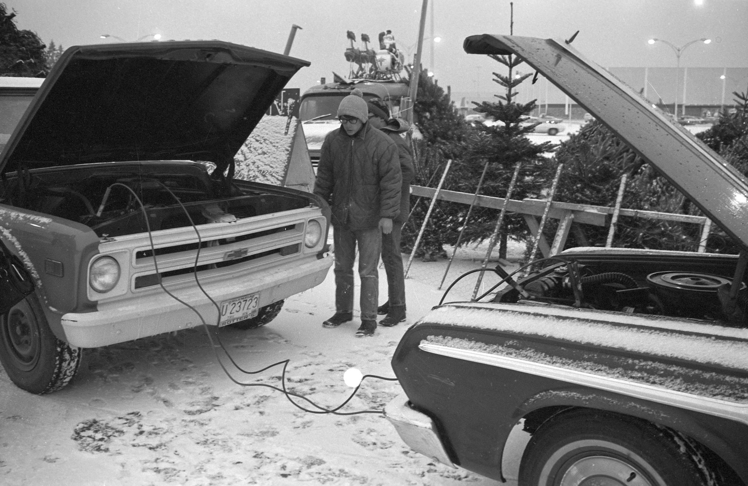 Winter, 1972. This black and white film negative strip bearing four images (images 13-16) was created for the Lacey Leader newspaper. These images show a woman clearing her car's windshield of snow, a man attempting to jumpstart a car or truck, and many cut Christmas trees.Made/Created