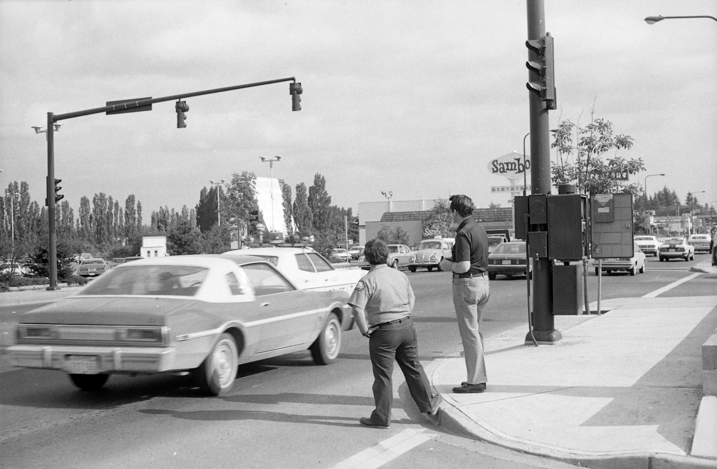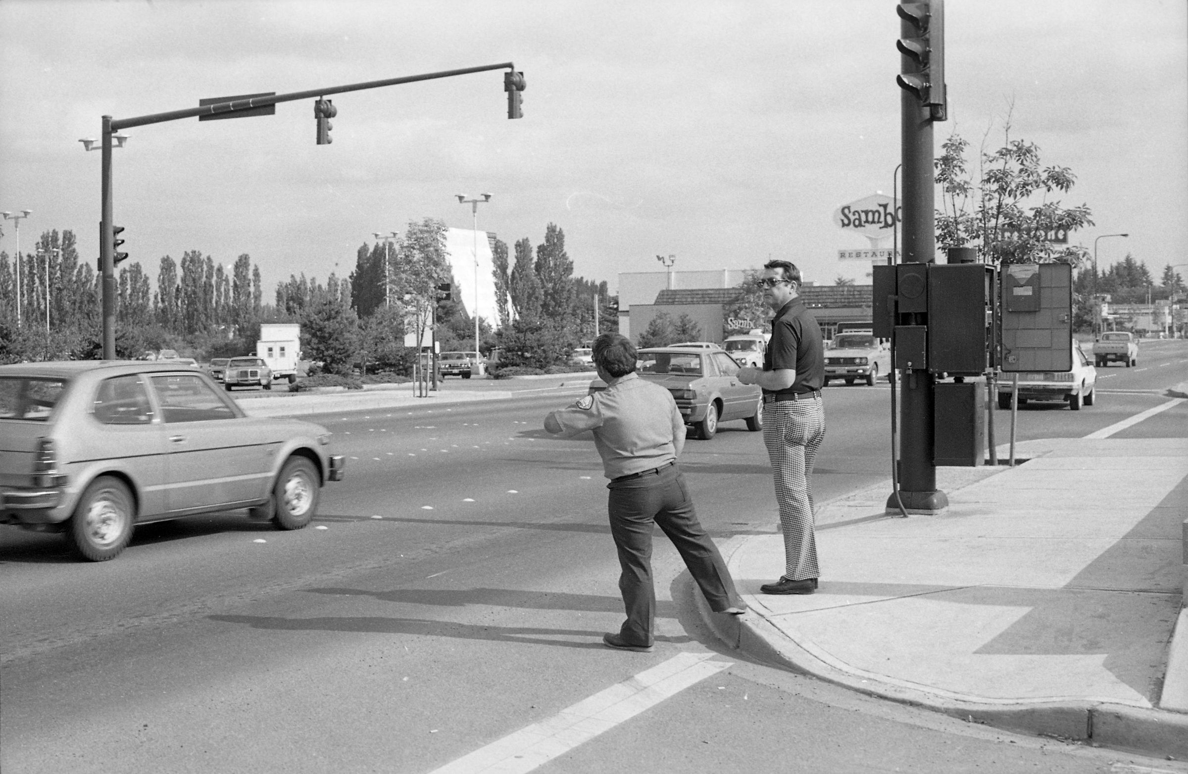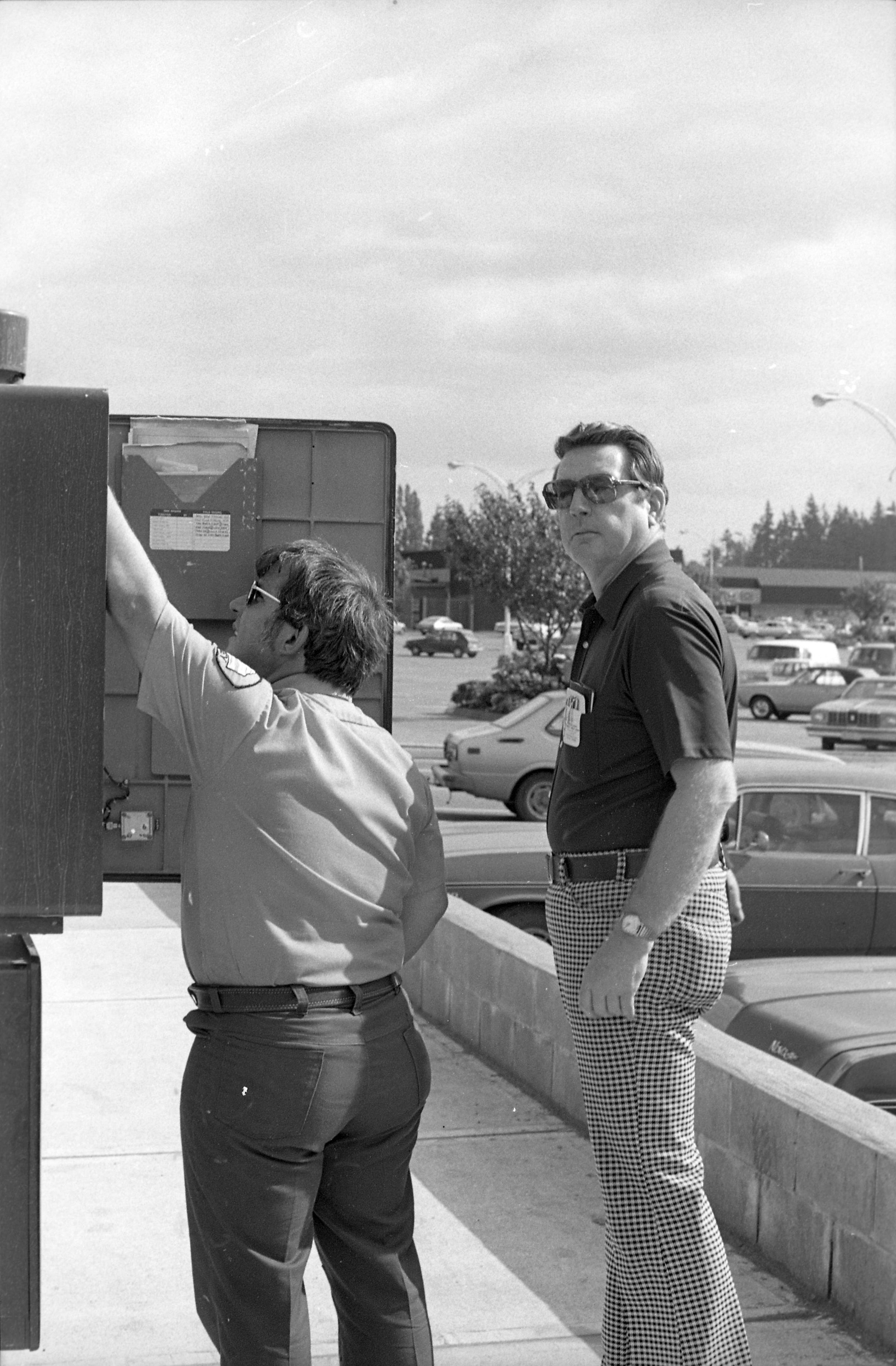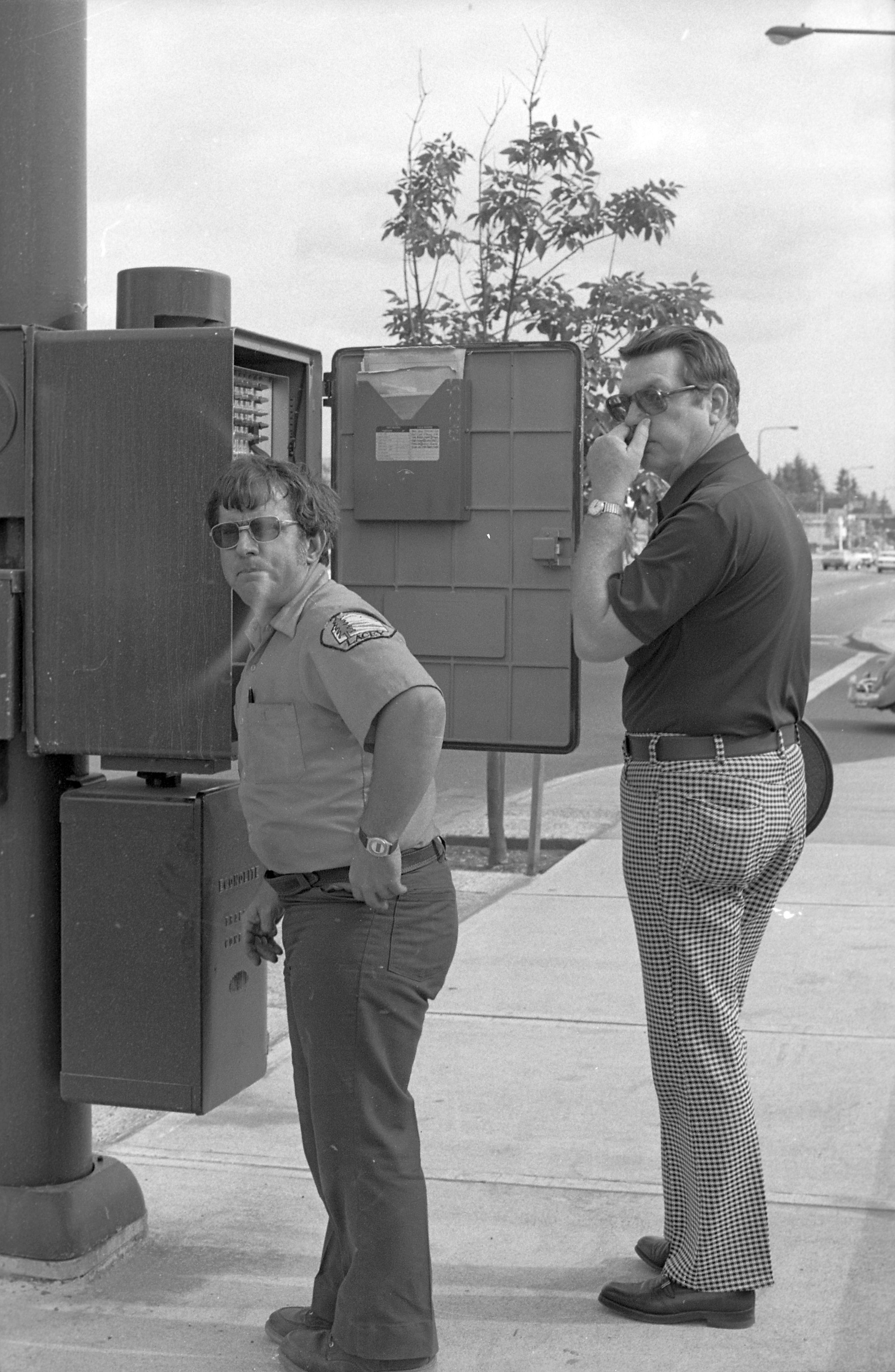 Budweiser Horse Team, unknown date. These two black and white film negative strips were created for the Lacey Leader newspaper. One strip holds five images (images 2-6) and one strip holds three images (images 11-13). These images show two men working with a control box for traffic lights at the corner of Sleater Kinney Road and 6th Avenue in Lacey, Washington; a dalmatian in a boom lift; and several Clydesdale horses hitched to a Budweiser beer wagon.Made/Created