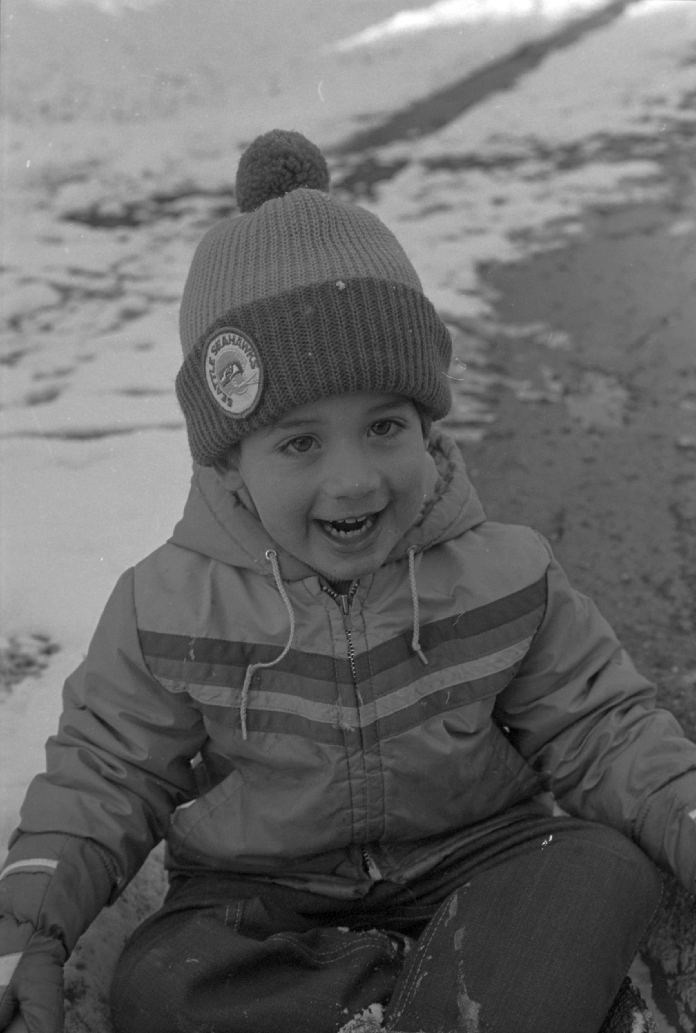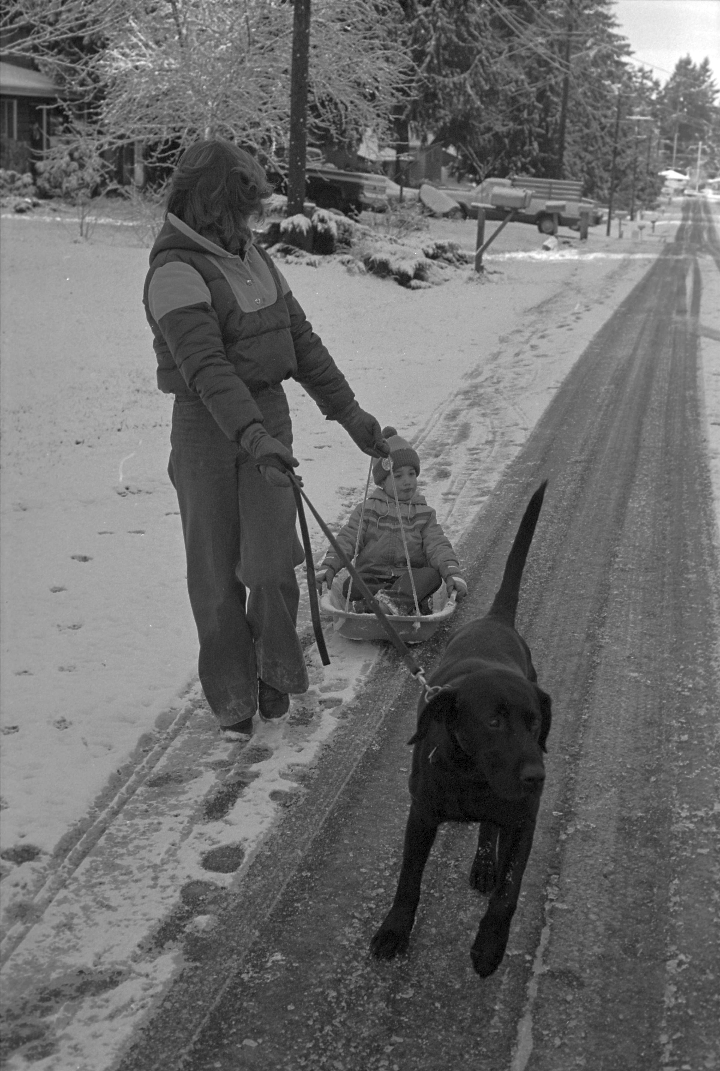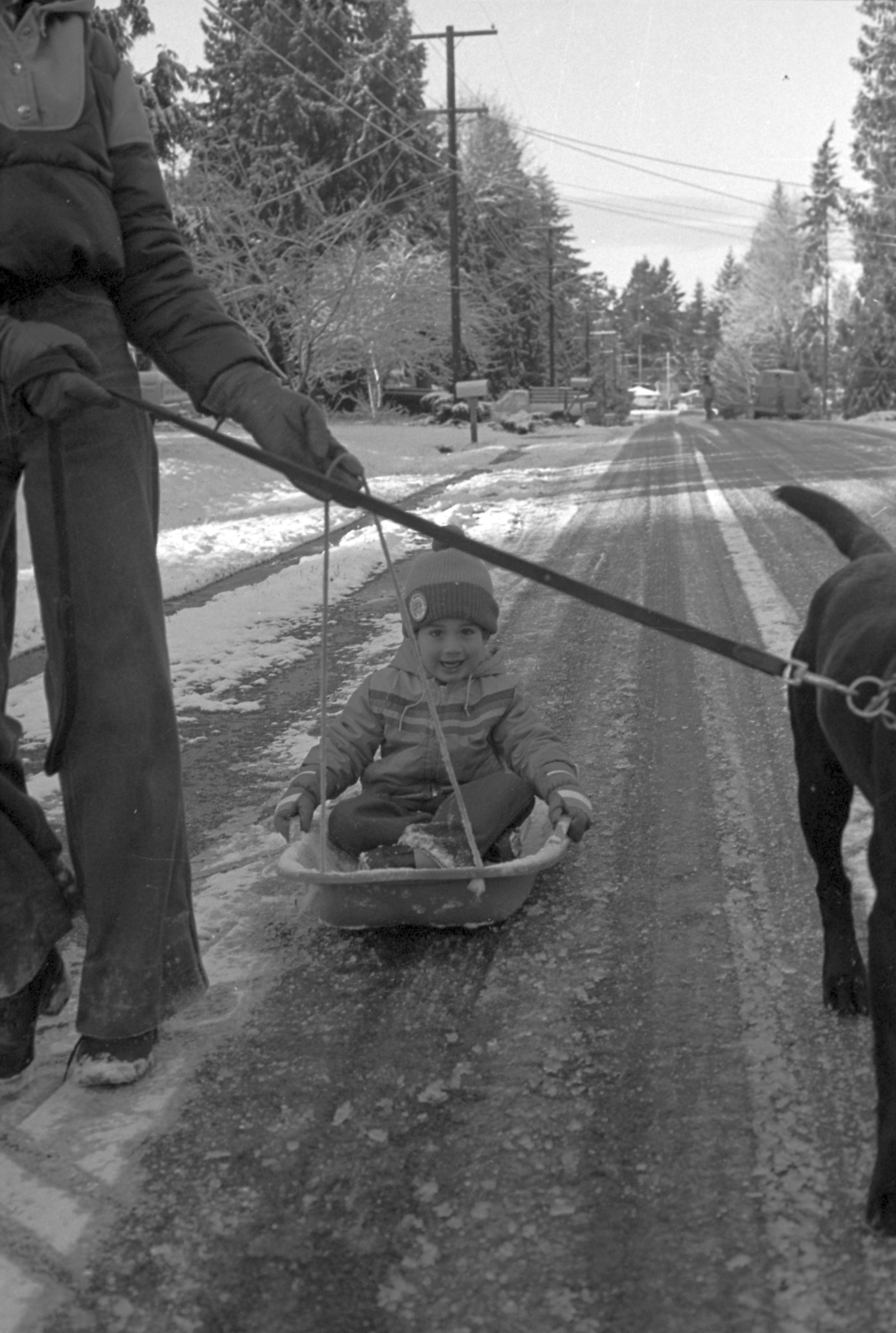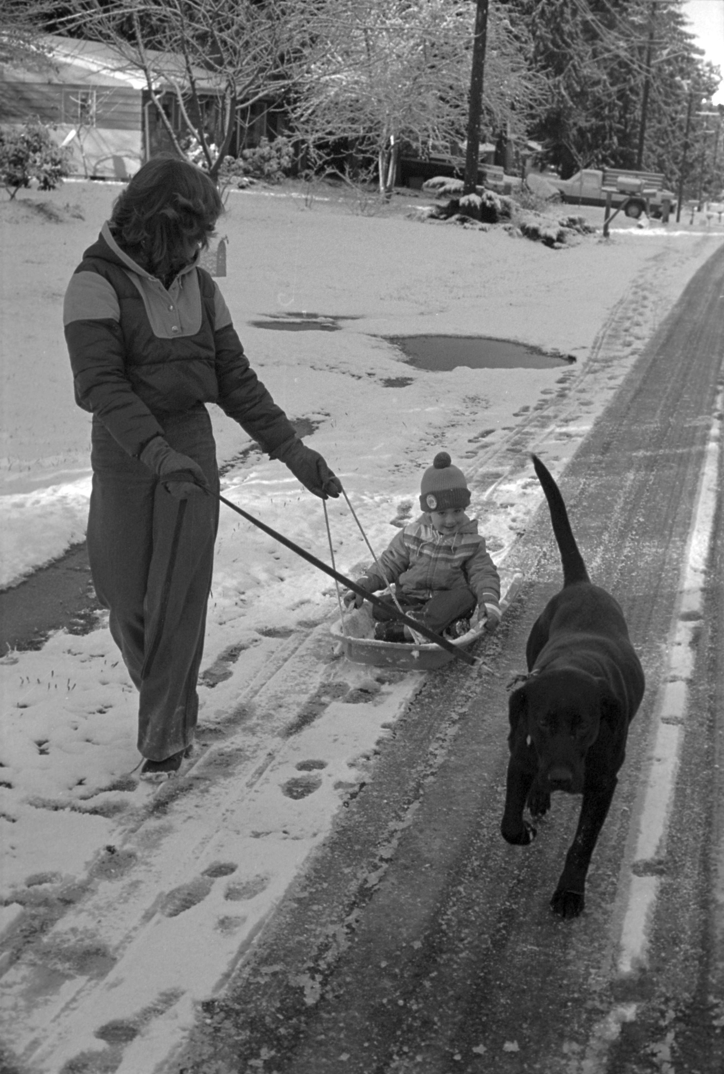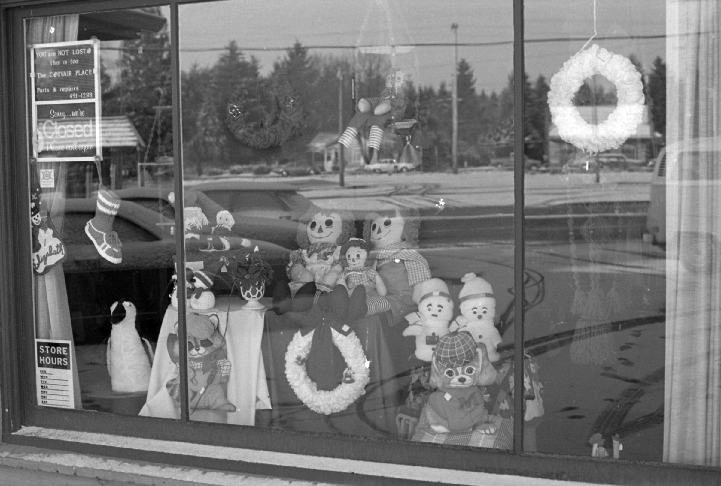 Lacey first snow, 1980. These two black and white film negative strips were created for the Lacey Leader newspaper. Both strips bear four images each (images 36-39 and 40-43). These images show various snow scenes and one Christmas-themed window display.Made/Created