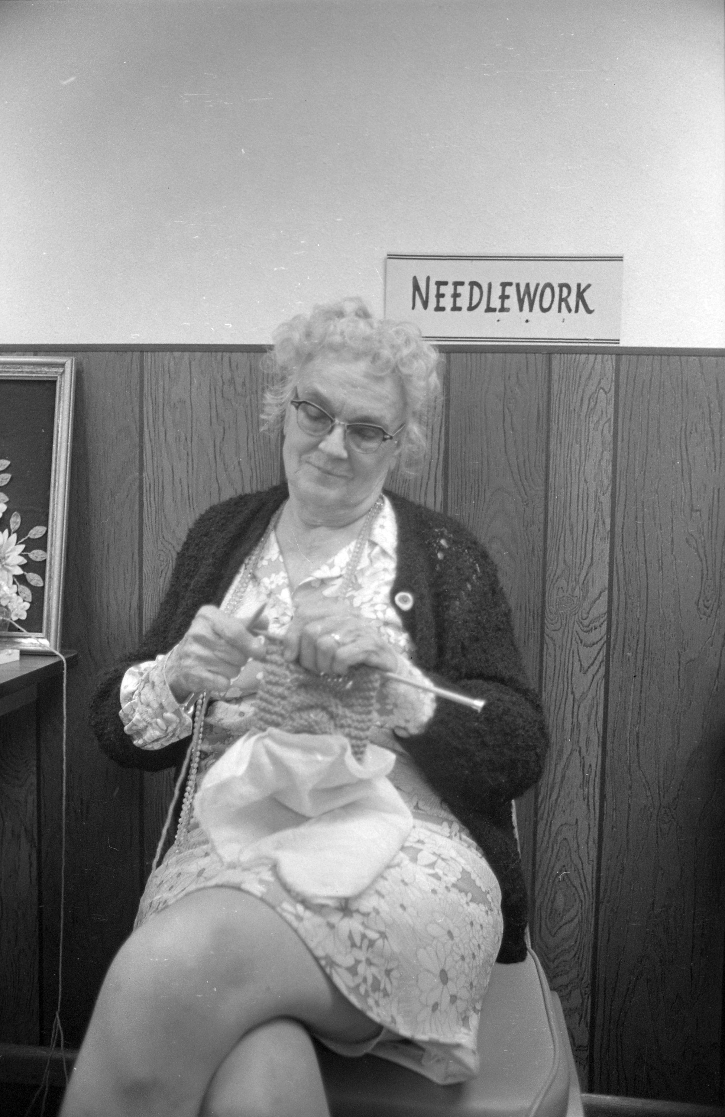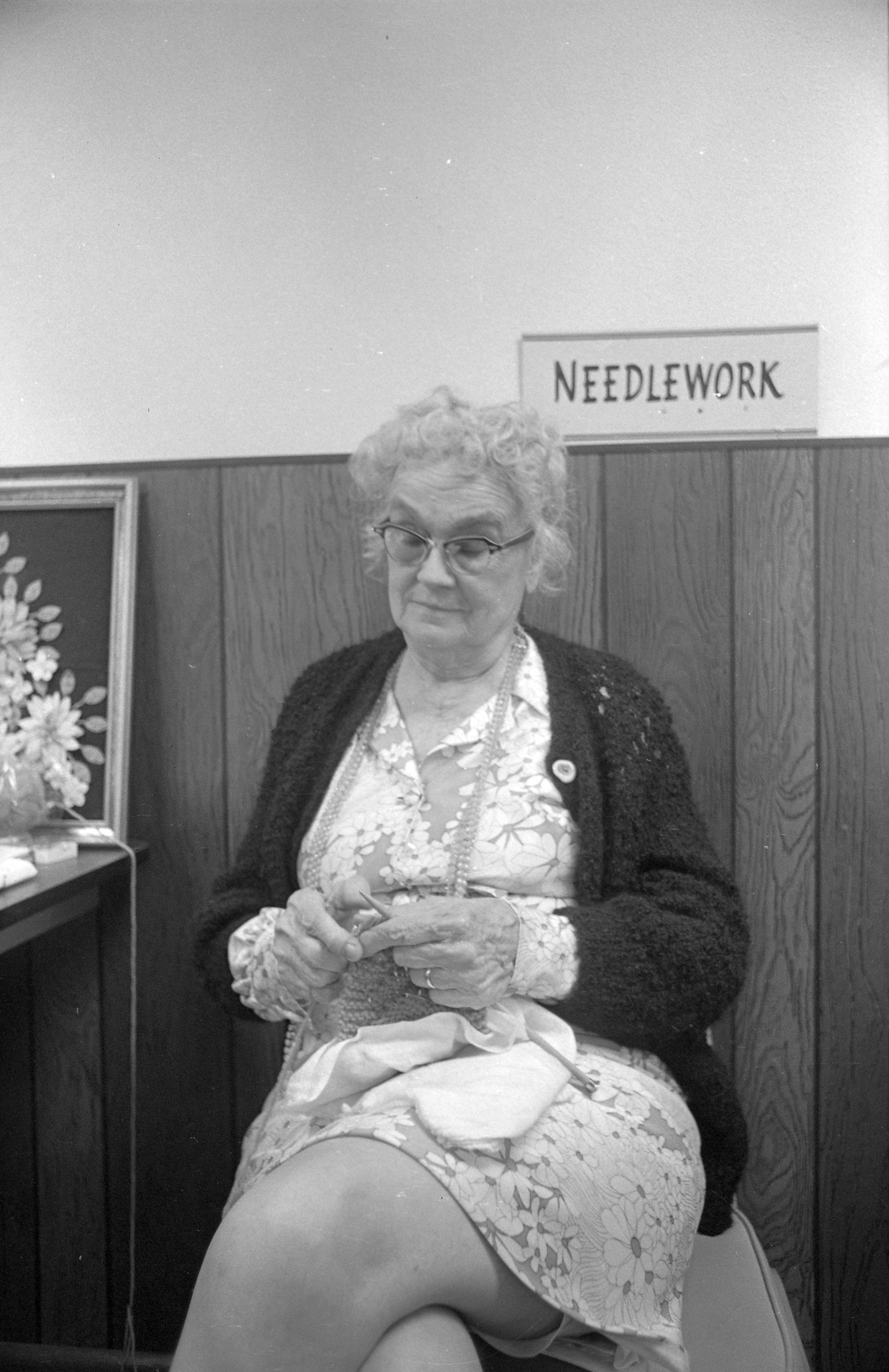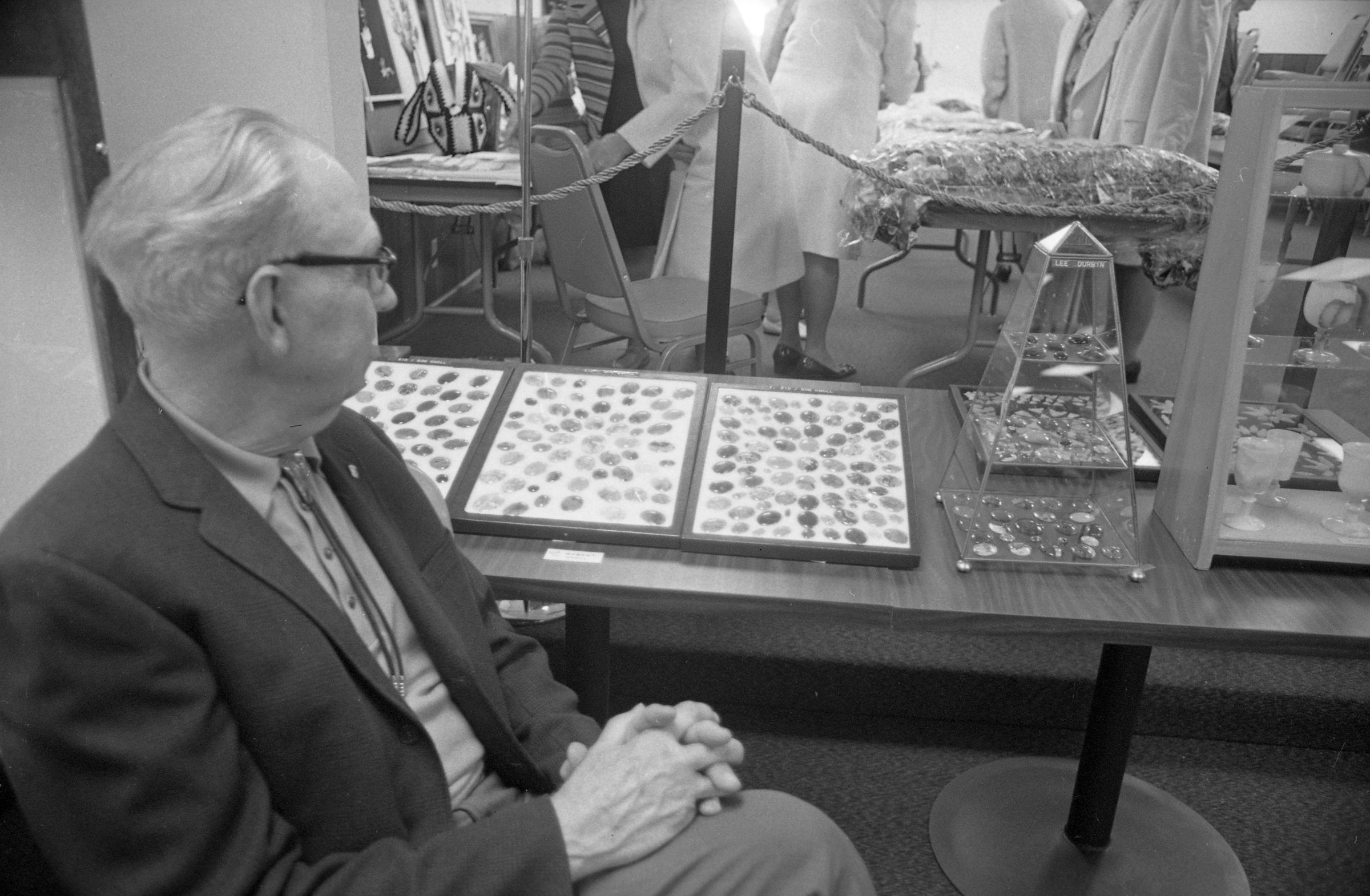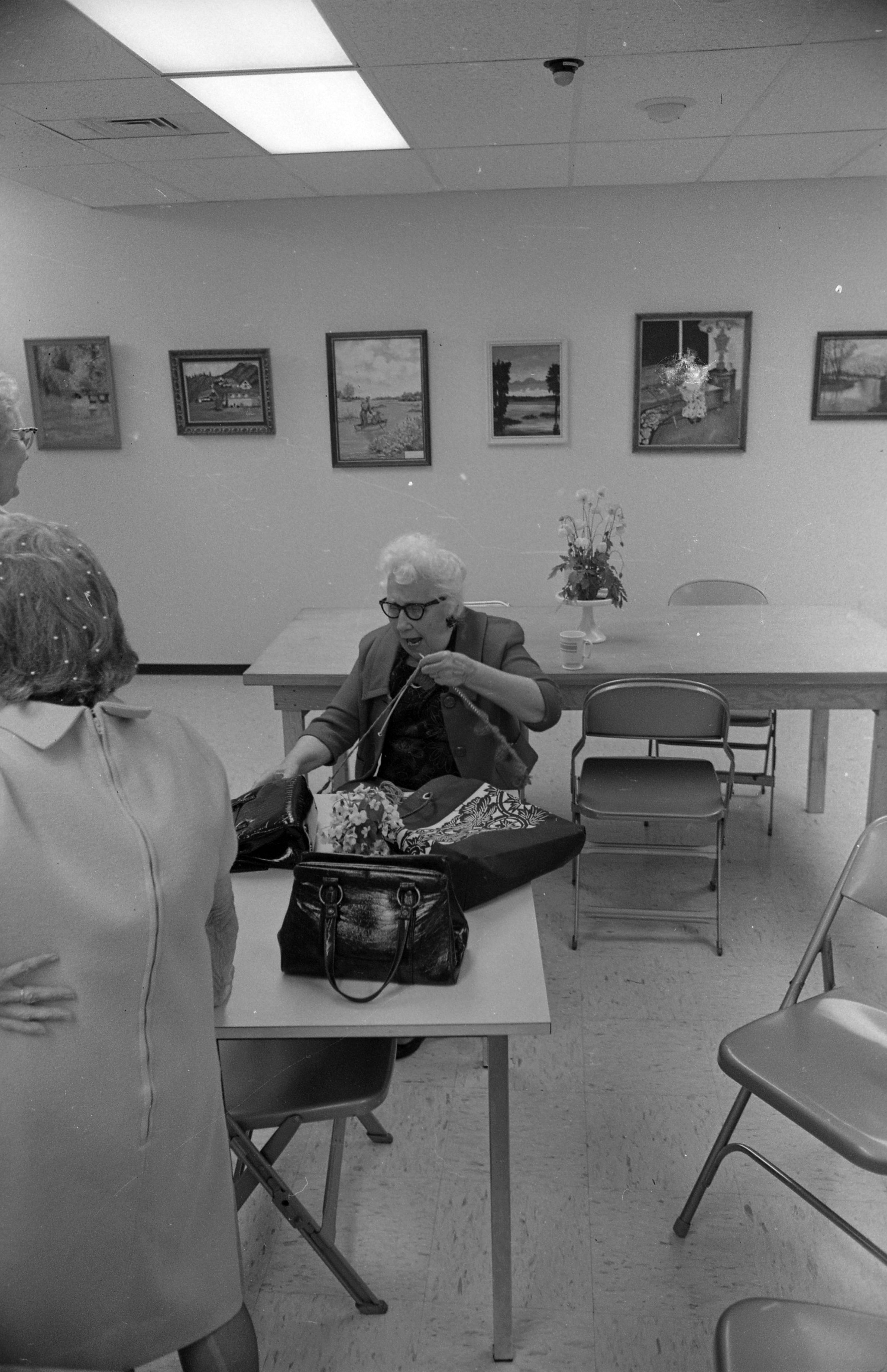 Panorama City Art Show, 1973. These eight strips of film negative strips were created for the Lacey Leader newspaper. Four strips bear five images each (images 1a-5a, 6a-10a, 4b-8b, and 40a-44a), two strips bear four images each (images 9c-12c and 17c-20c) and two strips bear three images each (images 1d-3d and 21d-23d). More than one roll of film was used when originally capturing these images, so there are two different images physically numbered with the numerals 1 through 10. All of these images show various images of art pieces or individuals either posing with or looking at a number of displays of various arts and crafts pieces.