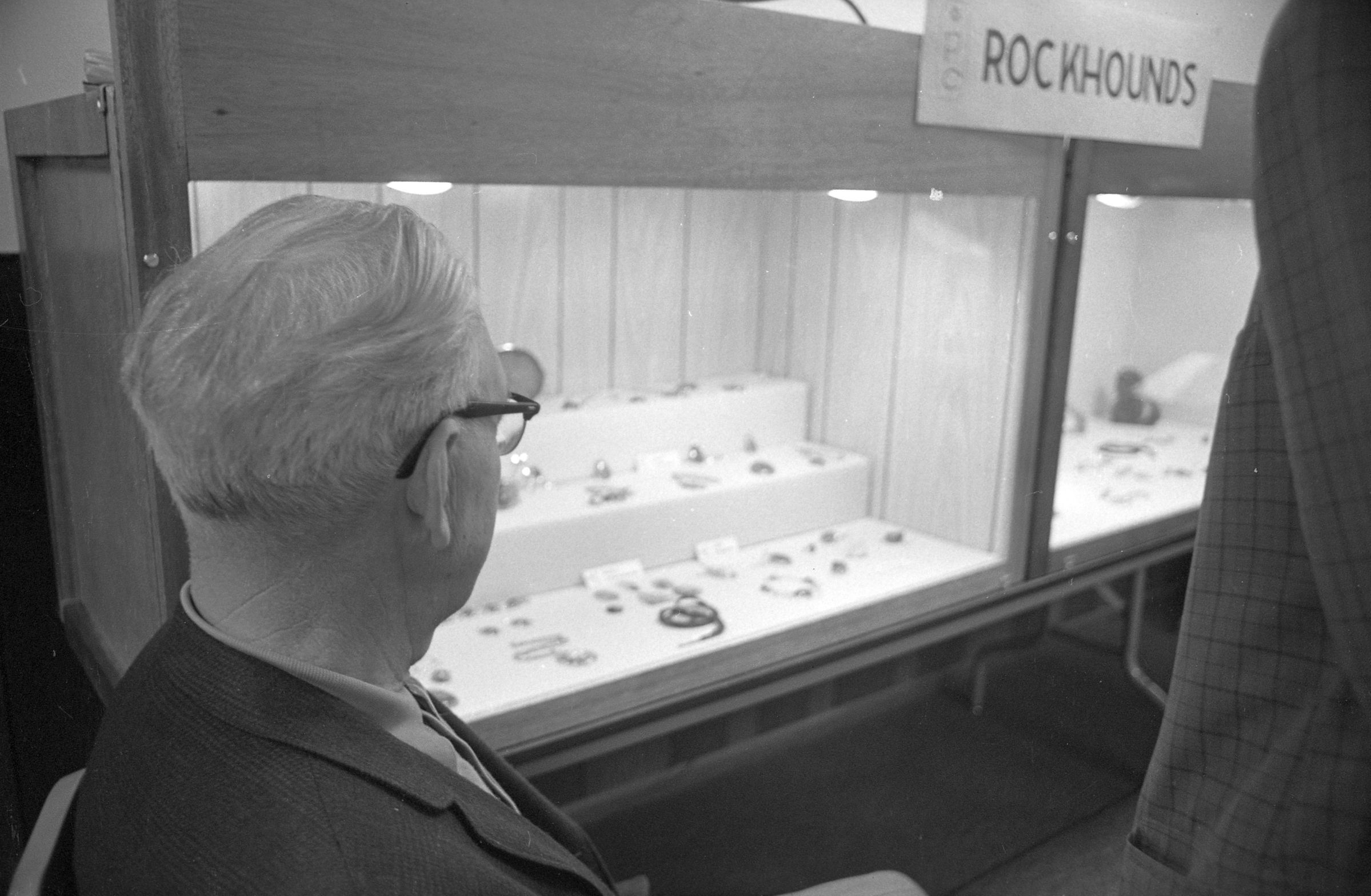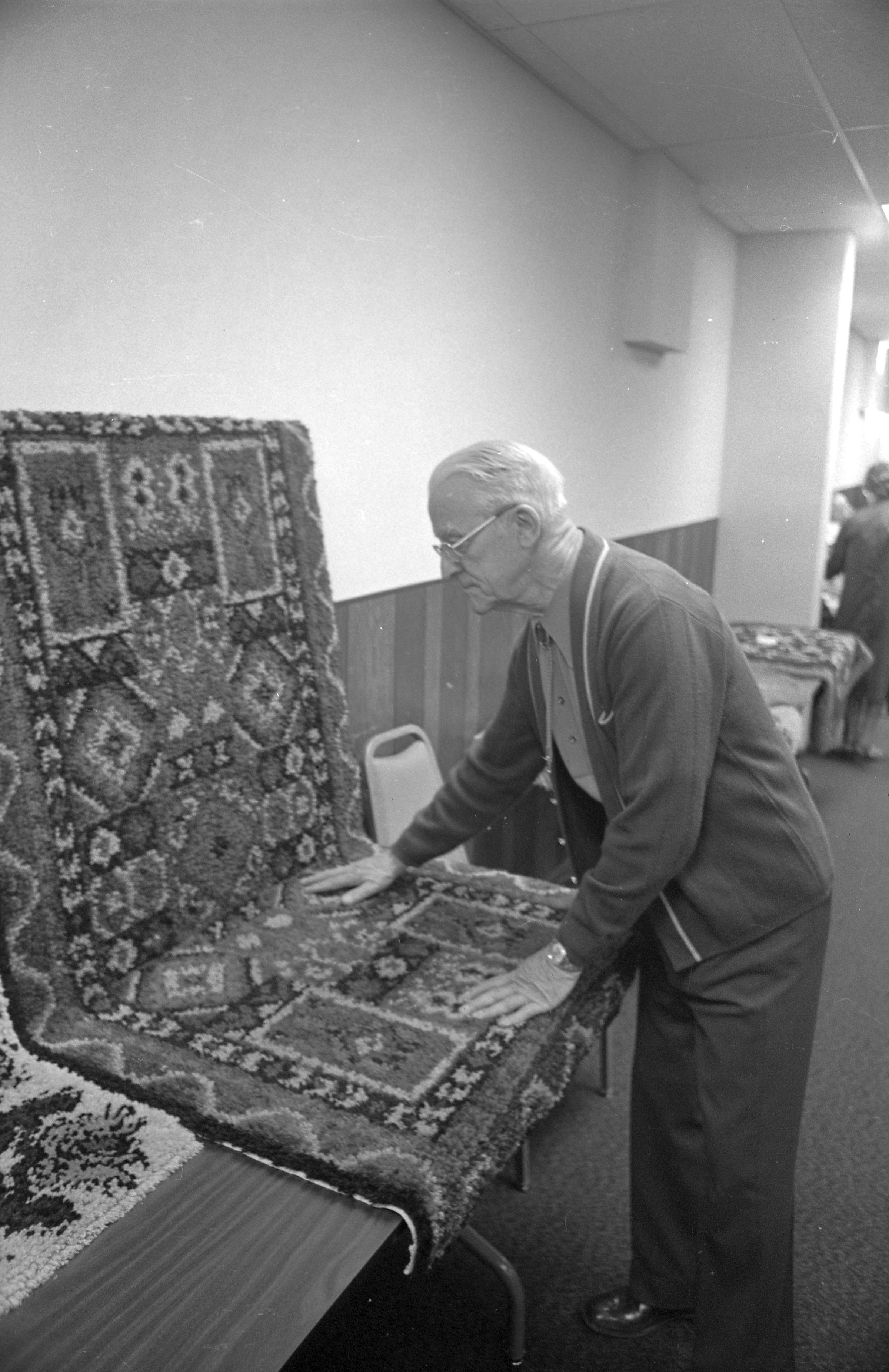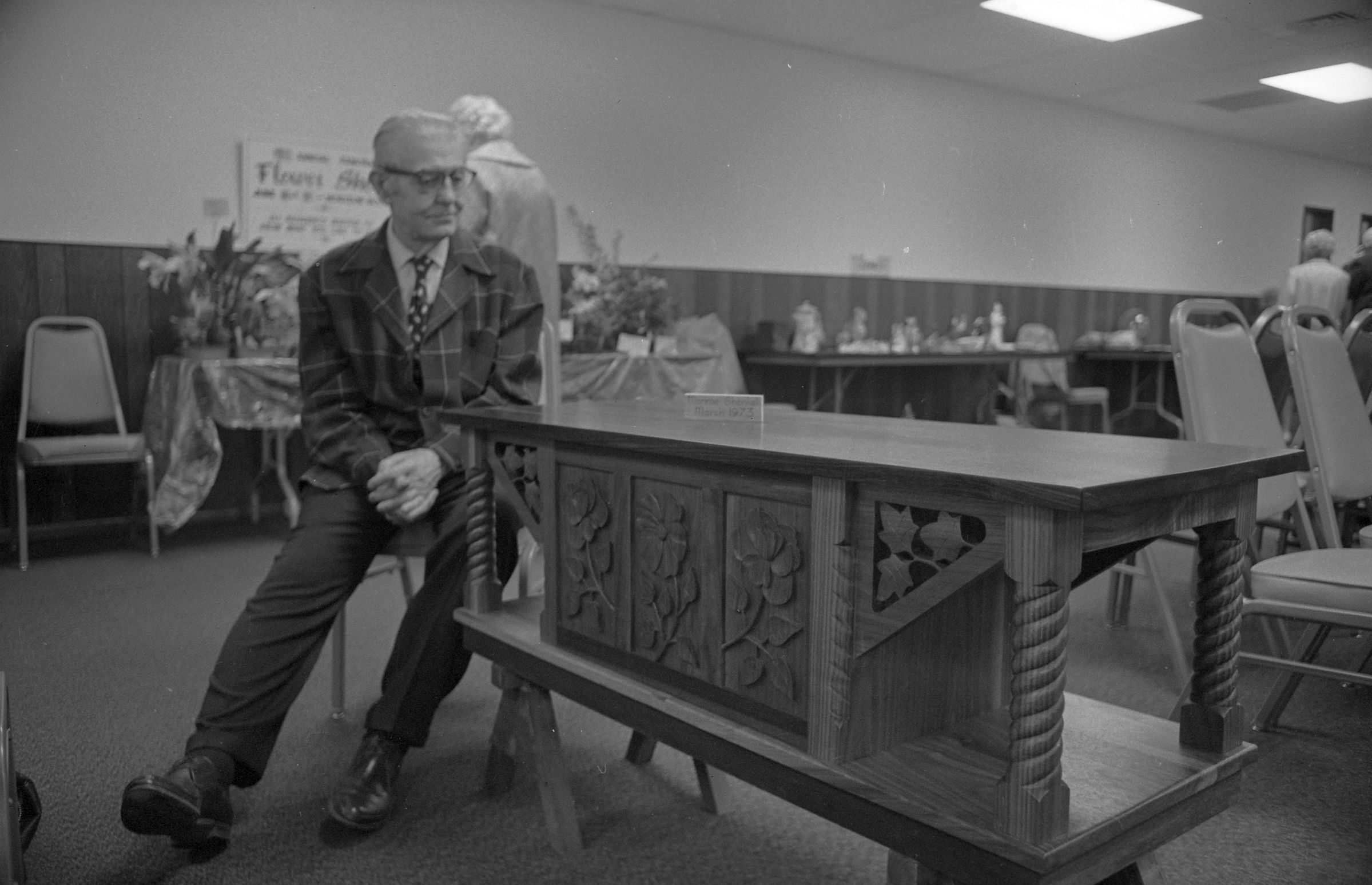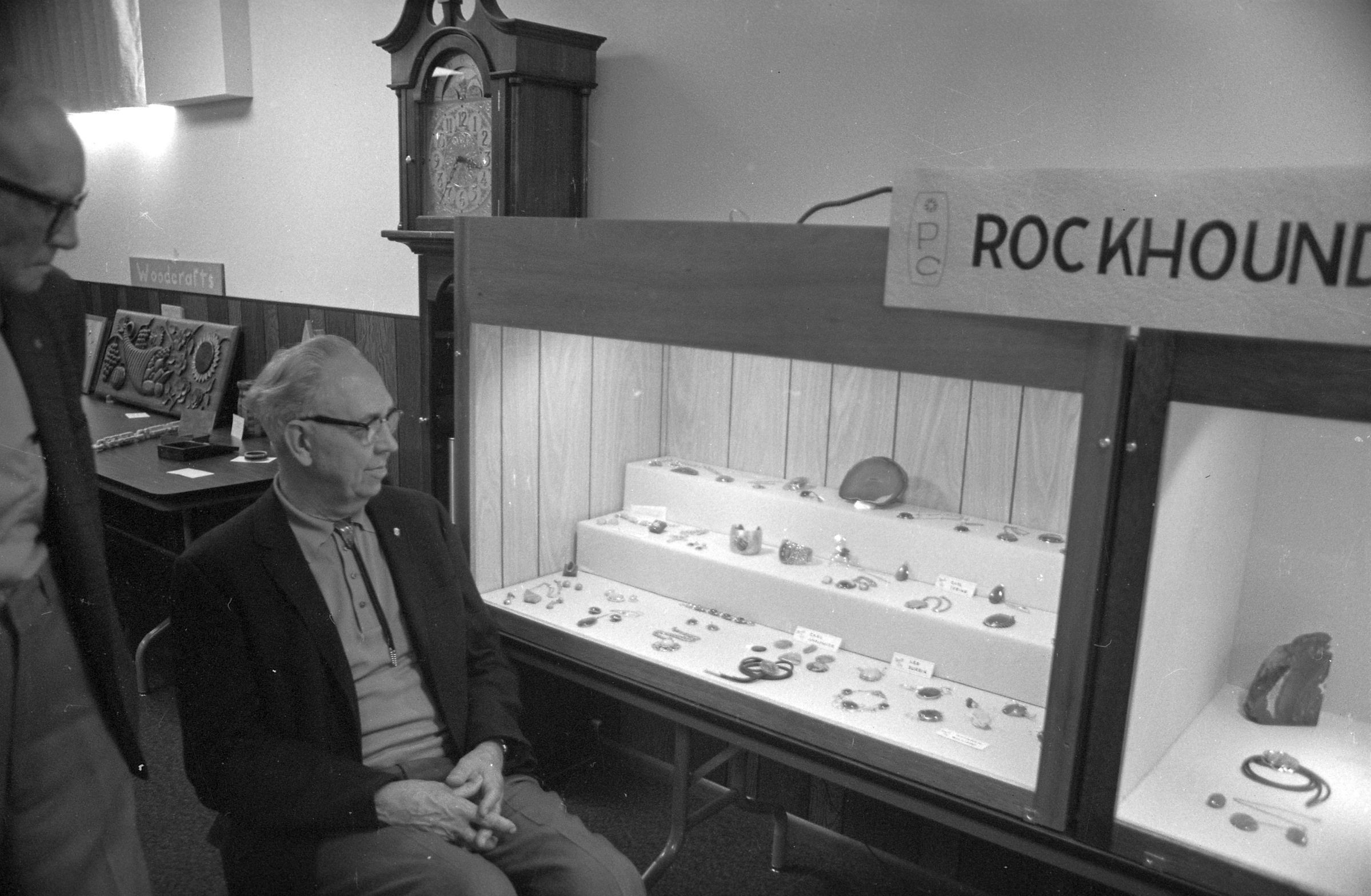 Panorama City Art Show, 1973. These eight strips of film negative strips were created for the Lacey Leader newspaper. Four strips bear five images each (images 1a-5a, 6a-10a, 4b-8b, and 40a-44a), two strips bear four images each (images 9c-12c and 17c-20c) and two strips bear three images each (images 1d-3d and 21d-23d). More than one roll of film was used when originally capturing these images, so there are two different images physically numbered with the numerals 1 through 10. All of these images show various images of art pieces or individuals either posing with or looking at a number of displays of various arts and crafts pieces.
