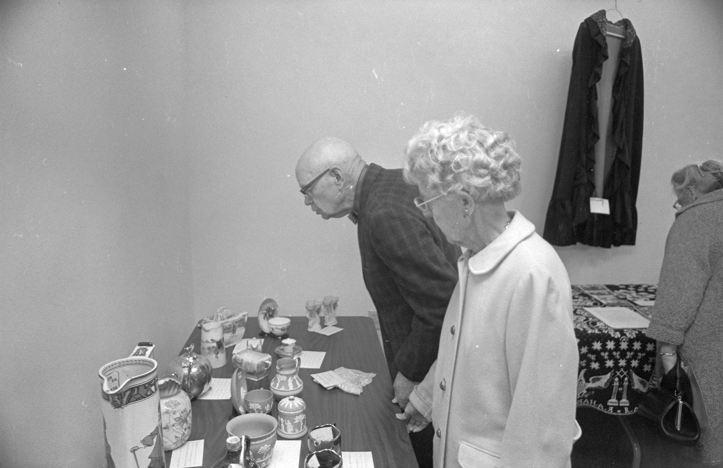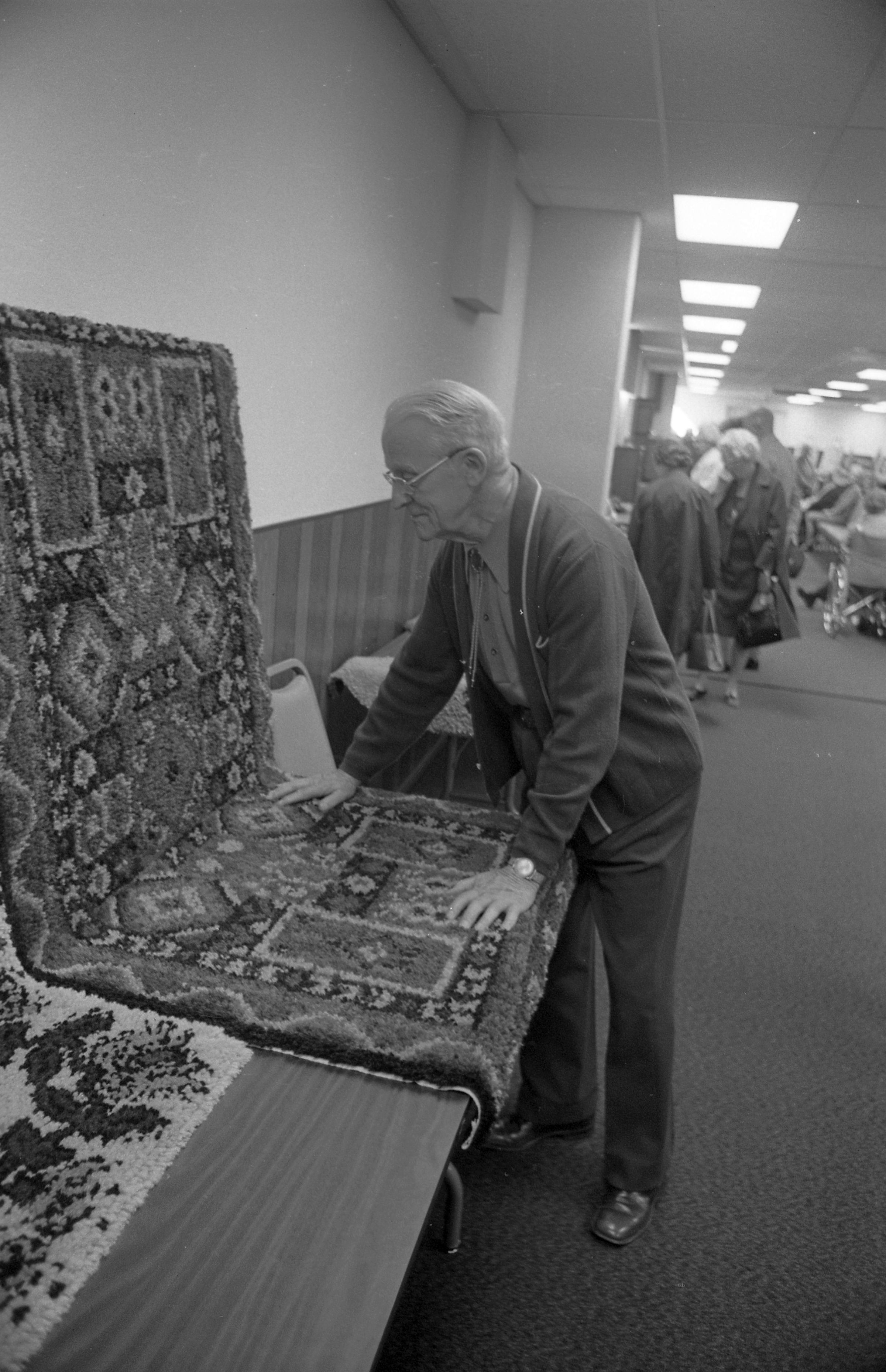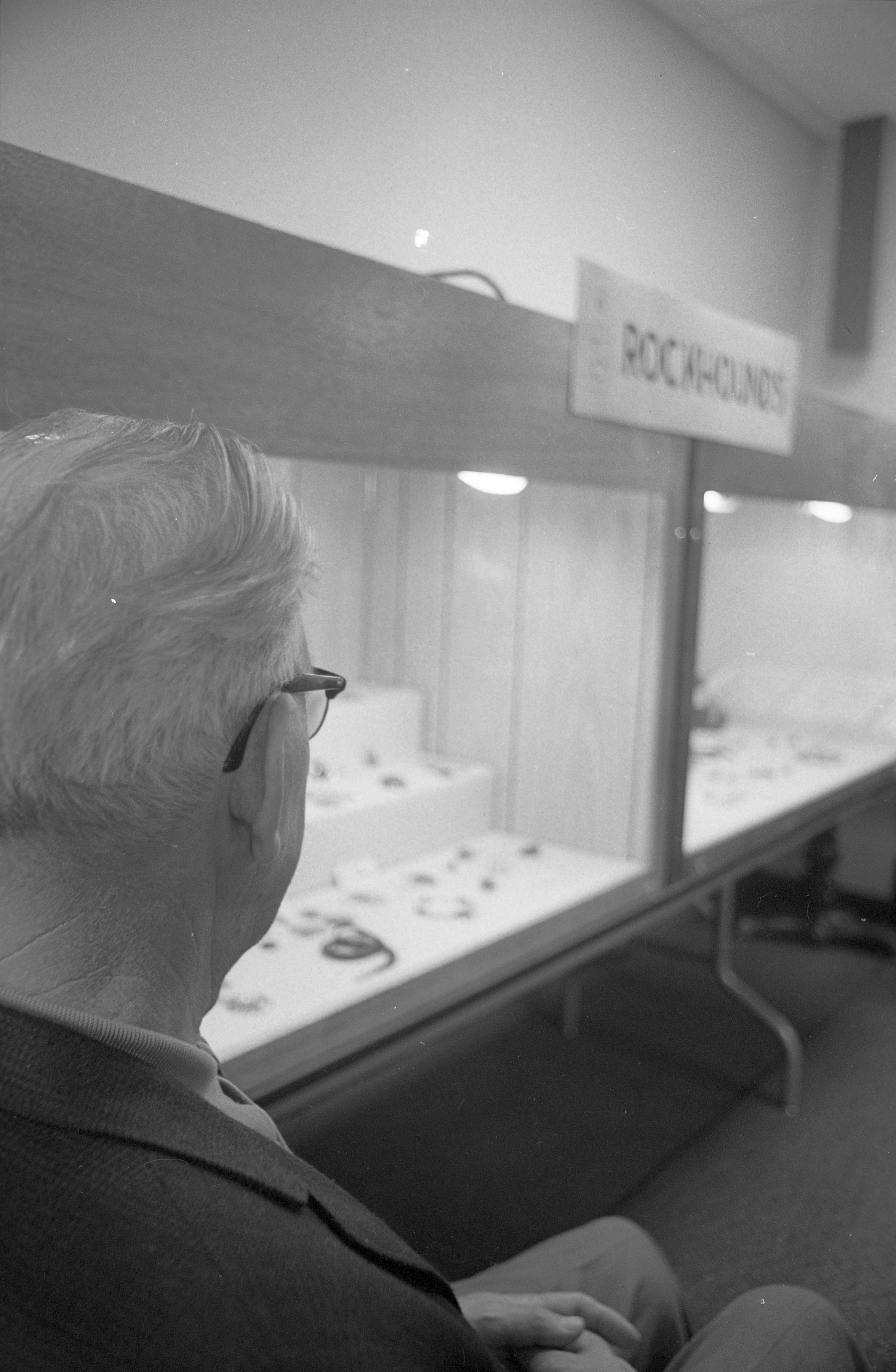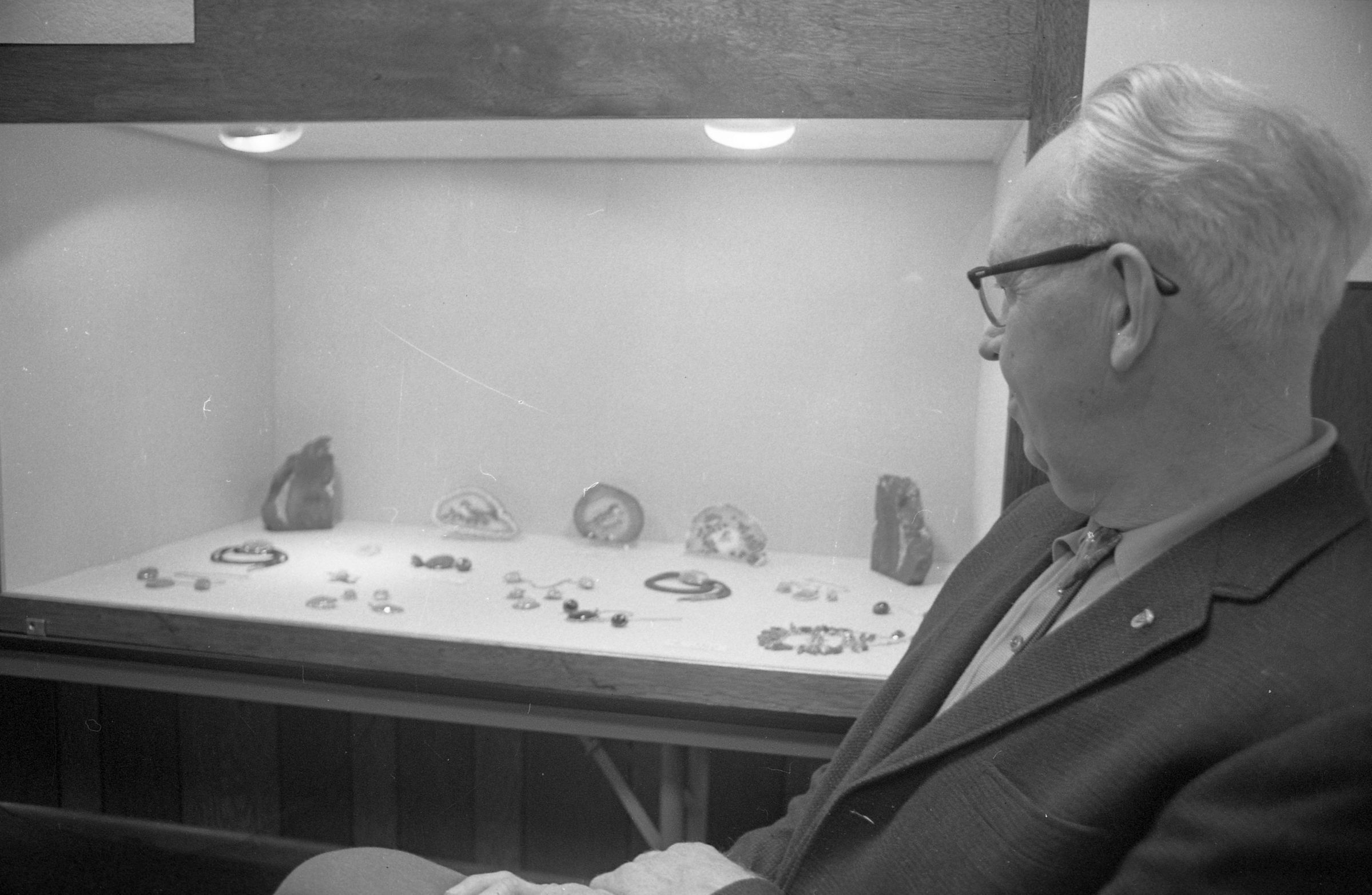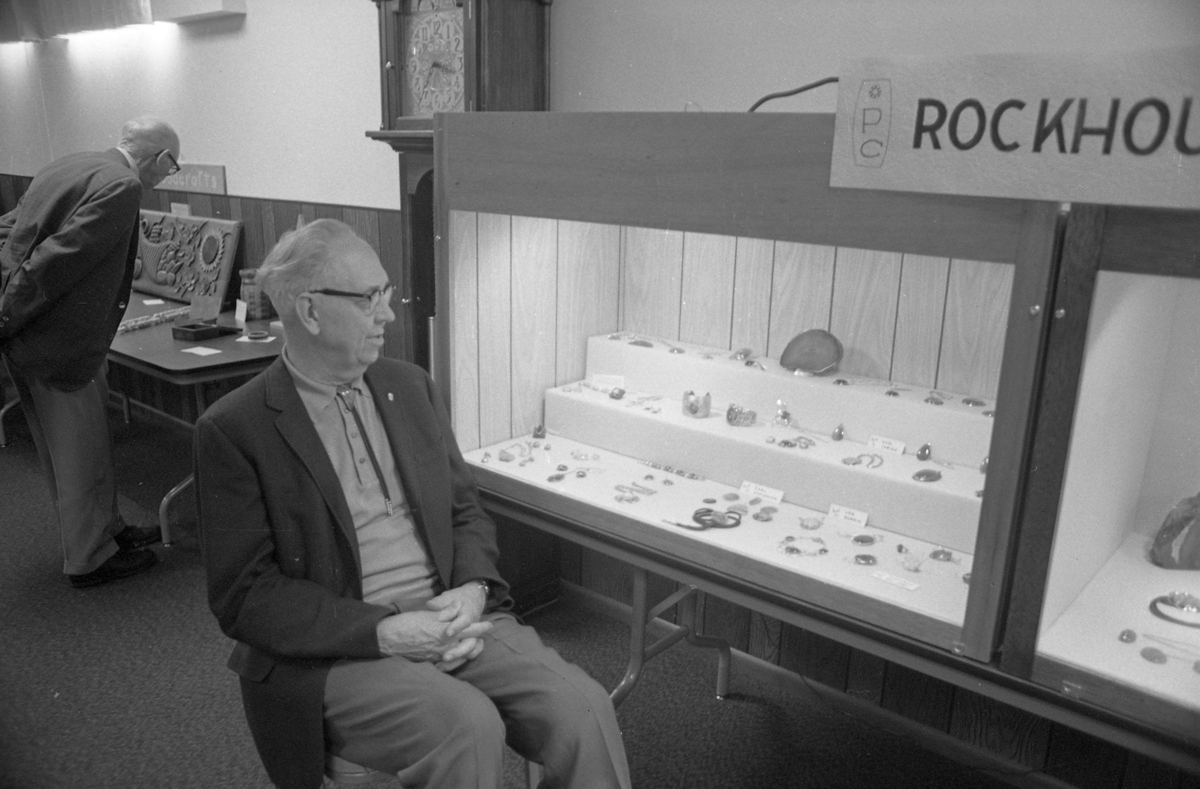 Panorama City Art Show, 1973. These eight strips of film negative strips were created for the Lacey Leader newspaper. Four strips bear five images each (images 1a-5a, 6a-10a, 4b-8b, and 40a-44a), two strips bear four images each (images 9c-12c and 17c-20c) and two strips bear three images each (images 1d-3d and 21d-23d). More than one roll of film was used when originally capturing these images, so there are two different images physically numbered with the numerals 1 through 10. All of these images show various images of art pieces or individuals either posing with or looking at a number of displays of various arts and crafts pieces.