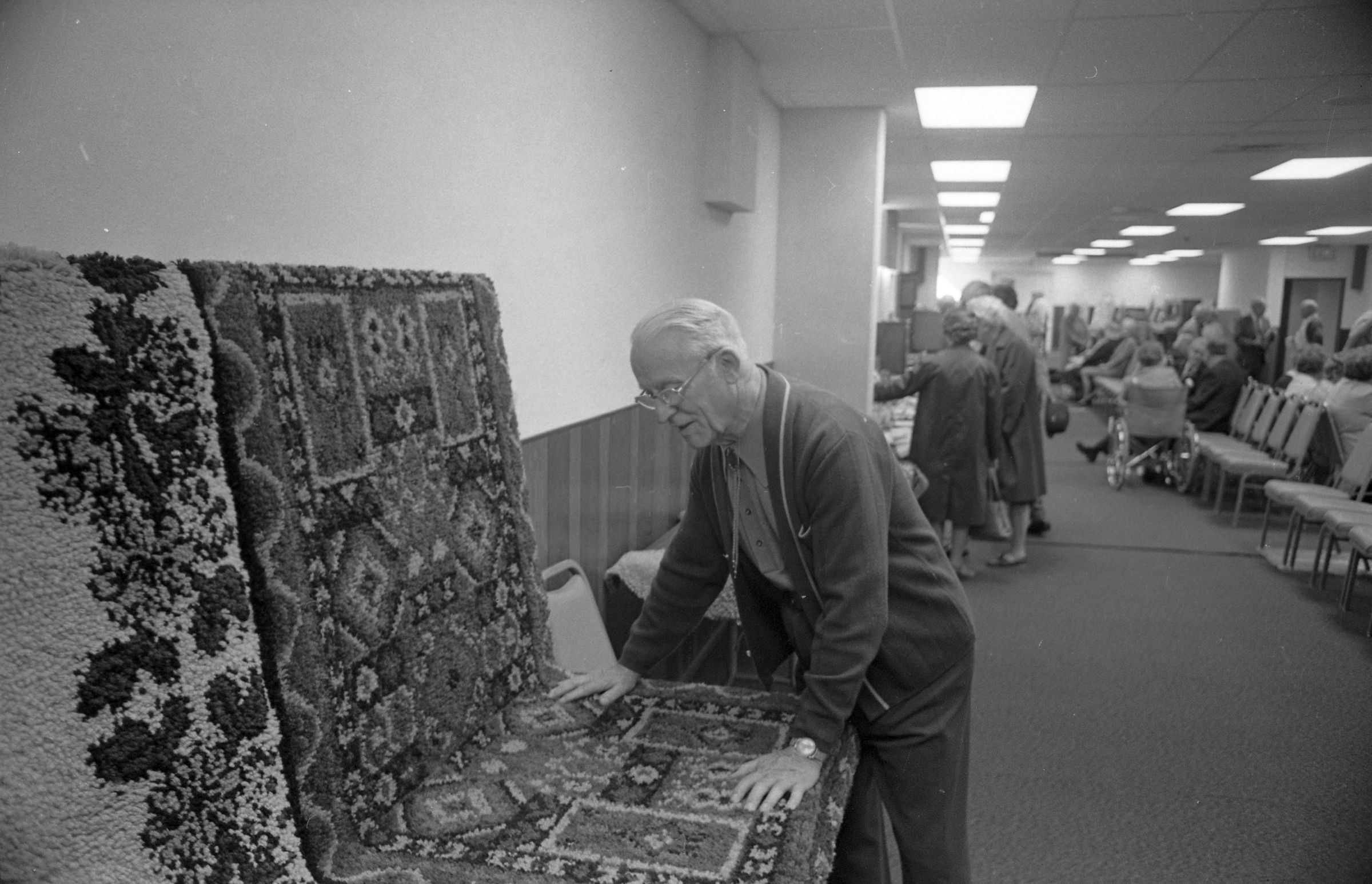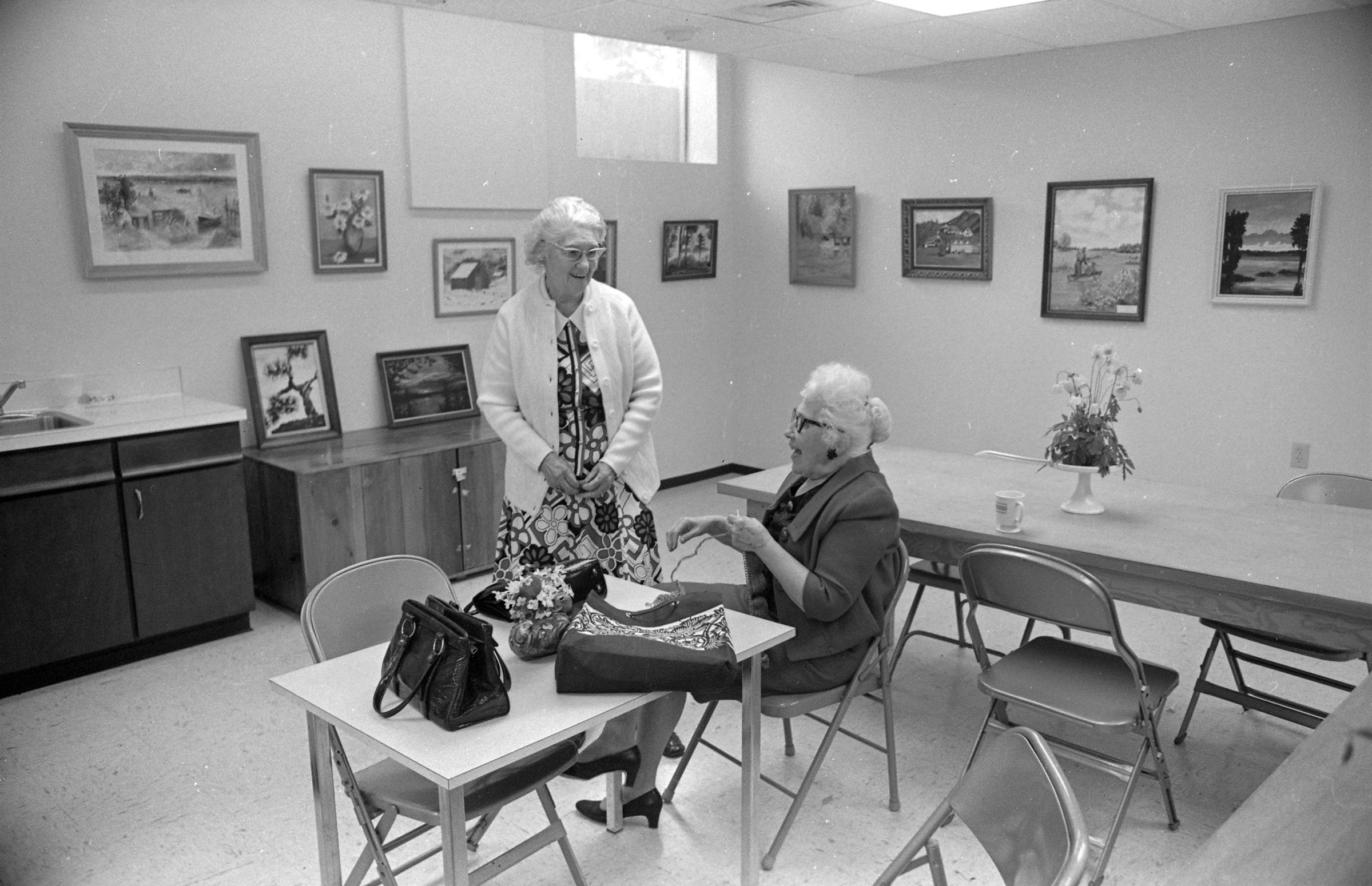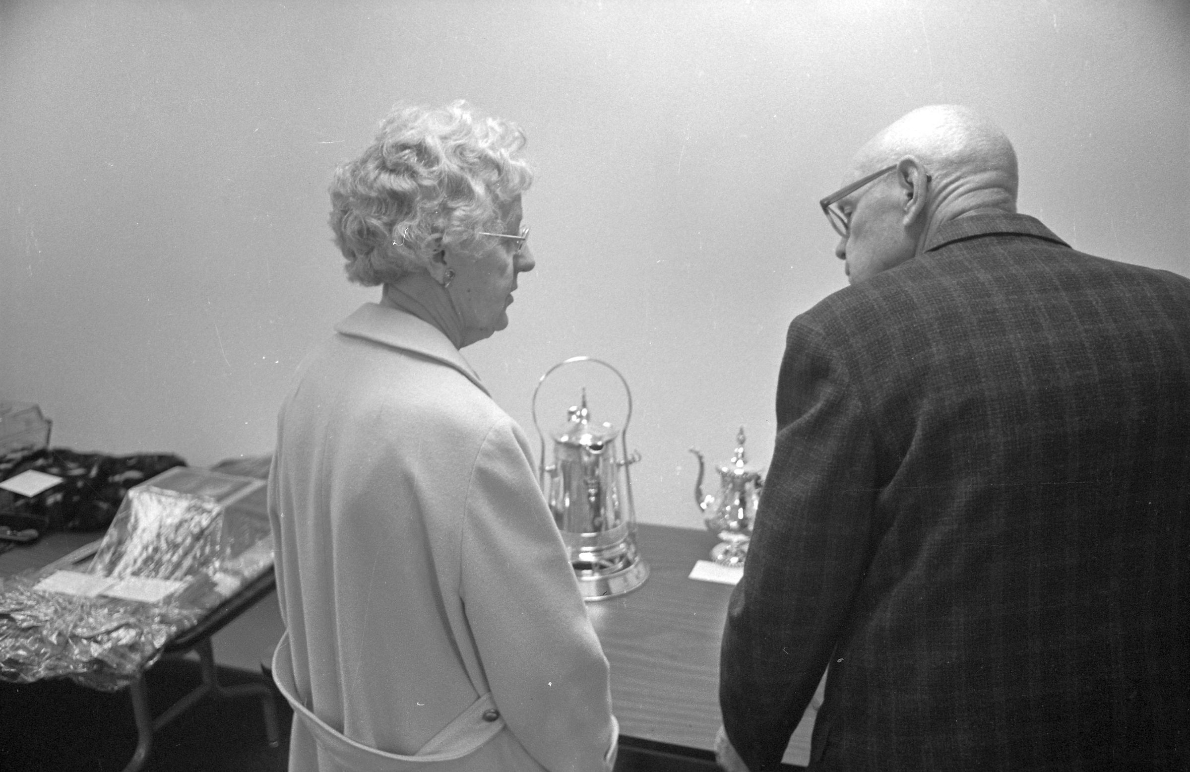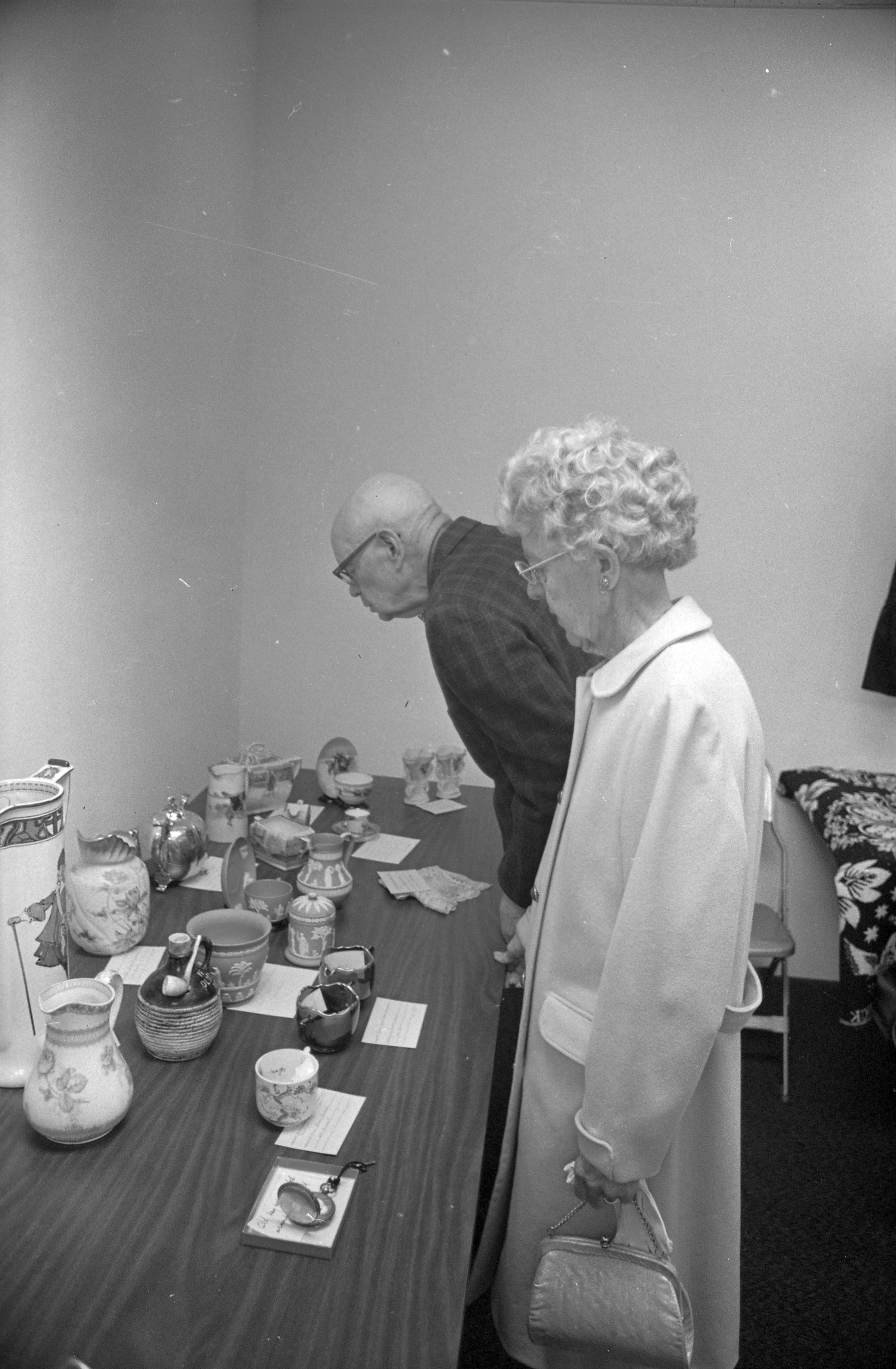Panorama City Art Show, 1973. These eight strips of film negative strips were created for the Lacey Leader newspaper. Four strips bear five images each (images 1a-5a, 6a-10a, 4b-8b, and 40a-44a), two strips bear four images each (images 9c-12c and 17c-20c) and two strips bear three images each (images 1d-3d and 21d-23d). More than one roll of film was used when originally capturing these images, so there are two different images physically numbered with the numerals 1 through 10. All of these images show various images of art pieces or individuals either posing with or looking at a number of displays of various arts and crafts pieces.