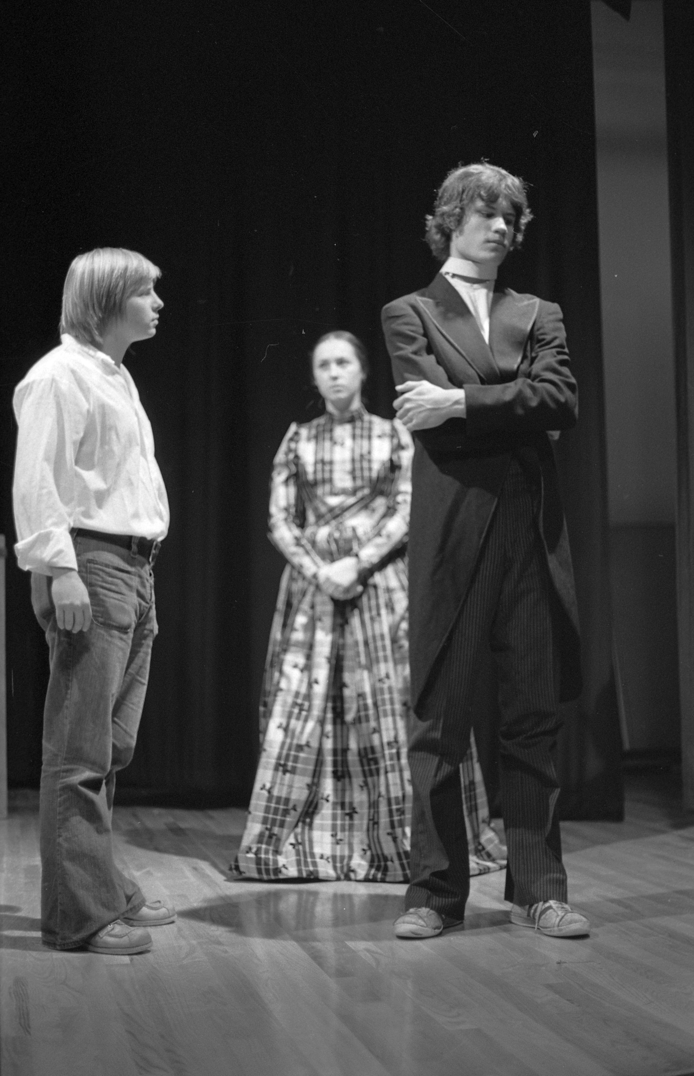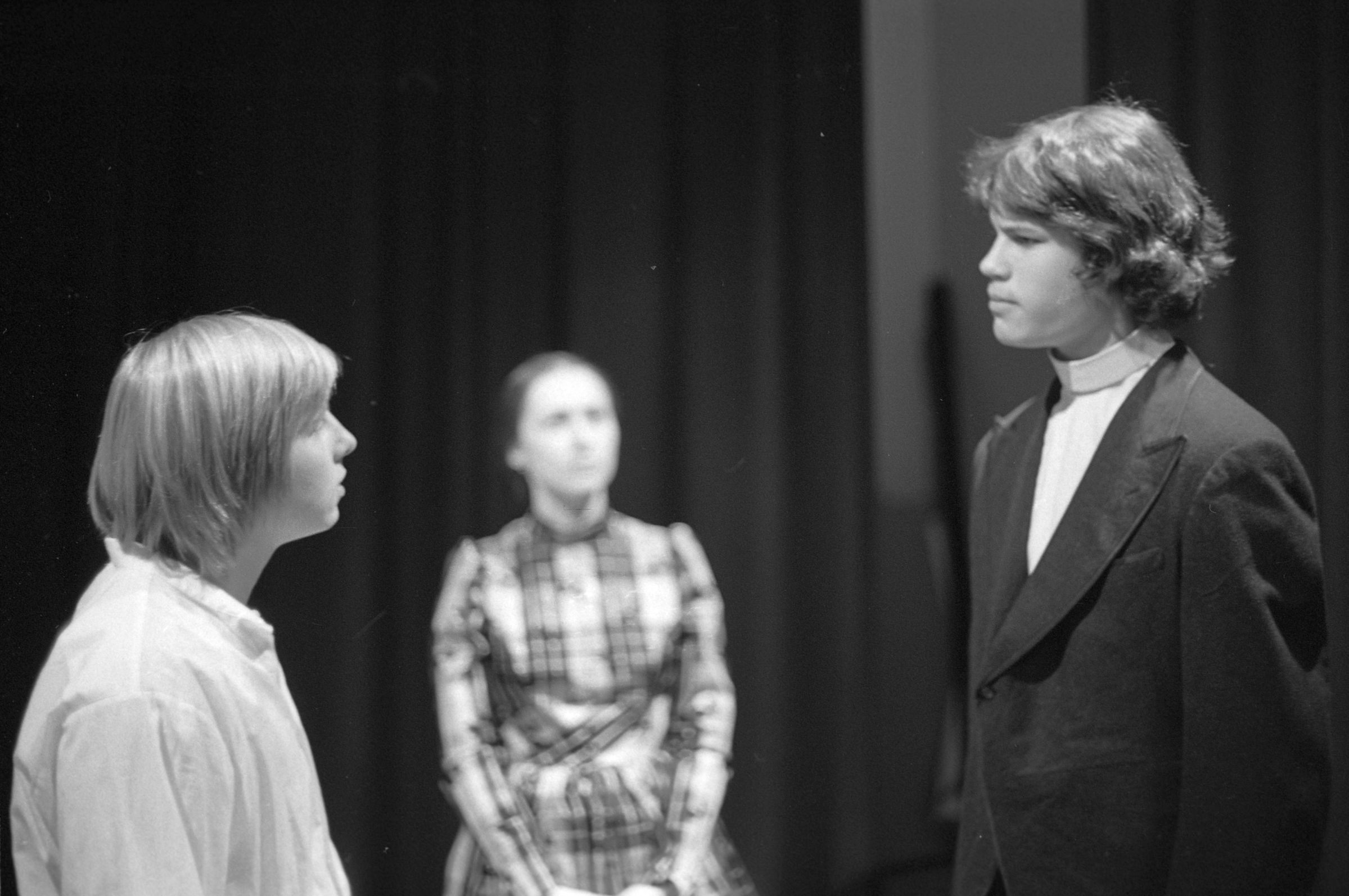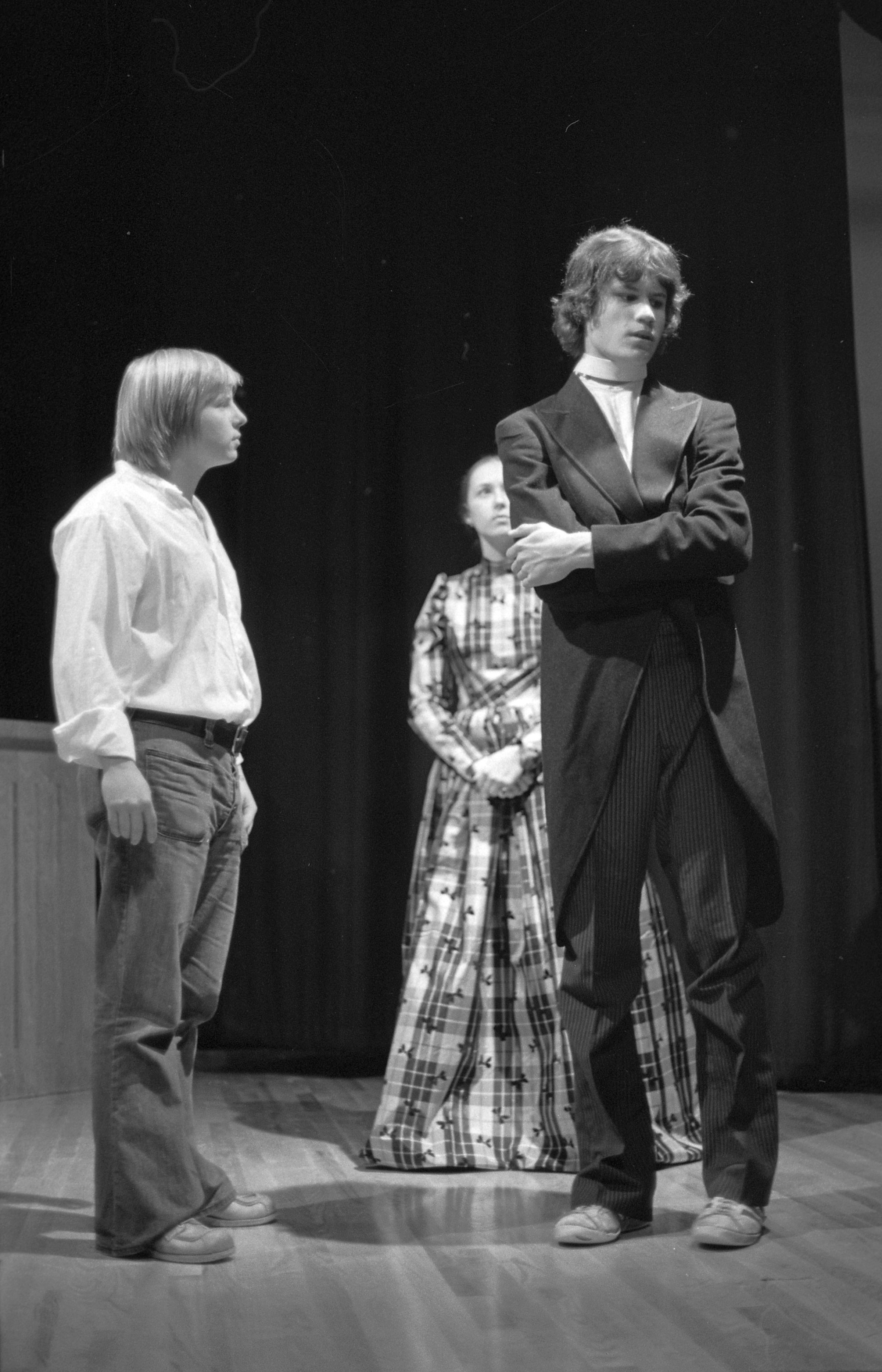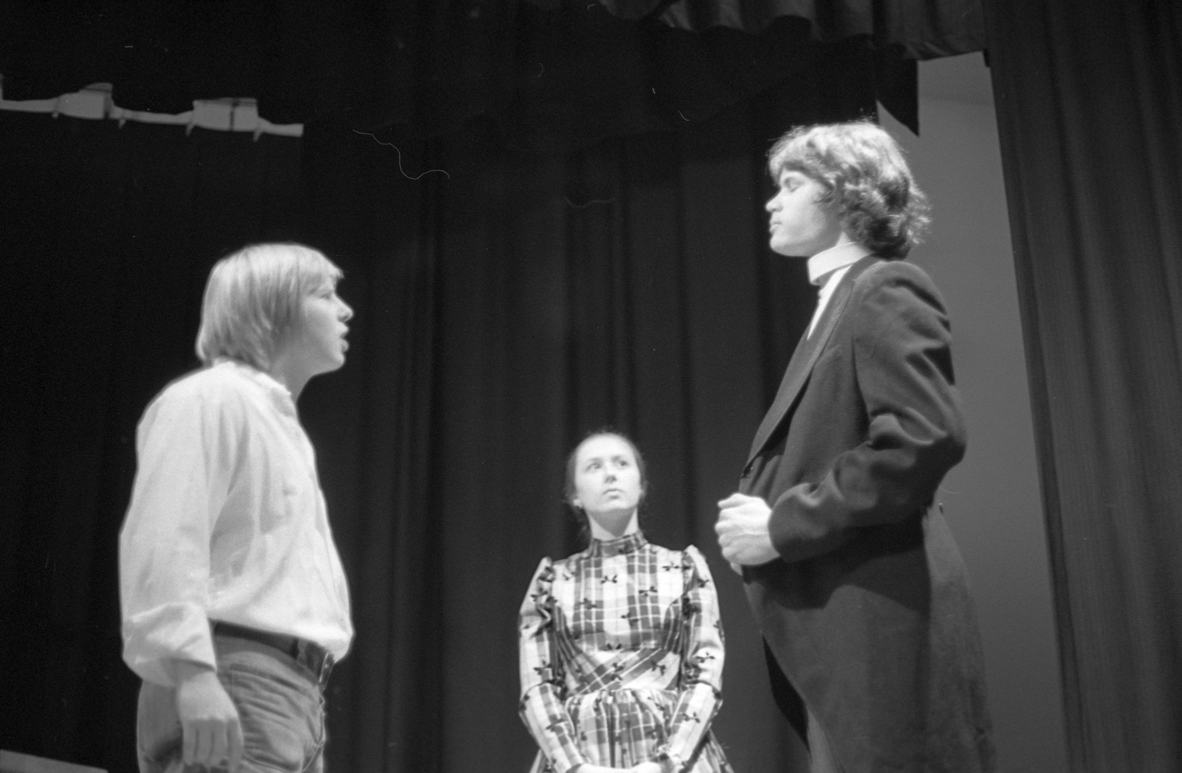 Timberline play, 1975. These three black and white film negative strips were created for the Lacey Leader newspaper. One strip bears four images (images 19-22), one strip bears five images (images 23-27), and one strip bears three images (images 28-30). These images all show a scene in a stage play being acted out by two men and one woman. In all of the images, the shorter of the two men is in the left side of the frame, the woman is at center, and the taller of the two men is standing in the right side of the frame. The woman is several feet further back from the camera than the two men.Made/Created