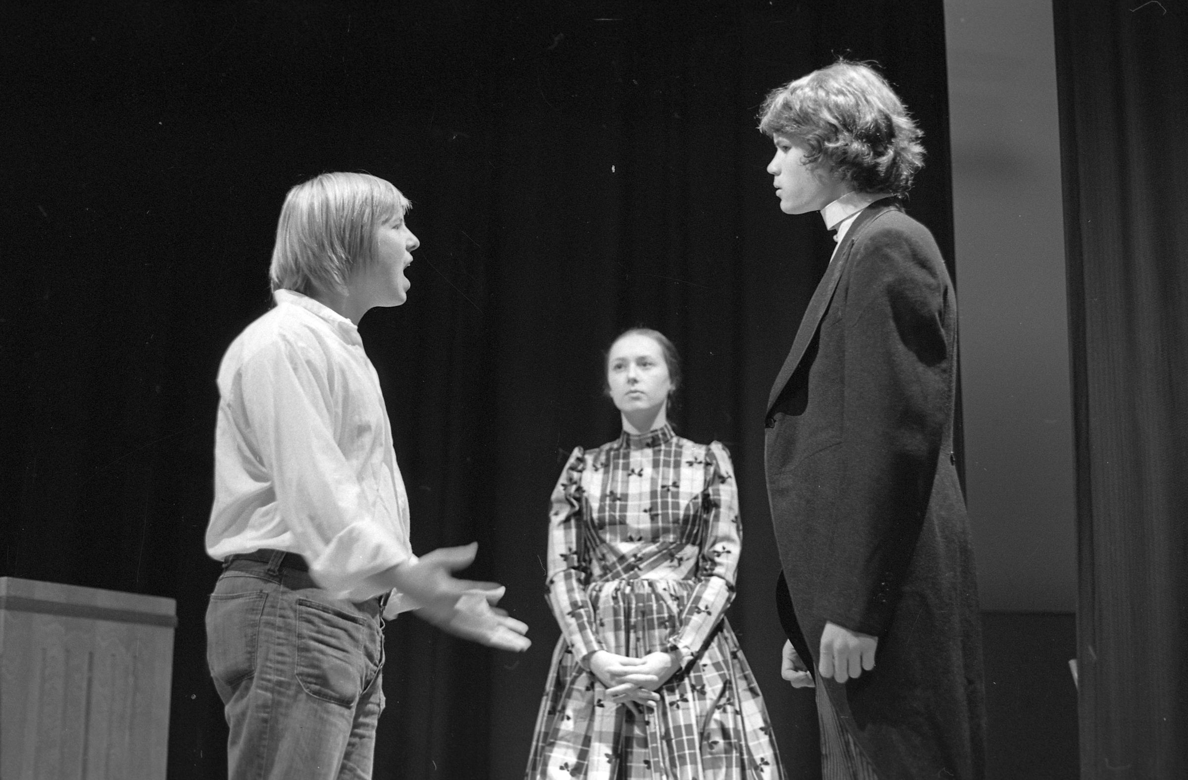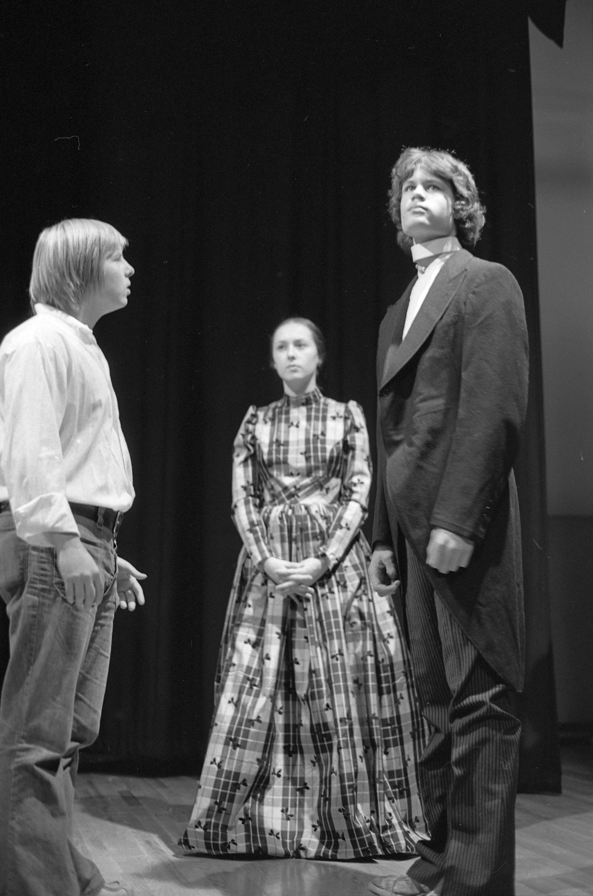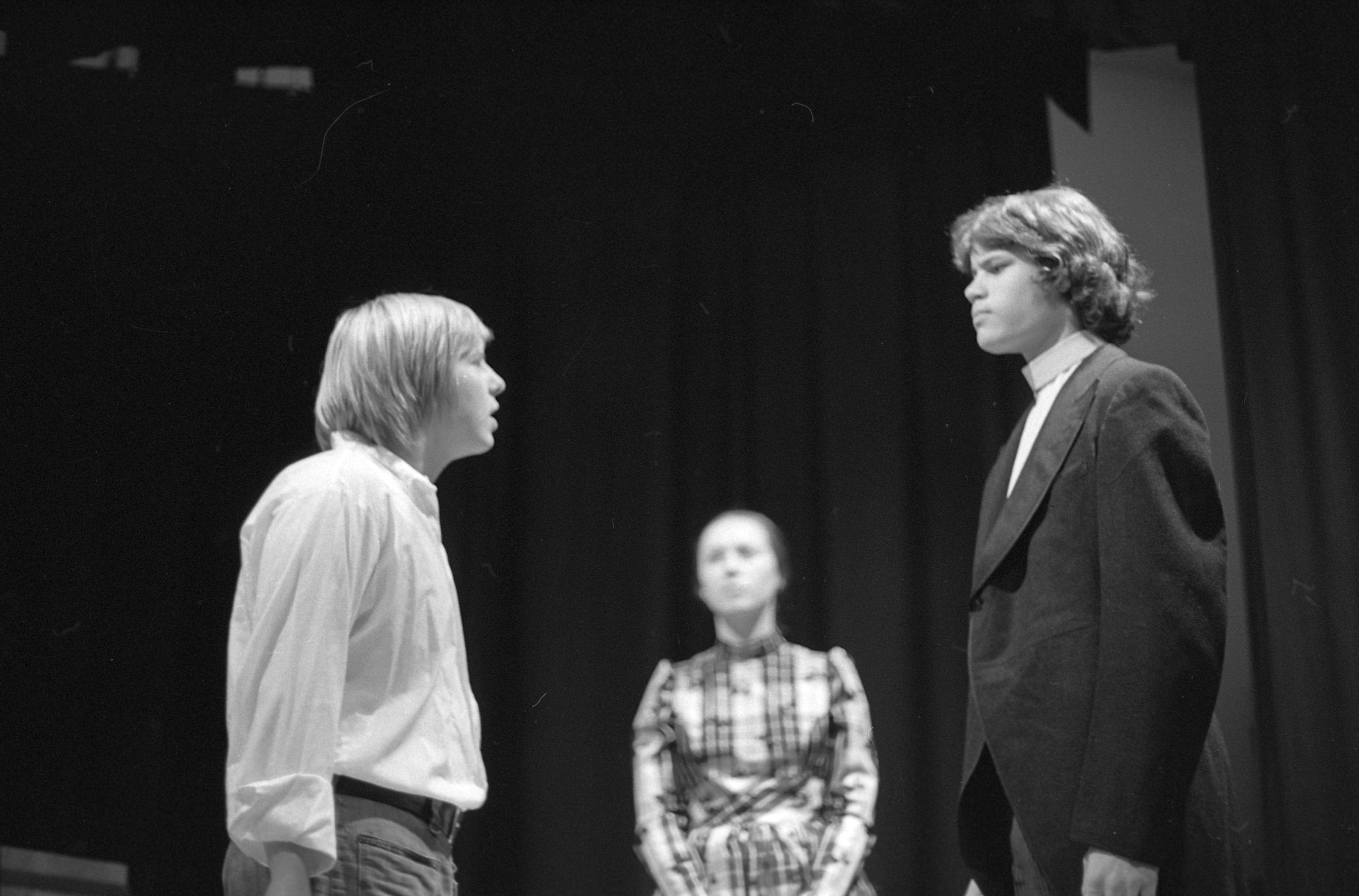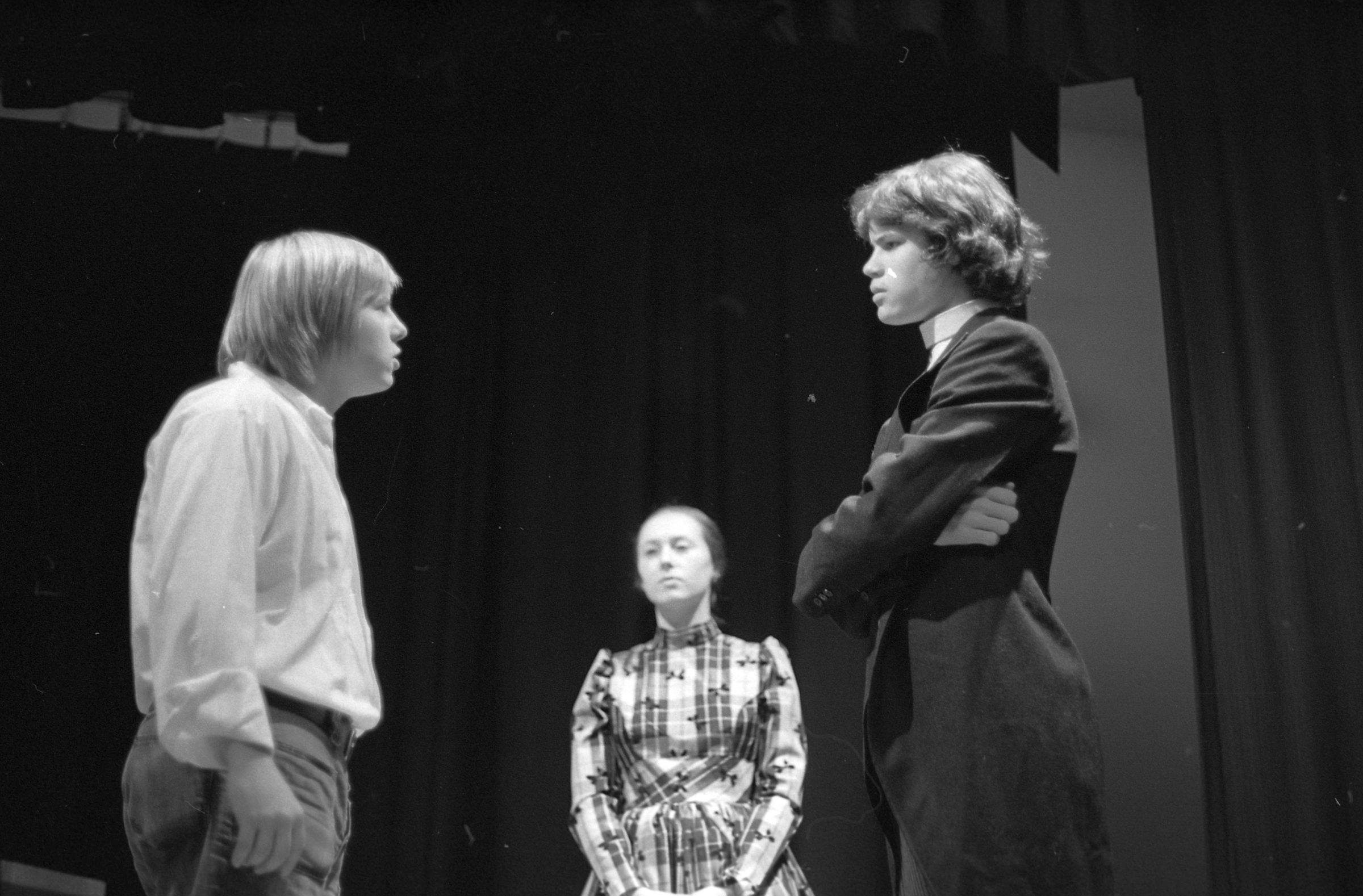 Timberline play, 1975. These three black and white film negative strips were created for the Lacey Leader newspaper. One strip bears four images (images 19-22), one strip bears five images (images 23-27), and one strip bears three images (images 28-30). These images all show a scene in a stage play being acted out by two men and one woman. In all of the images, the shorter of the two men is in the left side of the frame, the woman is at center, and the taller of the two men is standing in the right side of the frame. The woman is several feet further back from the camera than the two men.Made/Created