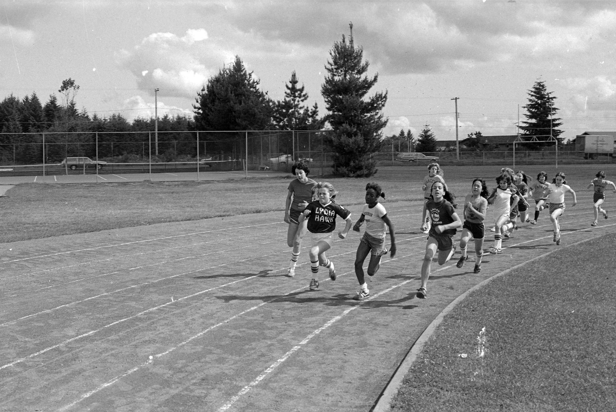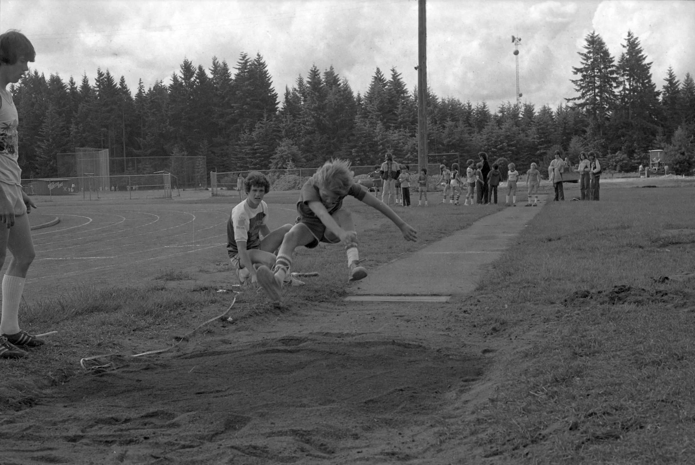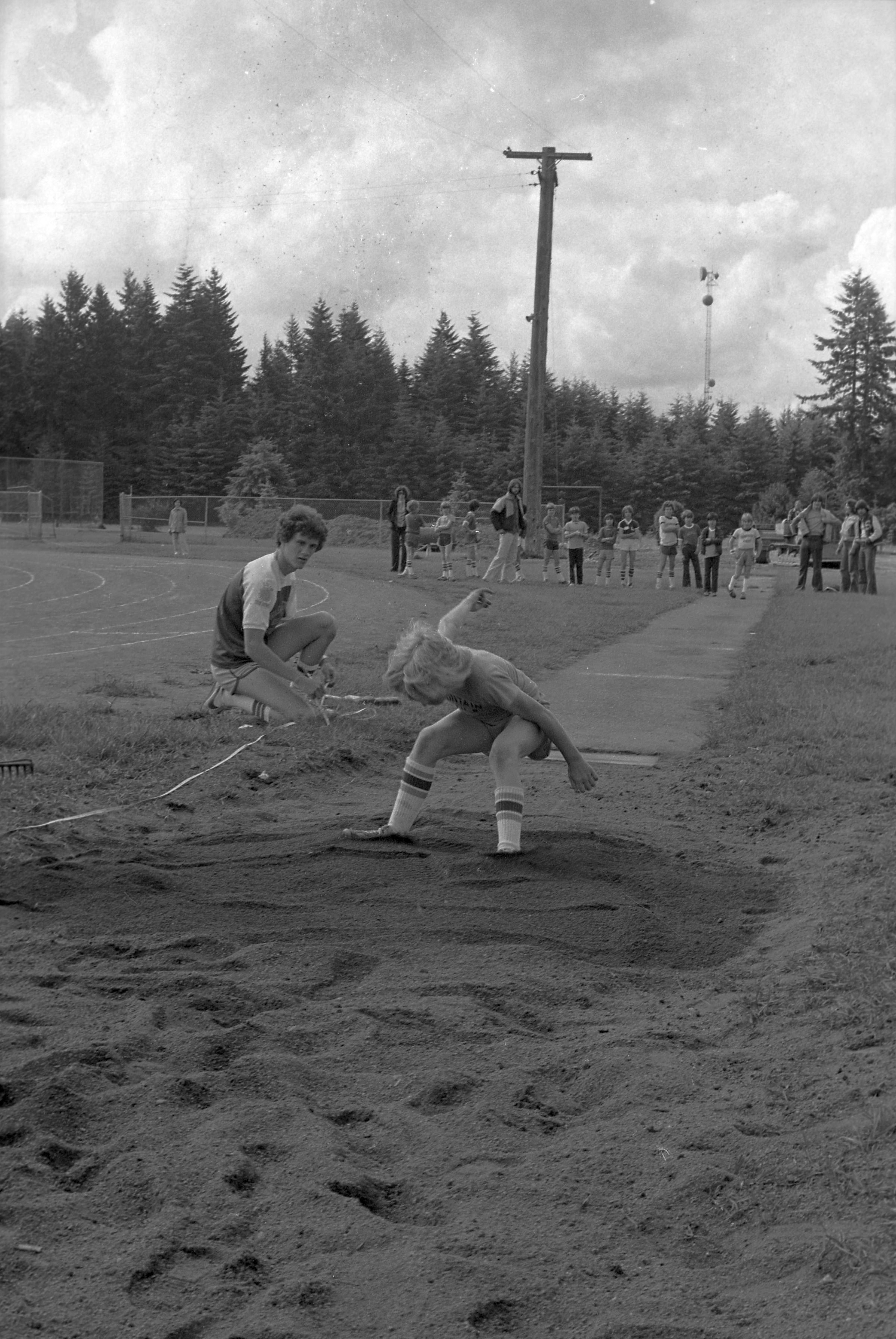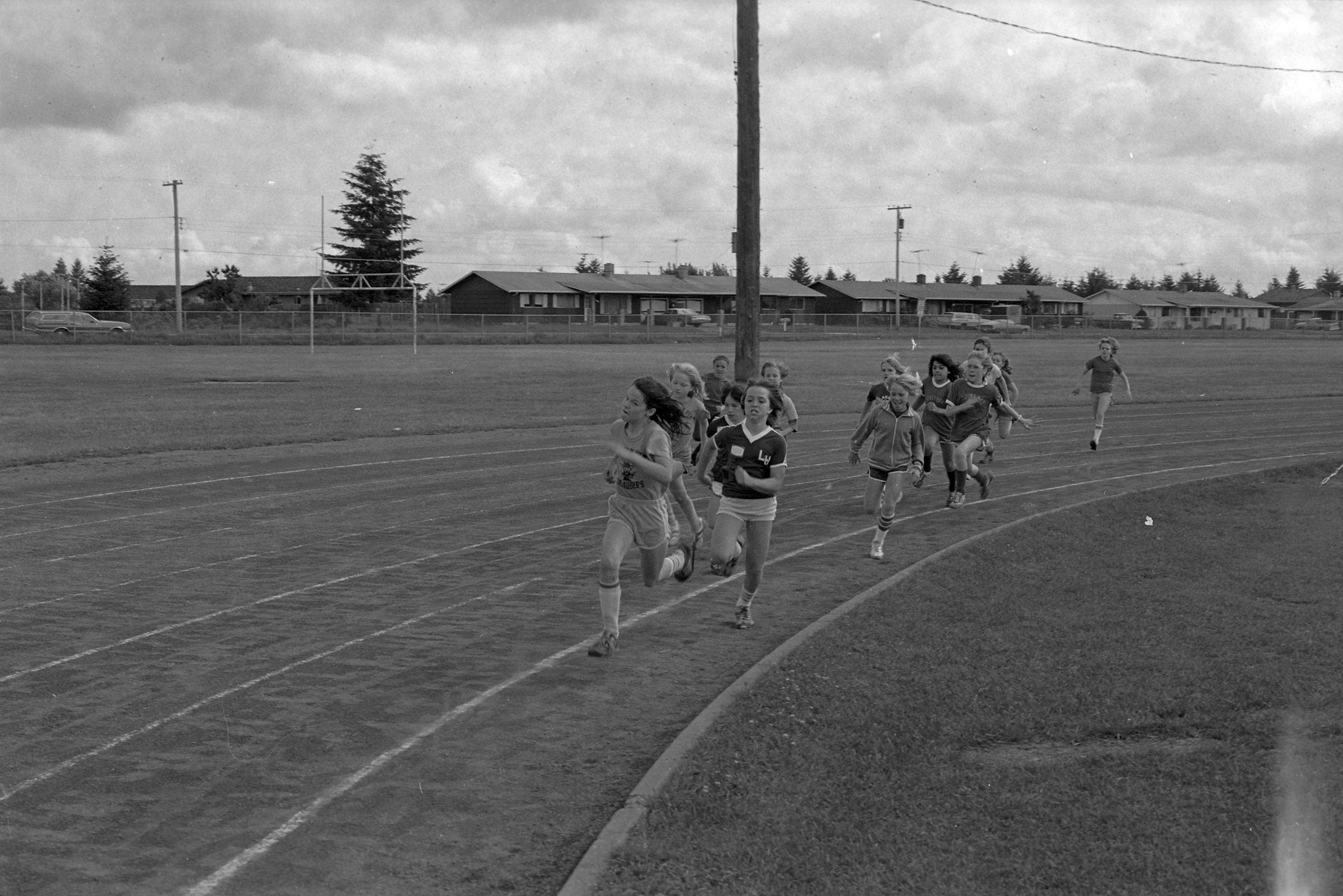 Track meet, unknown date. These six film negative strips were created for the Lacey Leader newspaper. Two of the strips hold six images each (images 24-28 and 29-33), two of the strips hold four images each (images 41-44 and 1-4), and two strips hold three images each (images 18-20 and 21-23). All of these images show a youth track meet.Made/Created
