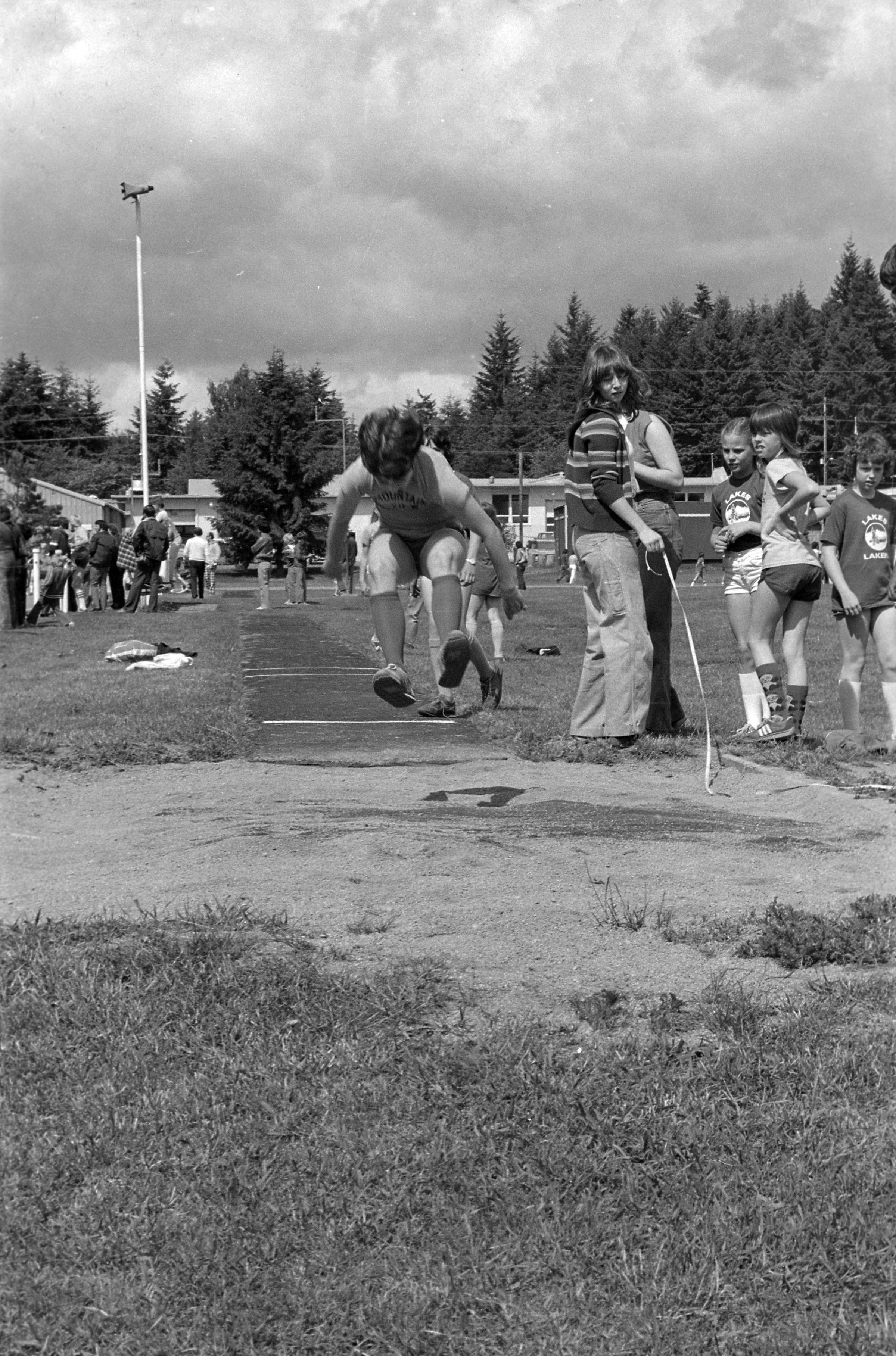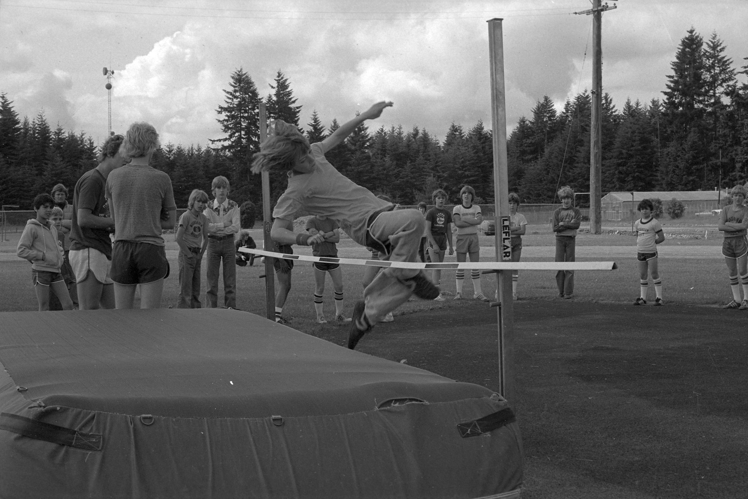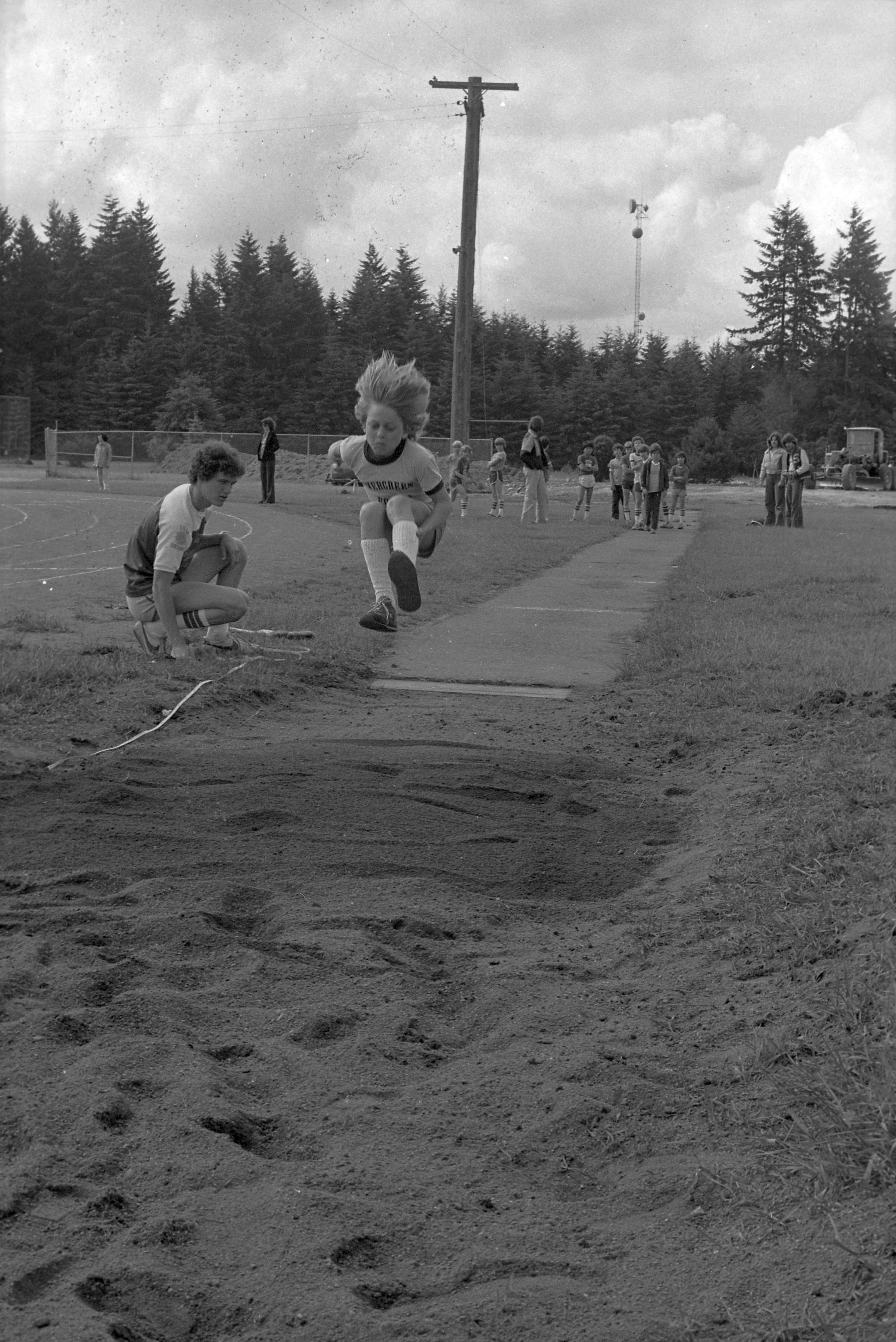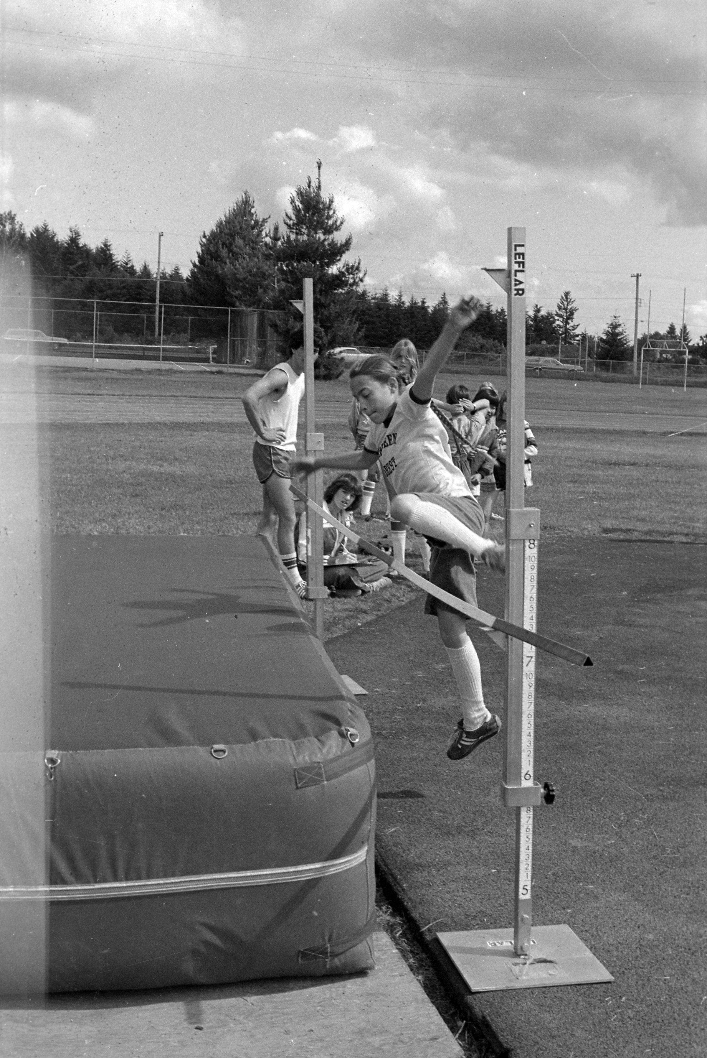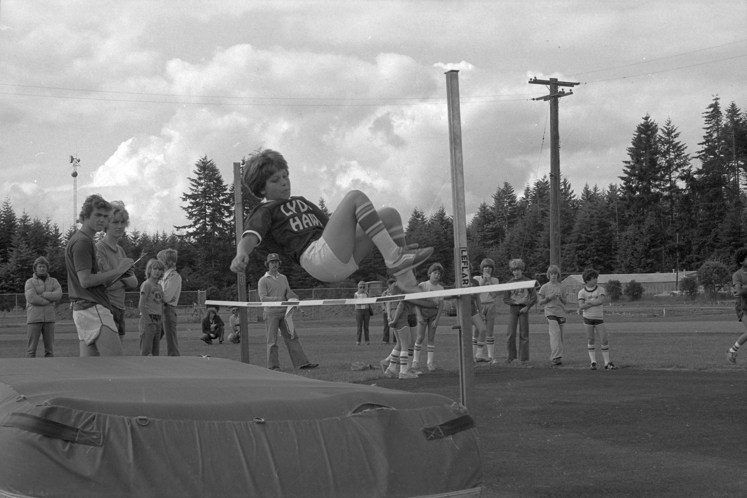 Track meet, unknown date. These six film negative strips were created for the Lacey Leader newspaper. Two of the strips hold six images each (images 24-28 and 29-33), two of the strips hold four images each (images 41-44 and 1-4), and two strips hold three images each (images 18-20 and 21-23). All of these images show a youth track meet.Made/Created